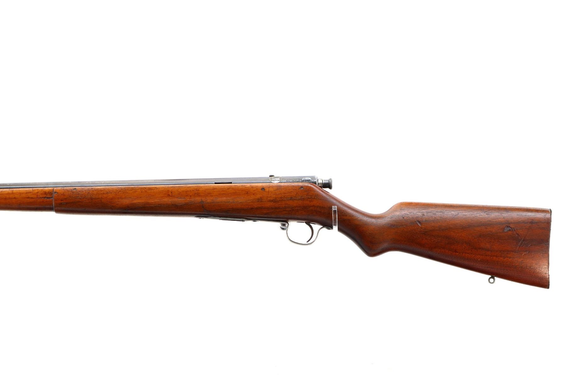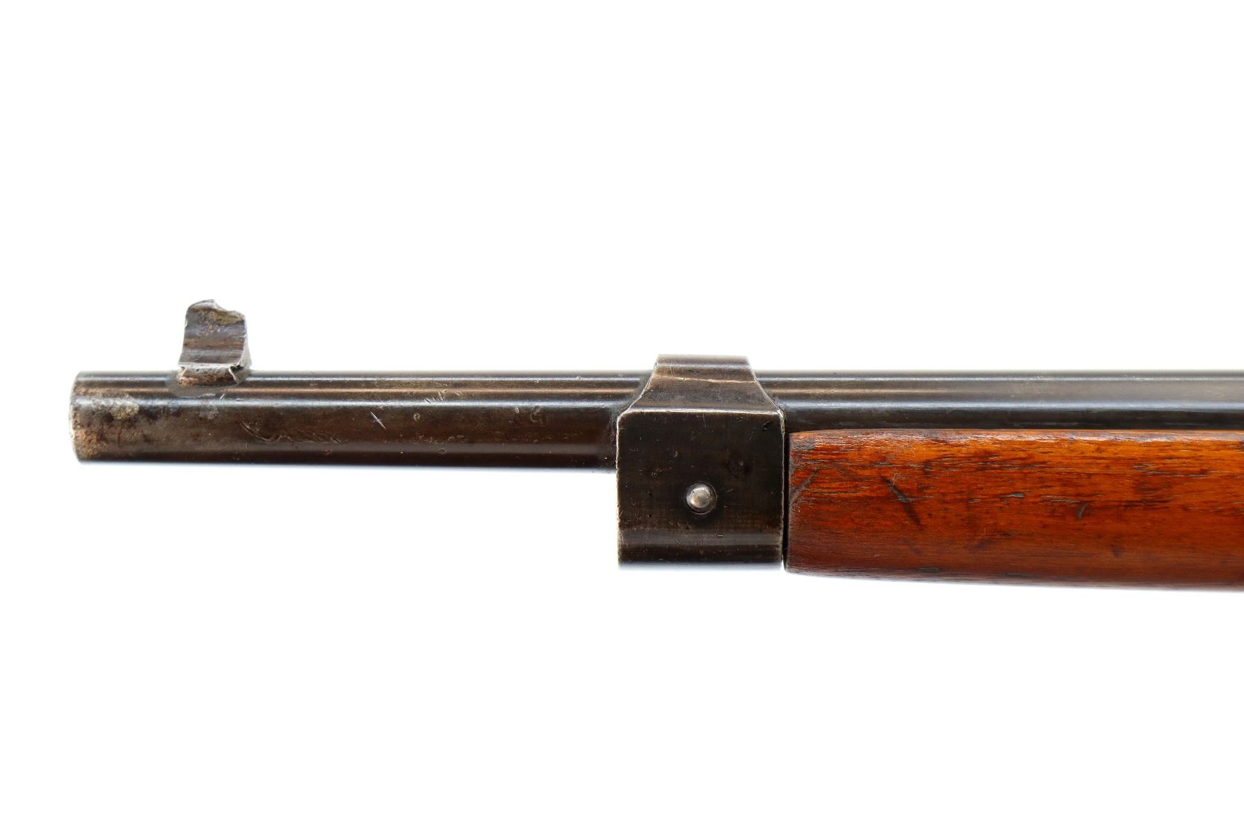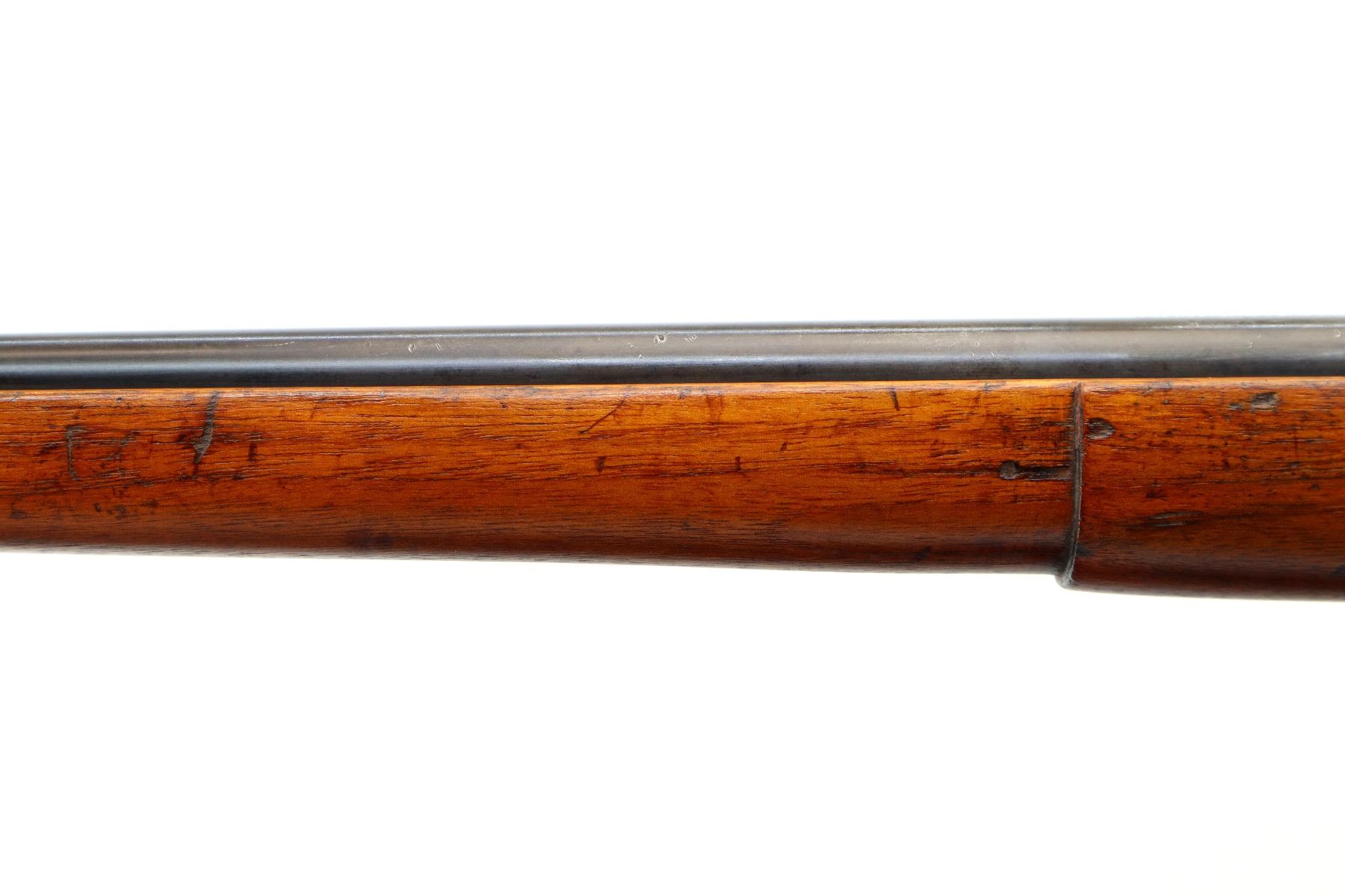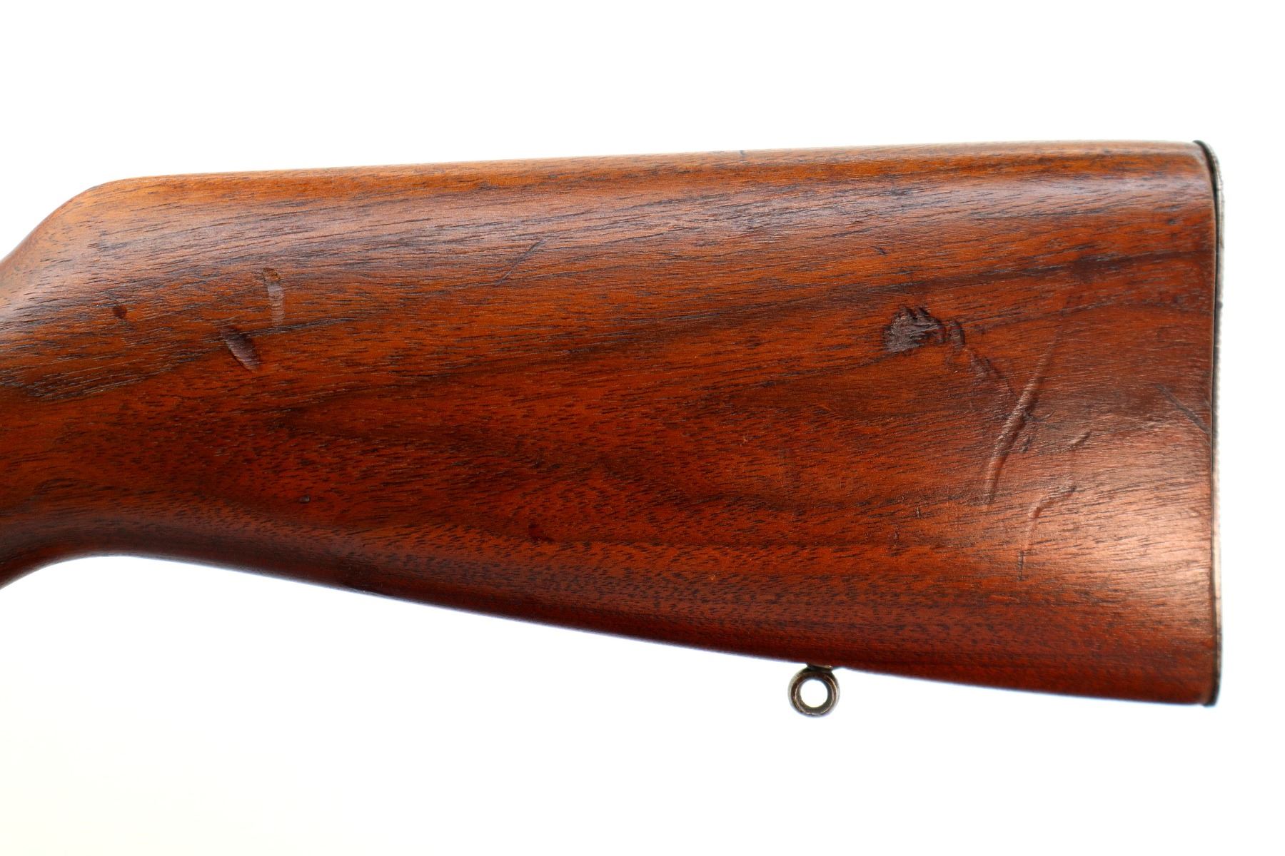 Main Description: Blade front sight, blued finish, missing rear sight threaded holes present, smooth bolt knob. One piece full length wood stock, pistol grip, grooved steel butt plate, rear swivel stud only, missing middle barrel band.