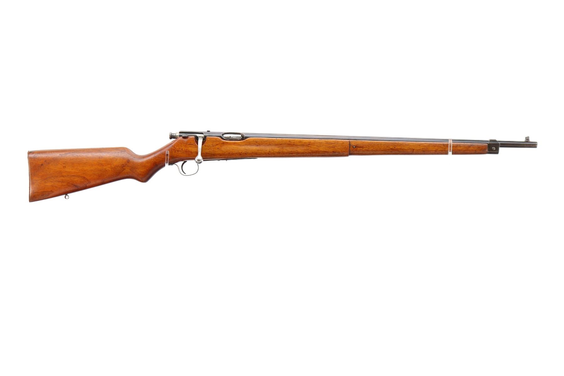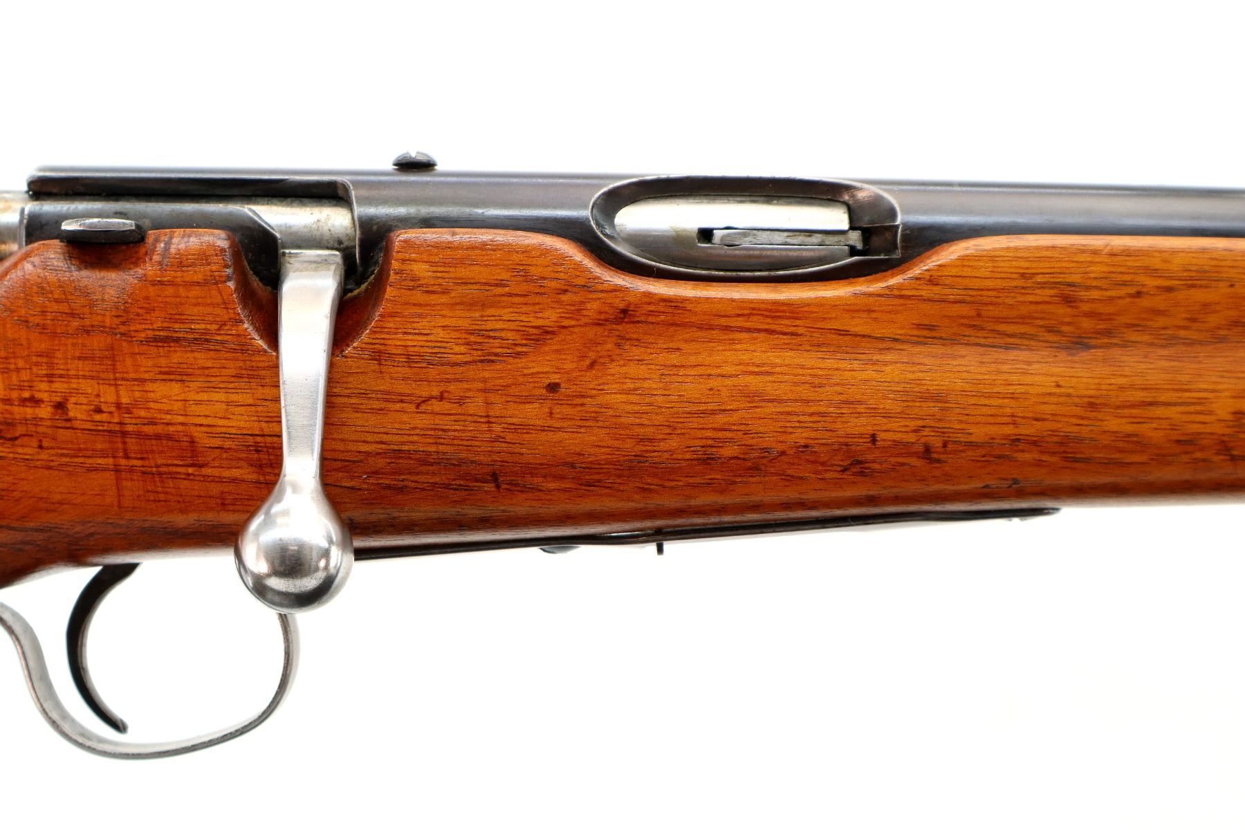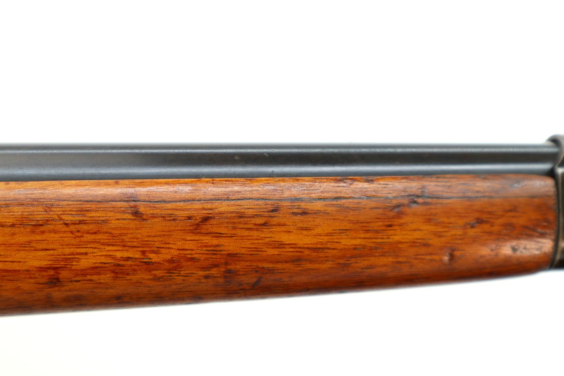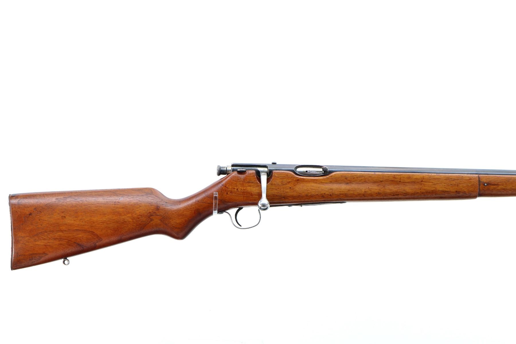 Main Description: Blade front sight, blued finish, missing rear sight threaded holes present, smooth bolt knob. One piece full length wood stock, pistol grip, grooved steel butt plate, rear swivel stud only, missing middle barrel band.