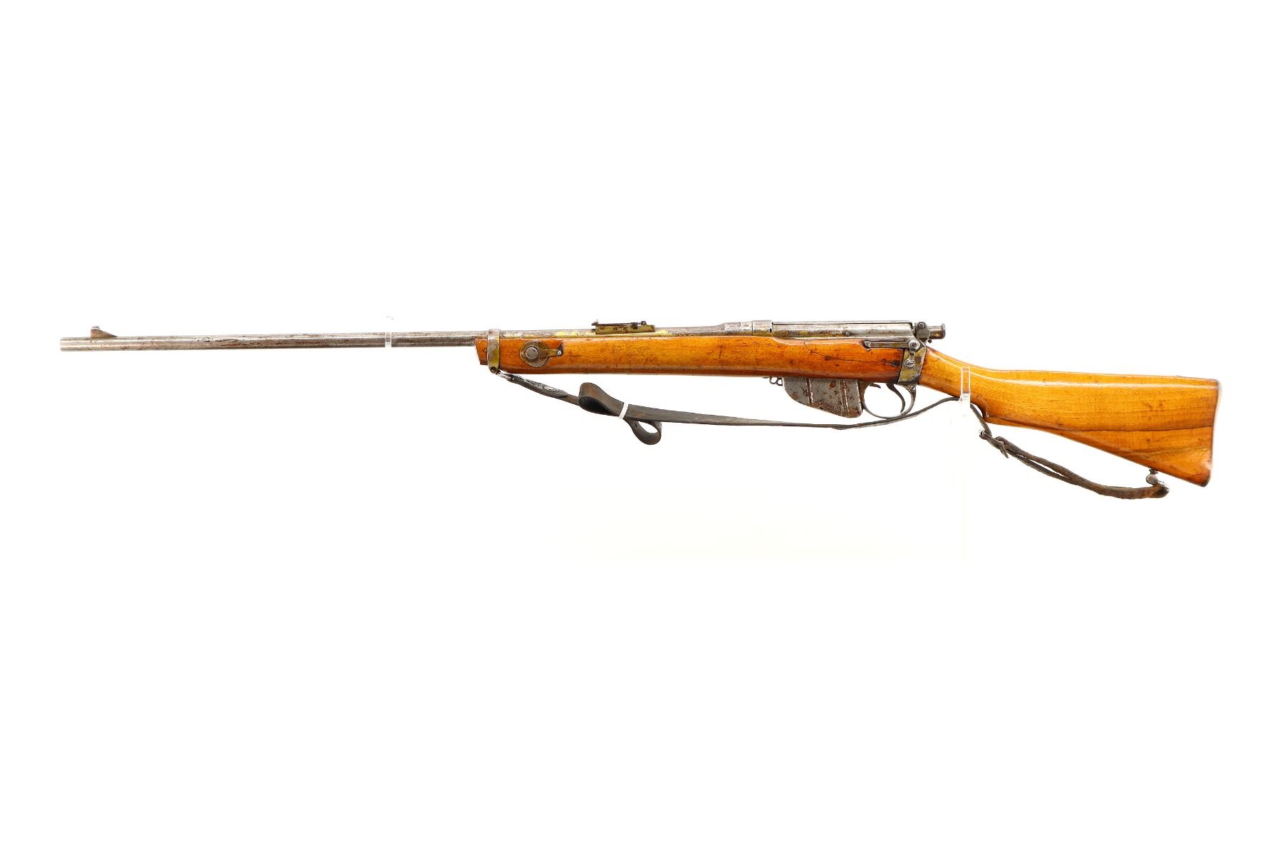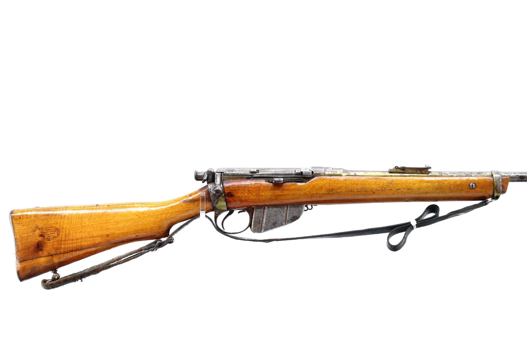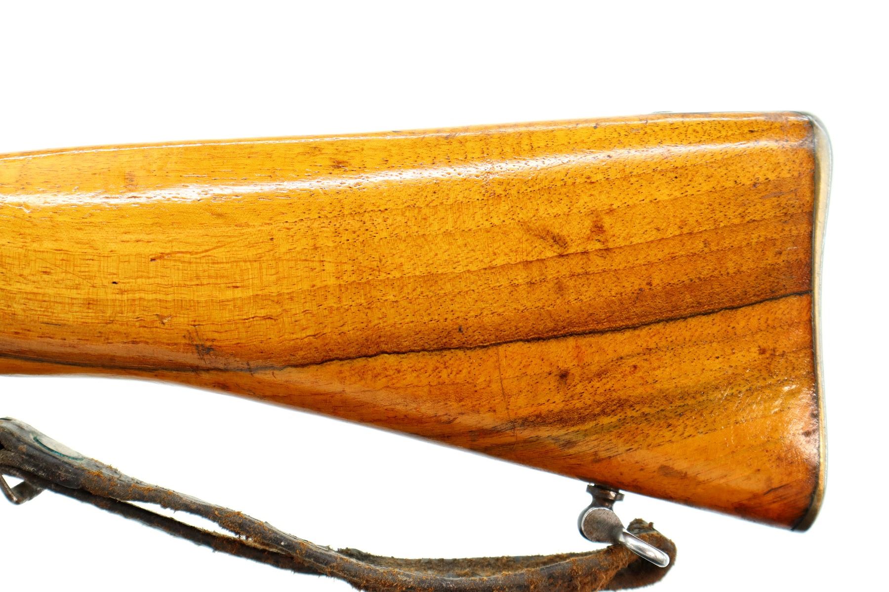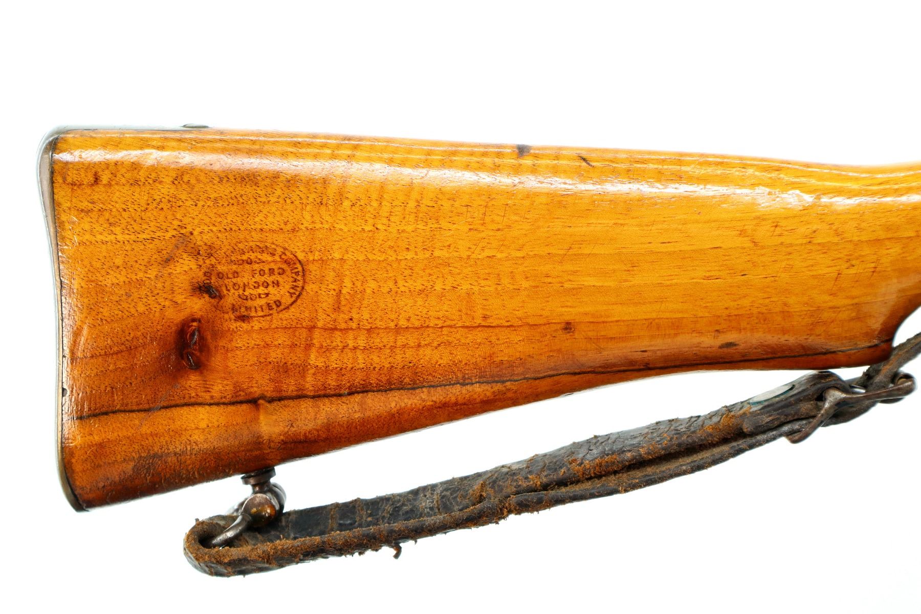 Main Description: Manufactured by BSA, Bolt Matches. Blade front sight with ramp, adjustable u notched ladder rear sight, magazine cut off, bolt has dust cover and safety on cocking piece, retains front and rear volley sights. Two piece sporterized wood stocks cracked on left side, pistol grip, smooth brass butt plate with trap, tang marked R3689, faint roundel on right of stock, sling swivels with brown leather sling