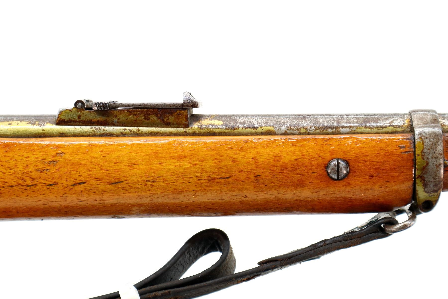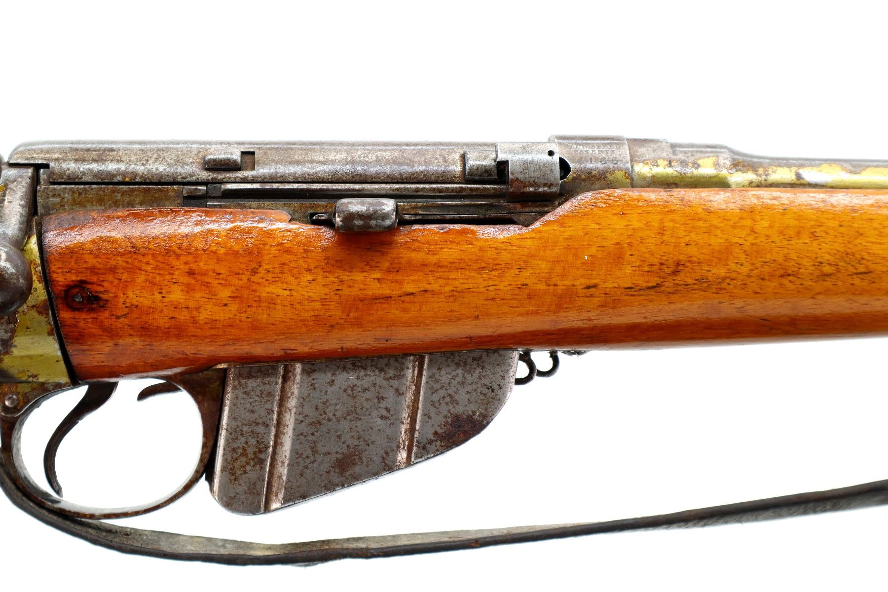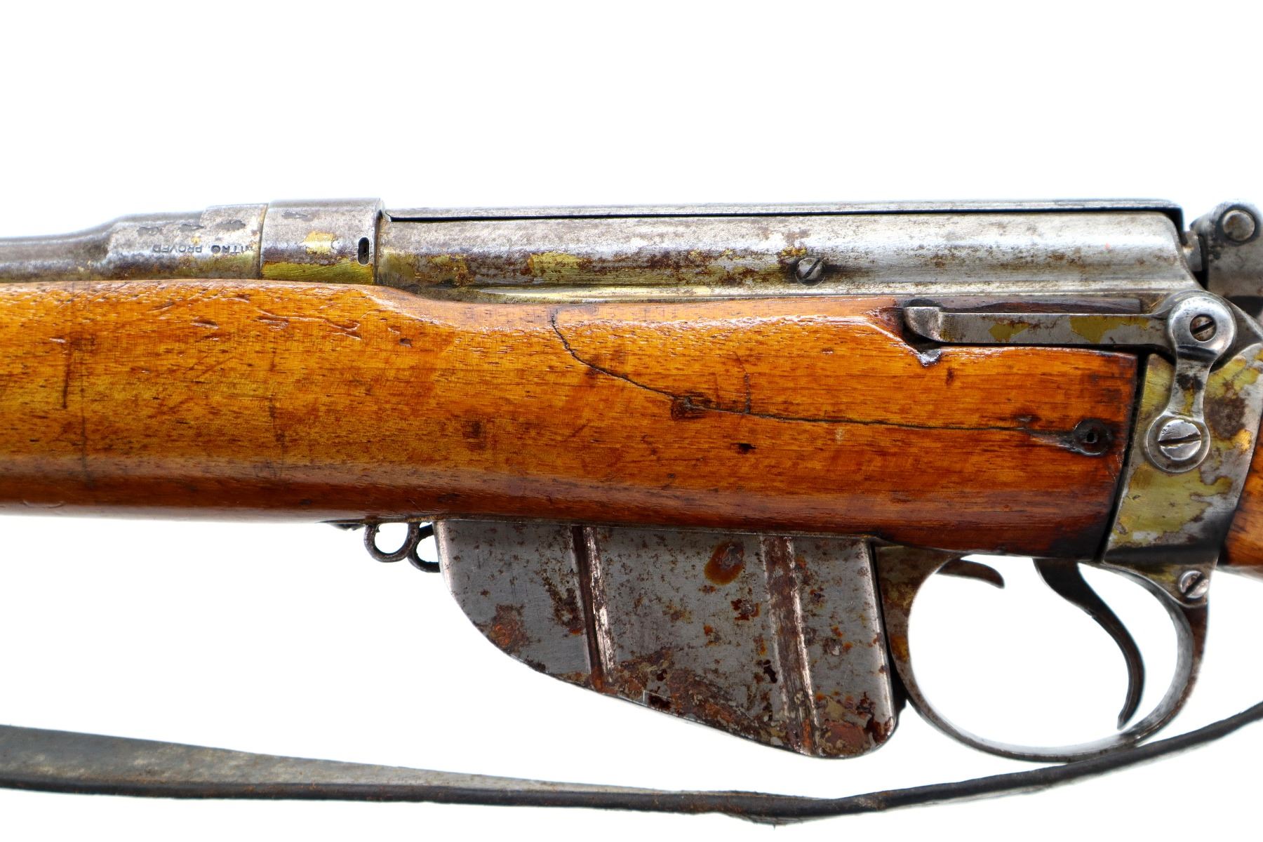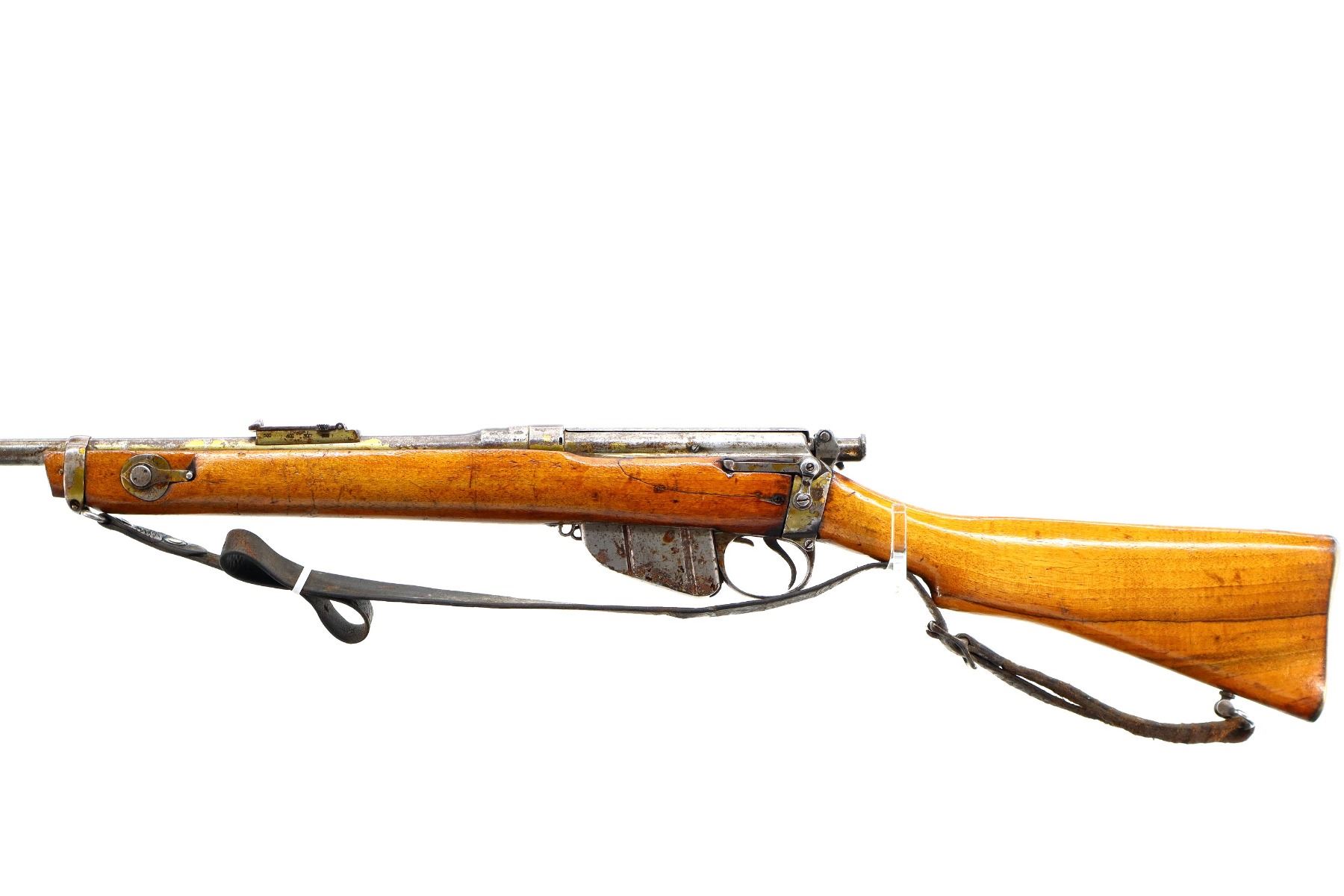 Main Description: Manufactured by BSA, Bolt Matches. Blade front sight with ramp, adjustable u notched ladder rear sight, magazine cut off, bolt has dust cover and safety on cocking piece, retains front and rear volley sights. Two piece sporterized wood stocks cracked on left side, pistol grip, smooth brass butt plate with trap, tang marked R3689, faint roundel on right of stock, sling swivels with brown leather sling