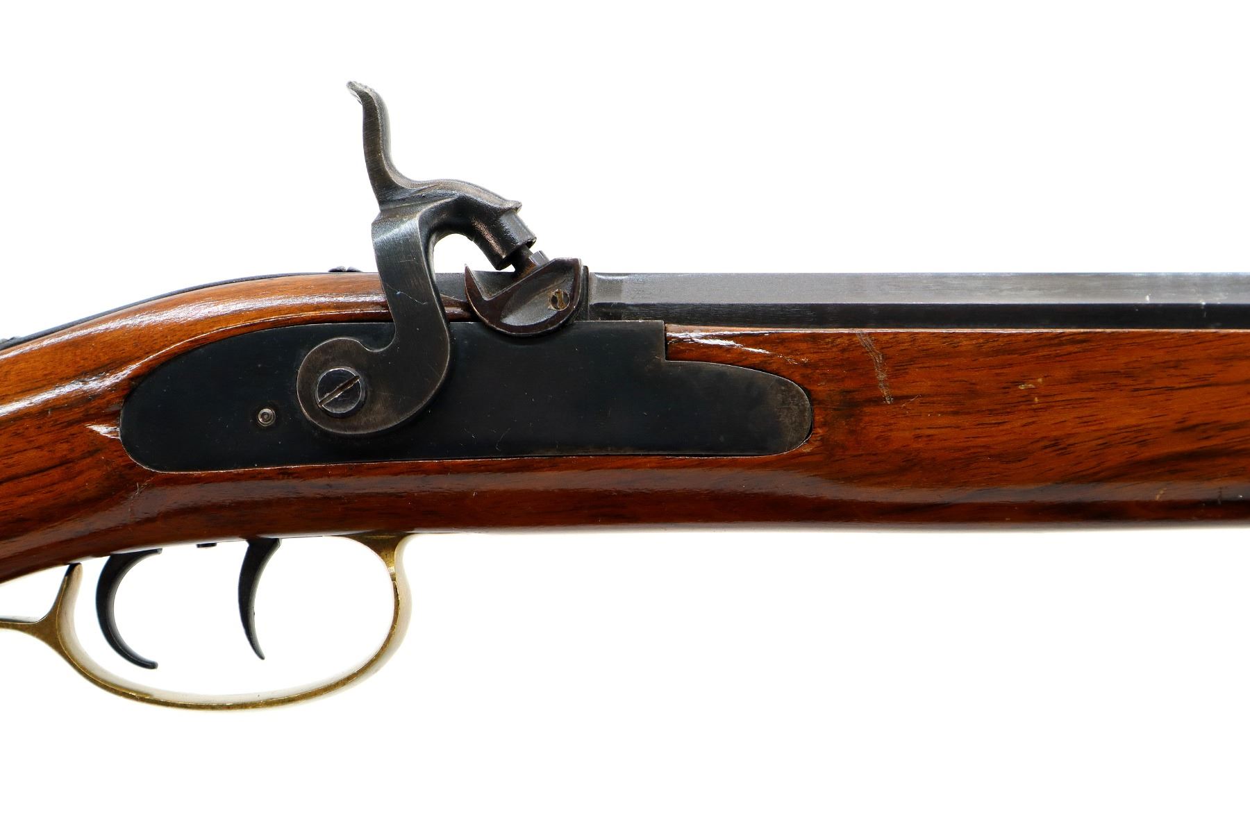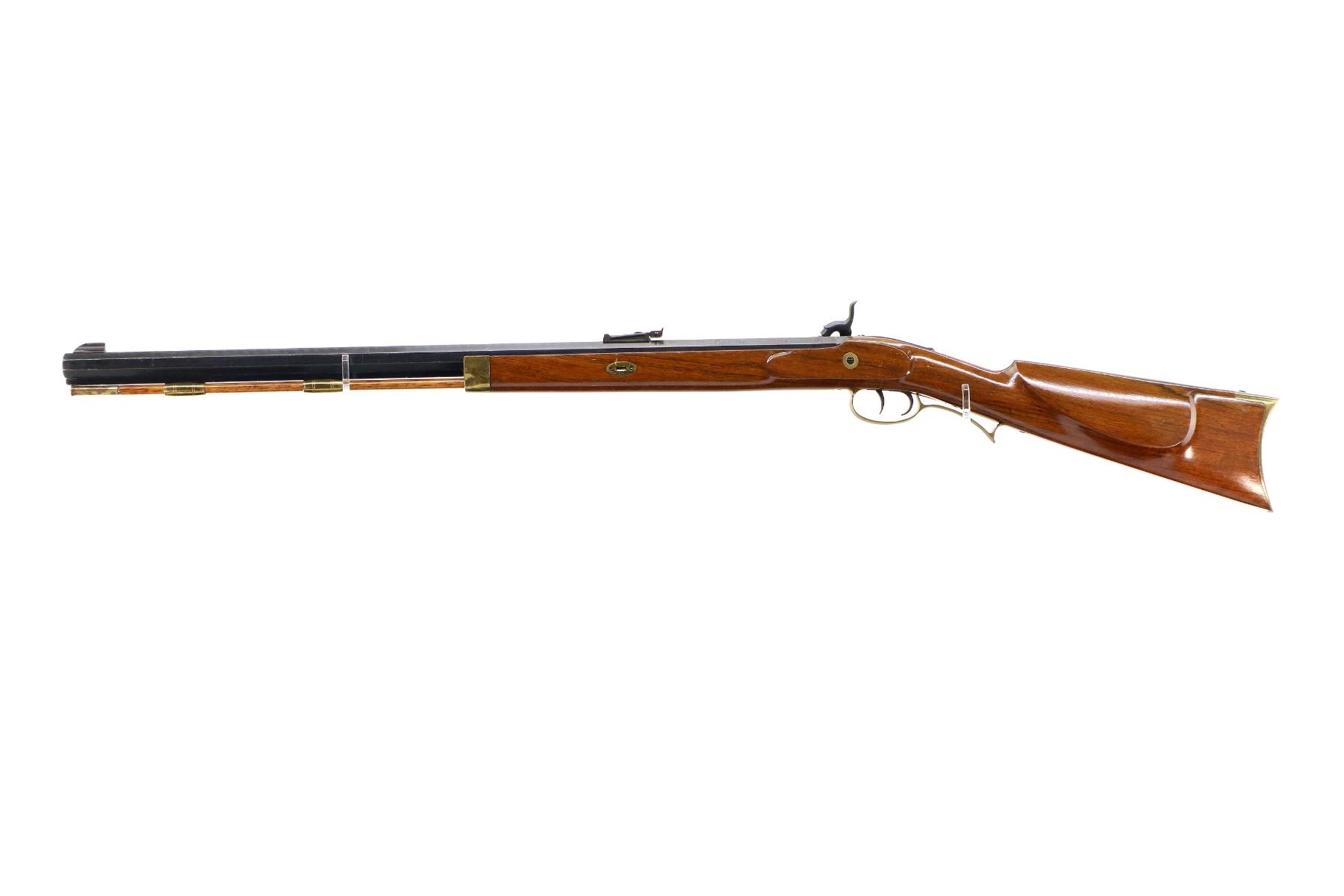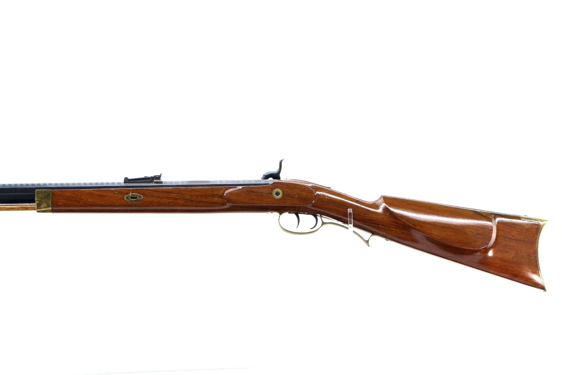 Main Description: Blade front sight, adjustable u notched rear sight, blued octagon barrel, smooth lock with grooved spur hammer that functions, mainspring is slightly weak. One piece half length wood stock, missing forearm wedge, straight grip cracked on left side behind barrel, cheek rest, smooth curved brass butt plate, patch box, finger rest trigger guard and nose cap. Wood ramrod with brass tip.