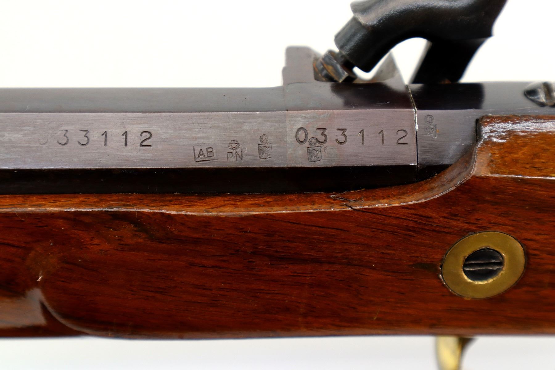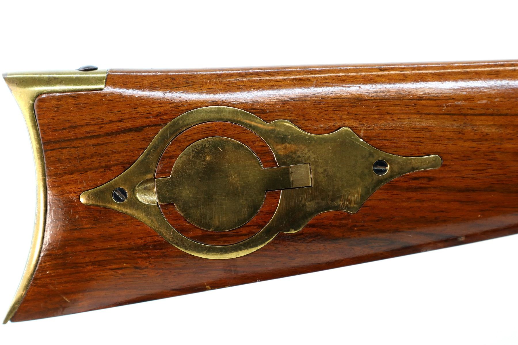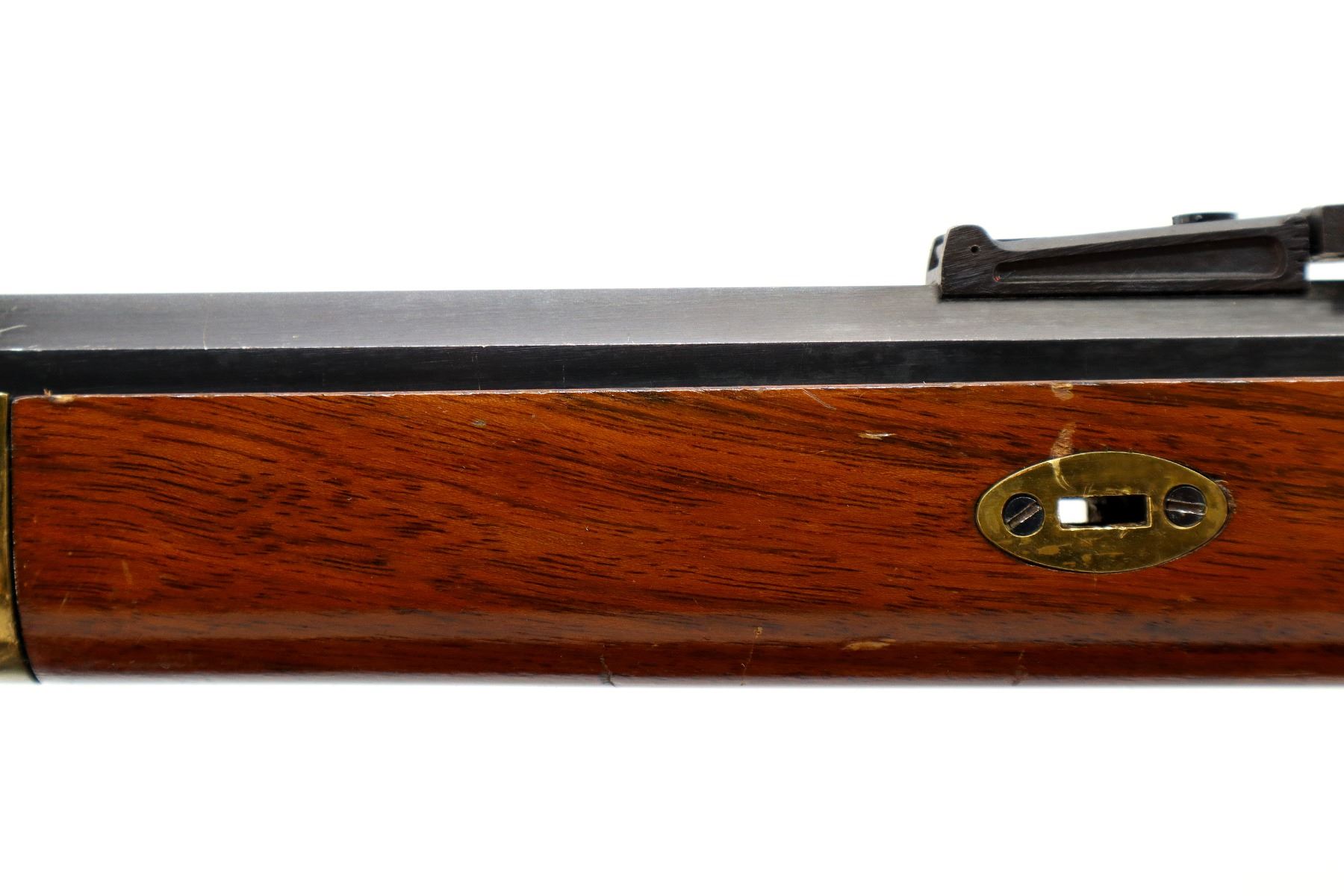 Main Description: Blade front sight, adjustable u notched rear sight, blued octagon barrel, smooth lock with grooved spur hammer that functions, mainspring is slightly weak. One piece half length wood stock, missing forearm wedge, straight grip cracked on left side behind barrel, cheek rest, smooth curved brass butt plate, patch box, finger rest trigger guard and nose cap. Wood ramrod with brass tip.