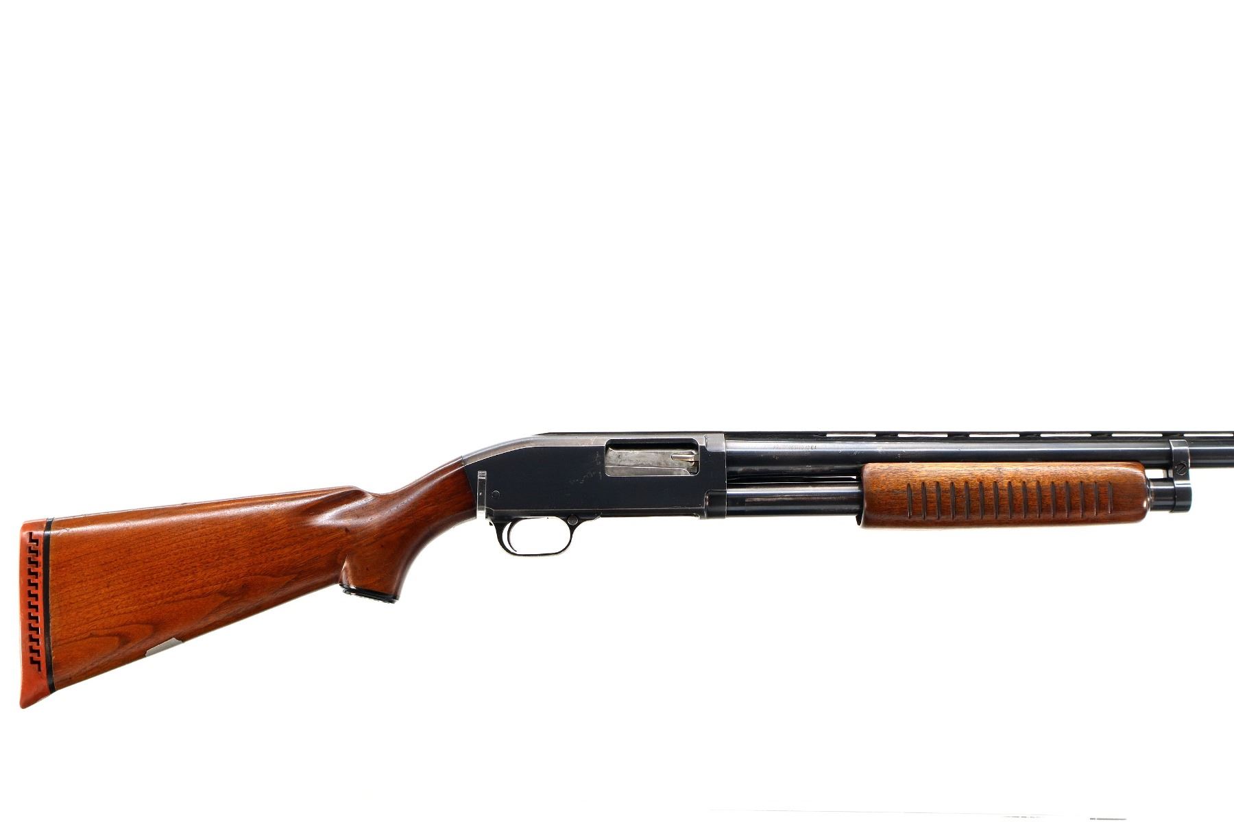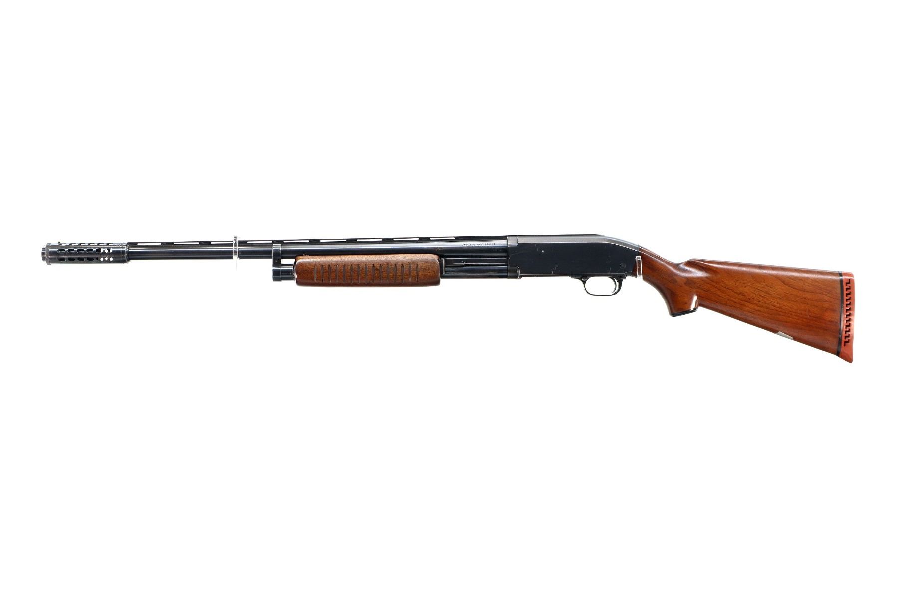 Main Description: Brass front and white mid rib beads, blued finish, vent rib with ported choke adapter installed. Two piece wood stocks, grooved forearm, pistol grip, red vented rubber recoil pad, vanity plate, grip cap.