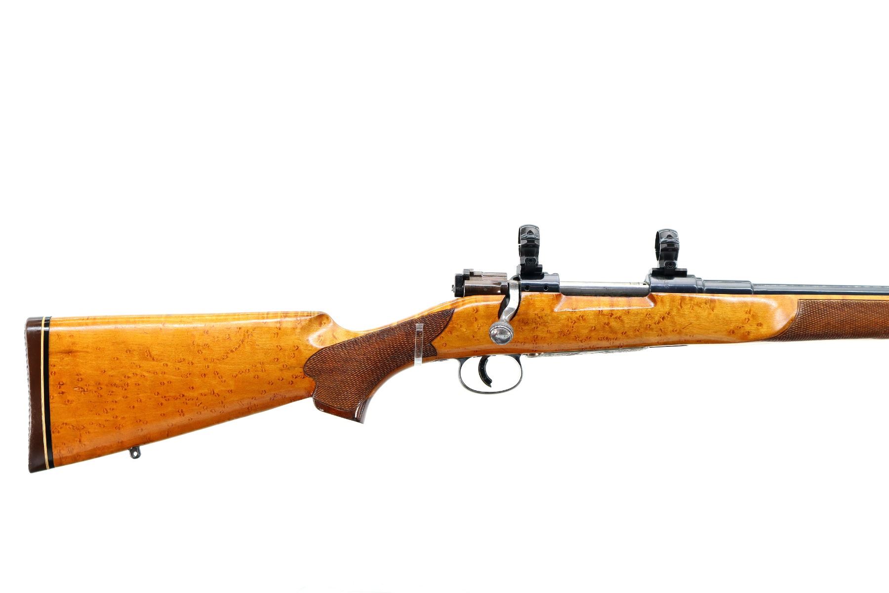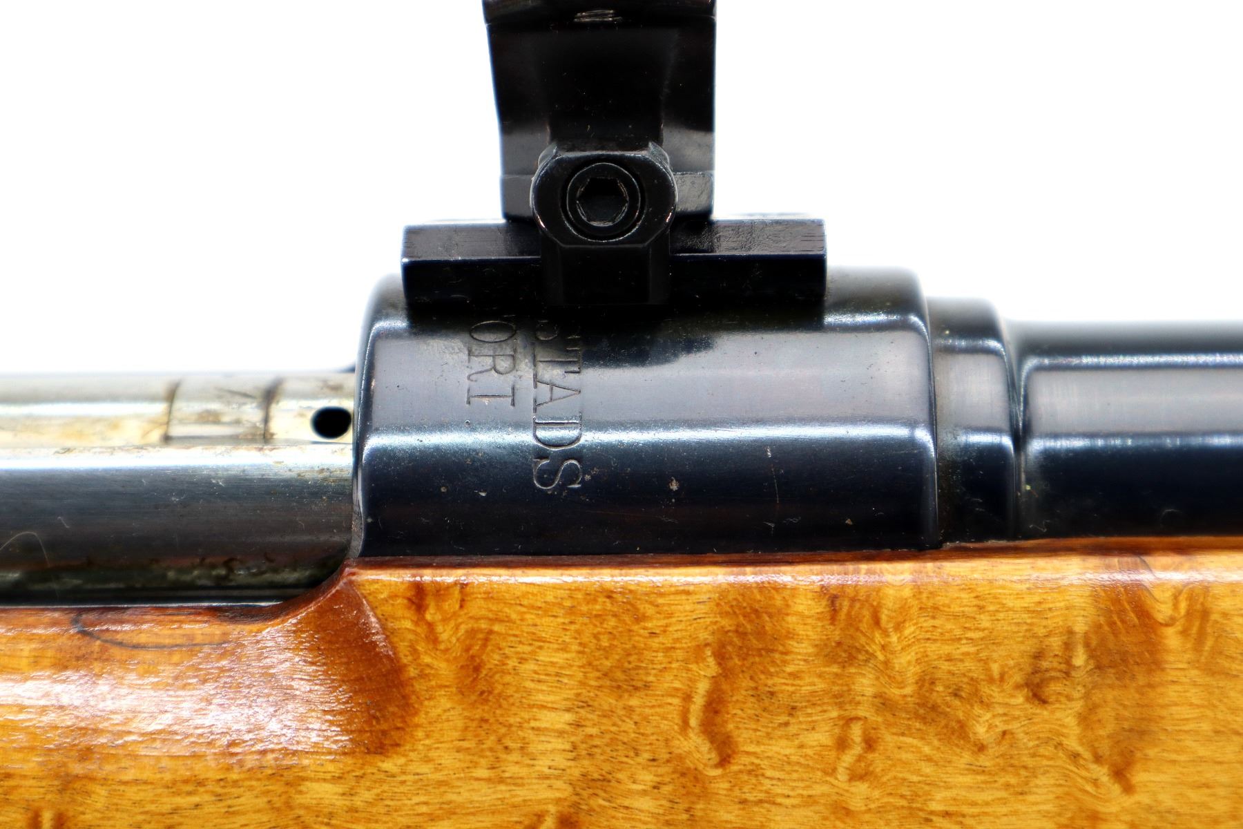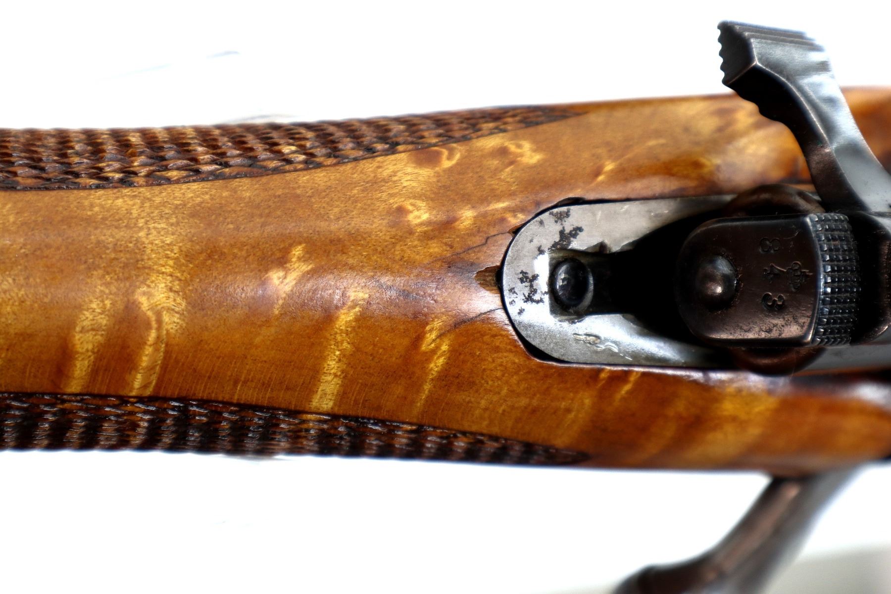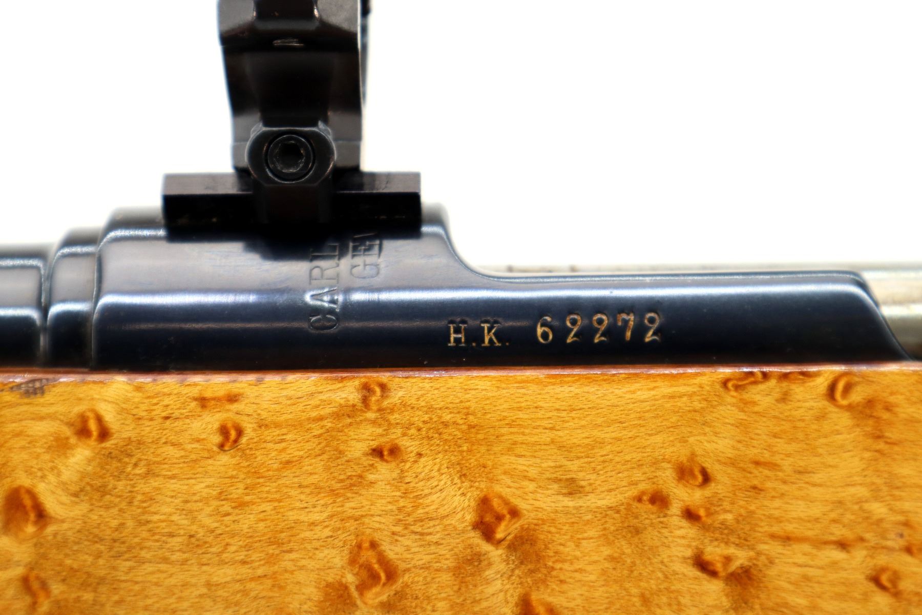 Main Description: Manufactured By Carl Gustafs. Blade front sight with ramp, no rear sight, metal has been polished and reblued, receiver drilled and tapped with 1" millet rings installed, low scope safety and bolt handle with checkered knob. One piece full length Birds Eye maple stock, checkered forearm and pistol grip, small cracks behind upper tang, cheek rest, brown rubber recoil pad, wood grip cap, engraved floor plate, swivel studs, steel nose cap.