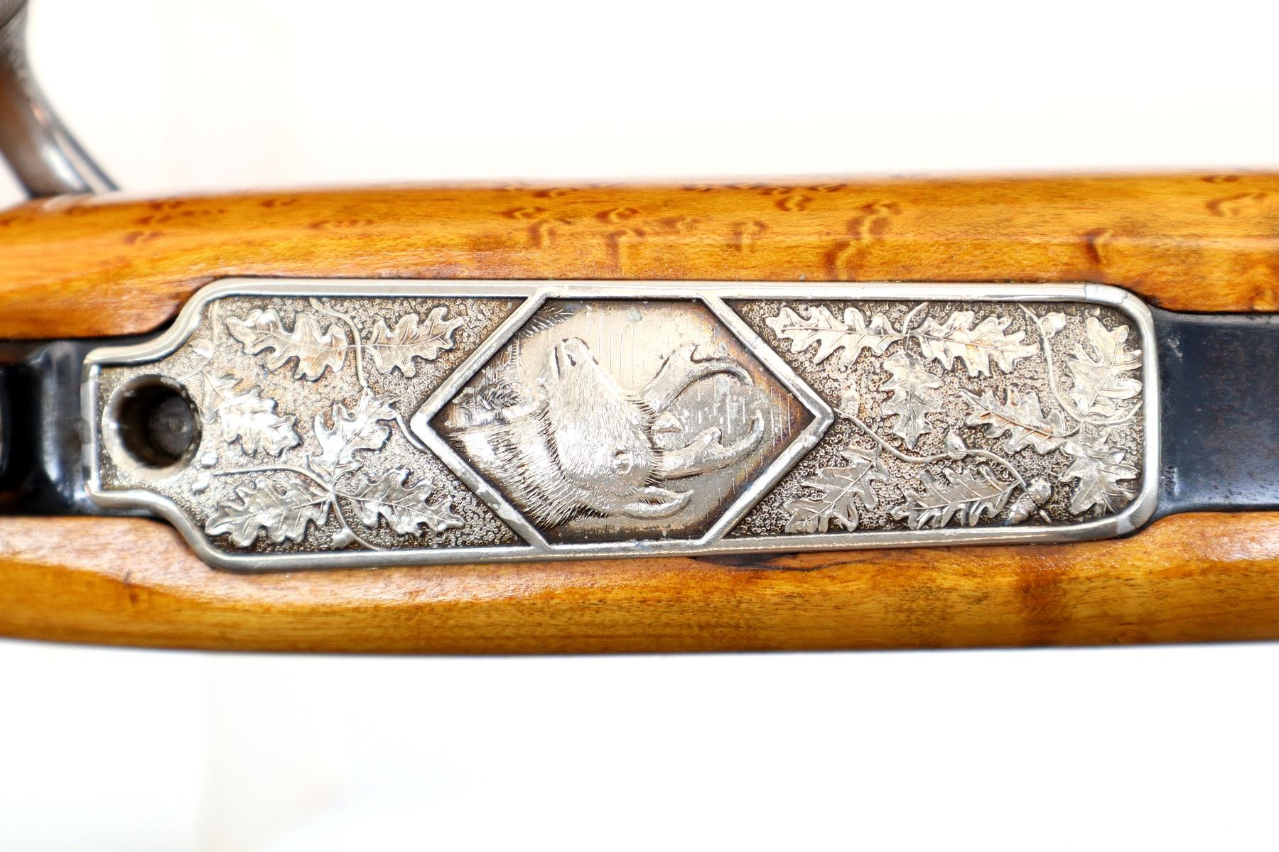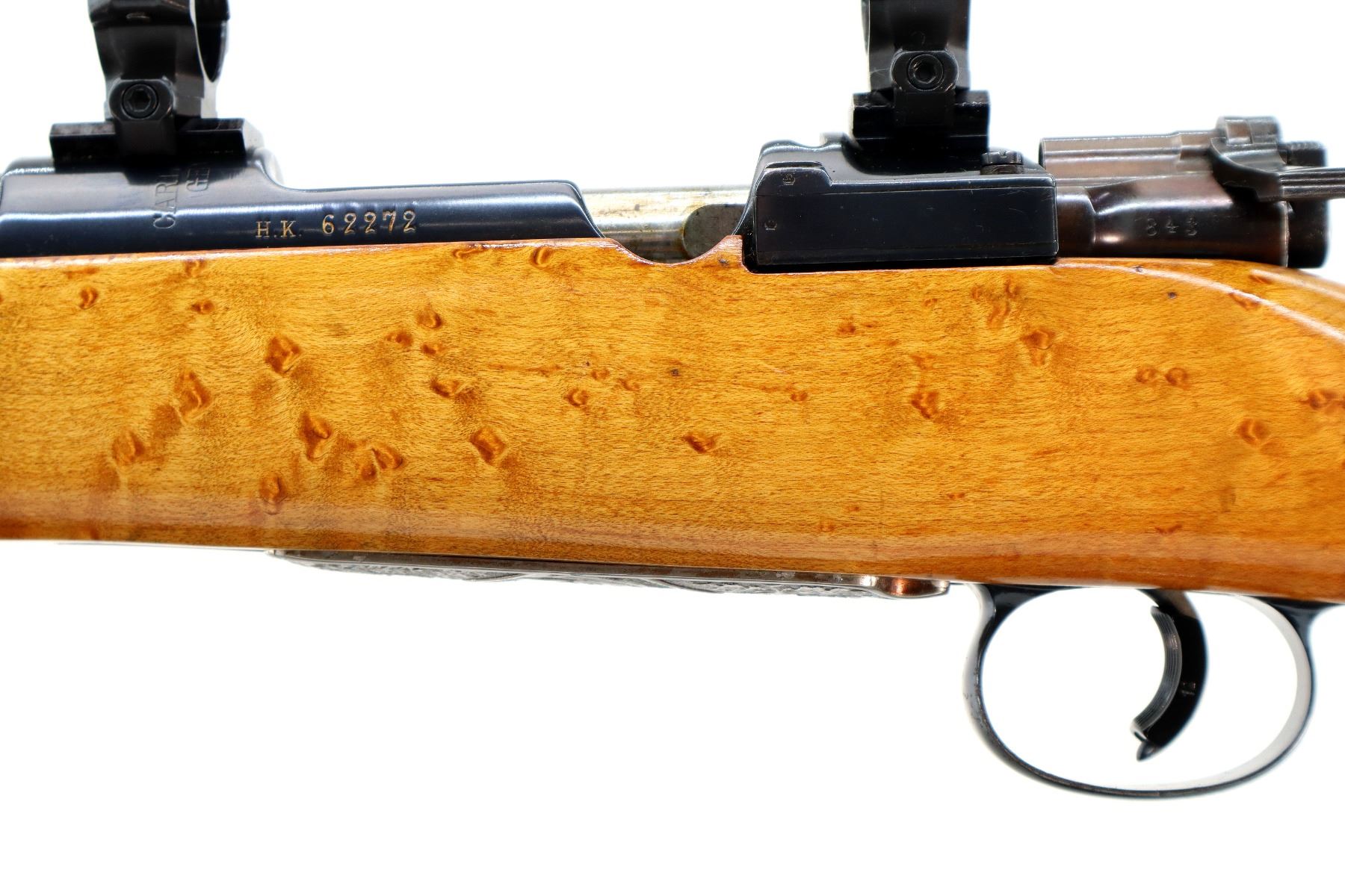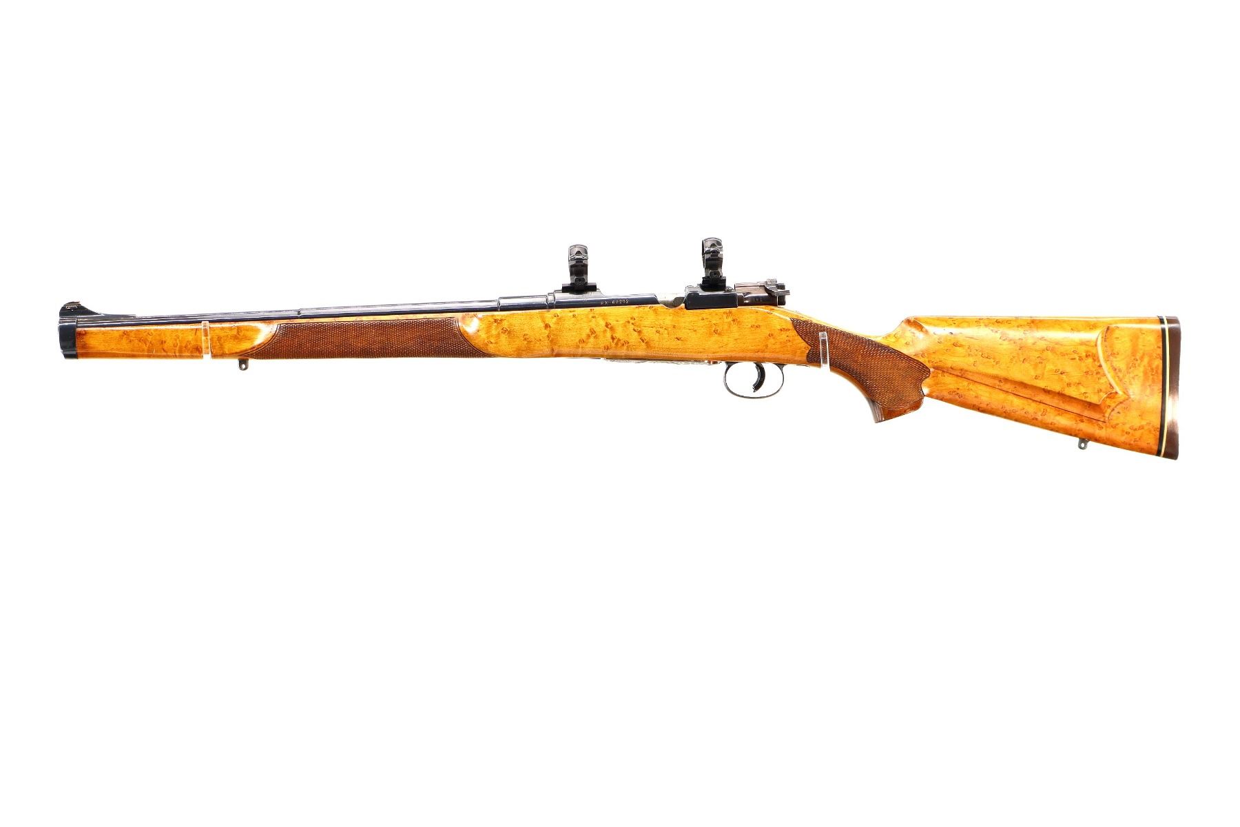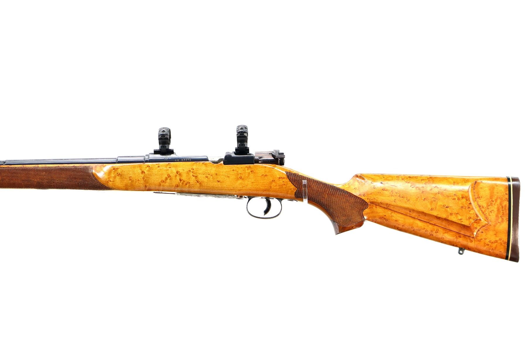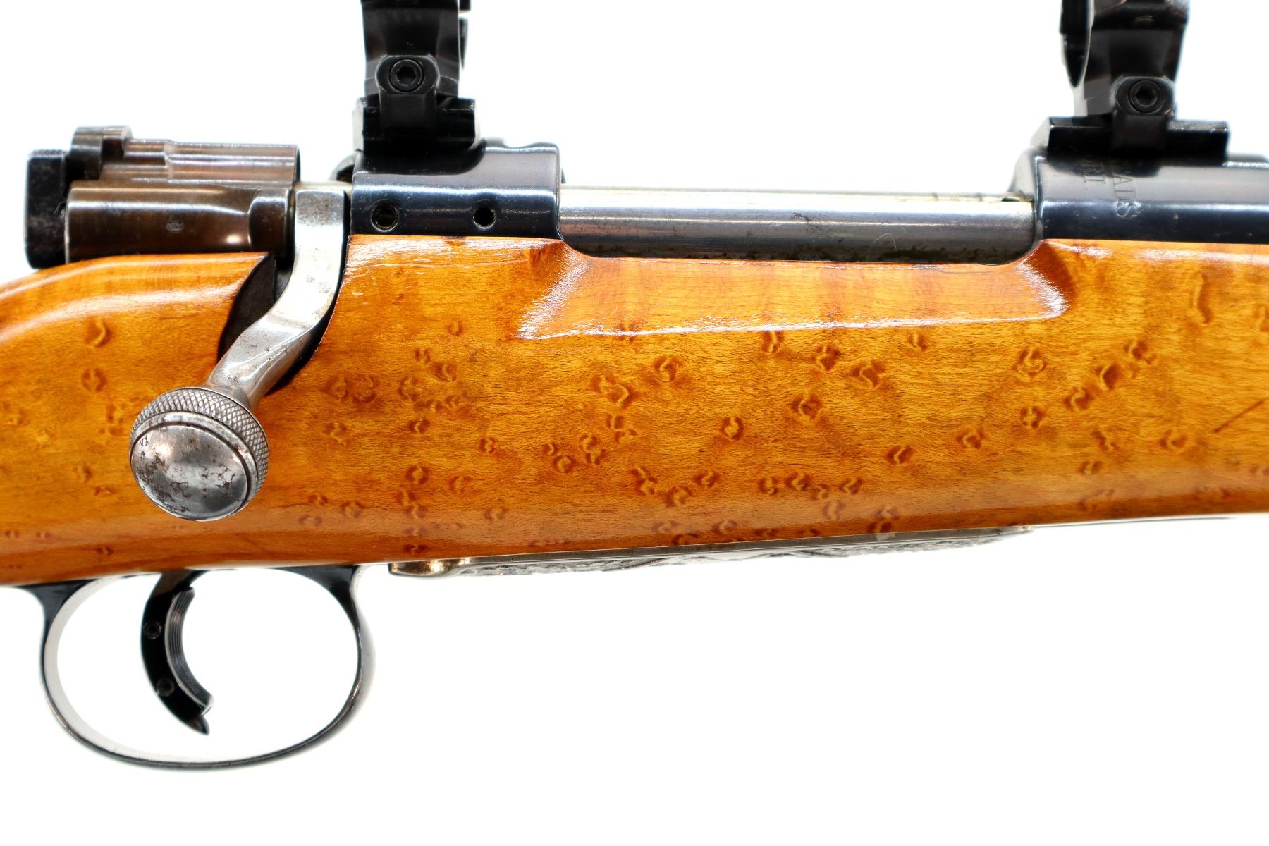 Main Description: Manufactured By Carl Gustafs. Blade front sight with ramp, no rear sight, metal has been polished and reblued, receiver drilled and tapped with 1" millet rings installed, low scope safety and bolt handle with checkered knob. One piece full length Birds Eye maple stock, checkered forearm and pistol grip, small cracks behind upper tang, cheek rest, brown rubber recoil pad, wood grip cap, engraved floor plate, swivel studs, steel nose cap.