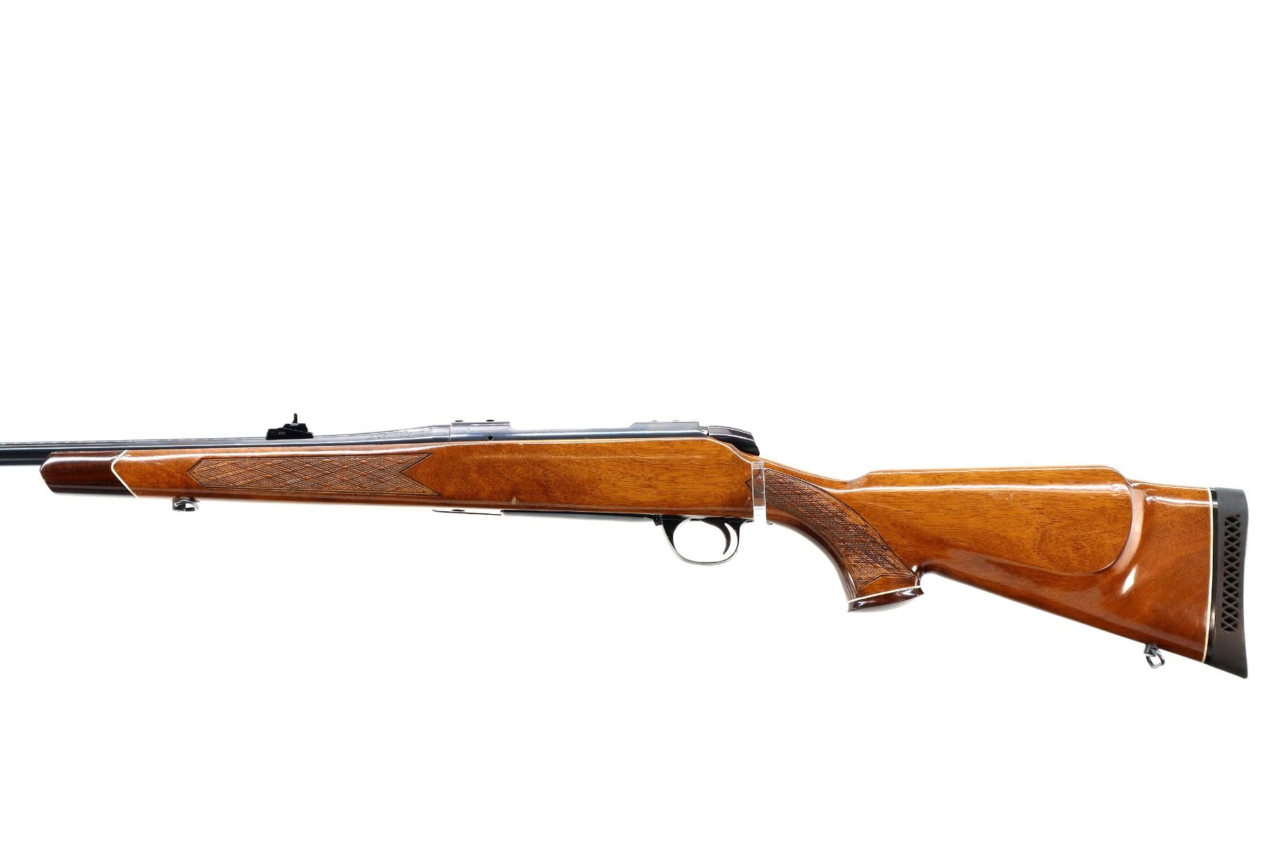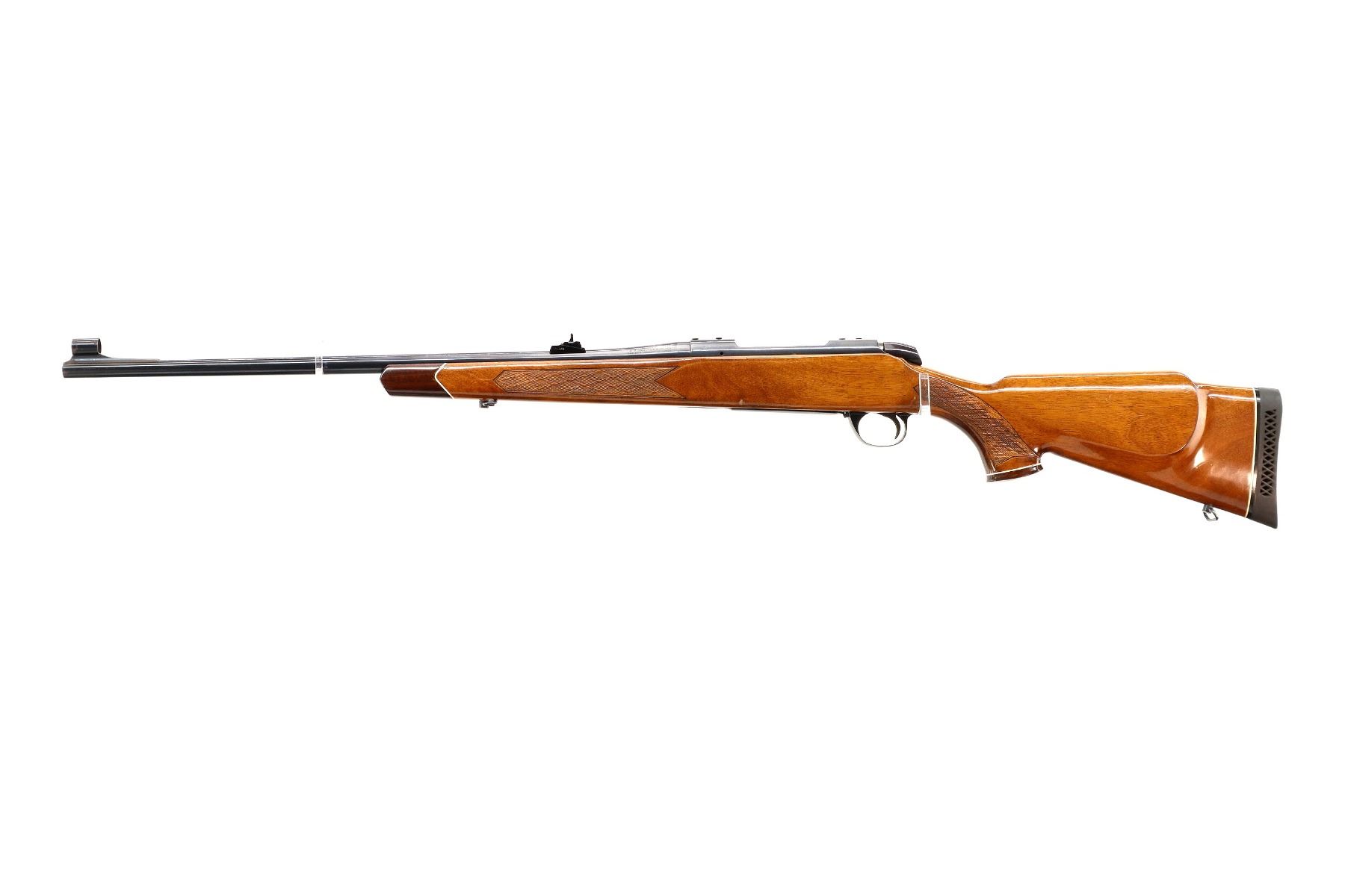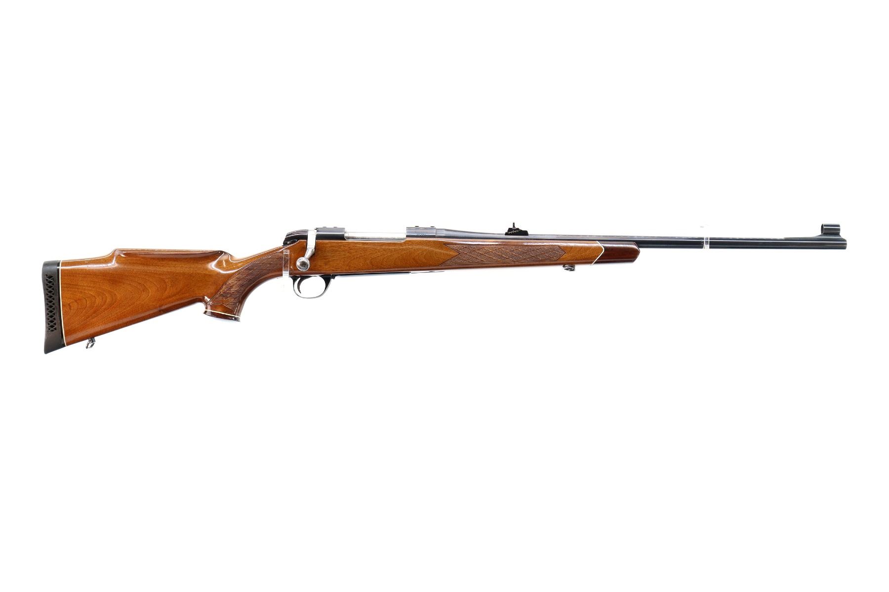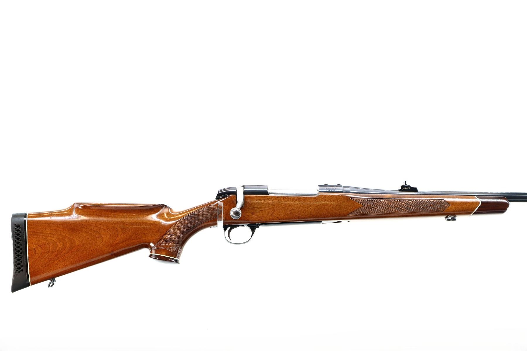 Main Description: Blade front sight with hood and ramp, adjustable u notched rear sight, blued finish, receiver drilled and tapped with plastic plugs installed, smooth bolt knob. One piece wood stock, Rosewood forend and pistol grip caps, checkered forearm and pistol grip with right hand palm swell, roll over cheek rest, black vented rubber recoil pad, 14.25" LOP, hinged floor plate, sling swivels.