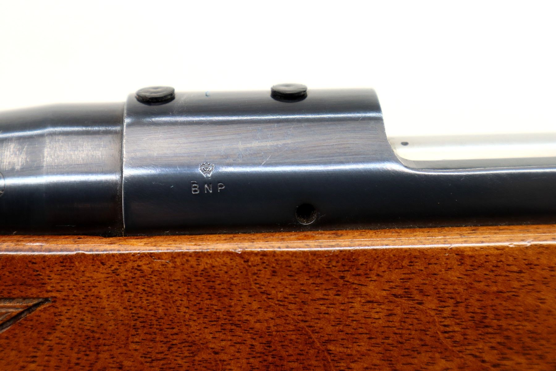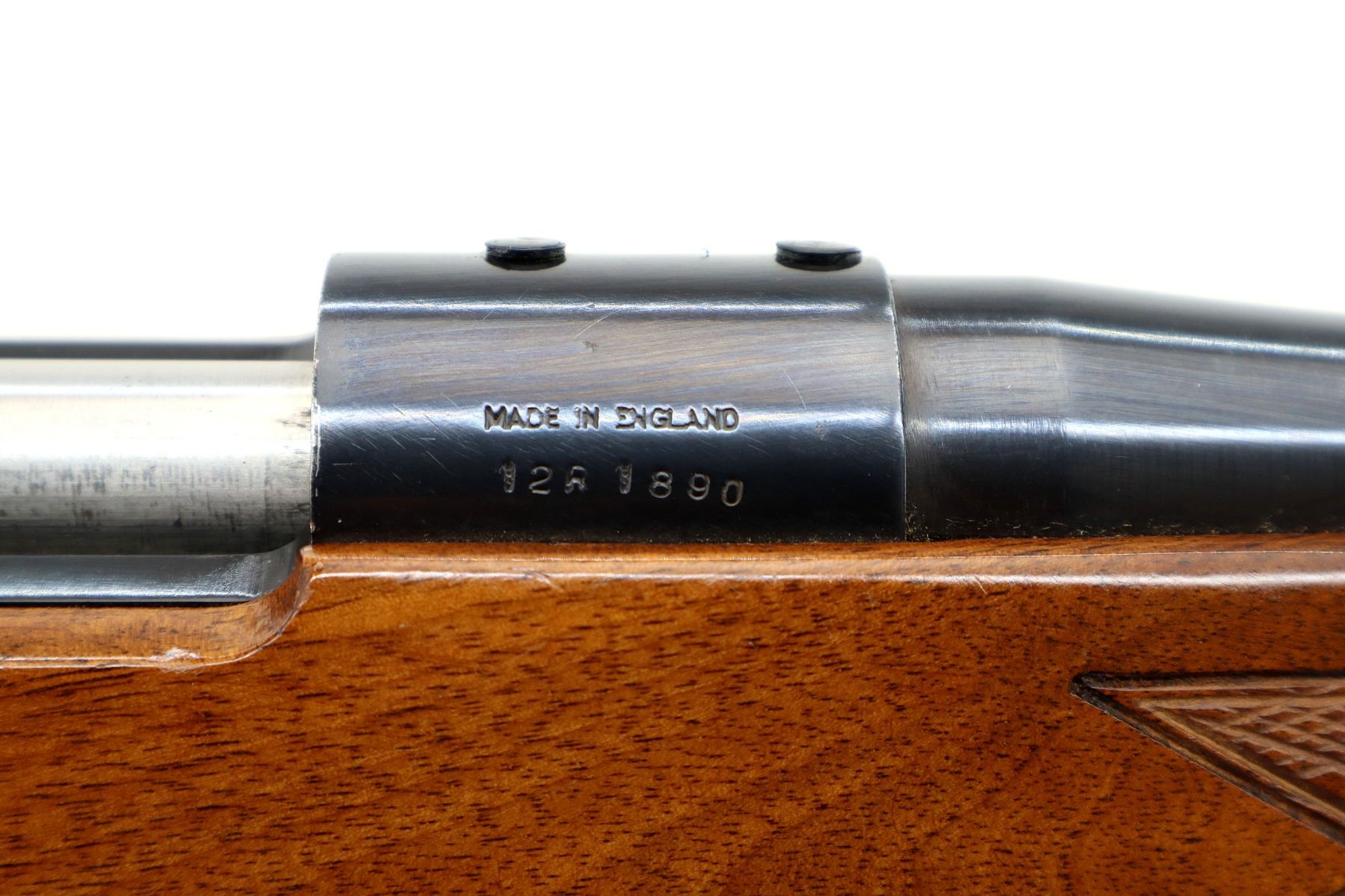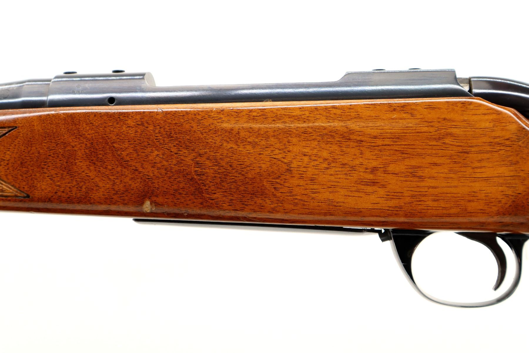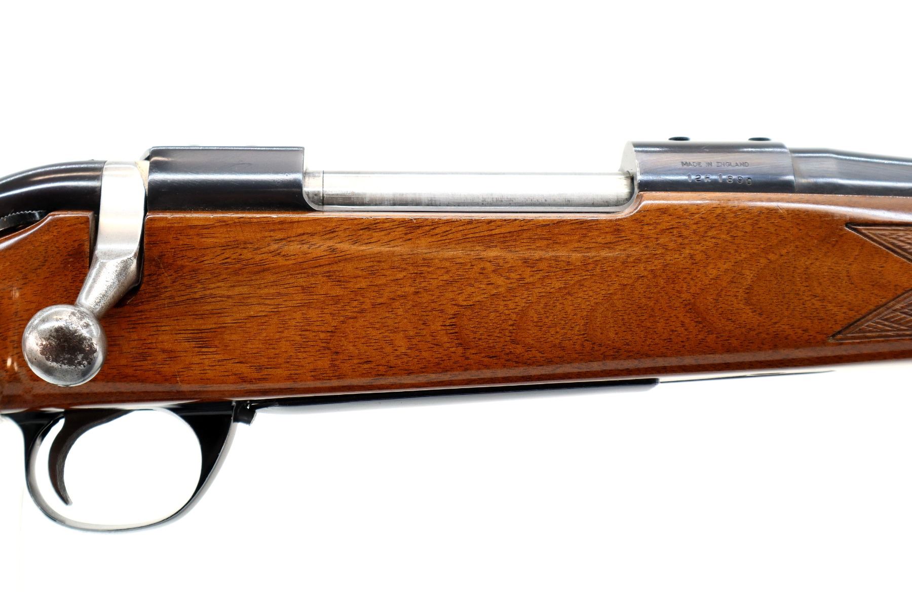 Main Description: Blade front sight with hood and ramp, adjustable u notched rear sight, blued finish, receiver drilled and tapped with plastic plugs installed, smooth bolt knob. One piece wood stock, Rosewood forend and pistol grip caps, checkered forearm and pistol grip with right hand palm swell, roll over cheek rest, black vented rubber recoil pad, 14.25" LOP, hinged floor plate, sling swivels.