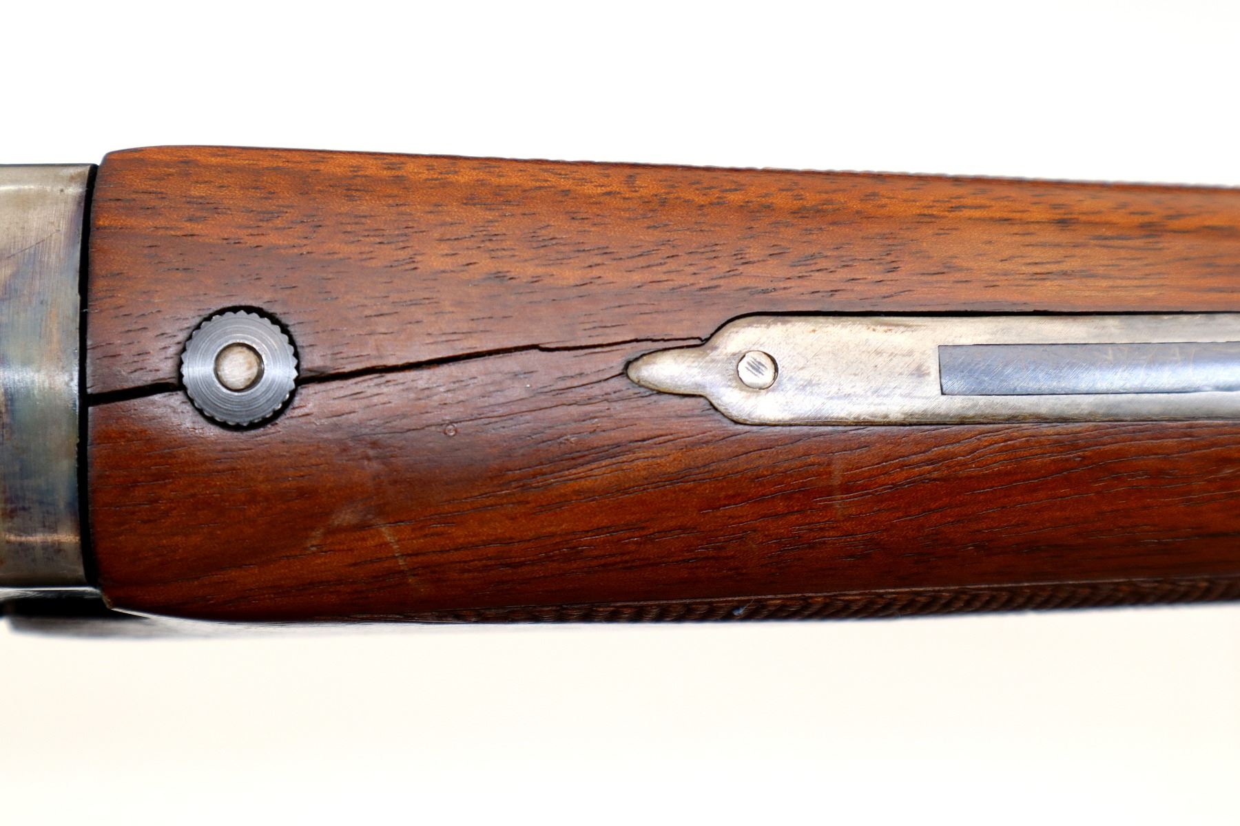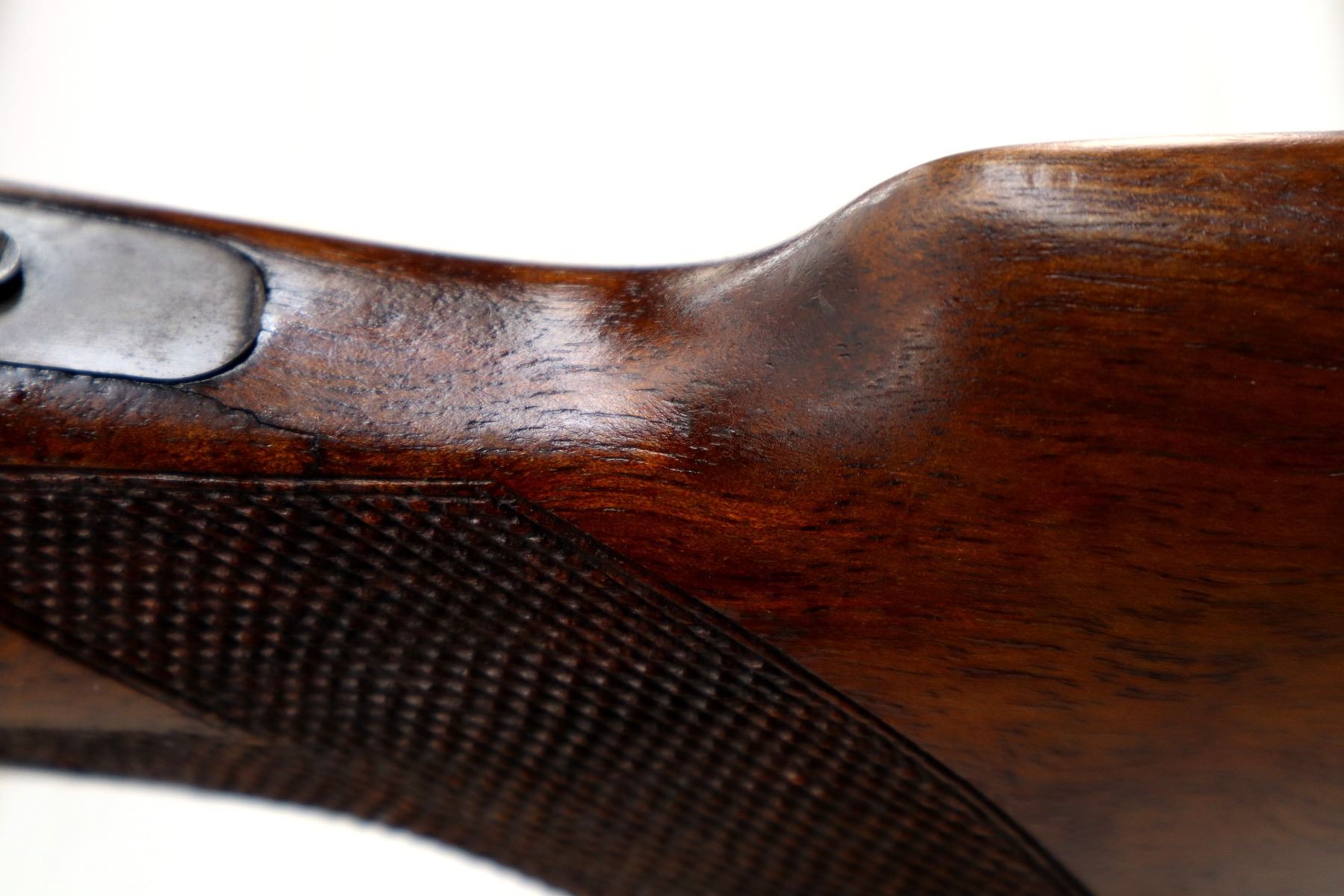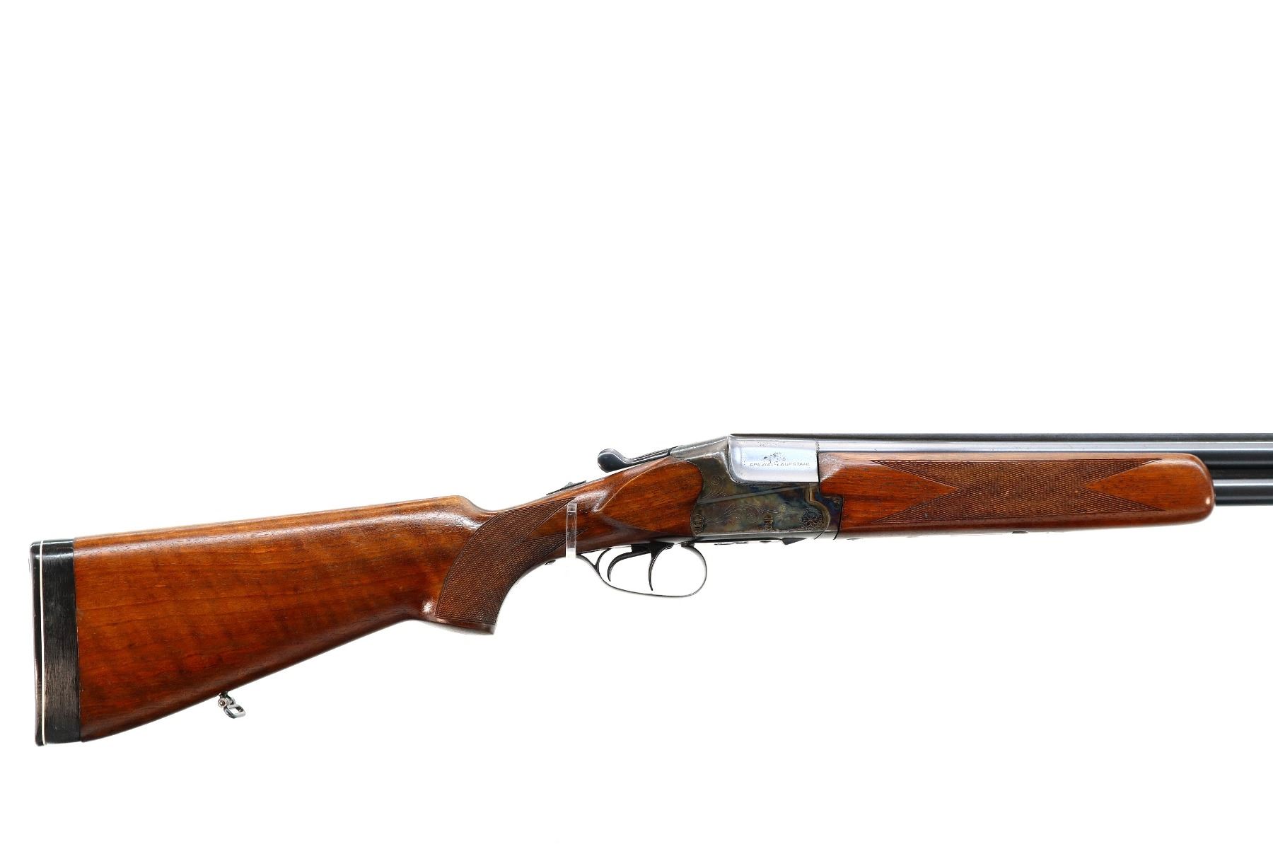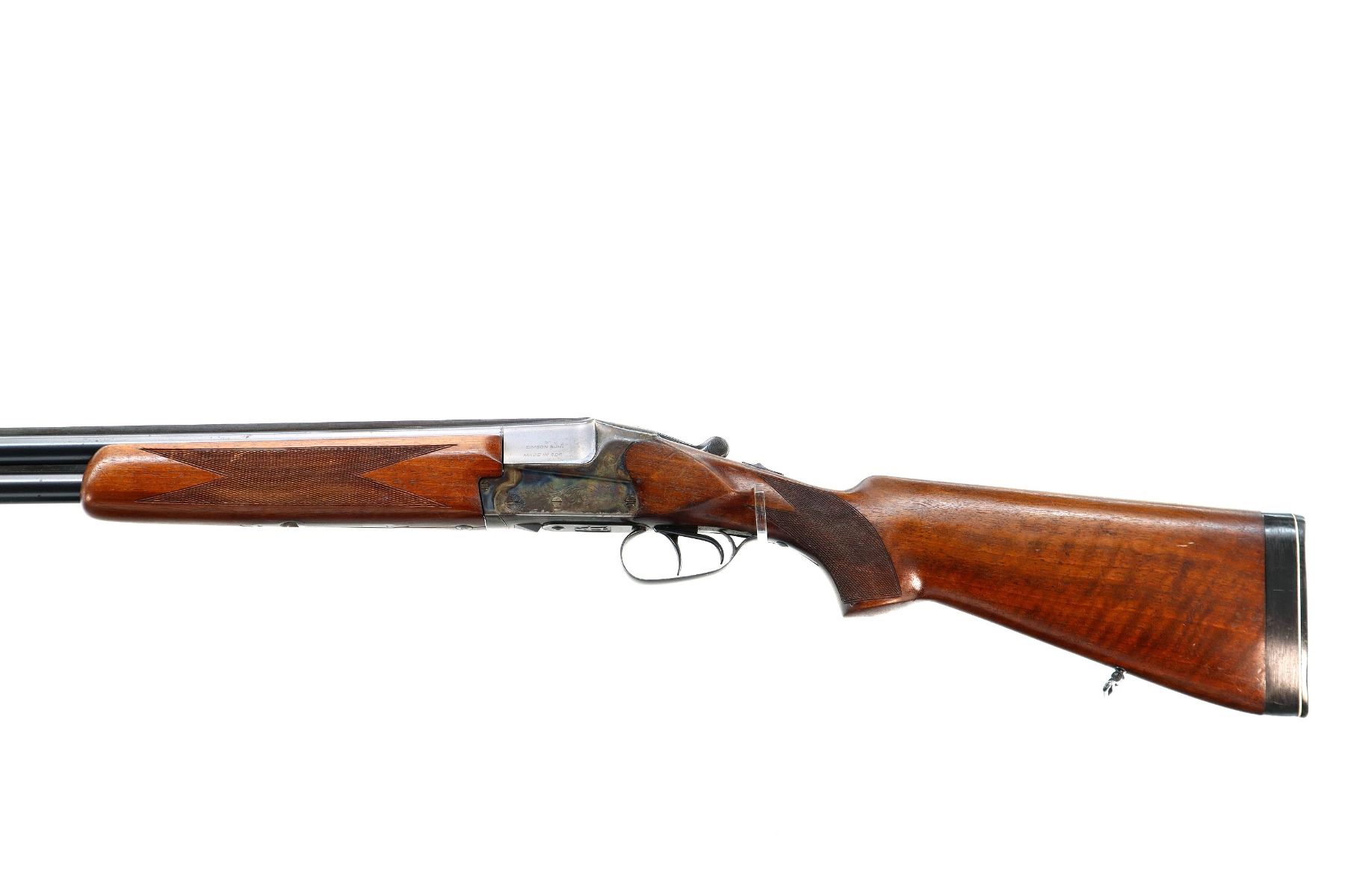 Main Description: White and red fiber optic front beads, blued barrels with solid rib, engraved colour case hardened receiver, automatic safety, ejectors, double triggers. Two piece wood stocks, checkered forearm which is cracked and slightly loose, checkered pistol grip and black polymer butt plate with extension, 15.25" LOP, sling swivels.