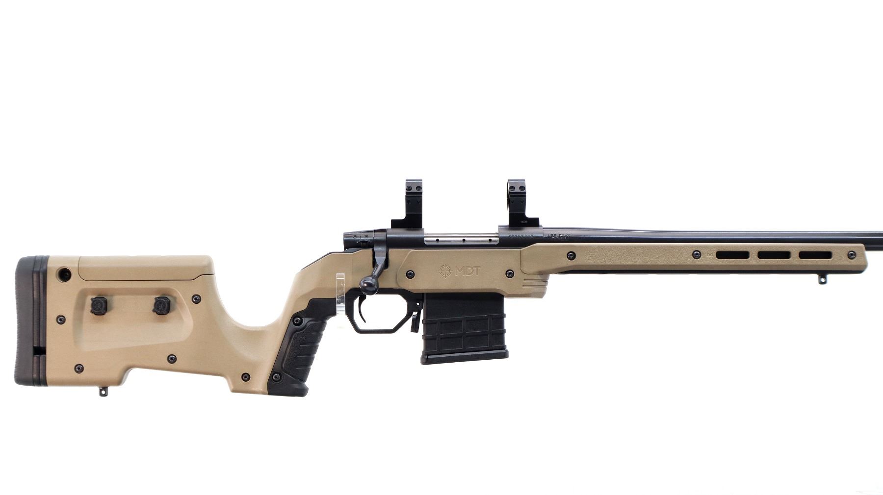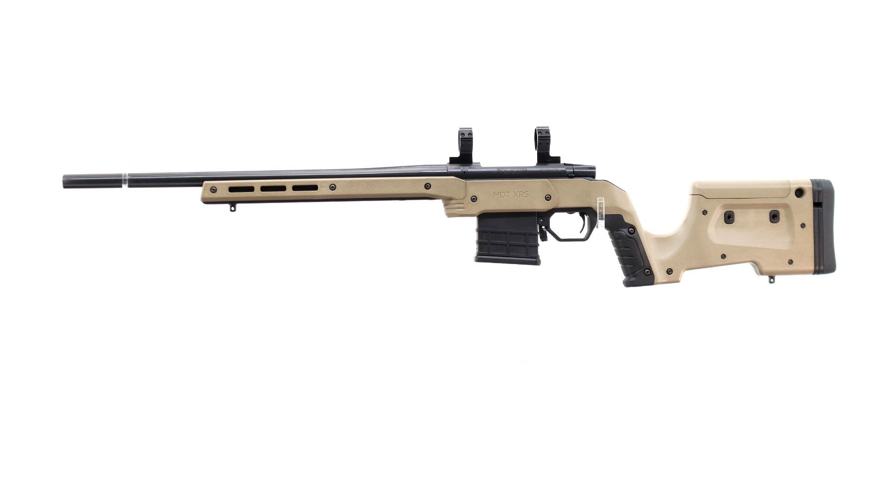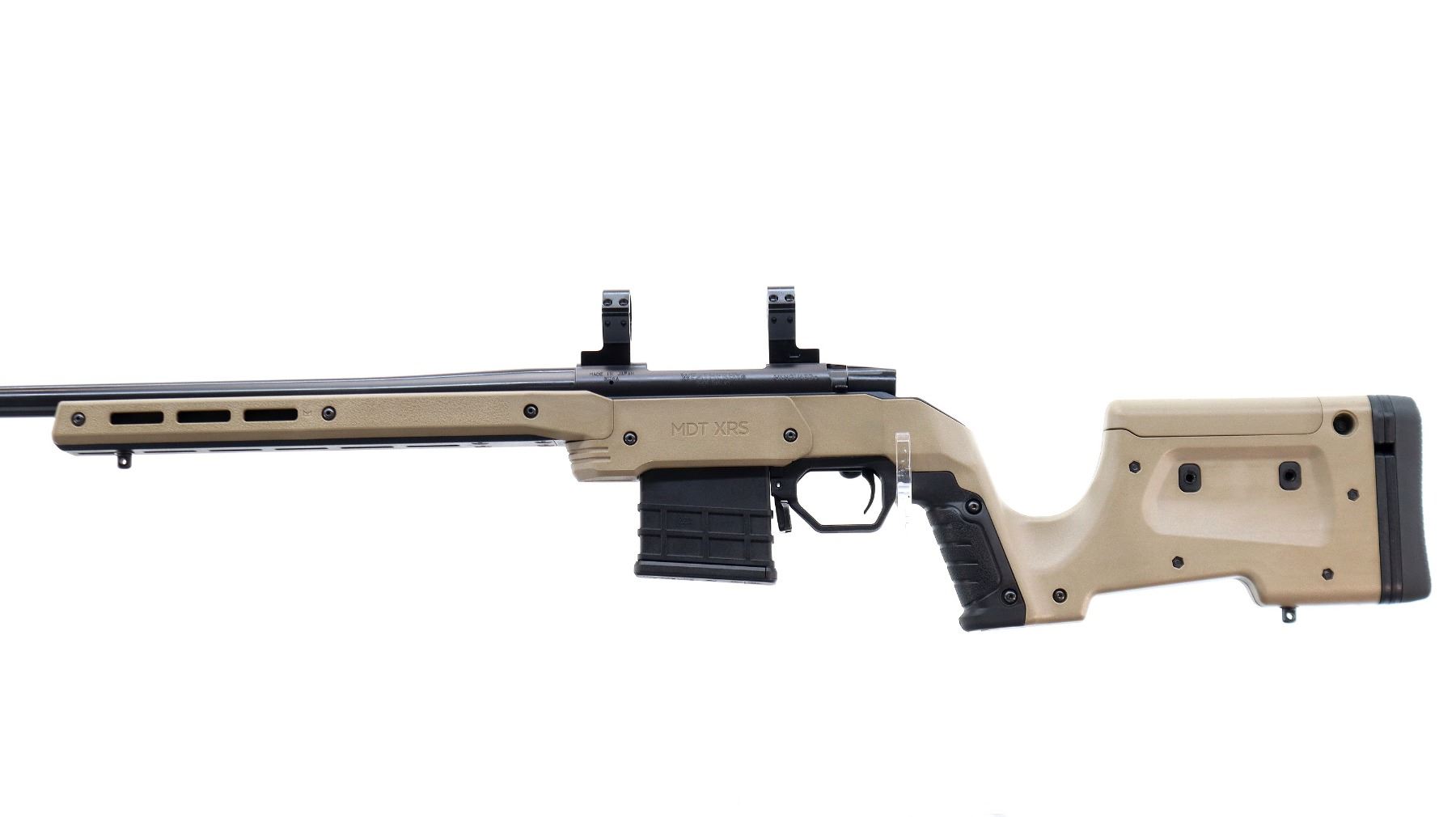 Main Description: No sights, Parkerized metal finish, heavy barrel, receiver drilled and tapped with 30mm rings installed, checkered bolt knob. Two piece MDT XRS FDE synthetic stocks, ventilated forearm, grooved pistol grip, adjustable comb, grooved black rubber recoil pad with spacers, extended ambi mag release, swivel studs.