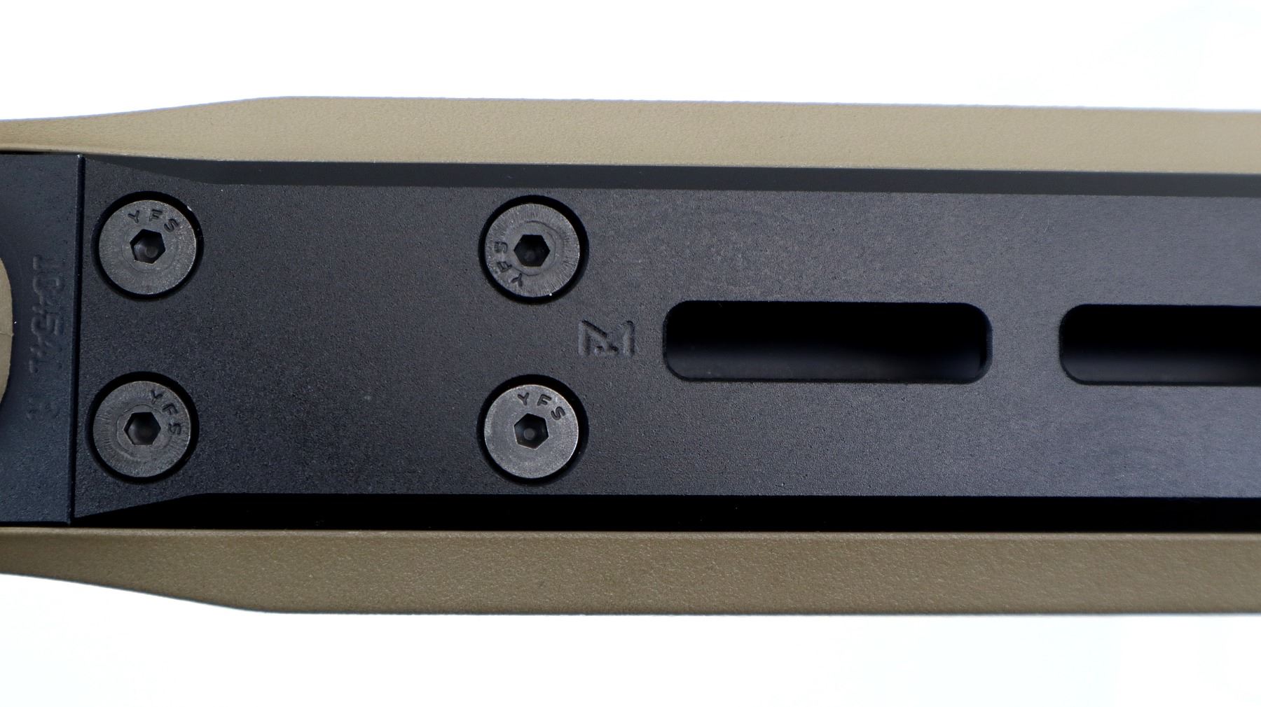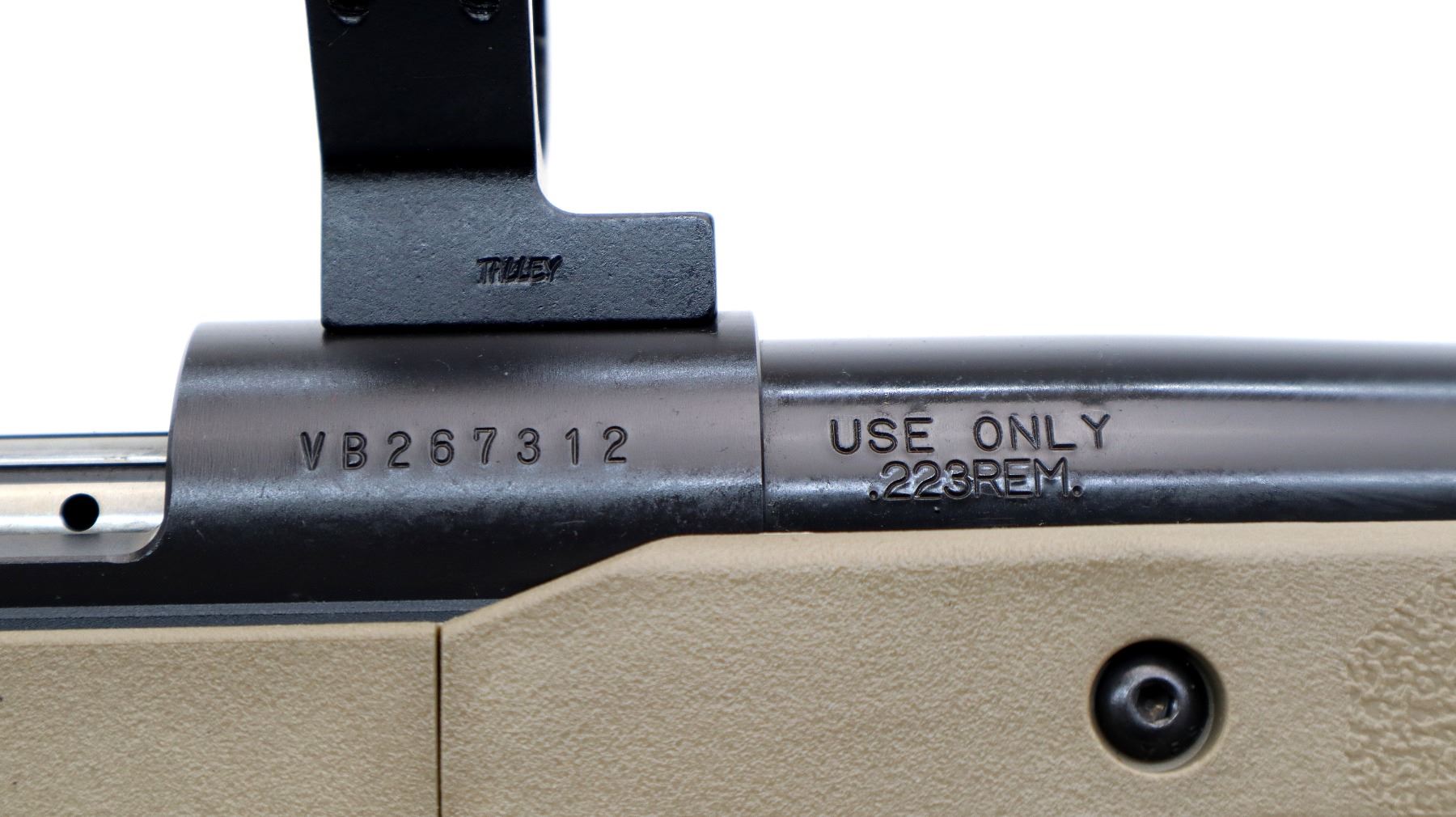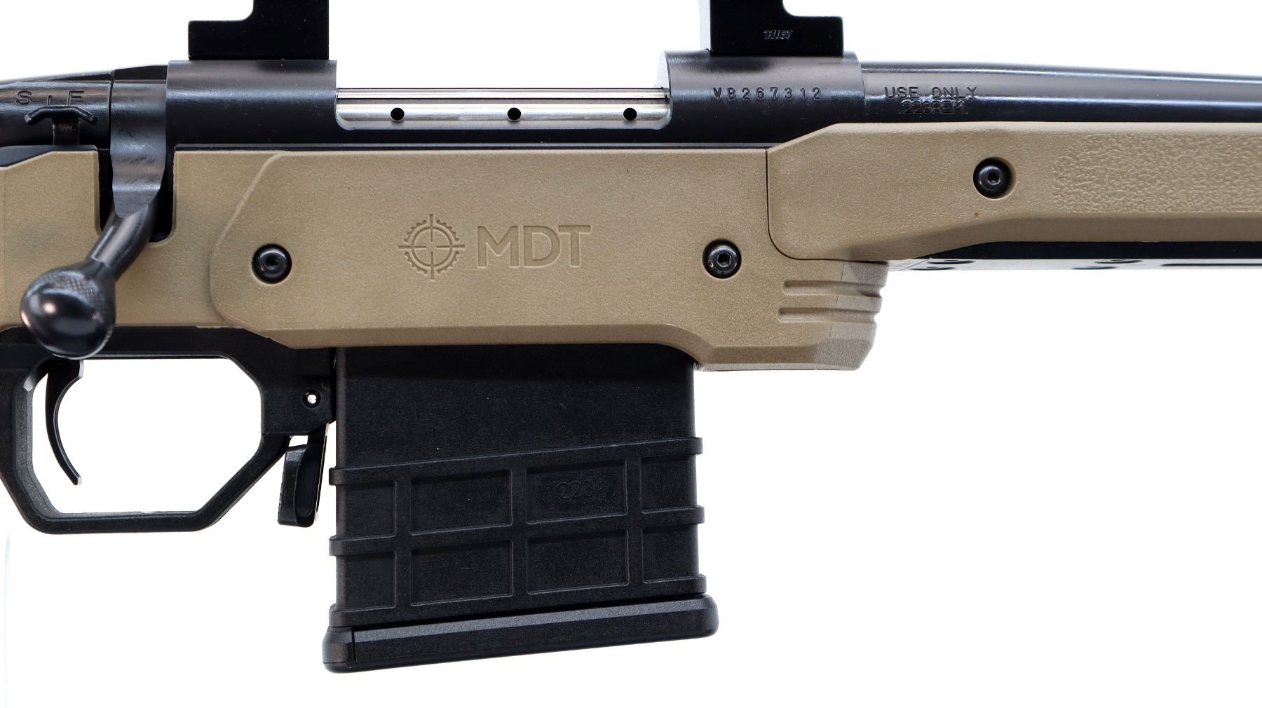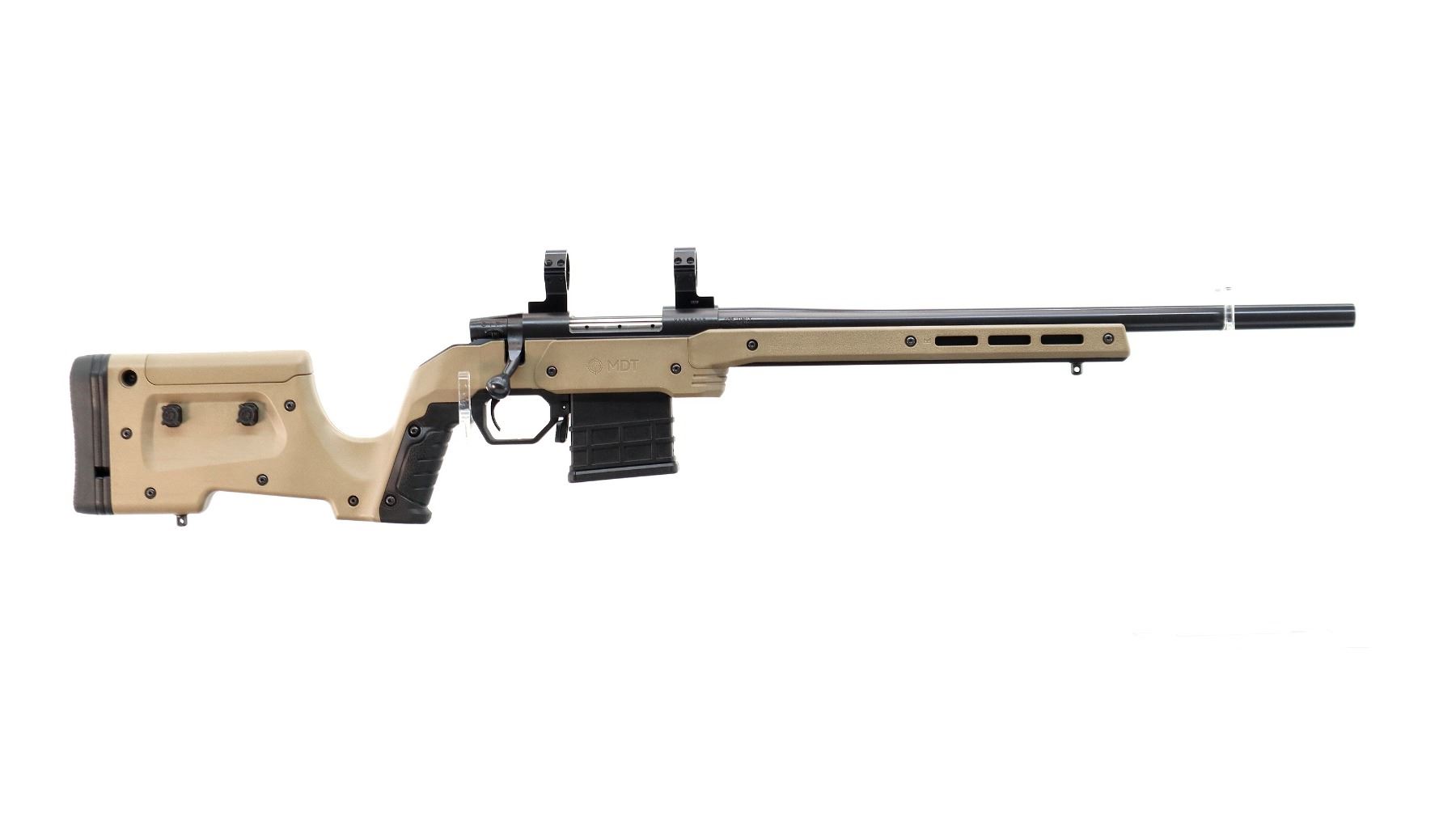 Main Description: No sights, Parkerized metal finish, heavy barrel, receiver drilled and tapped with 30mm rings installed, checkered bolt knob. Two piece MDT XRS FDE synthetic stocks, ventilated forearm, grooved pistol grip, adjustable comb, grooved black rubber recoil pad with spacers, extended ambi mag release, swivel studs.