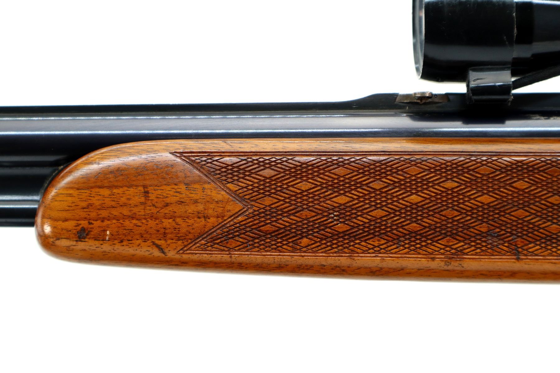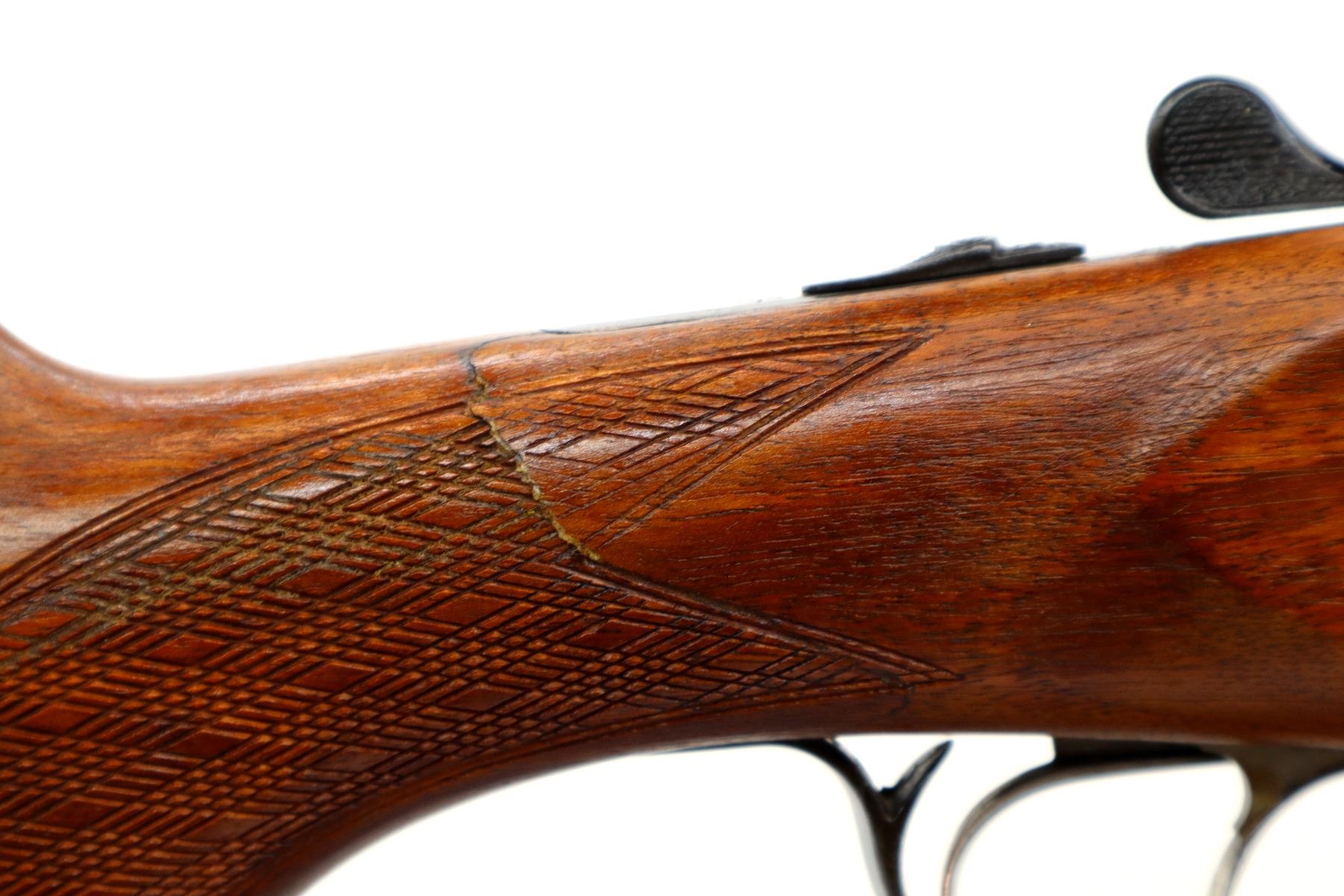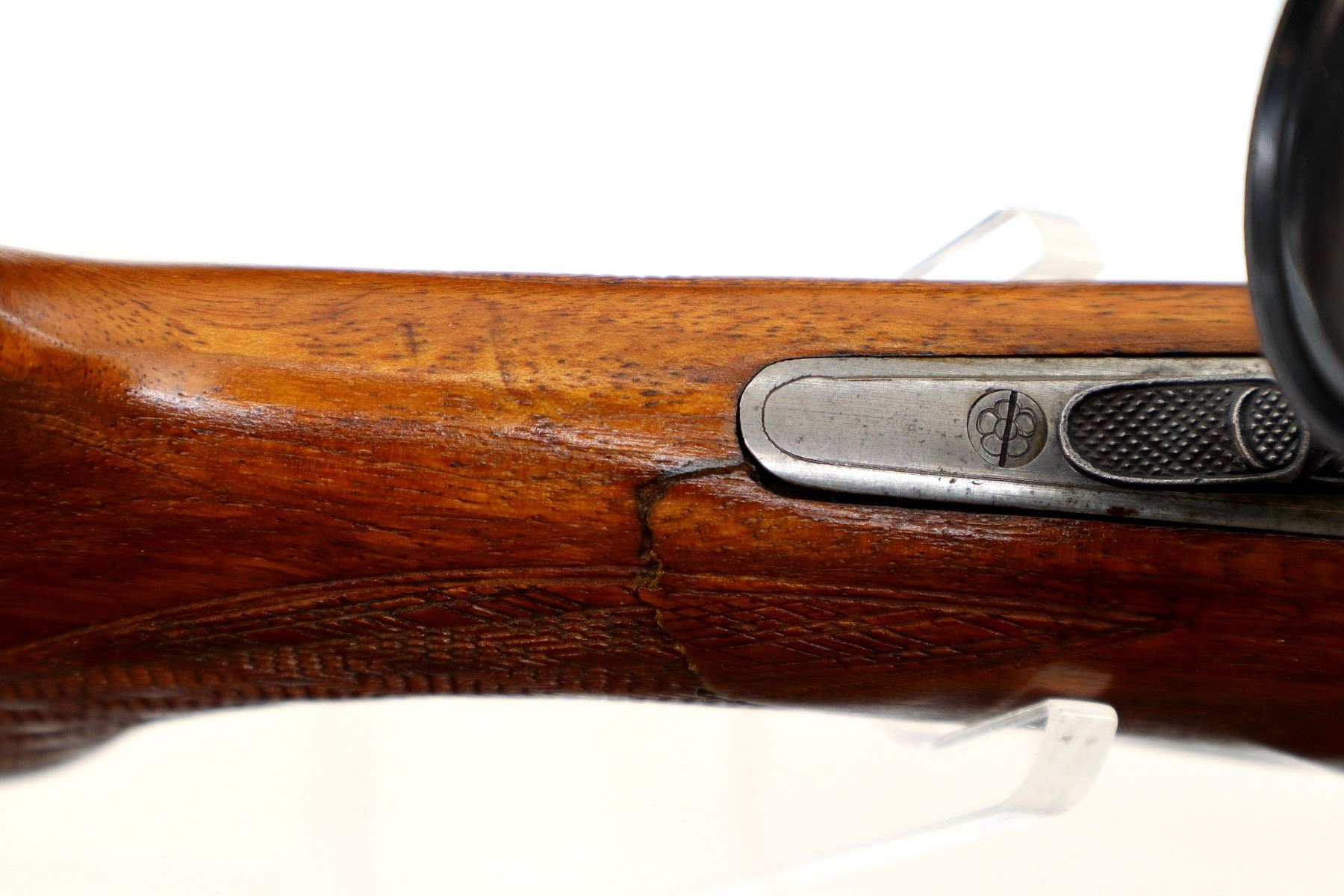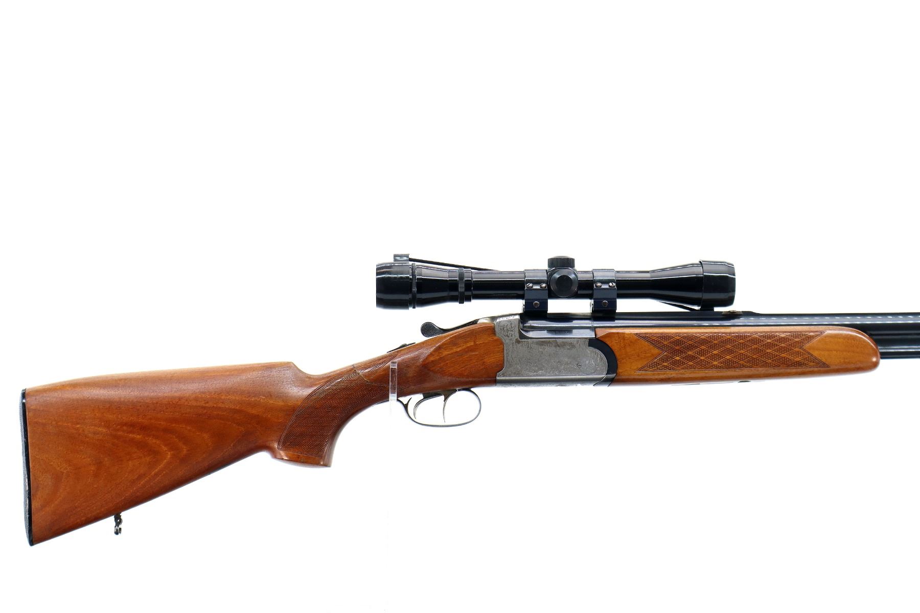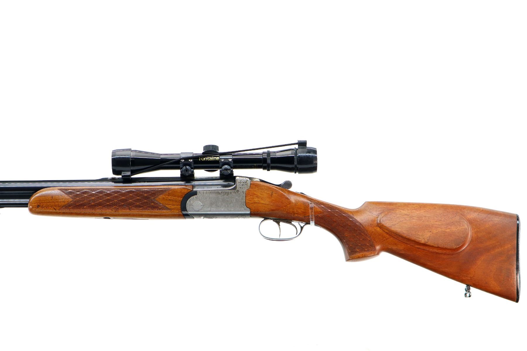 Main Description: Blade front sight with ramp, folding u notched rear sight, blued finish, solid rib drilled and tapped with a Fontaine 4x32 scope installed, clear optics with duplex crosshair. Engraved silver receiver, automatic safety, extractor, double triggers. Two piece wood stocks, checkered forearm, pistol grip and black polymer butt plate, stock cracked through wrist, European cheek rest, sling swivels.