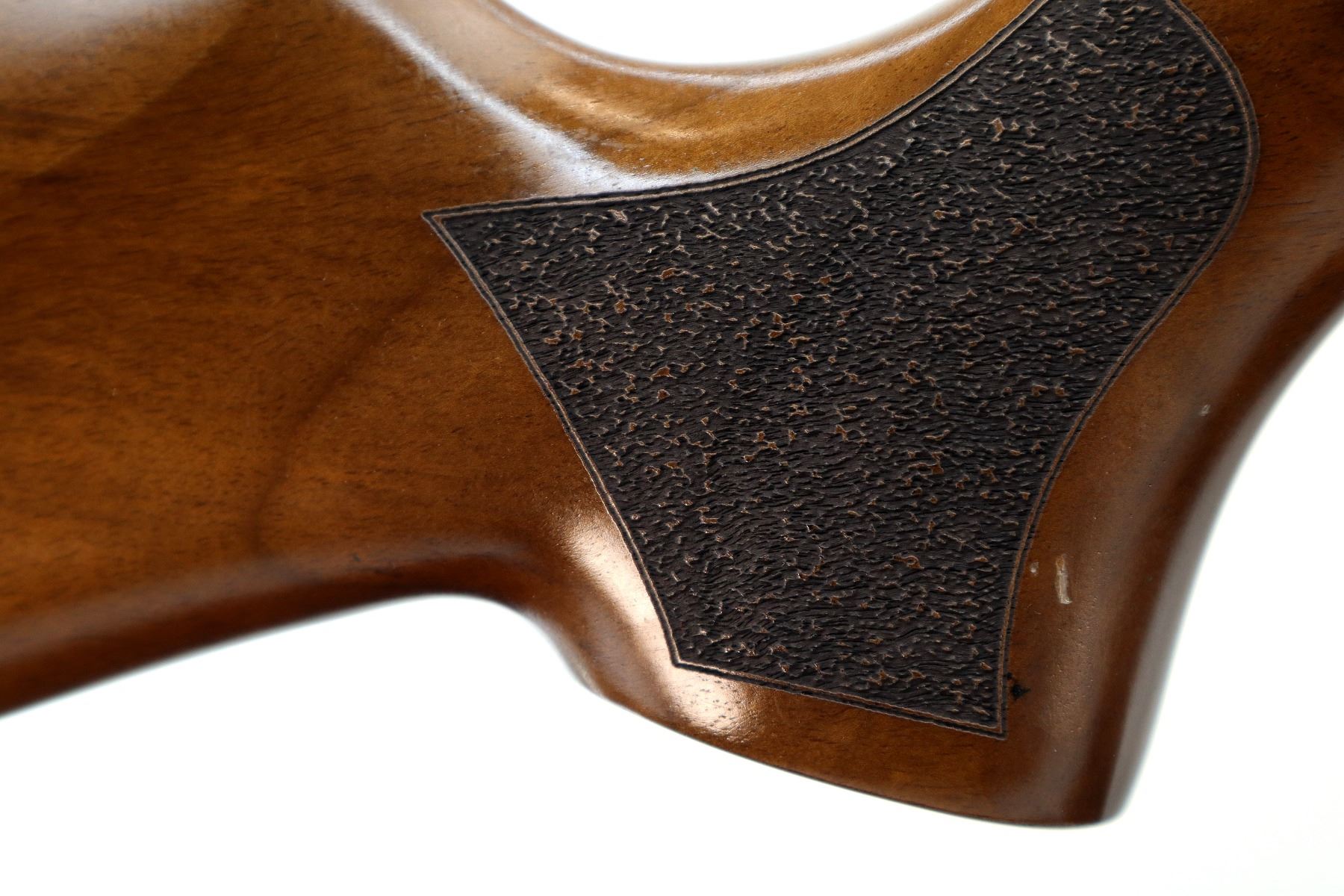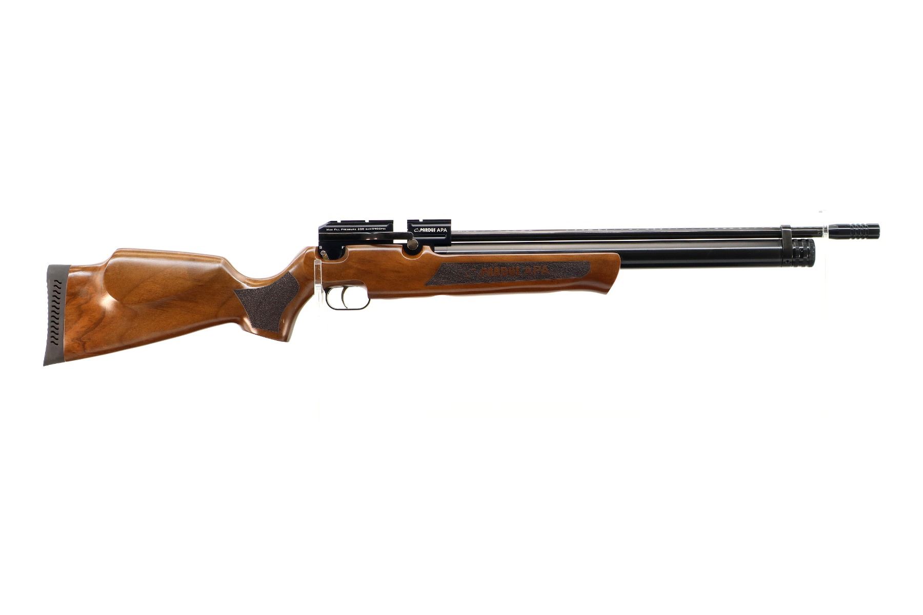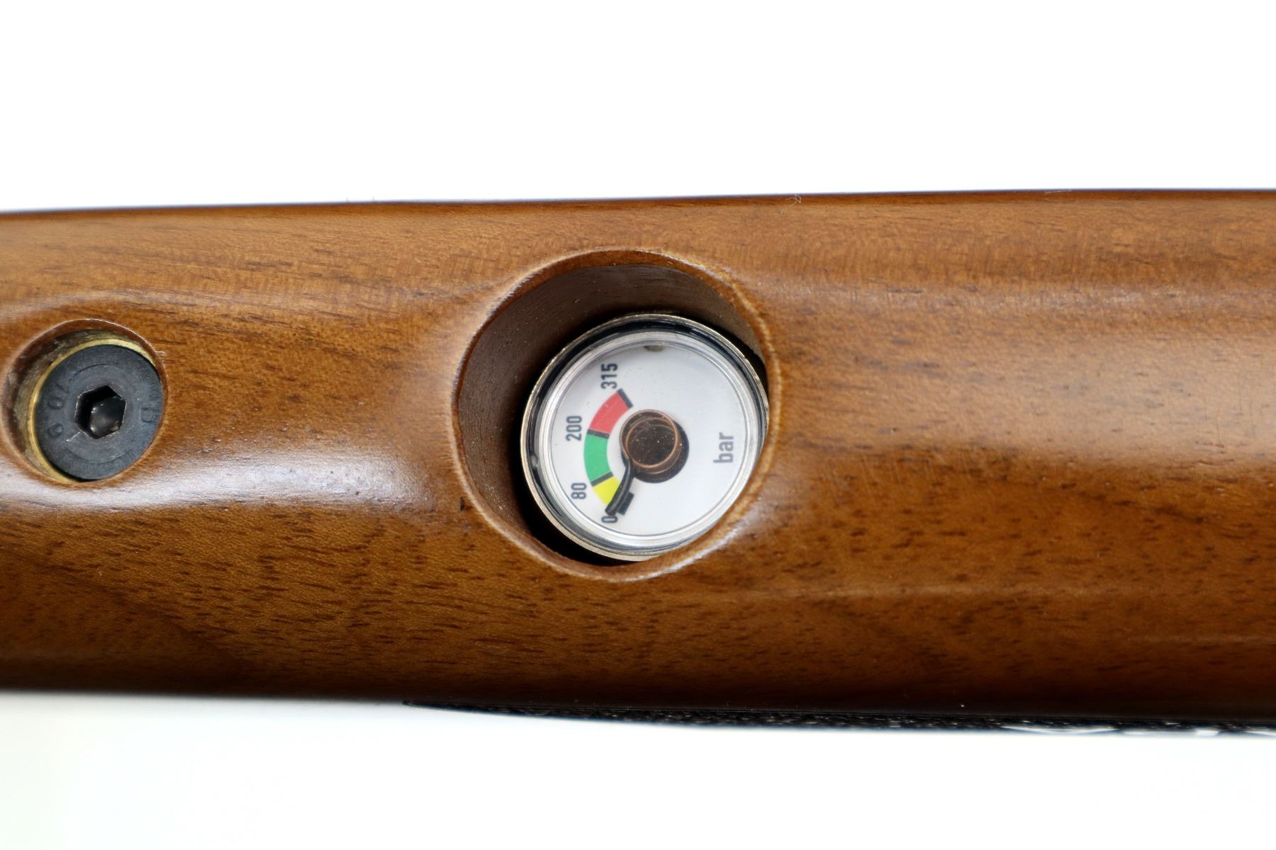 Main Description: No sights, blued round barrel with extension at muzzle, black alloy receiver, grooved for scope mount, smooth cocking lever, large air cylinder under barrel. One piece wood stock, textured forearm and pistol grip panels, ambi cheek rest, black vented rubber recoil pad
