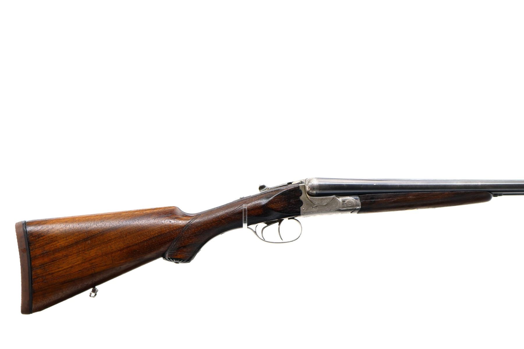 Main Description: Brass bead, blued barrels with raised rib, engraved silver receiver, automatic safety, extractor, double triggers. Two piece wood stocks, checkered forearm with brass plate, checkered pistol grip, small crack behind upper tang and left side of receiver, brown rubber recoil pad, stock cracked and repaired at toe, grip cap, sling swivels.