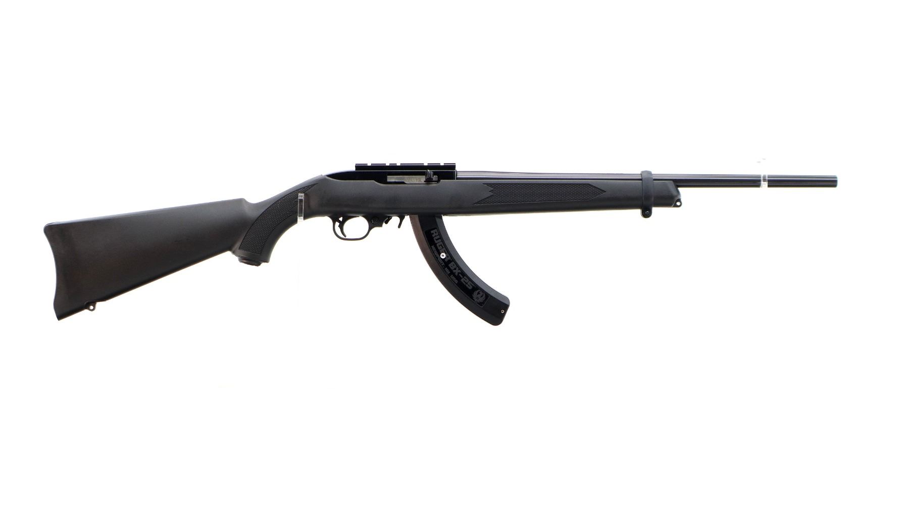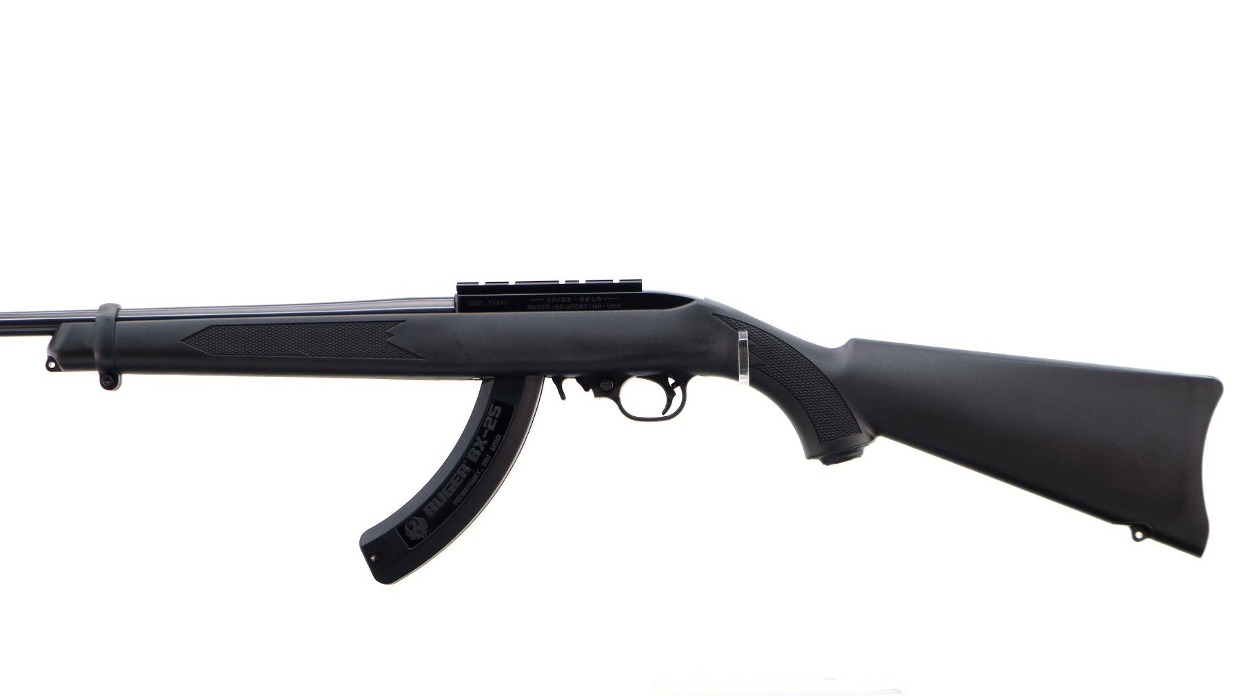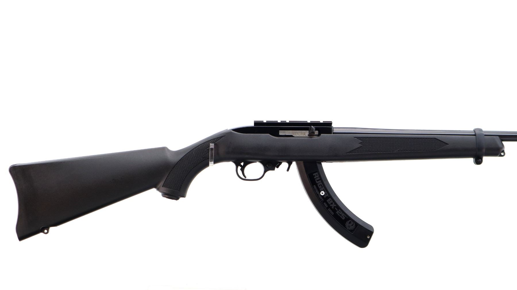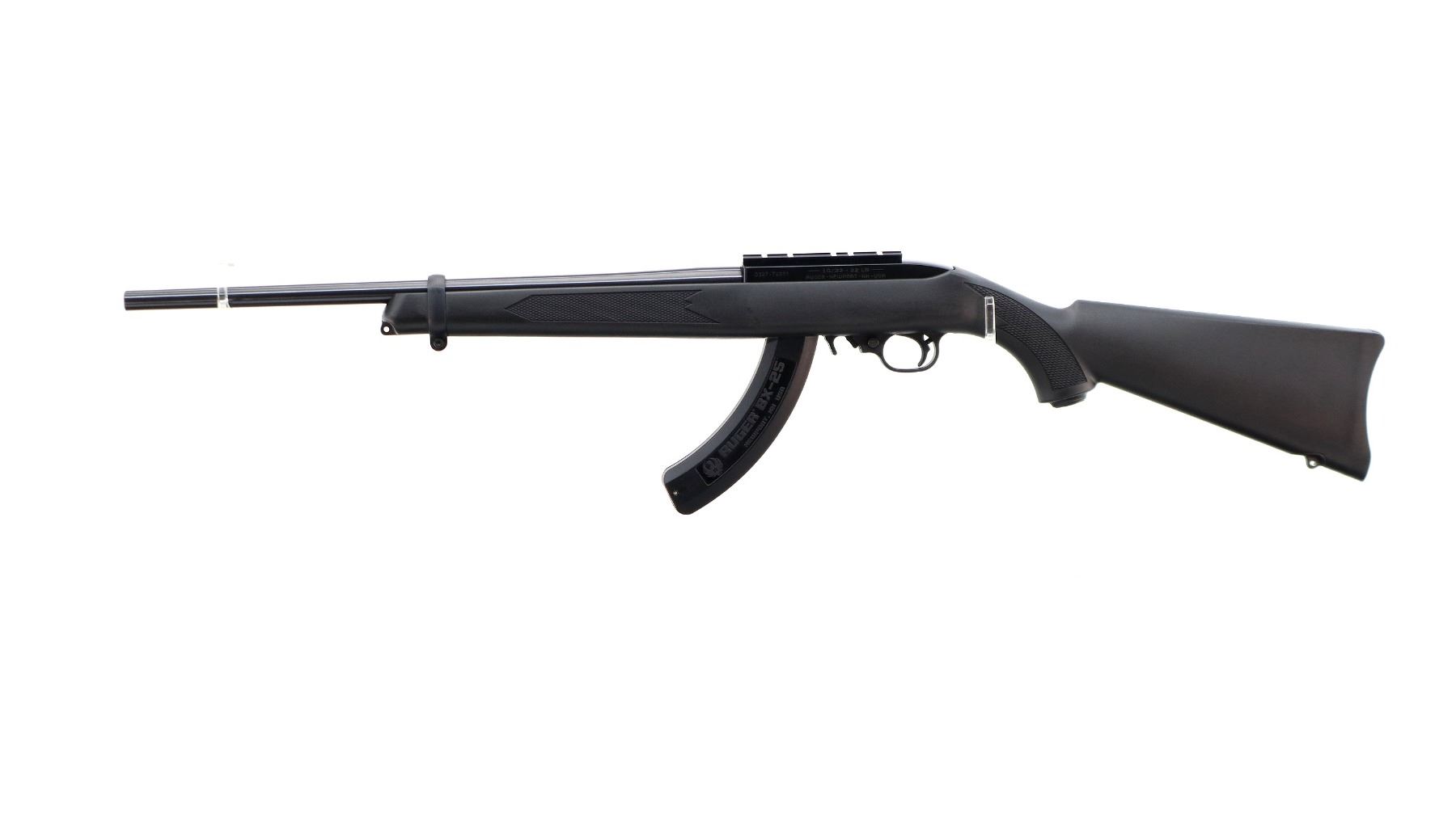 Main Description: No sights, blued round barrel, black alloy receiver drilled and tapped with scope mount installed. One piece black synthetic stock, checkered forearm, pistol grip, black polymer butt plate, grip cap, extended mag release, swivel studs. 2 Magazines that are included are Ruger BX-25 Factory 10/25 round pinned mags.