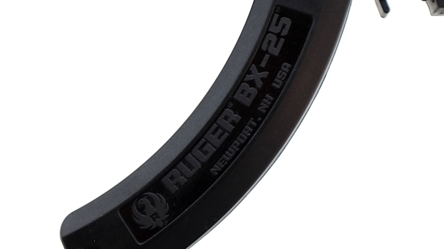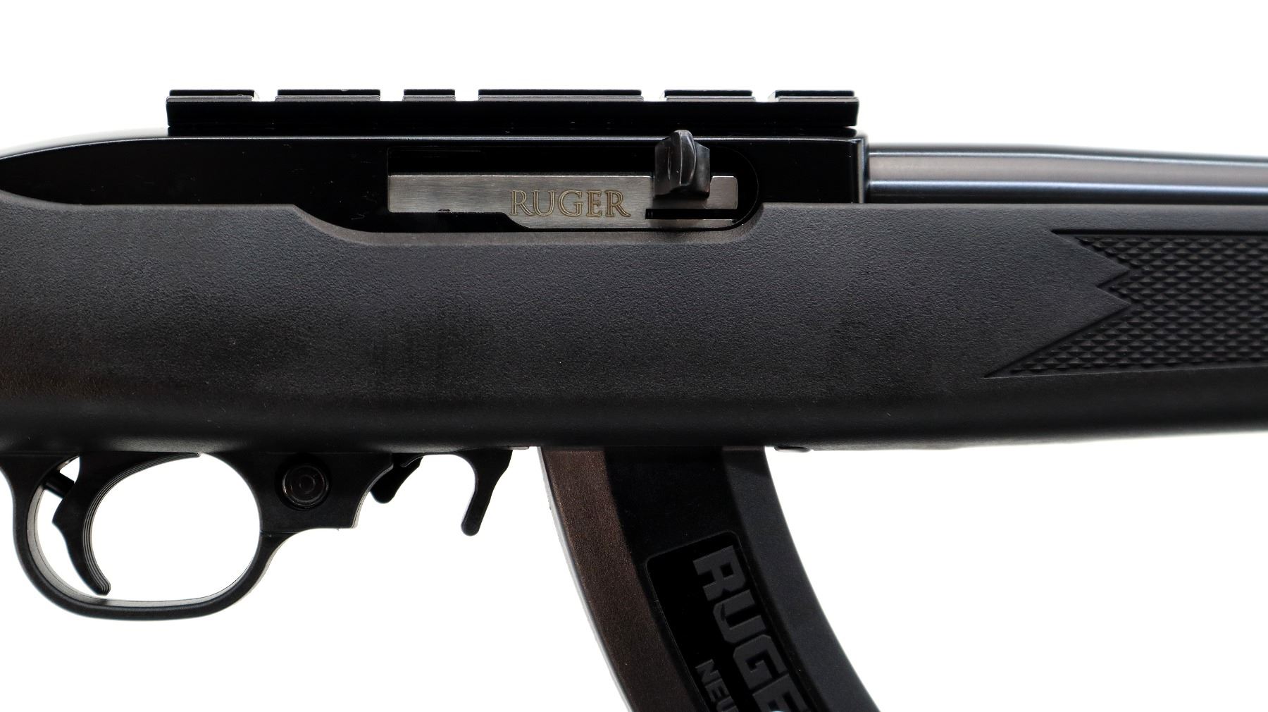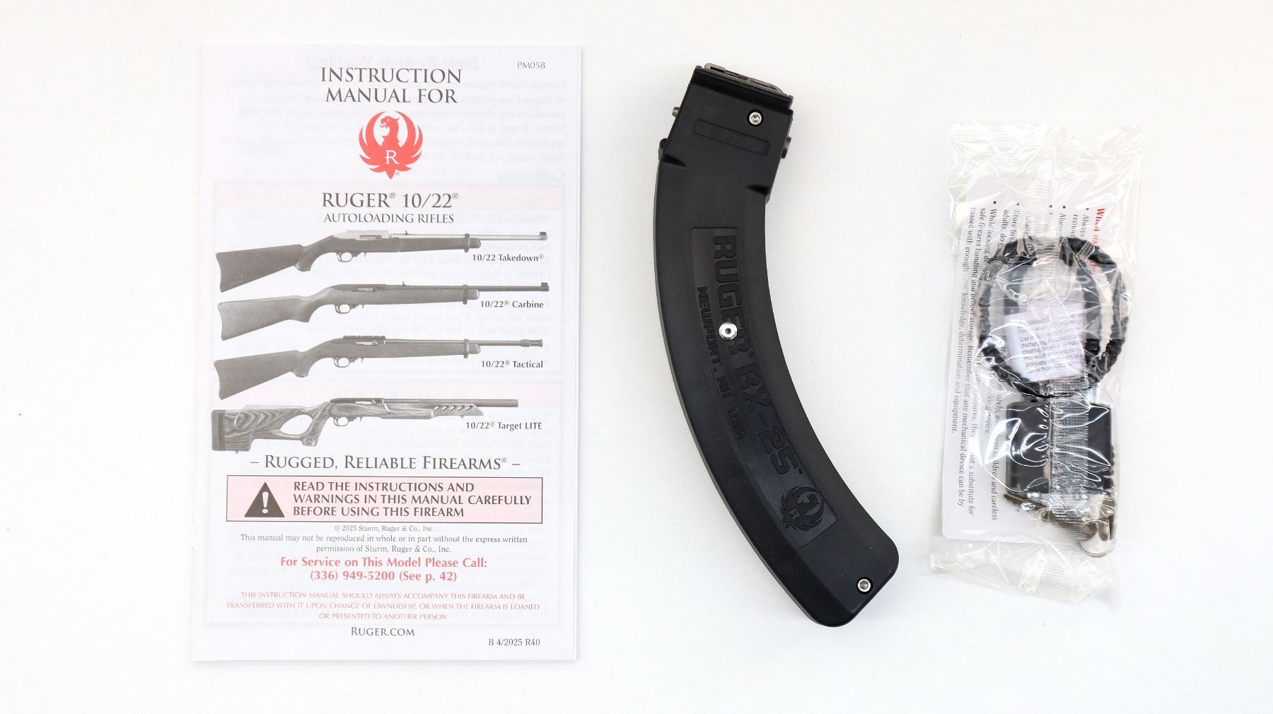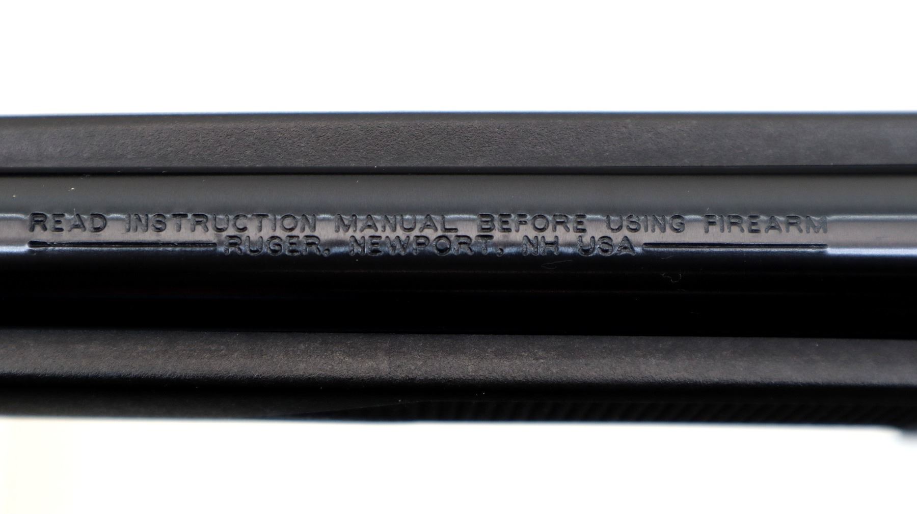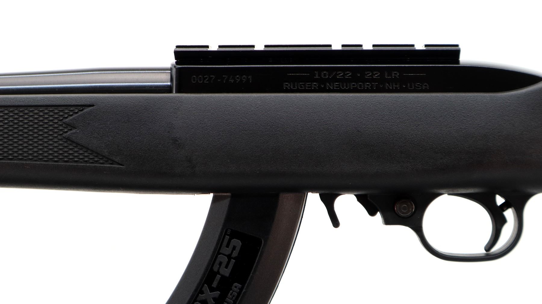 Main Description: No sights, blued round barrel, black alloy receiver drilled and tapped with scope mount installed. One piece black synthetic stock, checkered forearm, pistol grip, black polymer butt plate, grip cap, extended mag release, swivel studs. 2 Magazines that are included are Ruger BX-25 Factory 10/25 round pinned mags.
