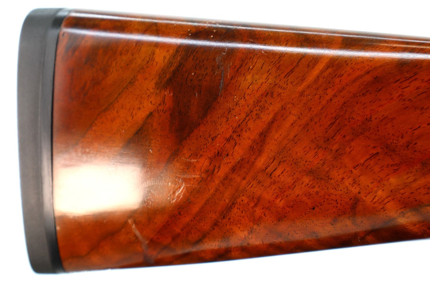 Main Description: White front and mid rib beads, blued barrels with raised rib that are slightly loose on face, engraved silver receiver, manual safety, extractor, double triggers. Two piece wood stocks, checkered splinter forearm cracked at tip, checkered pistol grip, black rubber recoil pad, 13.75" LOP, grip cap.