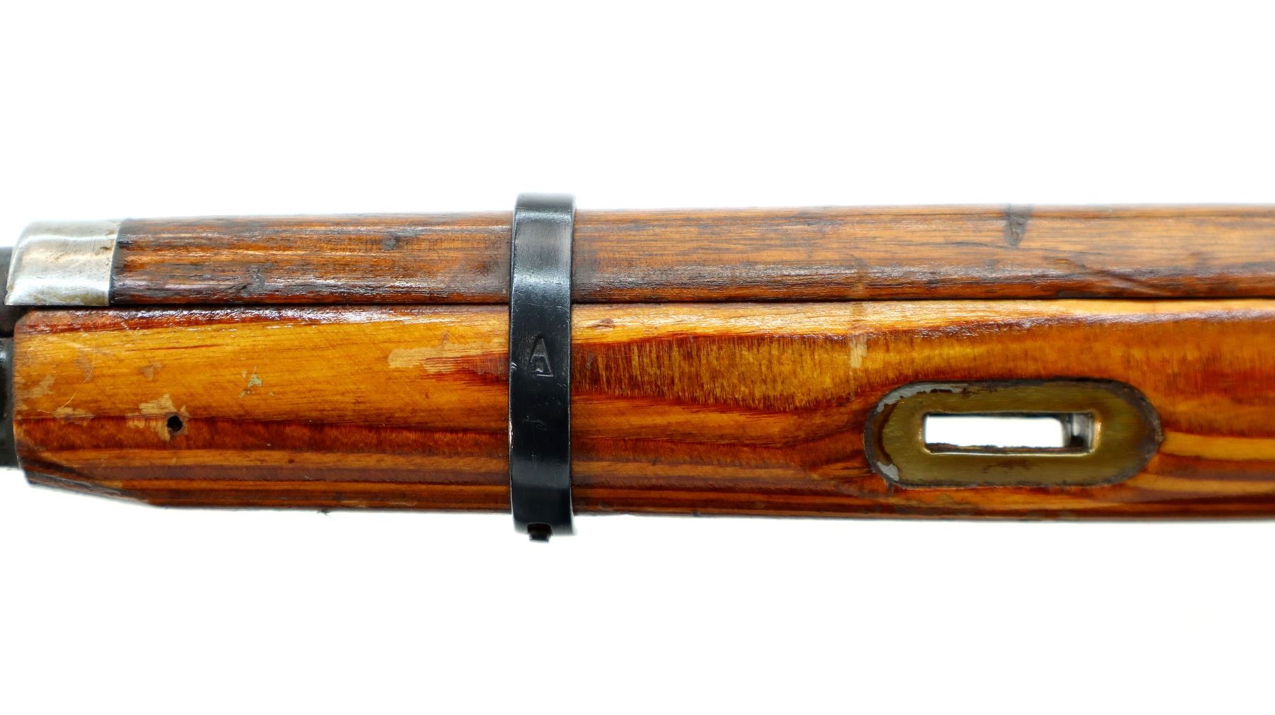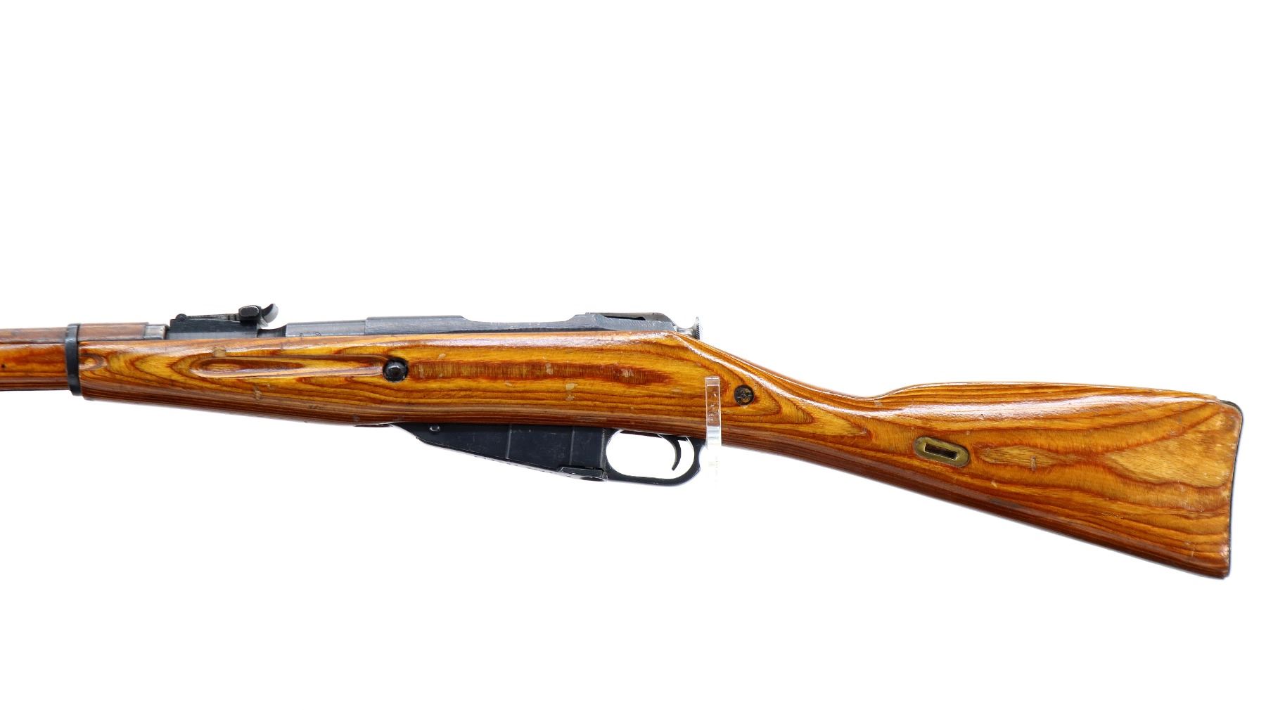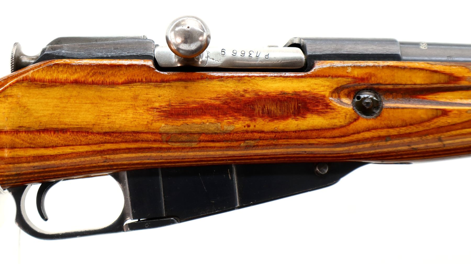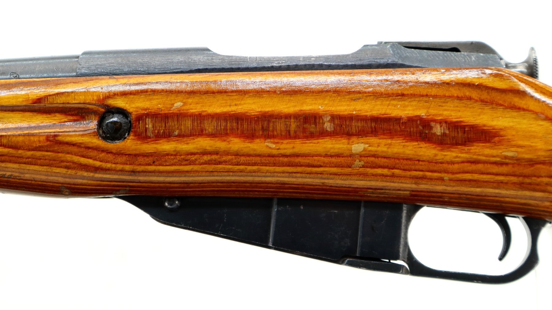 Main Description: Manufactured by Izhevsk 1942, arsenal rebuilt numbered to match. Post front sight with hood and ramp, adjustable u notched rear sight, blued finish, round receiver, silver bolt with straight handle. Two piece full military wood stocks, handguard has arsenal repairs, laminated finger grooved stock, note: does not have cut out for M44 bayonet. Straight grip, smooth steel butt plate, sling slots, missing cleaning rod.
