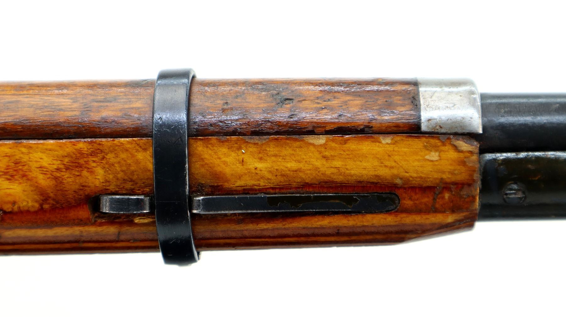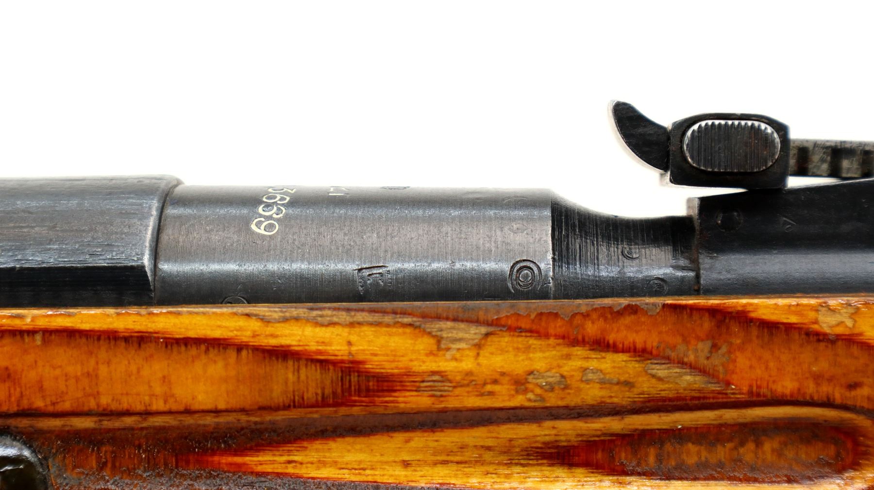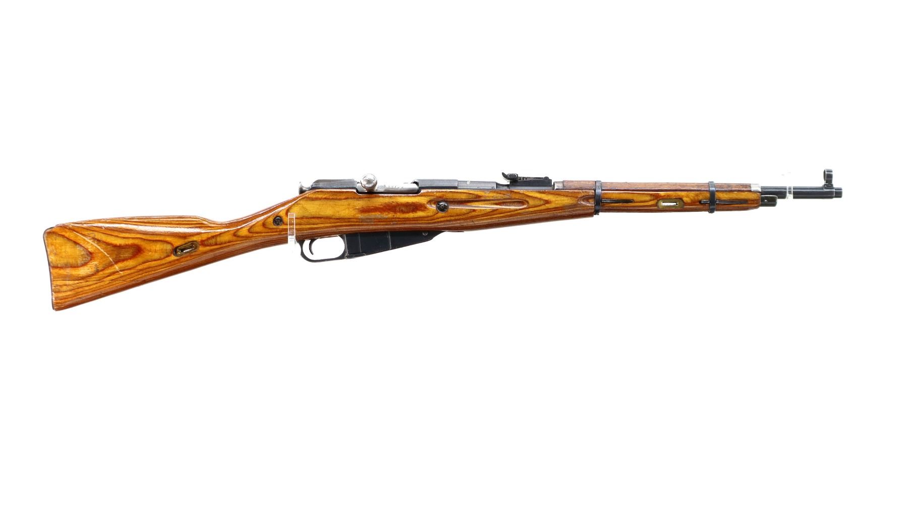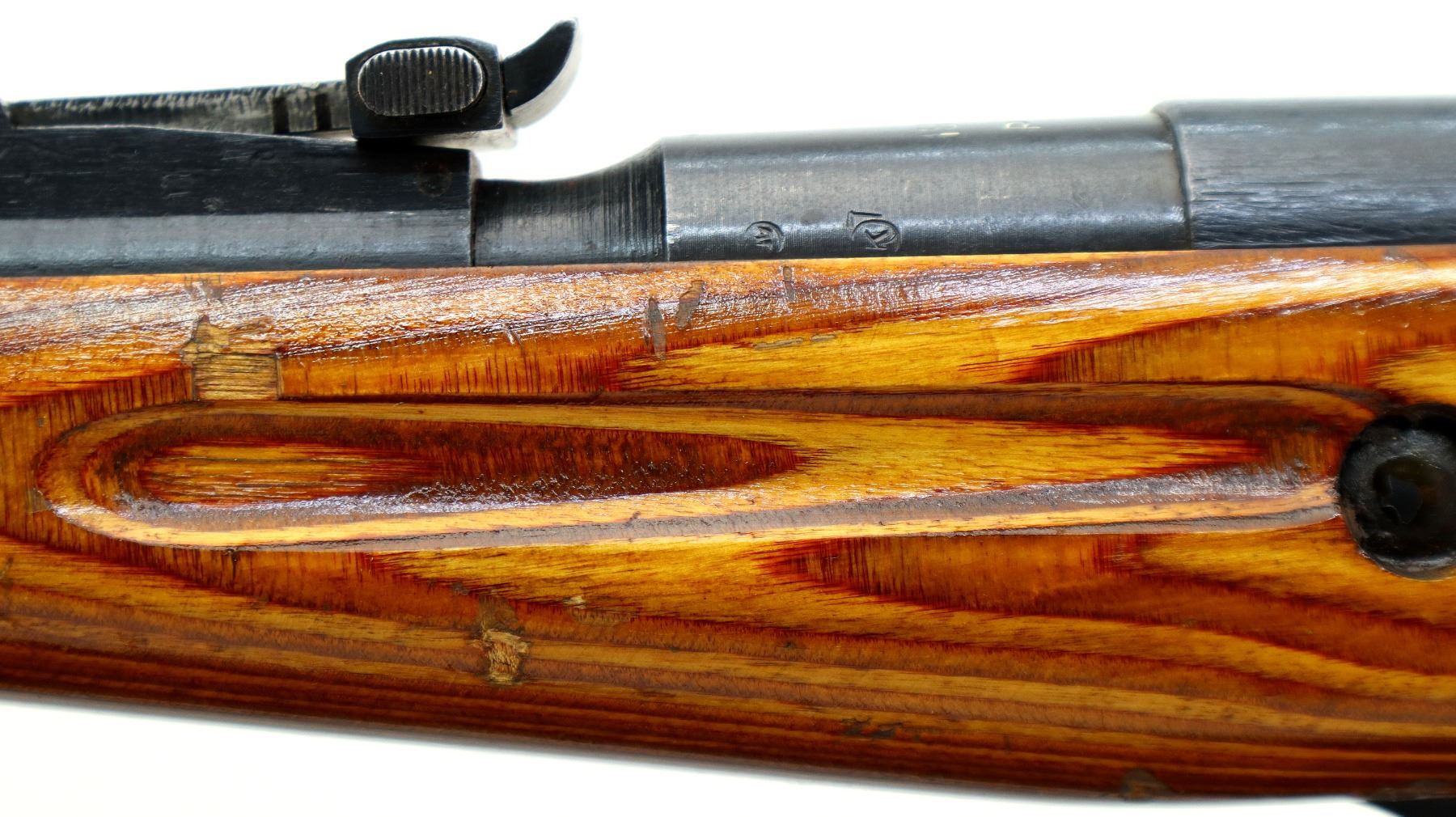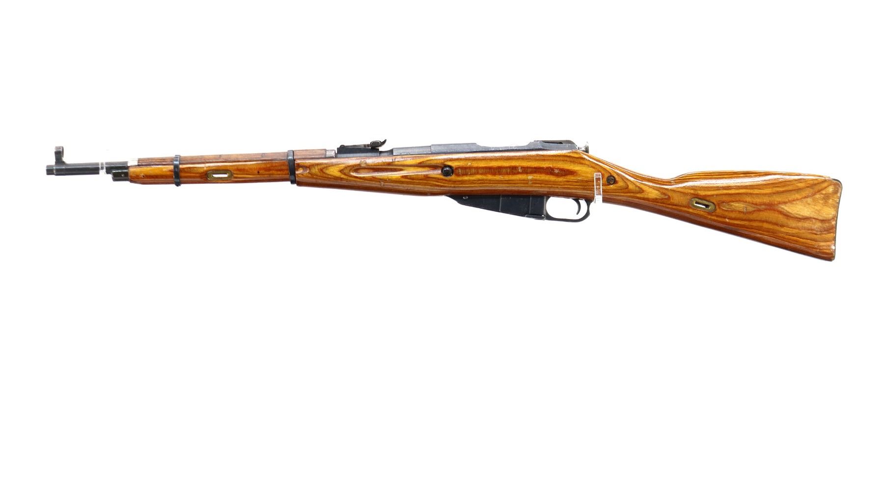 Main Description: Manufactured by Izhevsk 1942, arsenal rebuilt numbered to match. Post front sight with hood and ramp, adjustable u notched rear sight, blued finish, round receiver, silver bolt with straight handle. Two piece full military wood stocks, handguard has arsenal repairs, laminated finger grooved stock, note: does not have cut out for M44 bayonet. Straight grip, smooth steel butt plate, sling slots, missing cleaning rod.