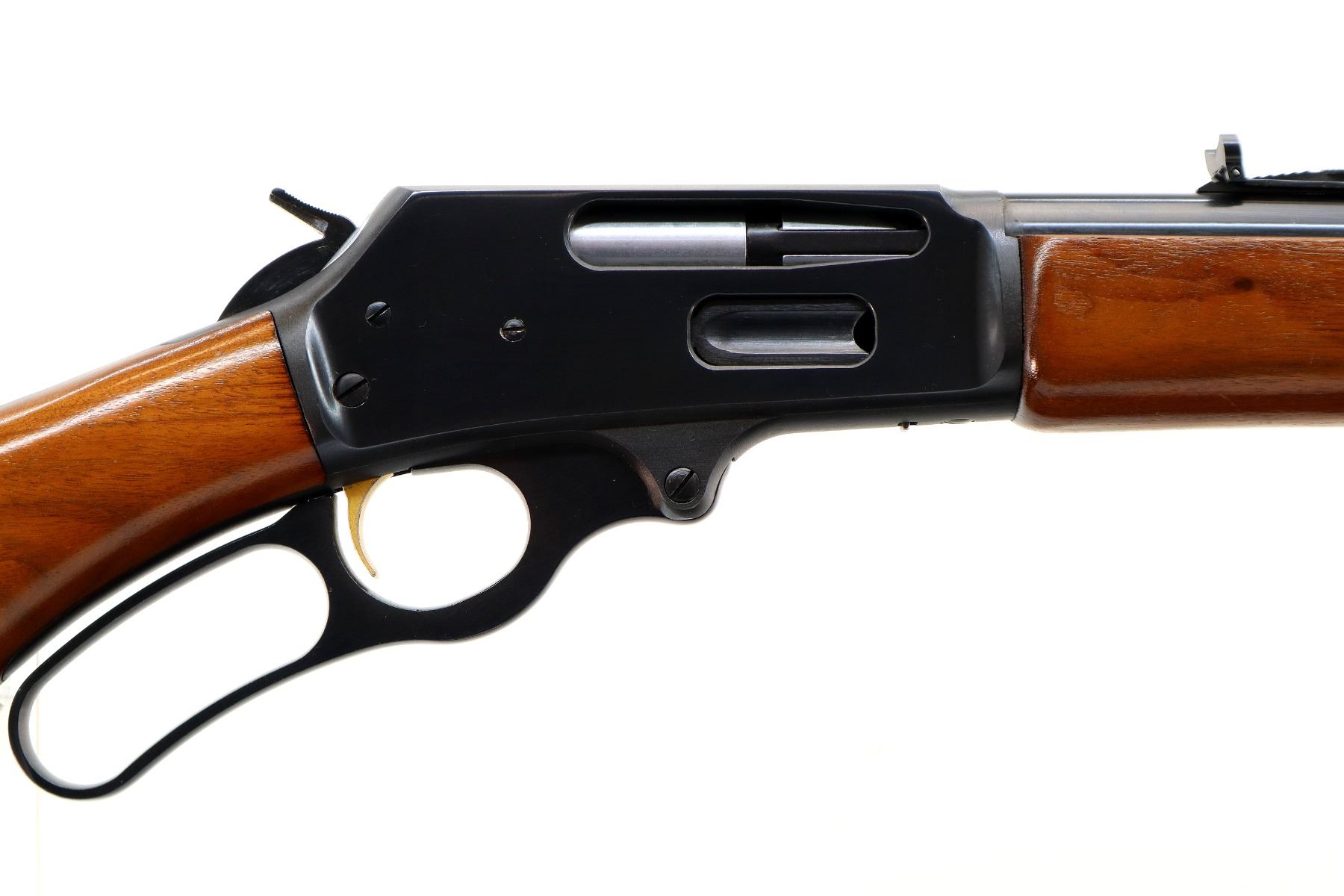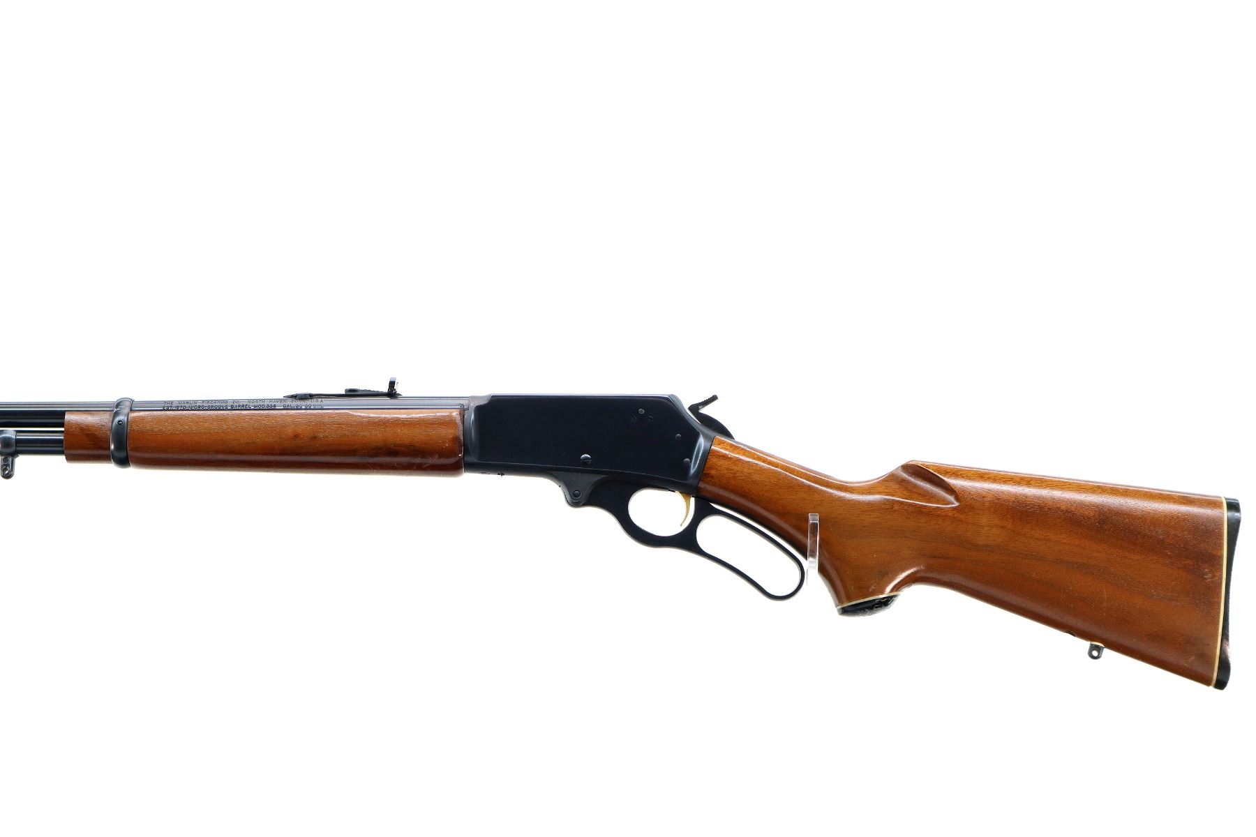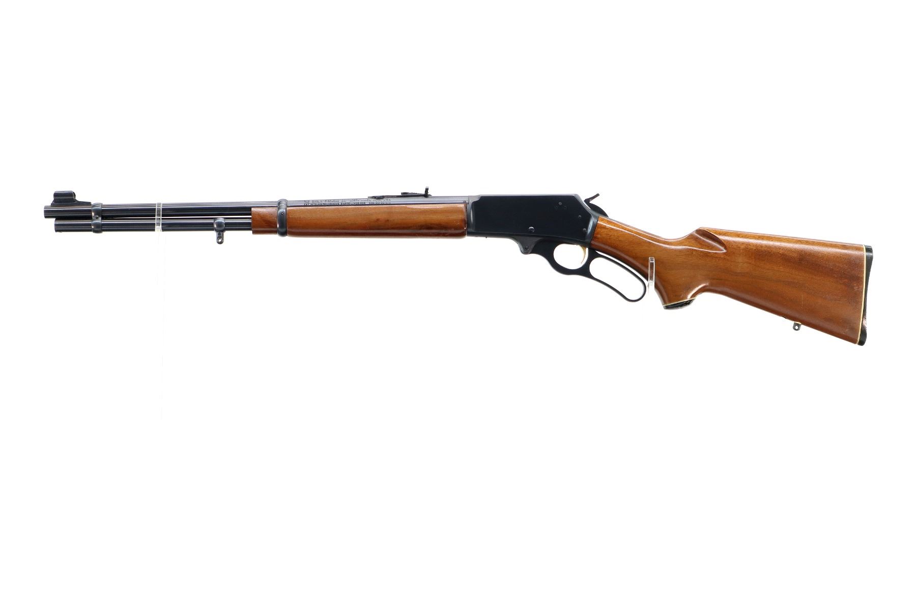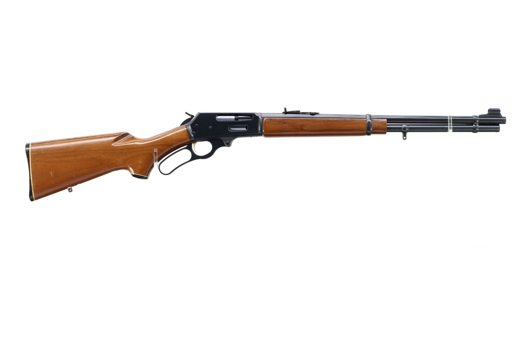 Main Description: Blade front sight with hood and ramp, adjustable folding u notched rear sight, blued finish, receiver drilled and tapped with plug screws installed, grooved spur hammer. Two piece wood stocks, pistol grip, checkered black polymer butt plate, missing Marlin Bullseye, has a grip cap, gold trigger, swivel studs and full length magtube.