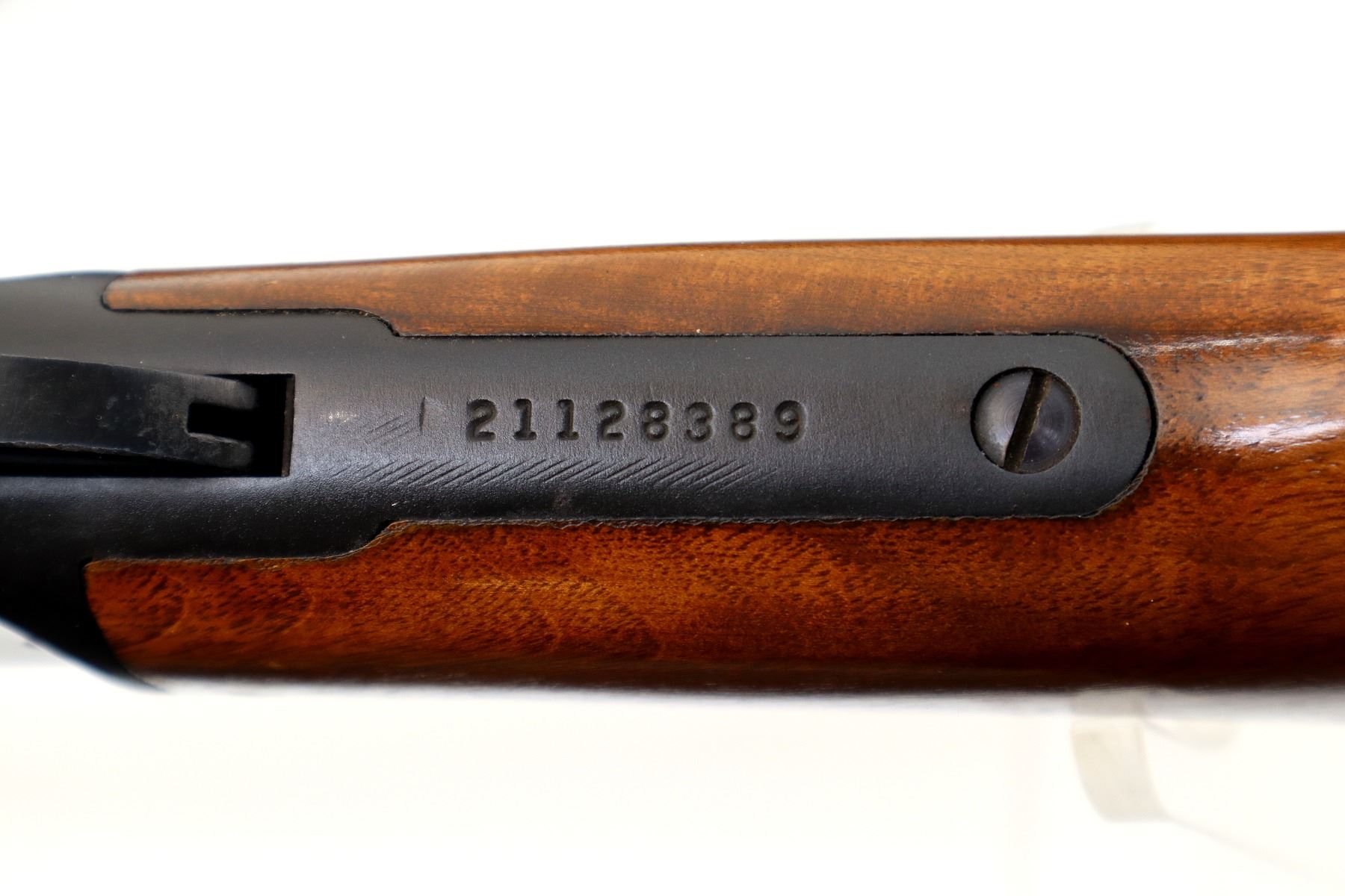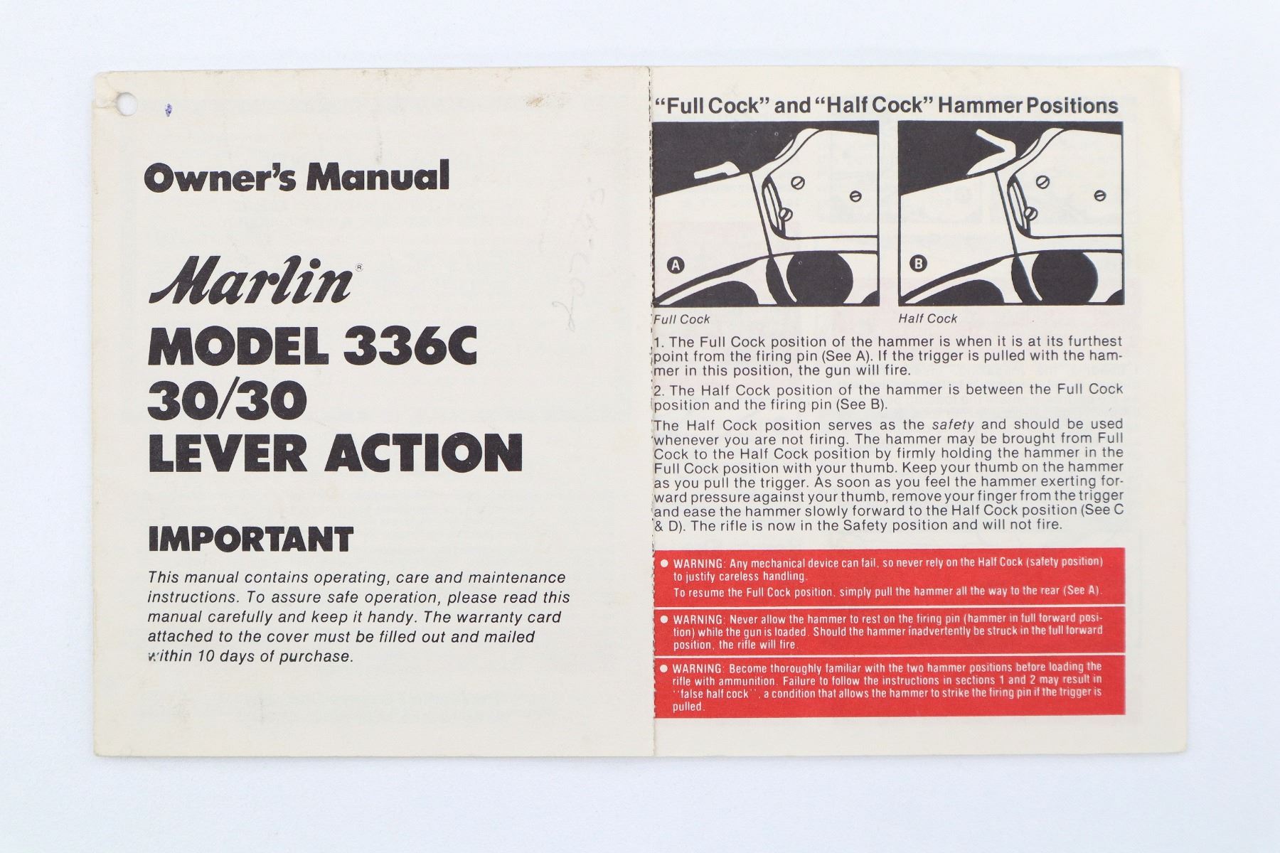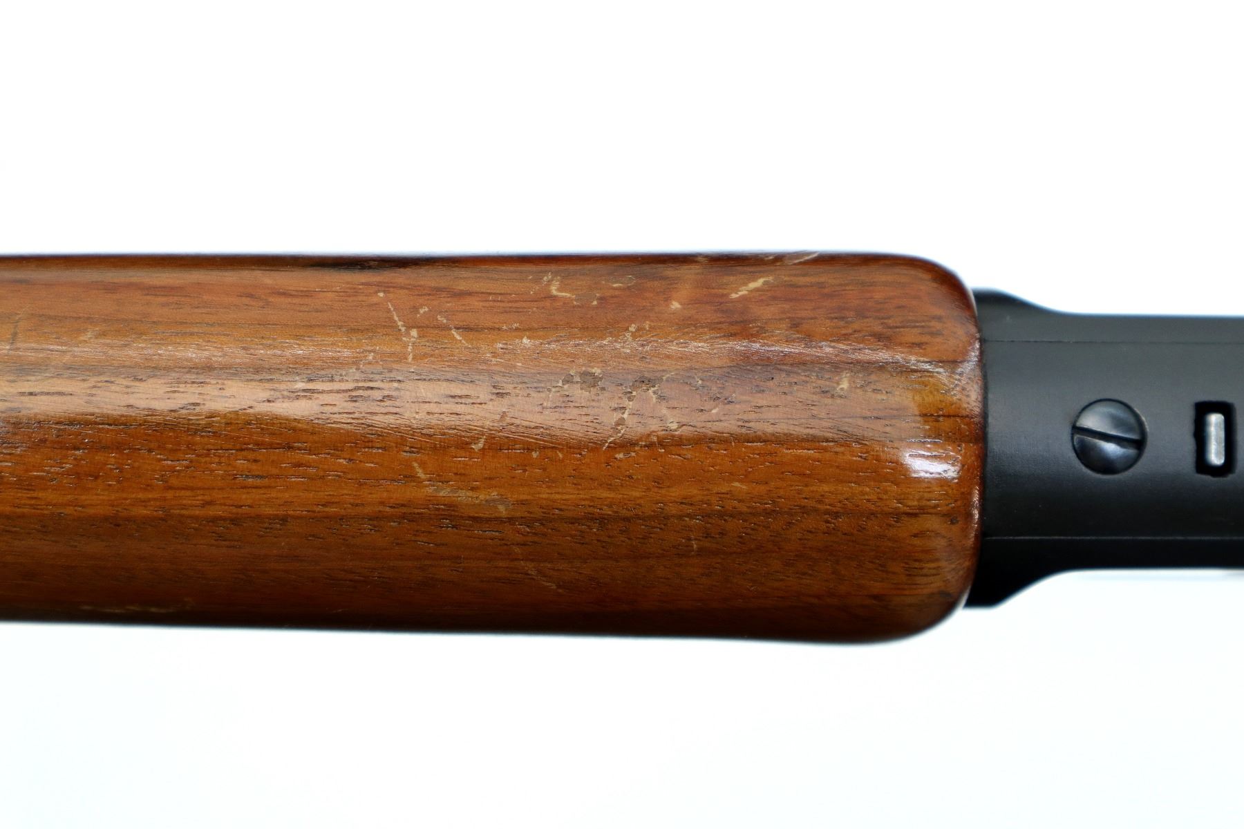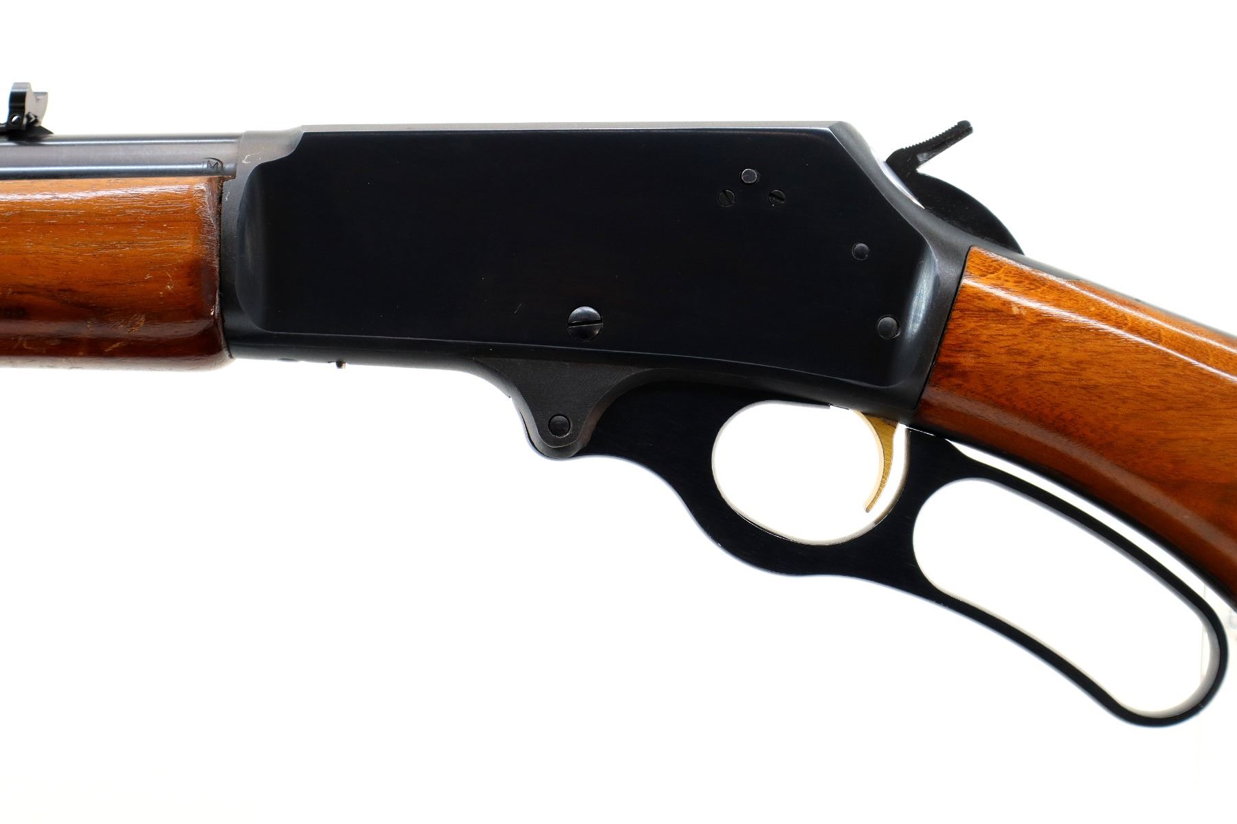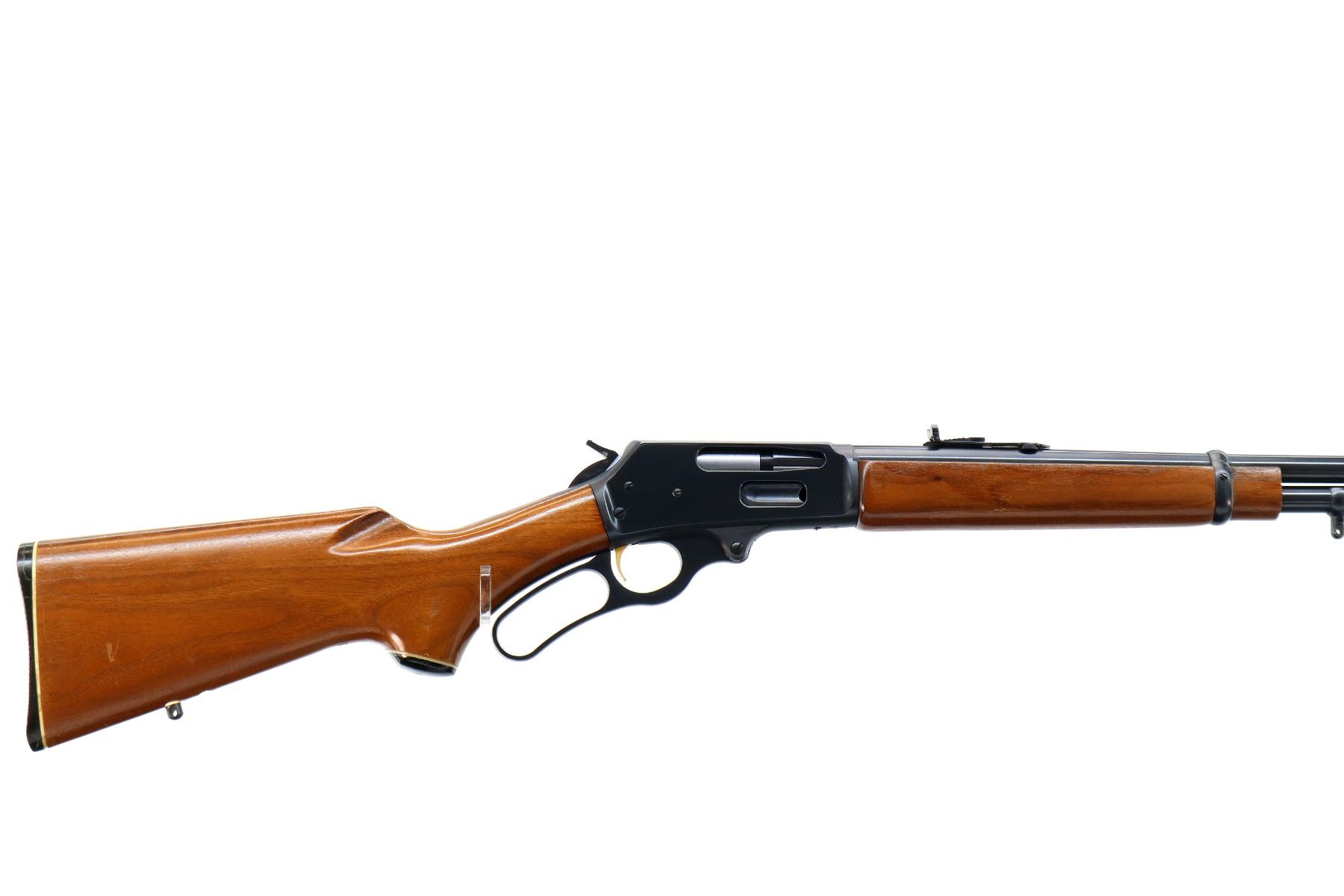 Main Description: Blade front sight with hood and ramp, adjustable folding u notched rear sight, blued finish, receiver drilled and tapped with plug screws installed, grooved spur hammer. Two piece wood stocks, pistol grip, checkered black polymer butt plate, missing Marlin Bullseye, has a grip cap, gold trigger, swivel studs and full length magtube.