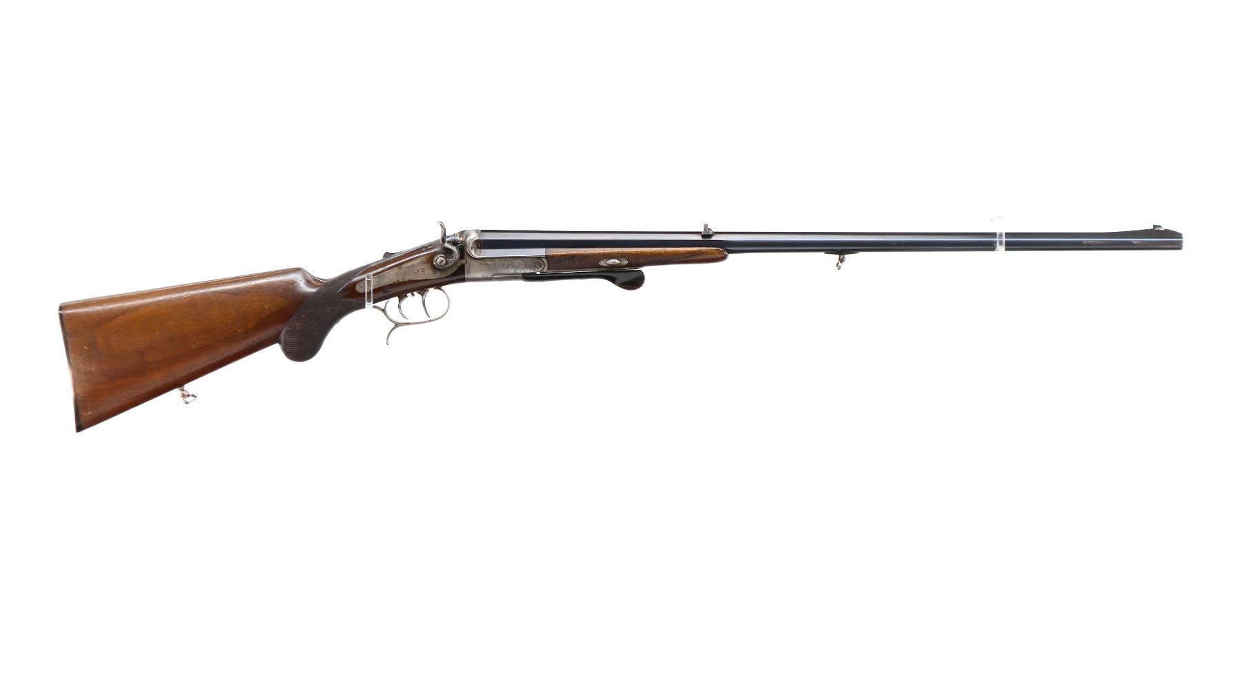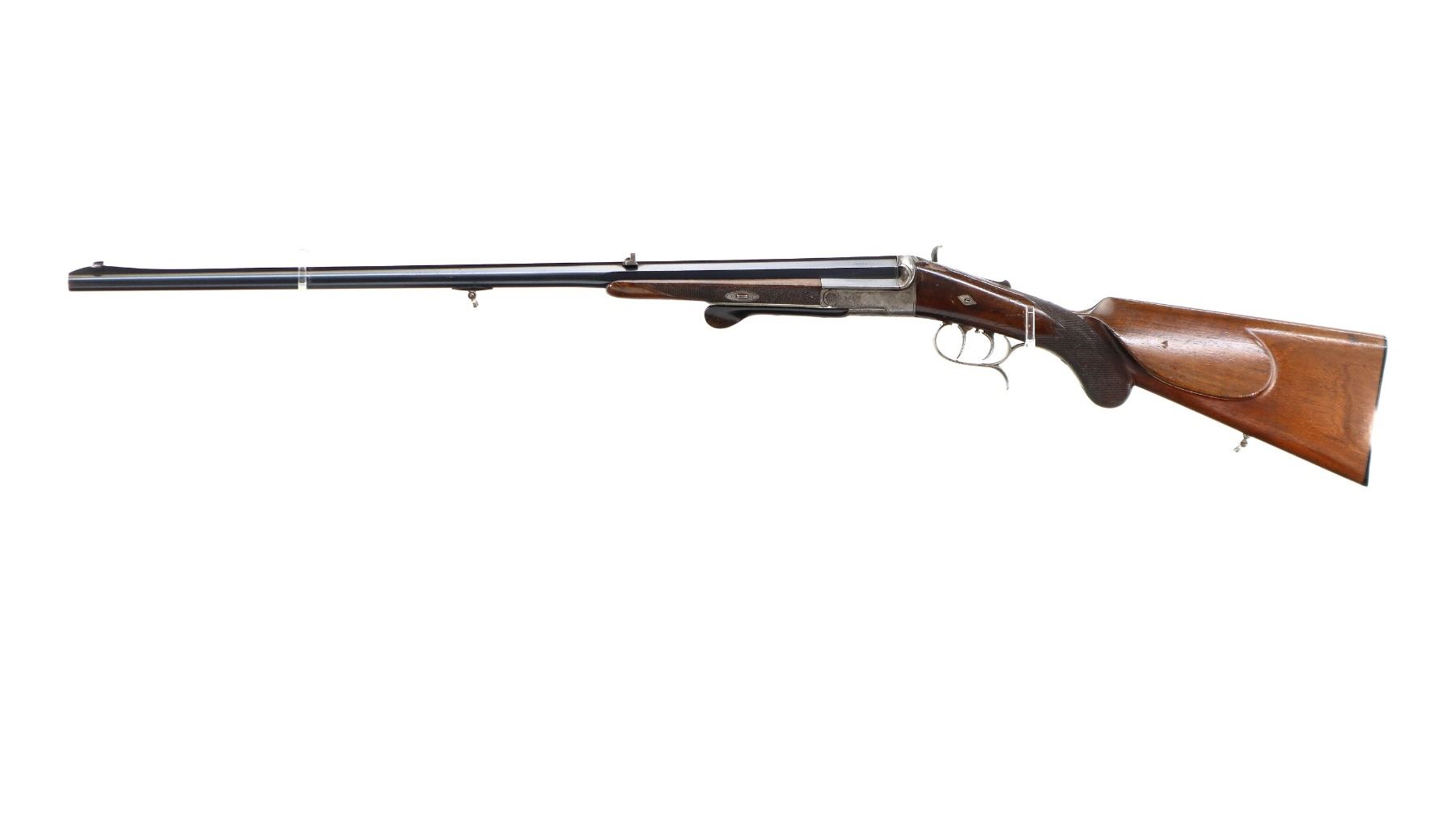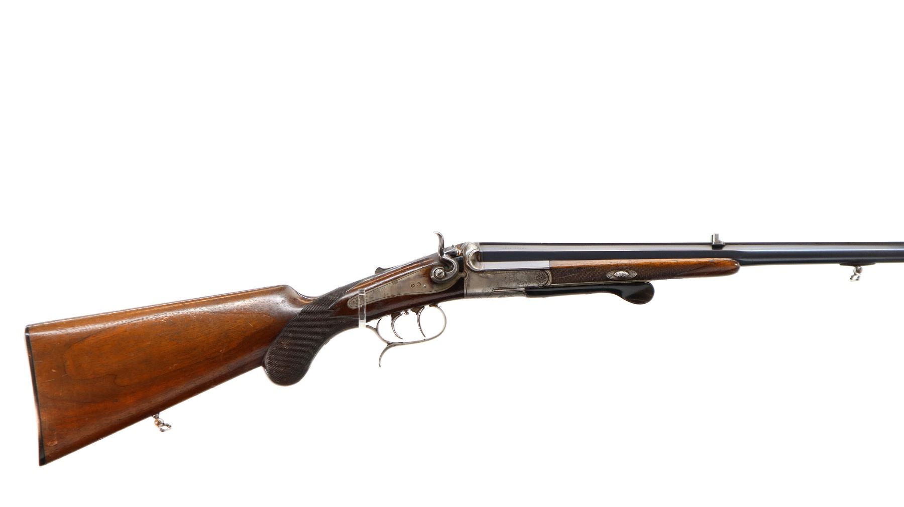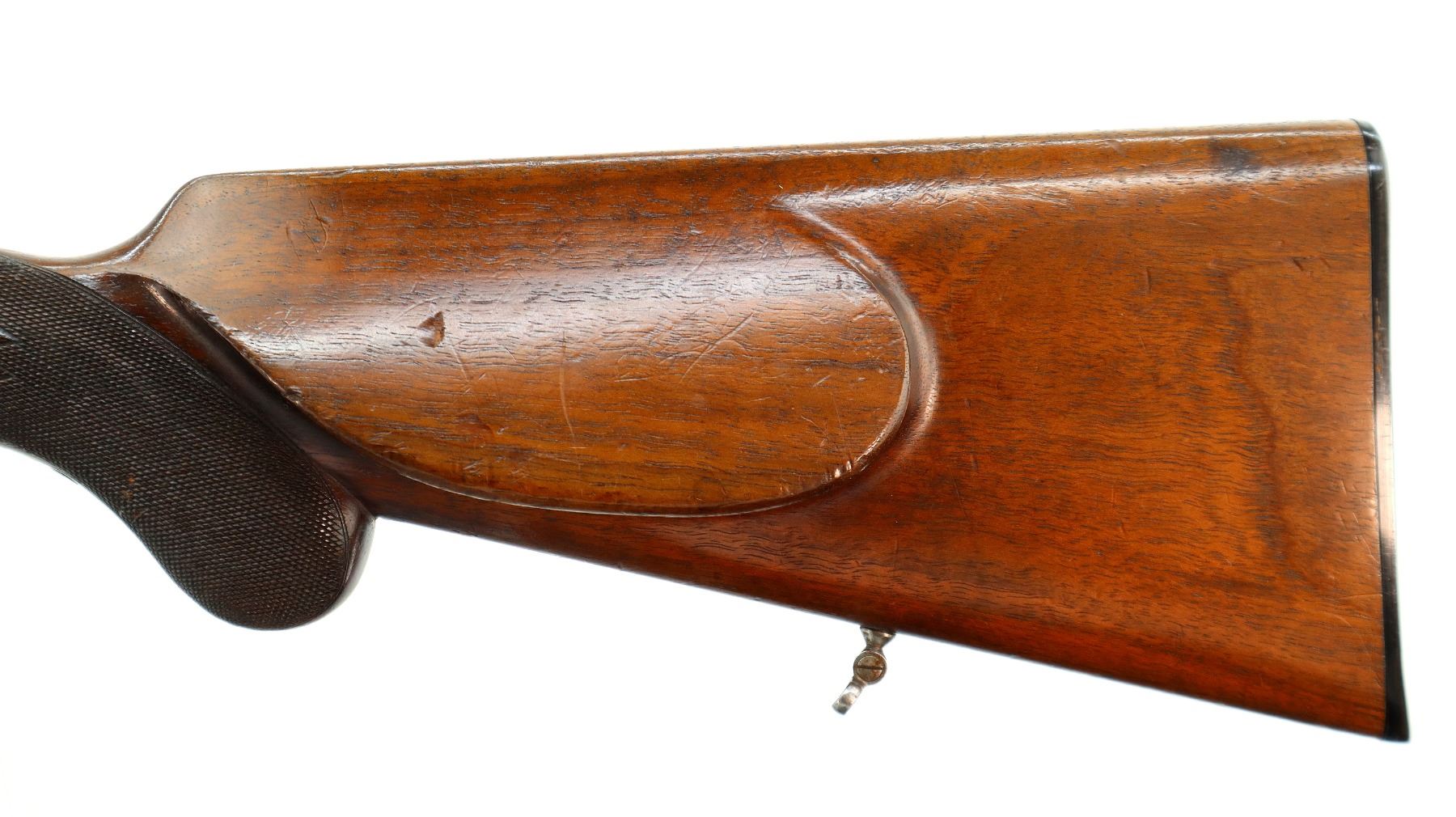 Main Description: Blade front sight, adjustable u notched rear sight, blued barrel with solid rib and tapered round front portion, engraved receiver, back action lock with checkered spur hammer that functions, folding tang peep sight, double set triggers, horn underlever. Two piece wood stocks, checkered forearm with single wedge, checkered pistol grip and horn butt plate, European cheek rest, engraved finger rest trigger guard, sling swivels.