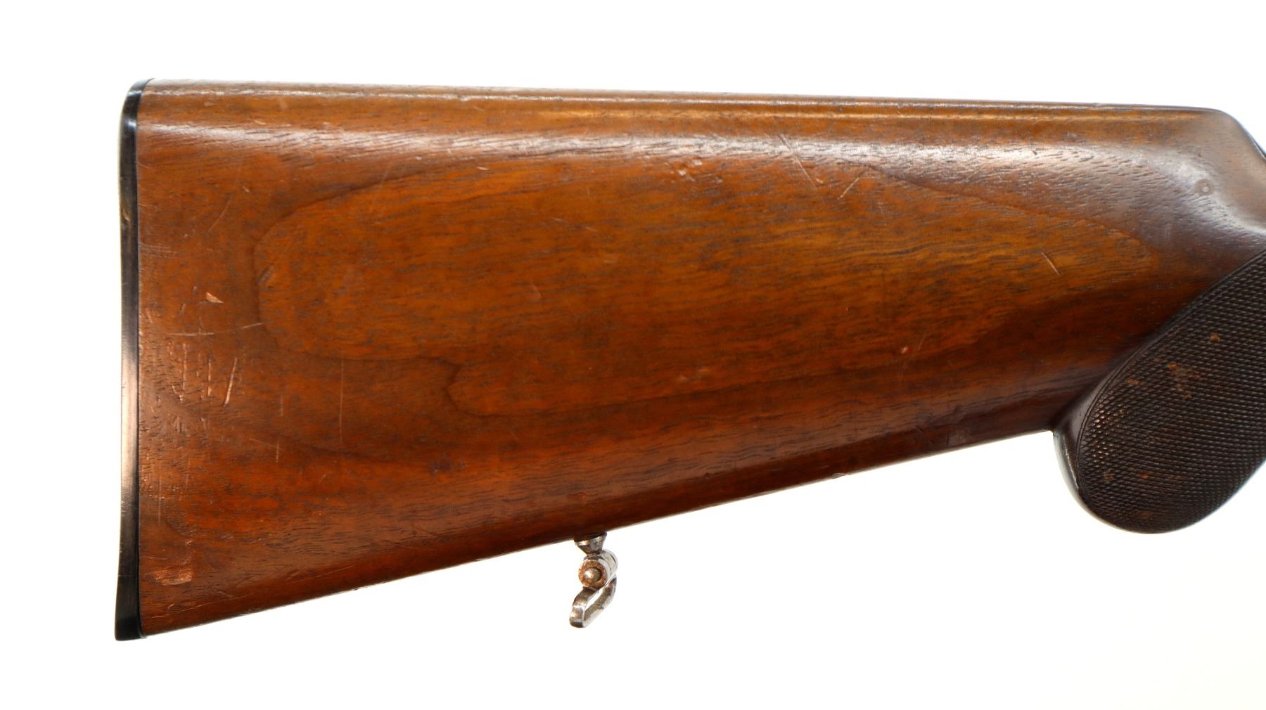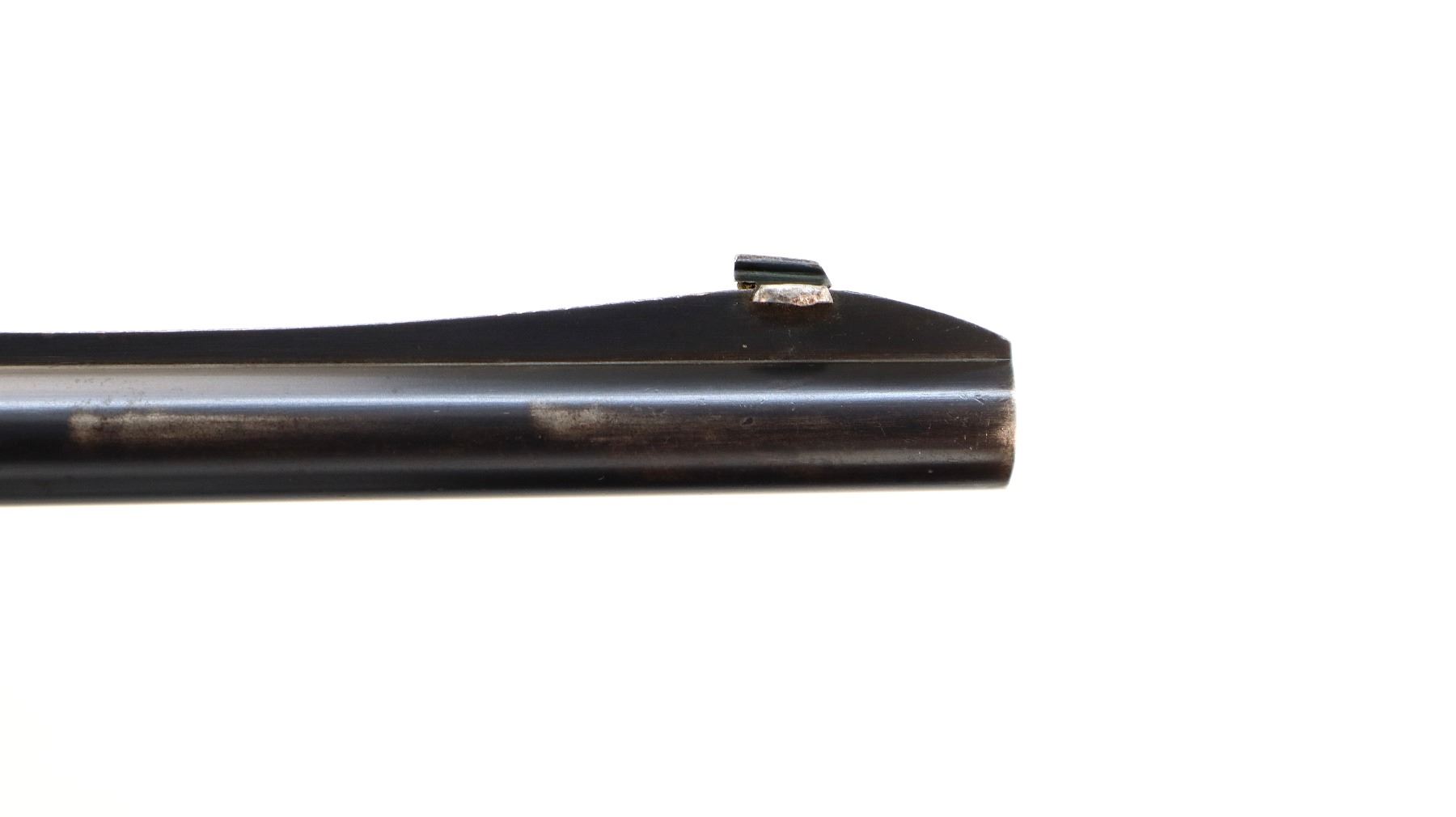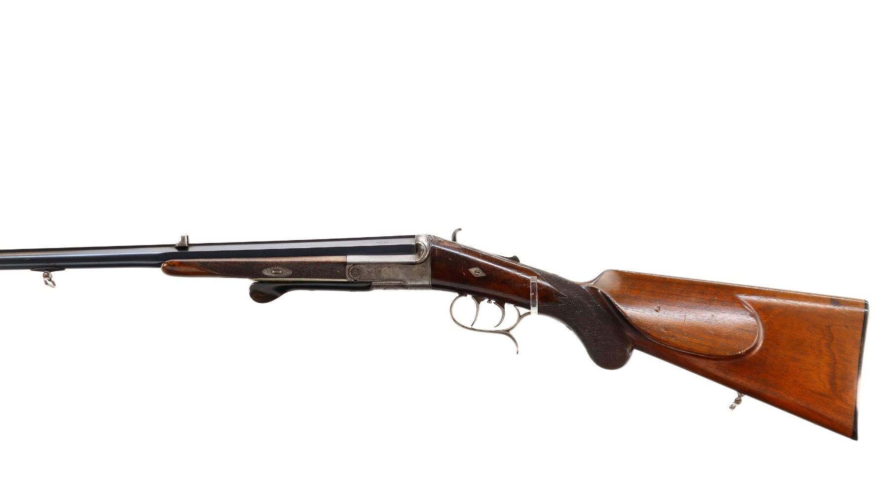 Main Description: Blade front sight, adjustable u notched rear sight, blued barrel with solid rib and tapered round front portion, engraved receiver, back action lock with checkered spur hammer that functions, folding tang peep sight, double set triggers, horn underlever. Two piece wood stocks, checkered forearm with single wedge, checkered pistol grip and horn butt plate, European cheek rest, engraved finger rest trigger guard, sling swivels.
