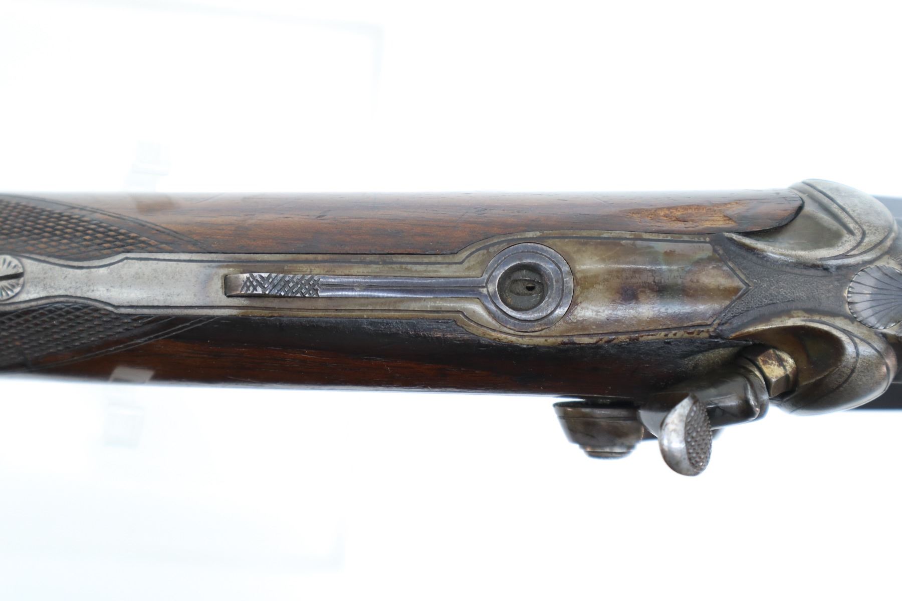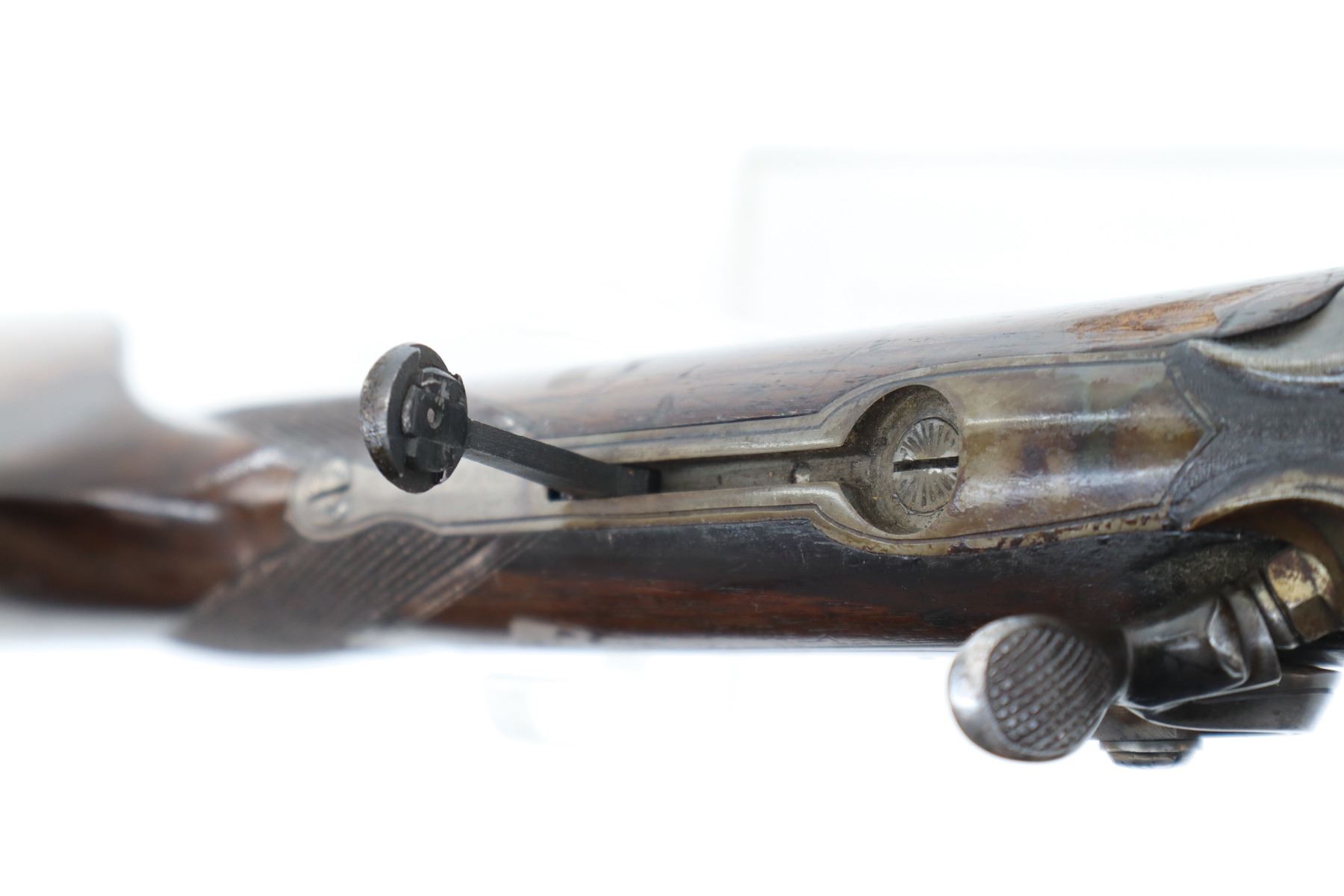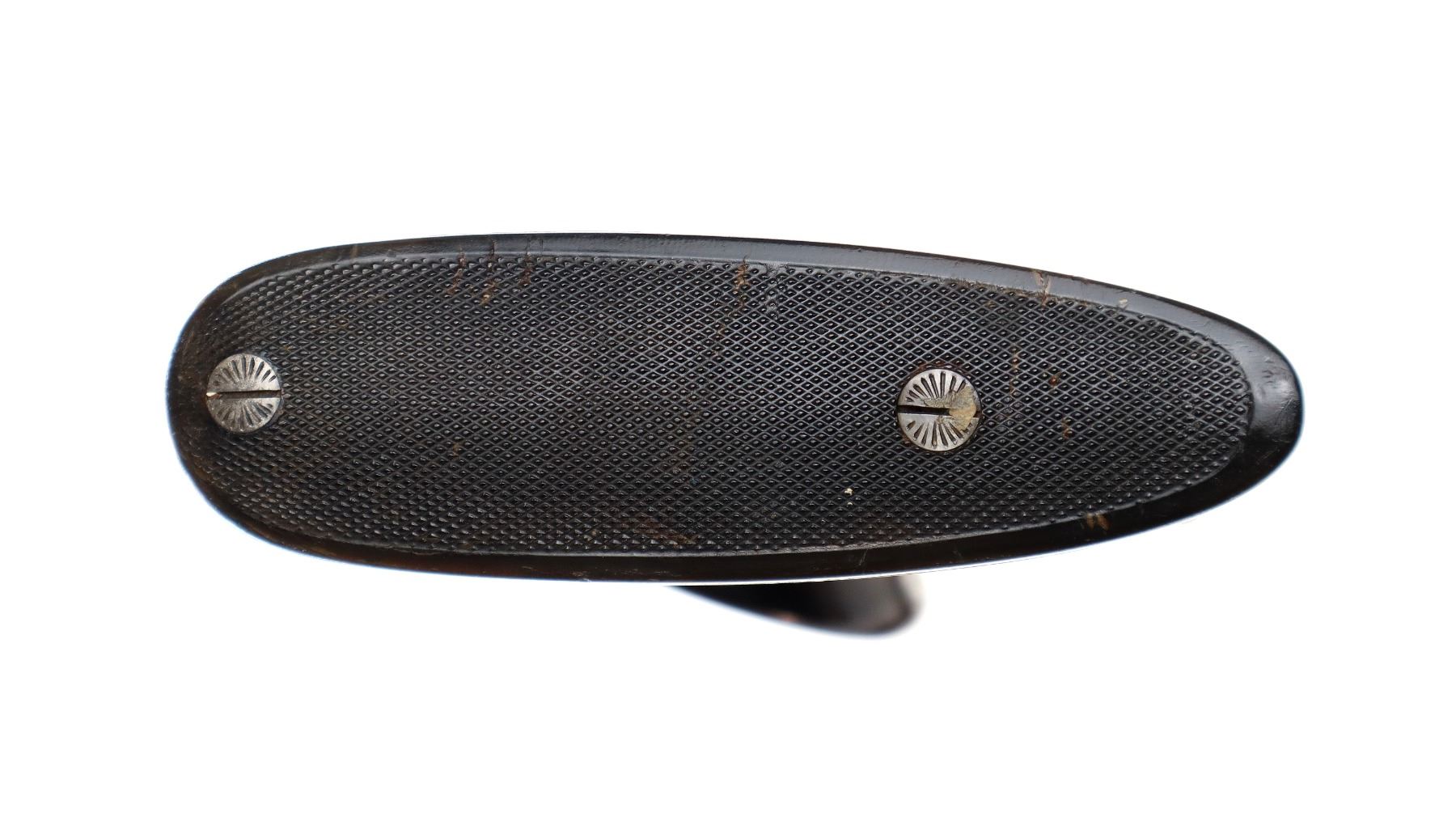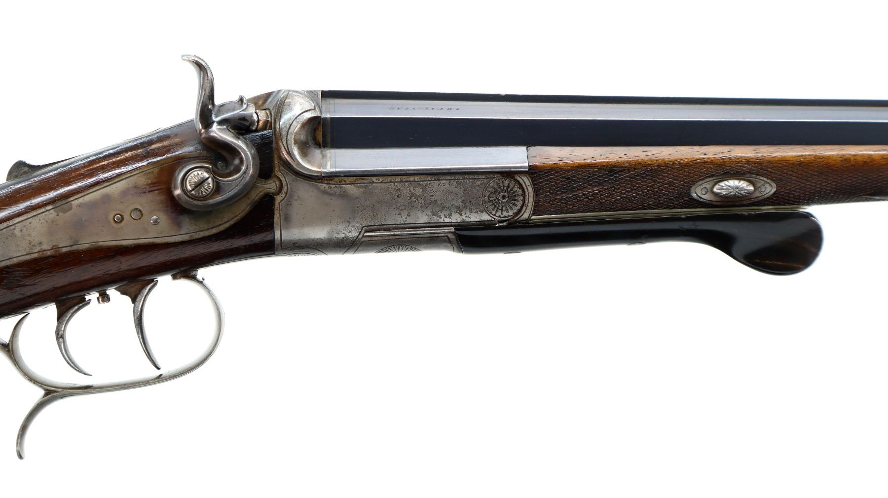 Main Description: Blade front sight, adjustable u notched rear sight, blued barrel with solid rib and tapered round front portion, engraved receiver, back action lock with checkered spur hammer that functions, folding tang peep sight, double set triggers, horn underlever. Two piece wood stocks, checkered forearm with single wedge, checkered pistol grip and horn butt plate, European cheek rest, engraved finger rest trigger guard, sling swivels.