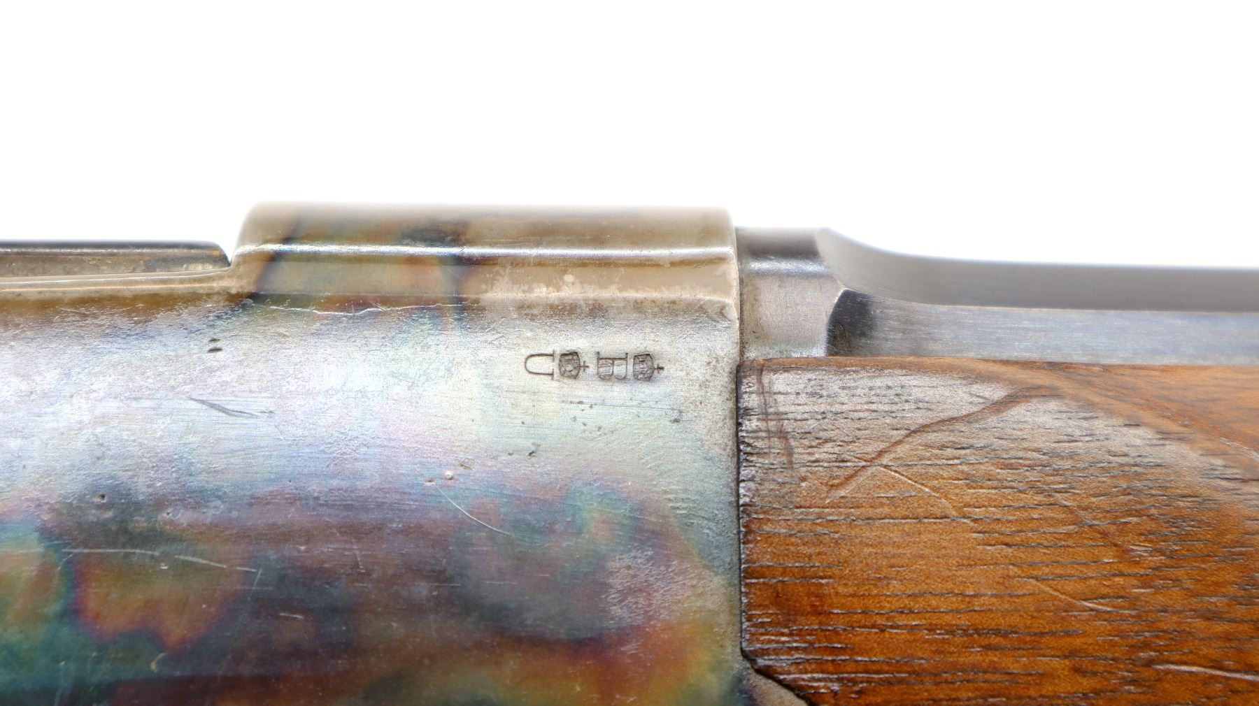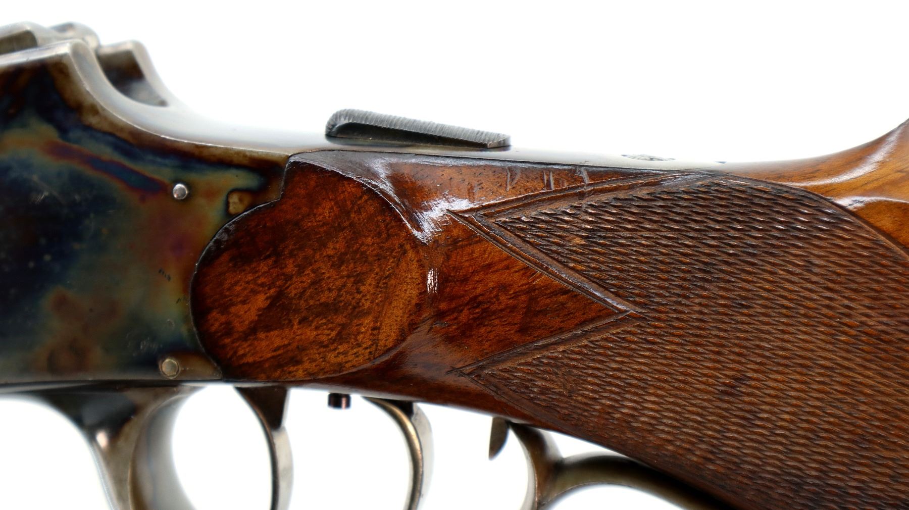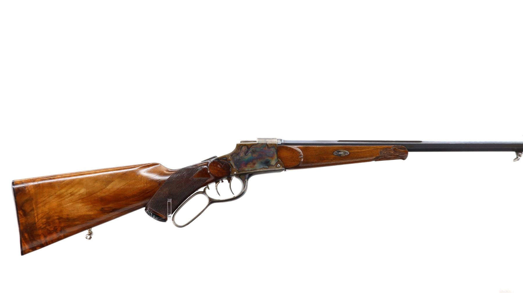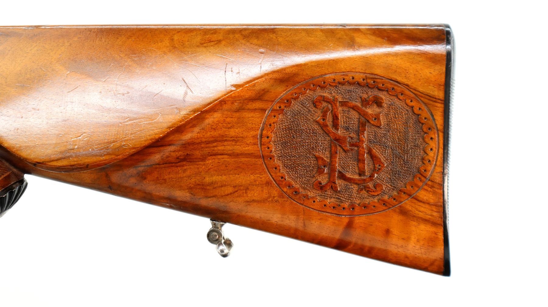 Main Description: Blade front sight with ramp, missing rear sight, blued tapered octagon barrel, colour case hardened receiver, manual safety, double set triggers, colour case hardened checkered lever. Two piece wood stocks, carved forearm with single wedge, checkered pistol grip, European cheek rest, grooved black polymer butt plate, grip cap, initials on left side of stock, sling swivels.