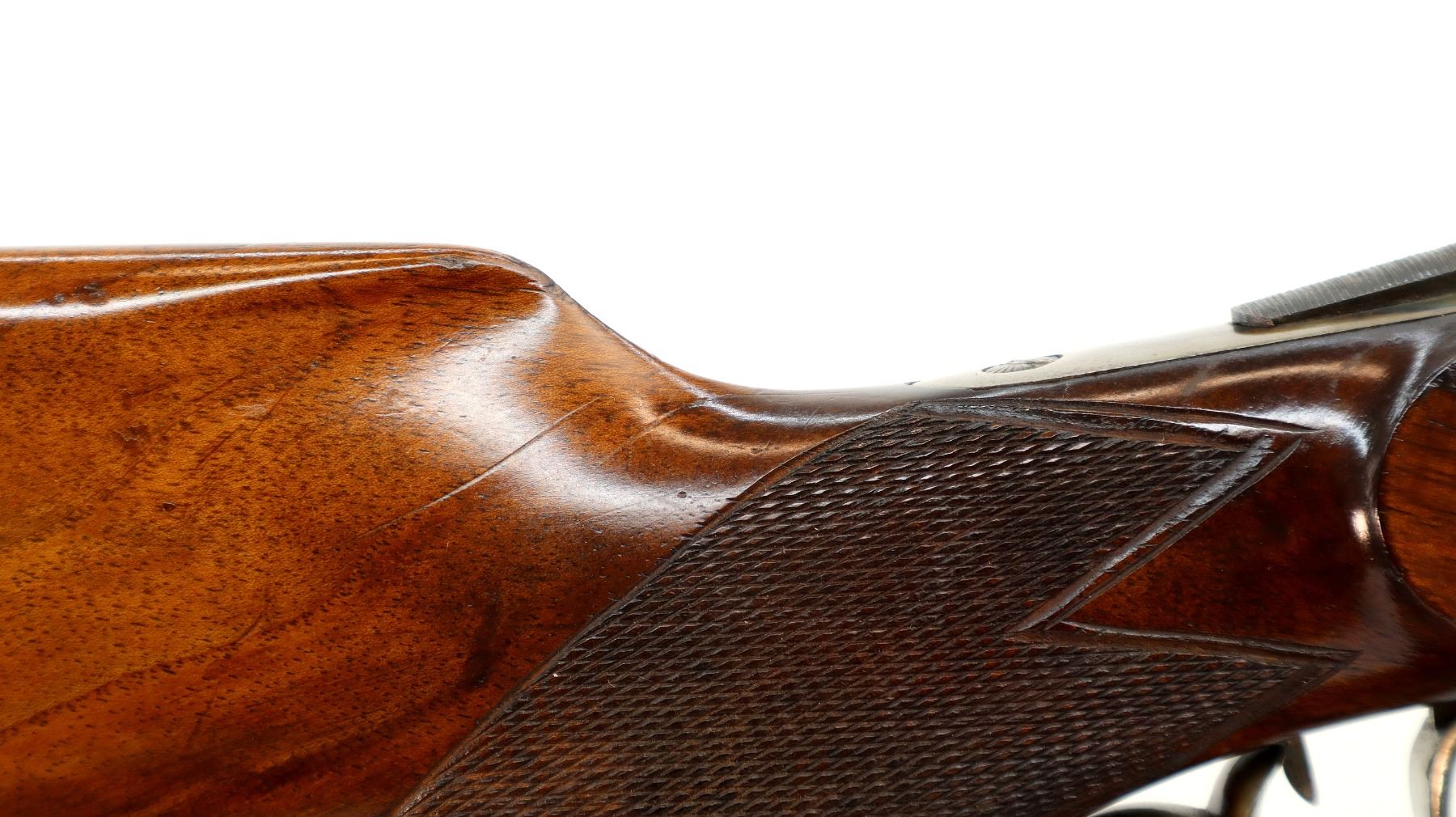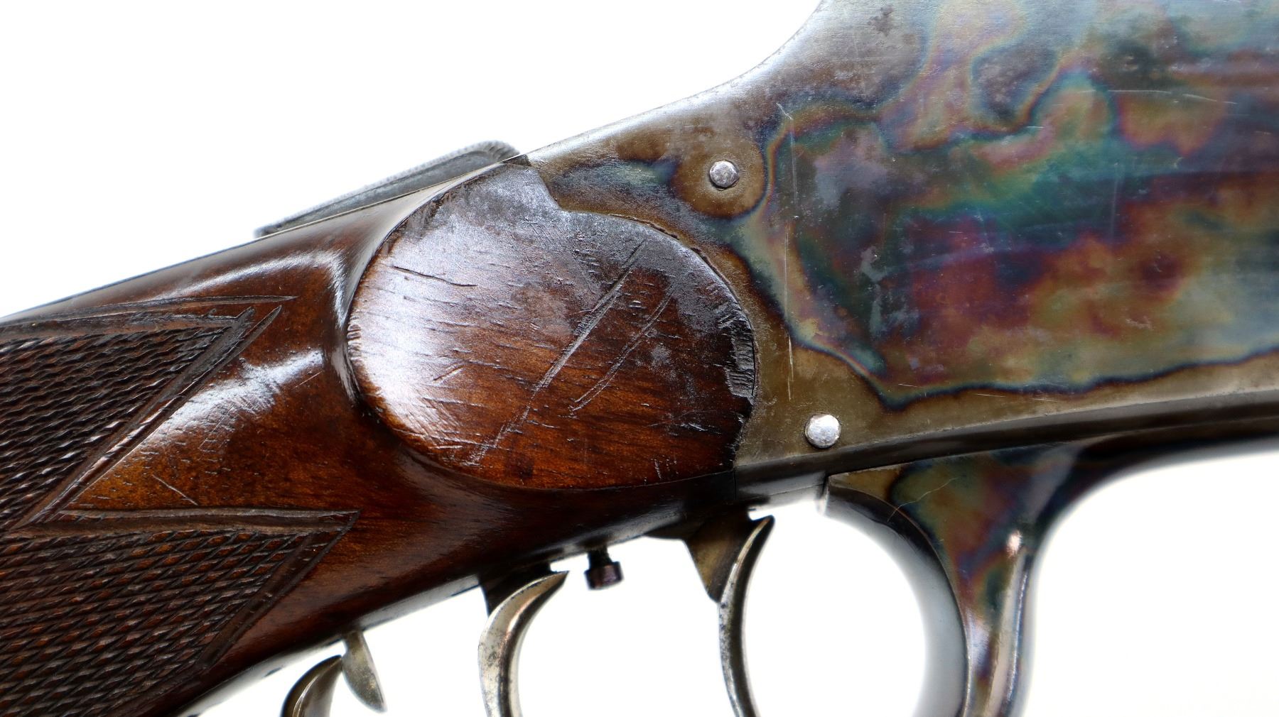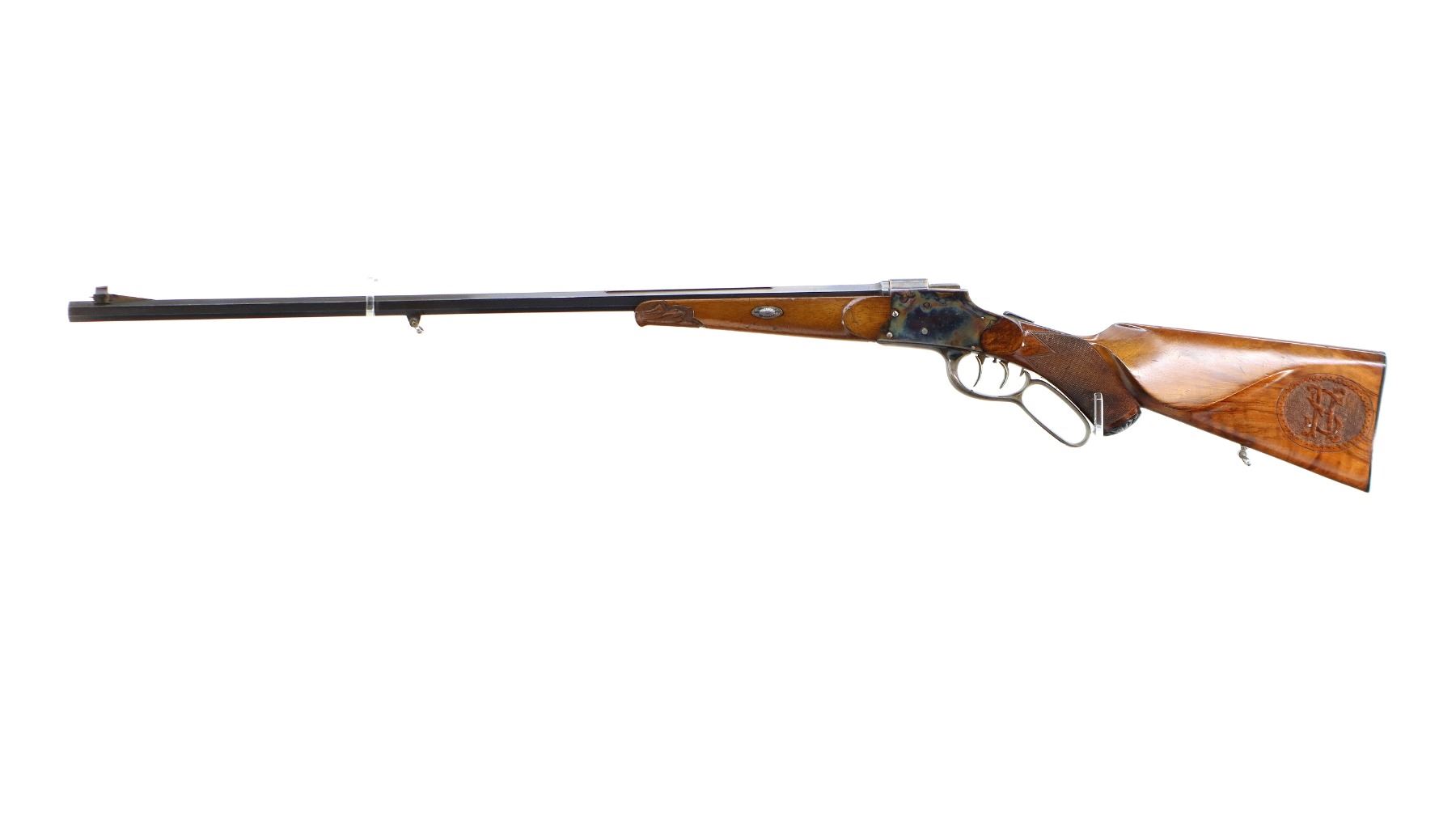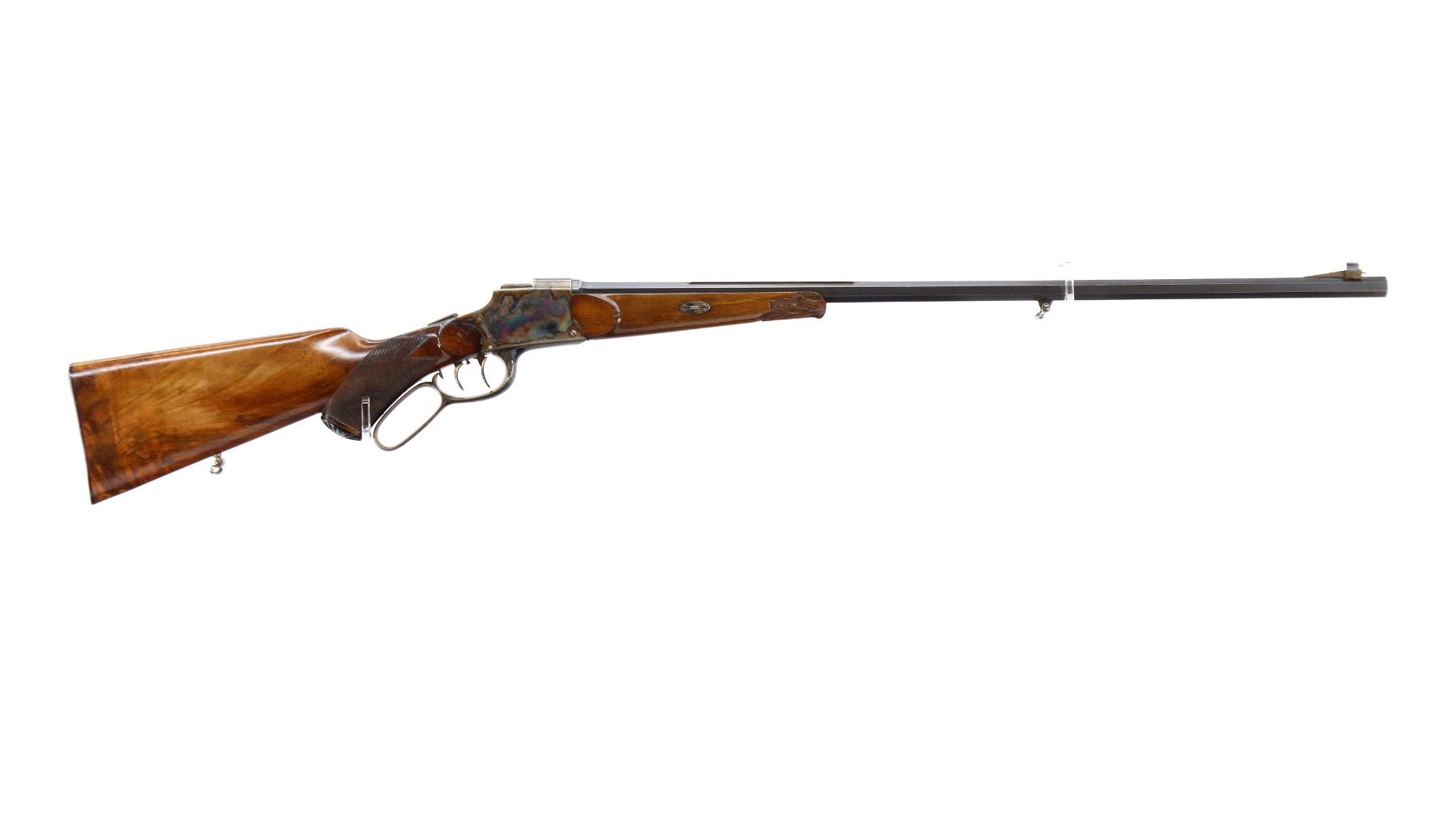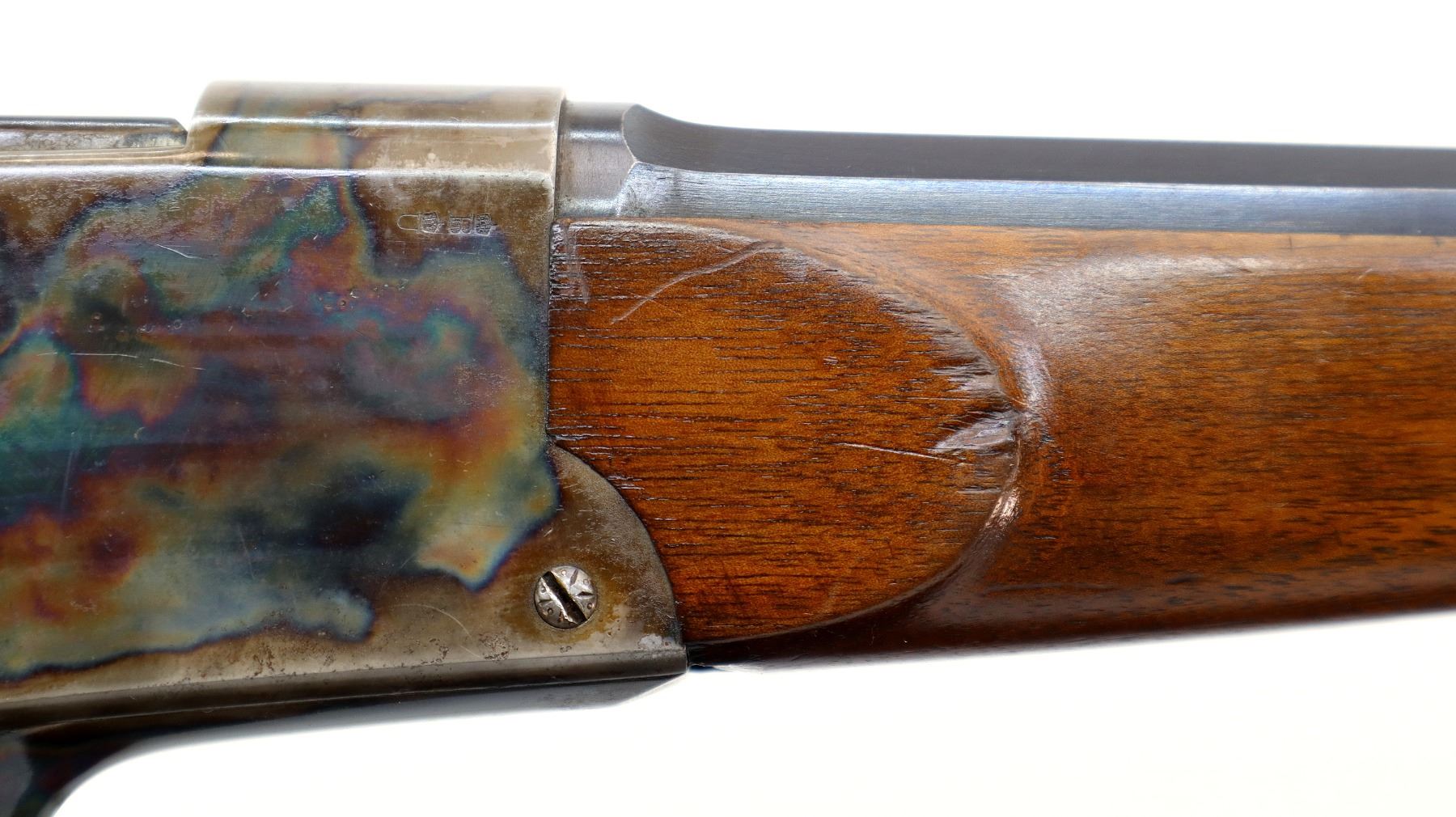 Main Description: Blade front sight with ramp, missing rear sight, blued tapered octagon barrel, colour case hardened receiver, manual safety, double set triggers, colour case hardened checkered lever. Two piece wood stocks, carved forearm with single wedge, checkered pistol grip, European cheek rest, grooved black polymer butt plate, grip cap, initials on left side of stock, sling swivels.