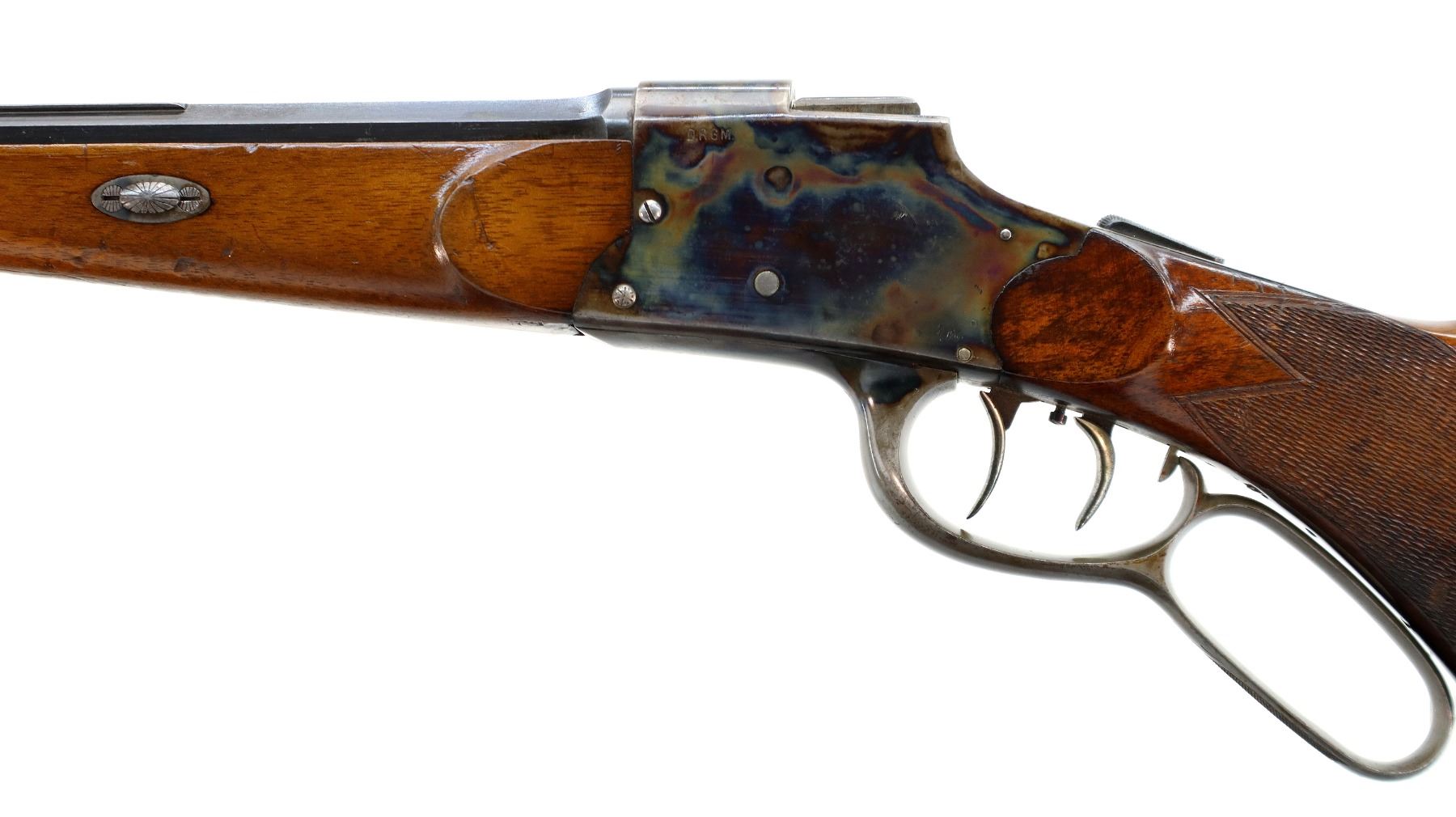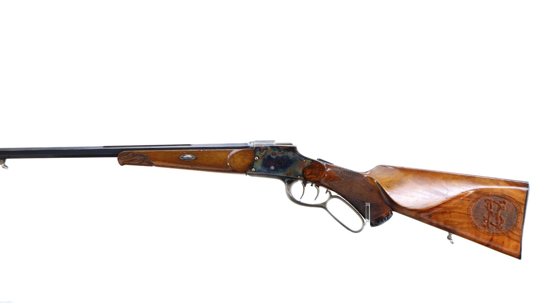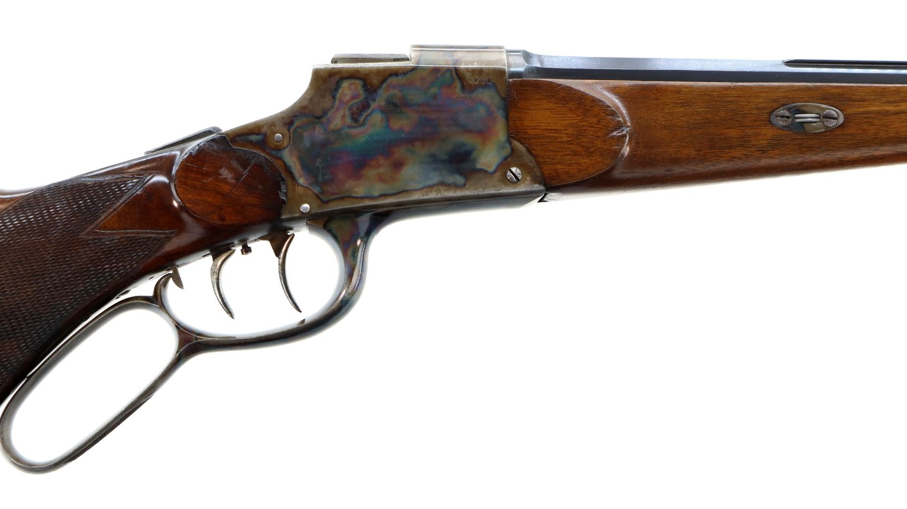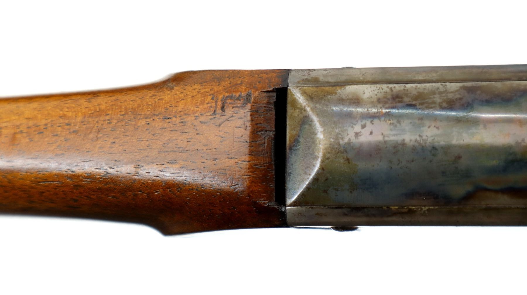 Main Description: Blade front sight with ramp, missing rear sight, blued tapered octagon barrel, colour case hardened receiver, manual safety, double set triggers, colour case hardened checkered lever. Two piece wood stocks, carved forearm with single wedge, checkered pistol grip, European cheek rest, grooved black polymer butt plate, grip cap, initials on left side of stock, sling swivels.