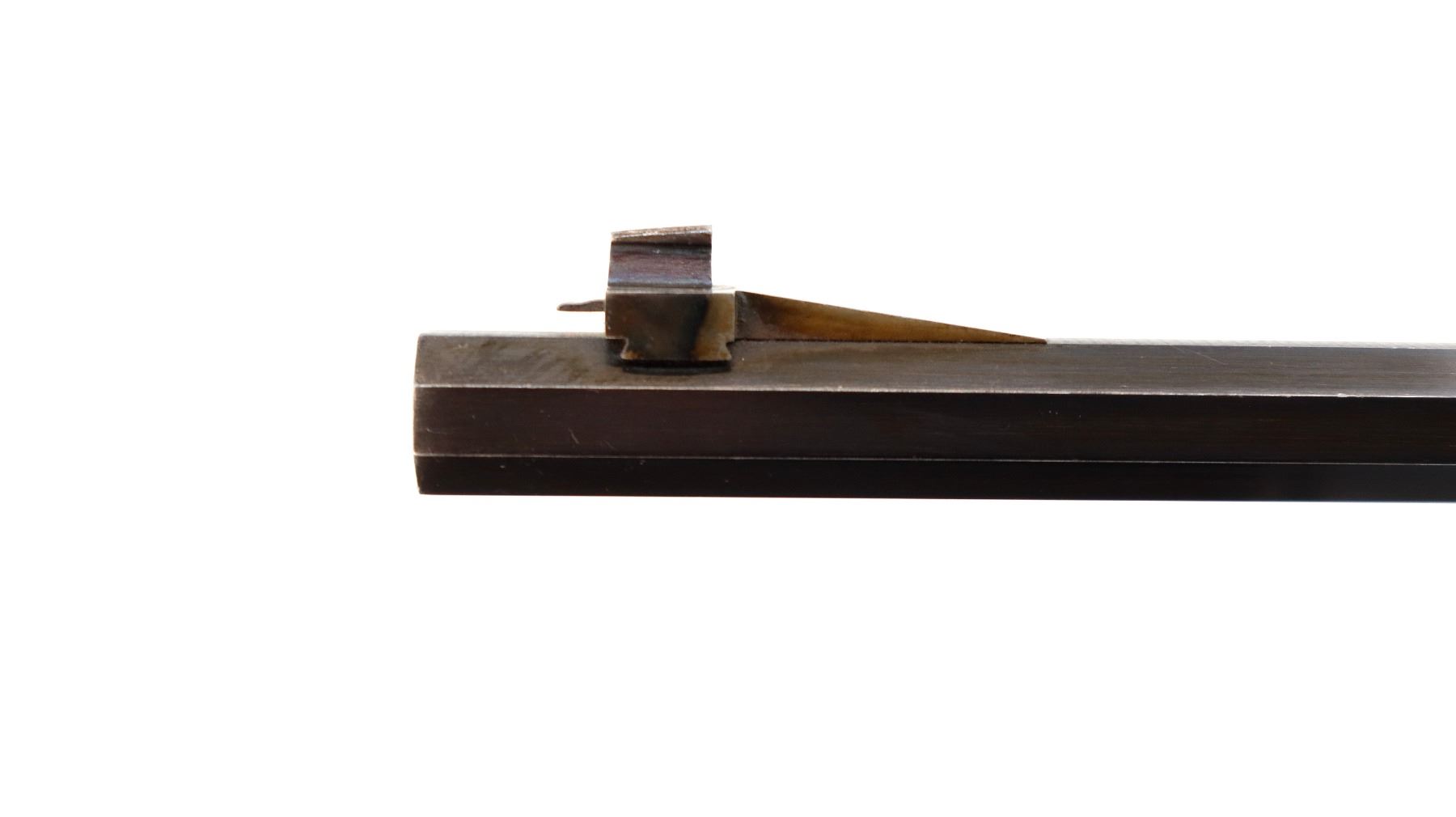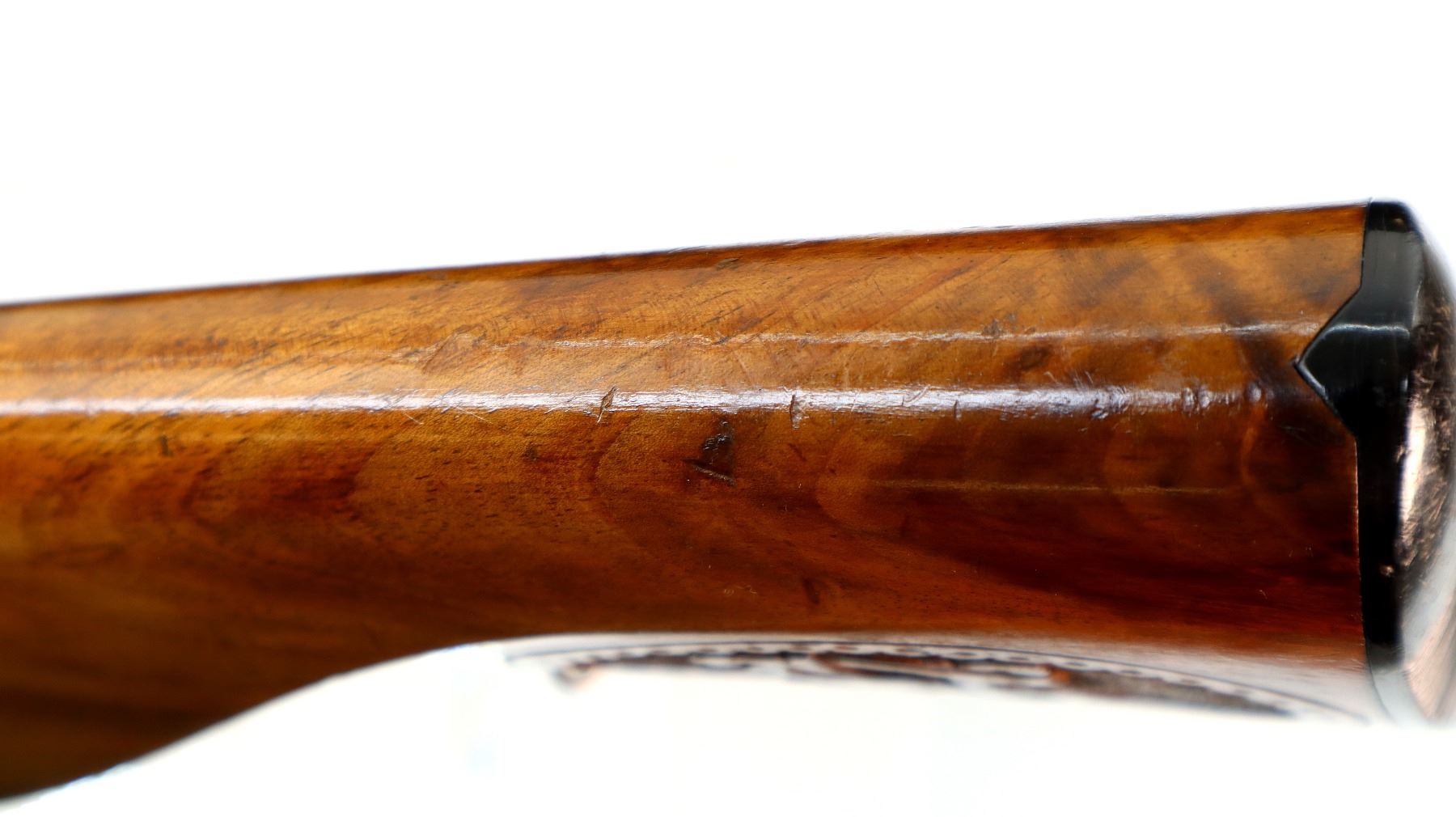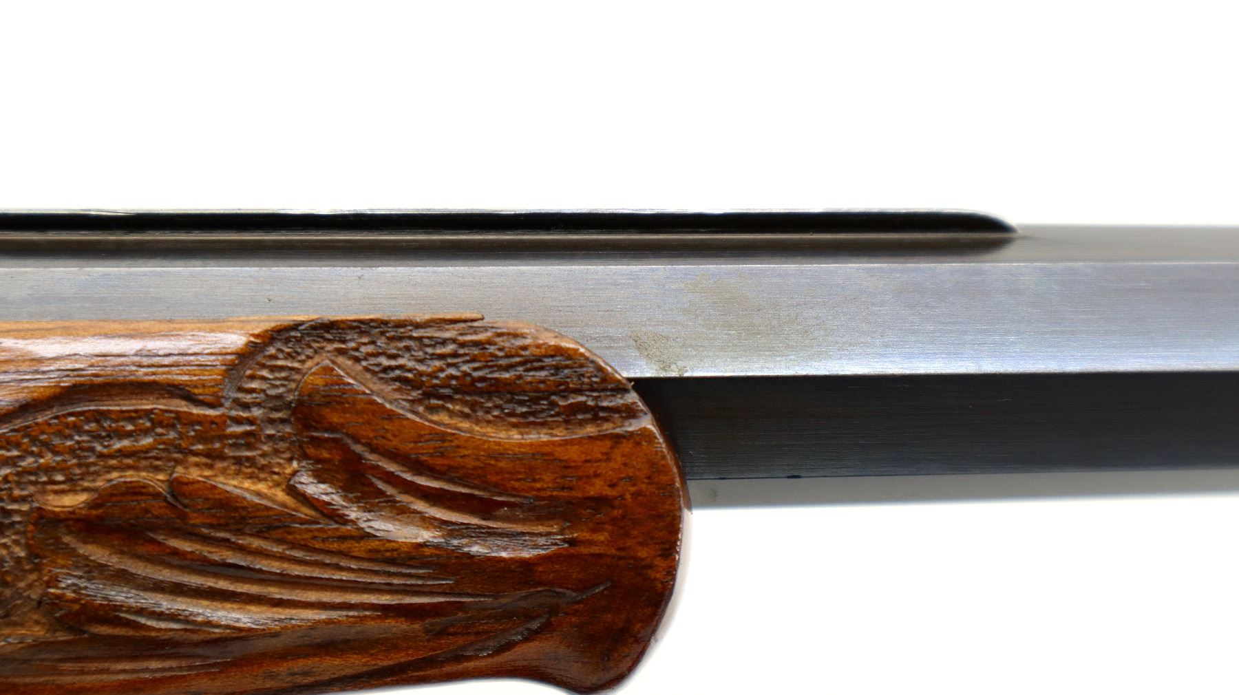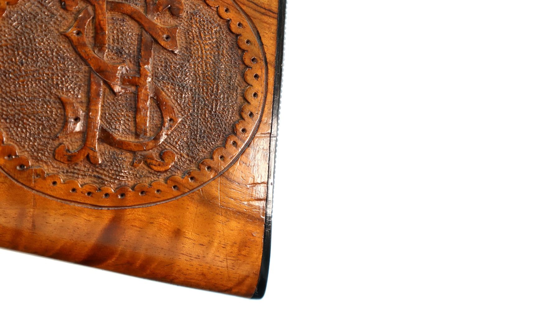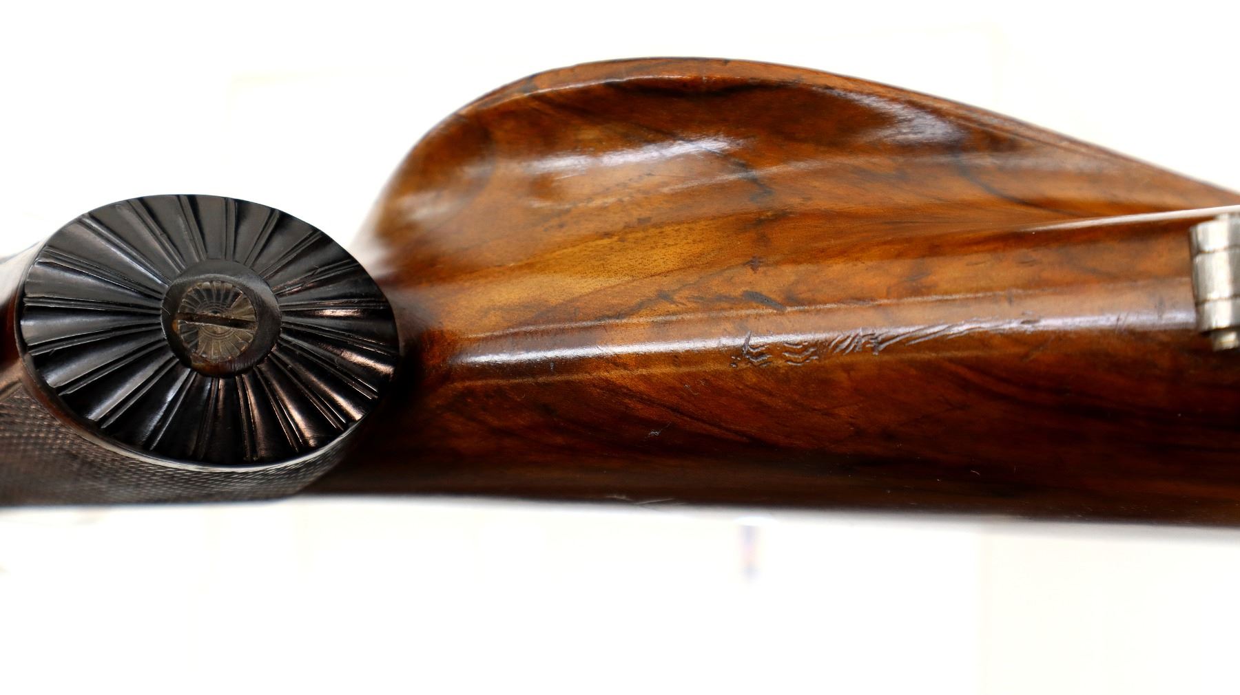 Main Description: Blade front sight with ramp, missing rear sight, blued tapered octagon barrel, colour case hardened receiver, manual safety, double set triggers, colour case hardened checkered lever. Two piece wood stocks, carved forearm with single wedge, checkered pistol grip, European cheek rest, grooved black polymer butt plate, grip cap, initials on left side of stock, sling swivels.