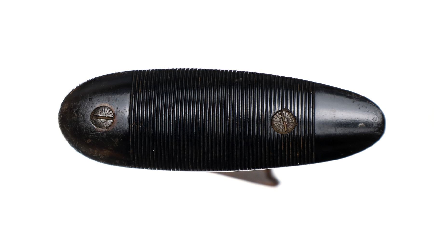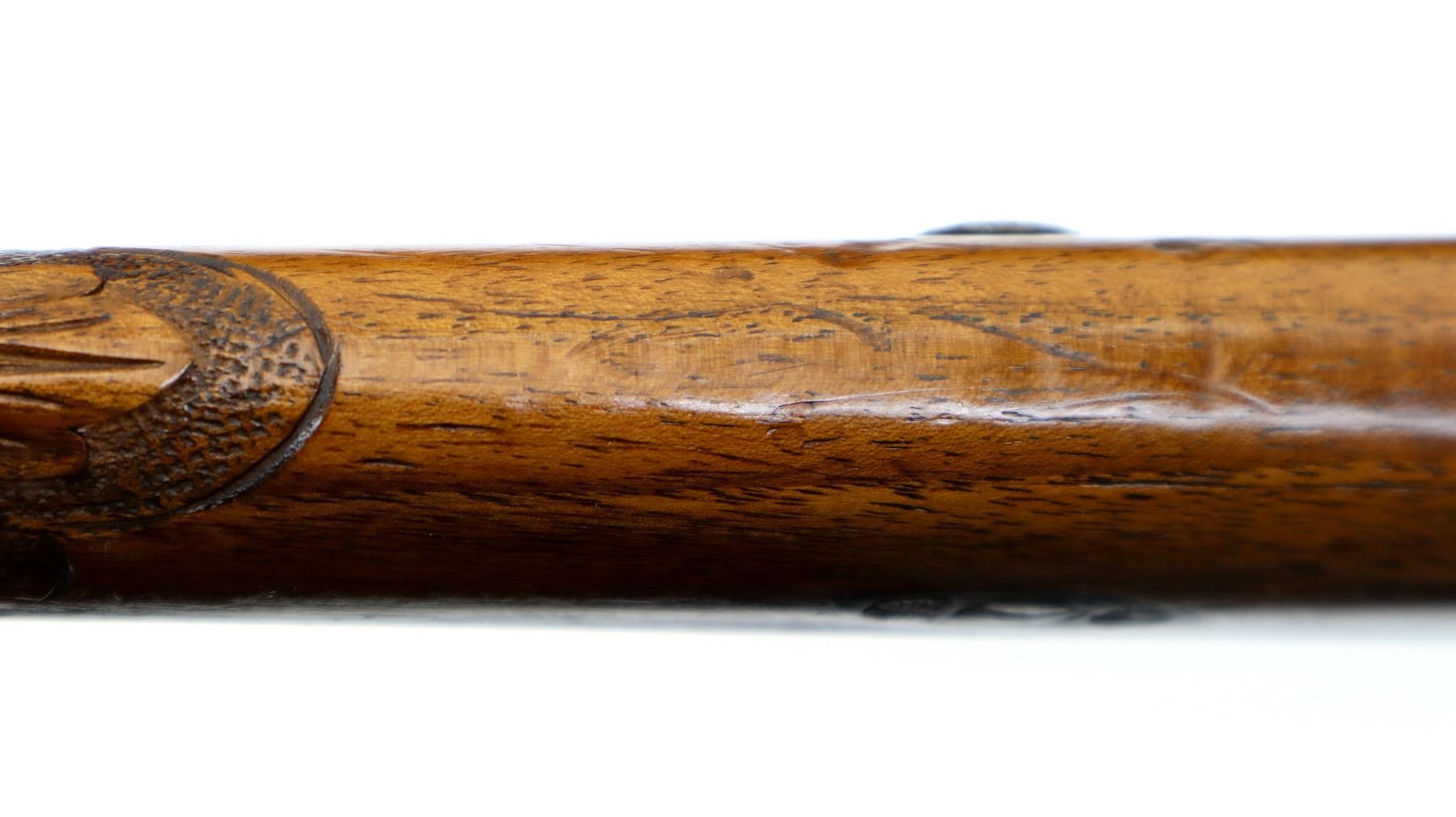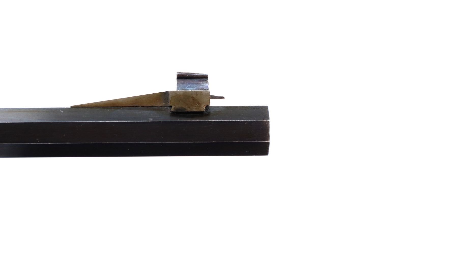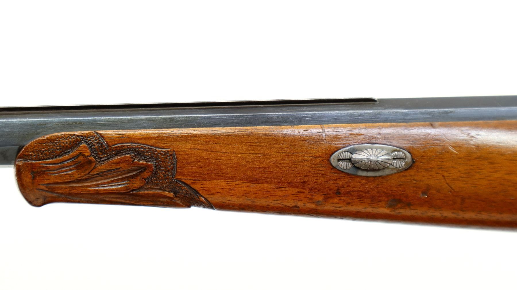 Main Description: Blade front sight with ramp, missing rear sight, blued tapered octagon barrel, colour case hardened receiver, manual safety, double set triggers, colour case hardened checkered lever. Two piece wood stocks, carved forearm with single wedge, checkered pistol grip, European cheek rest, grooved black polymer butt plate, grip cap, initials on left side of stock, sling swivels.