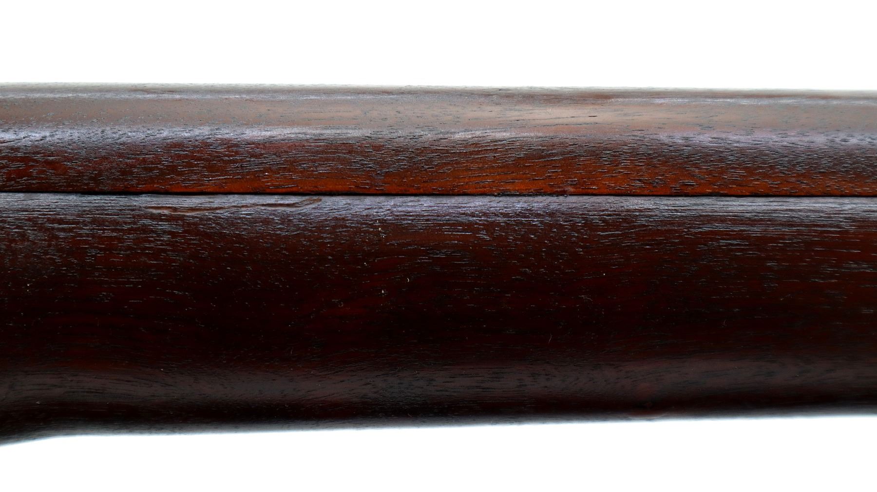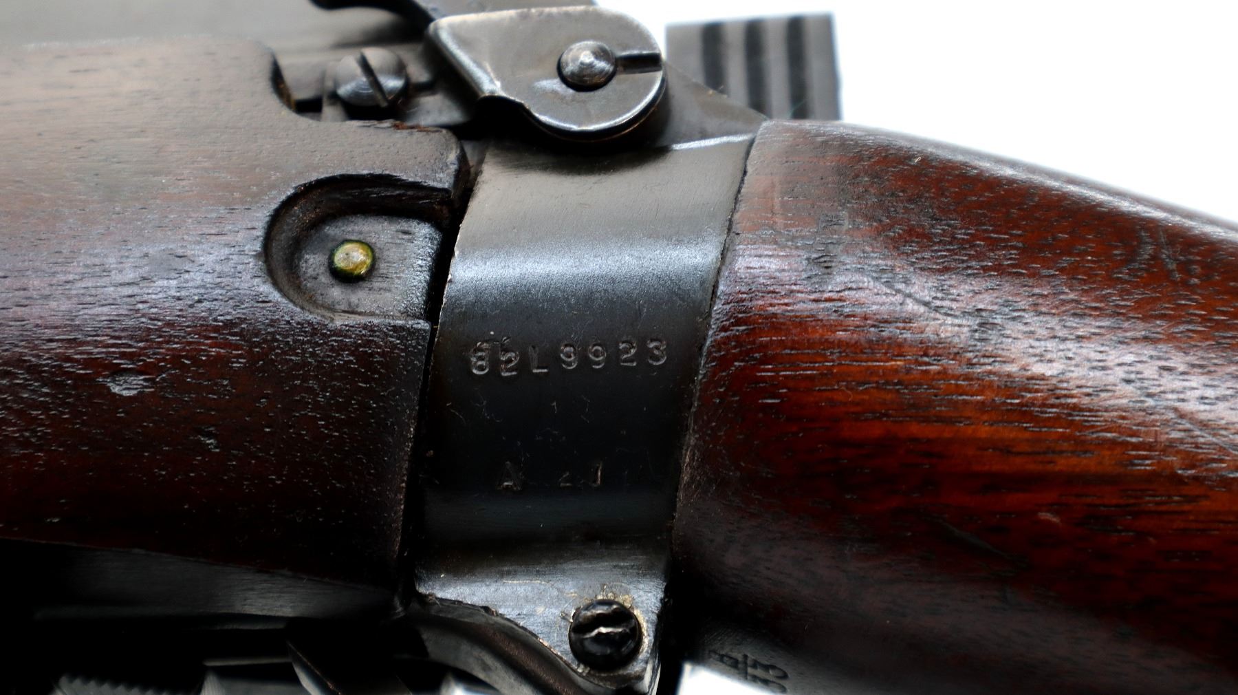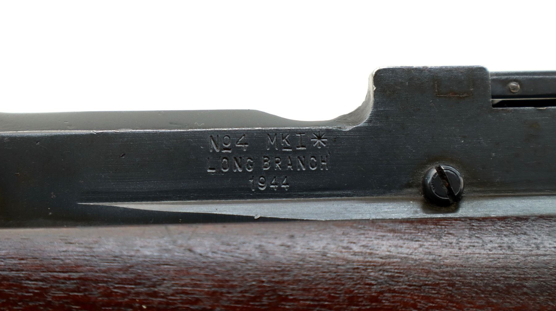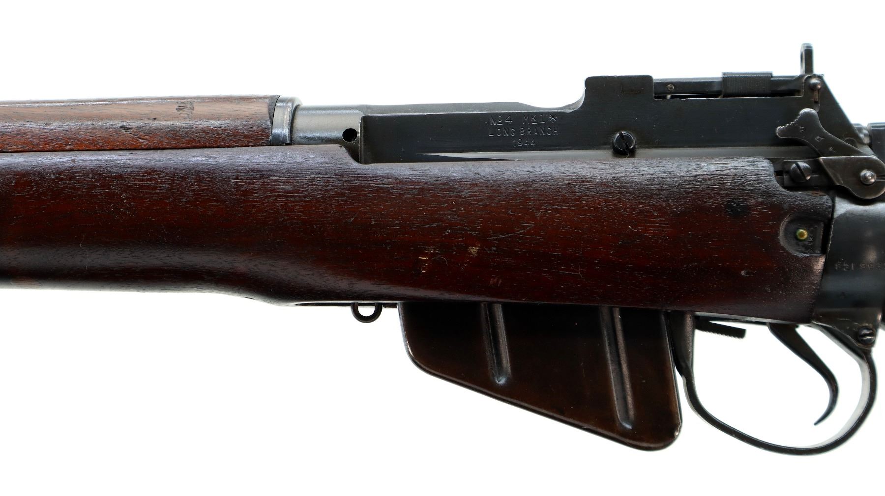 Main Description: Manufactured by Long Branch 1944, bolt matches. Blade front sight with ears and ramp, adjustable stamped MKIII rear peep sight, blued metal finish, receiver ring has double broad arrows in a C indicating sold from stores. Four piece full military wood stocks, pistol grip, smooth steel butt plate with trap, sling swivels, bayonet lugs.