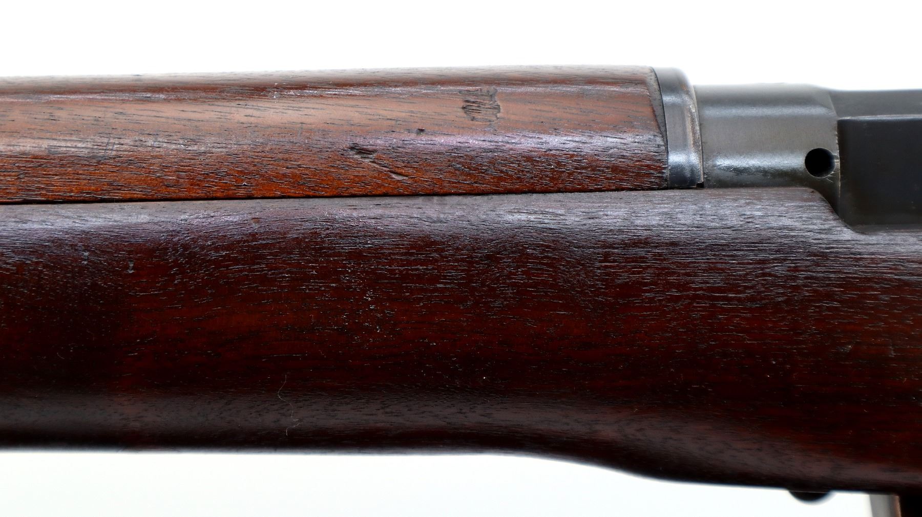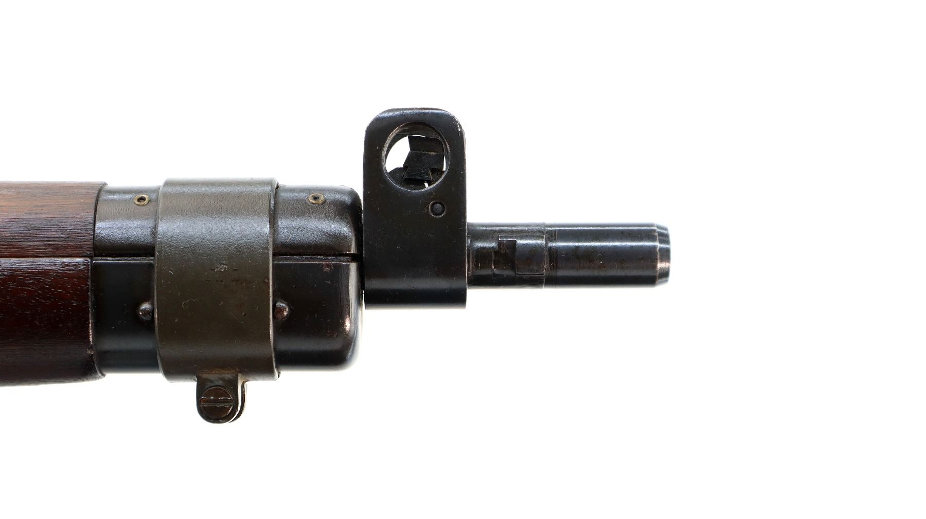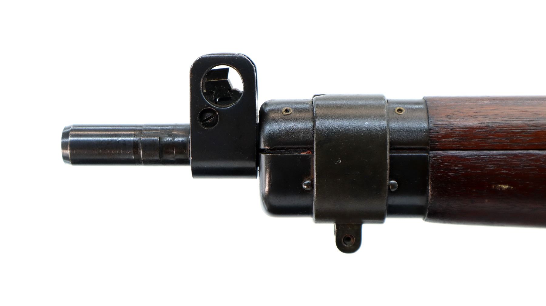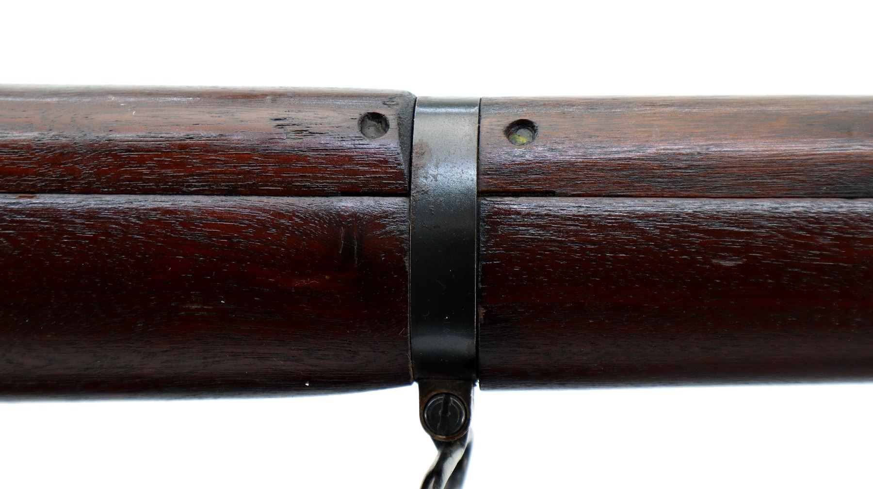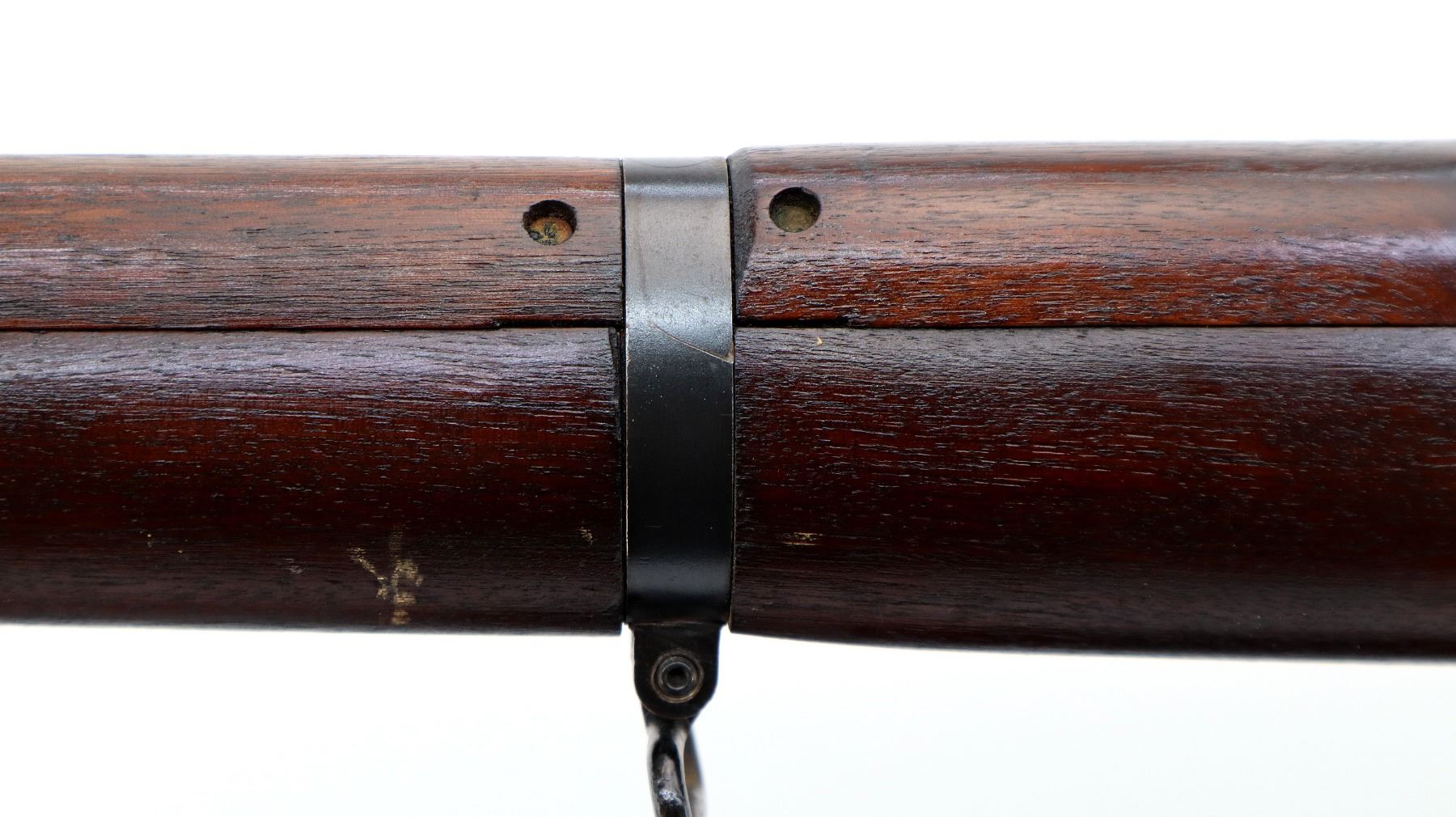 Main Description: Manufactured by Long Branch 1944, bolt matches. Blade front sight with ears and ramp, adjustable stamped MKIII rear peep sight, blued metal finish, receiver ring has double broad arrows in a C indicating sold from stores. Four piece full military wood stocks, pistol grip, smooth steel butt plate with trap, sling swivels, bayonet lugs.