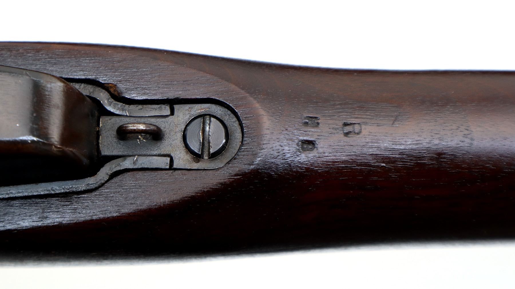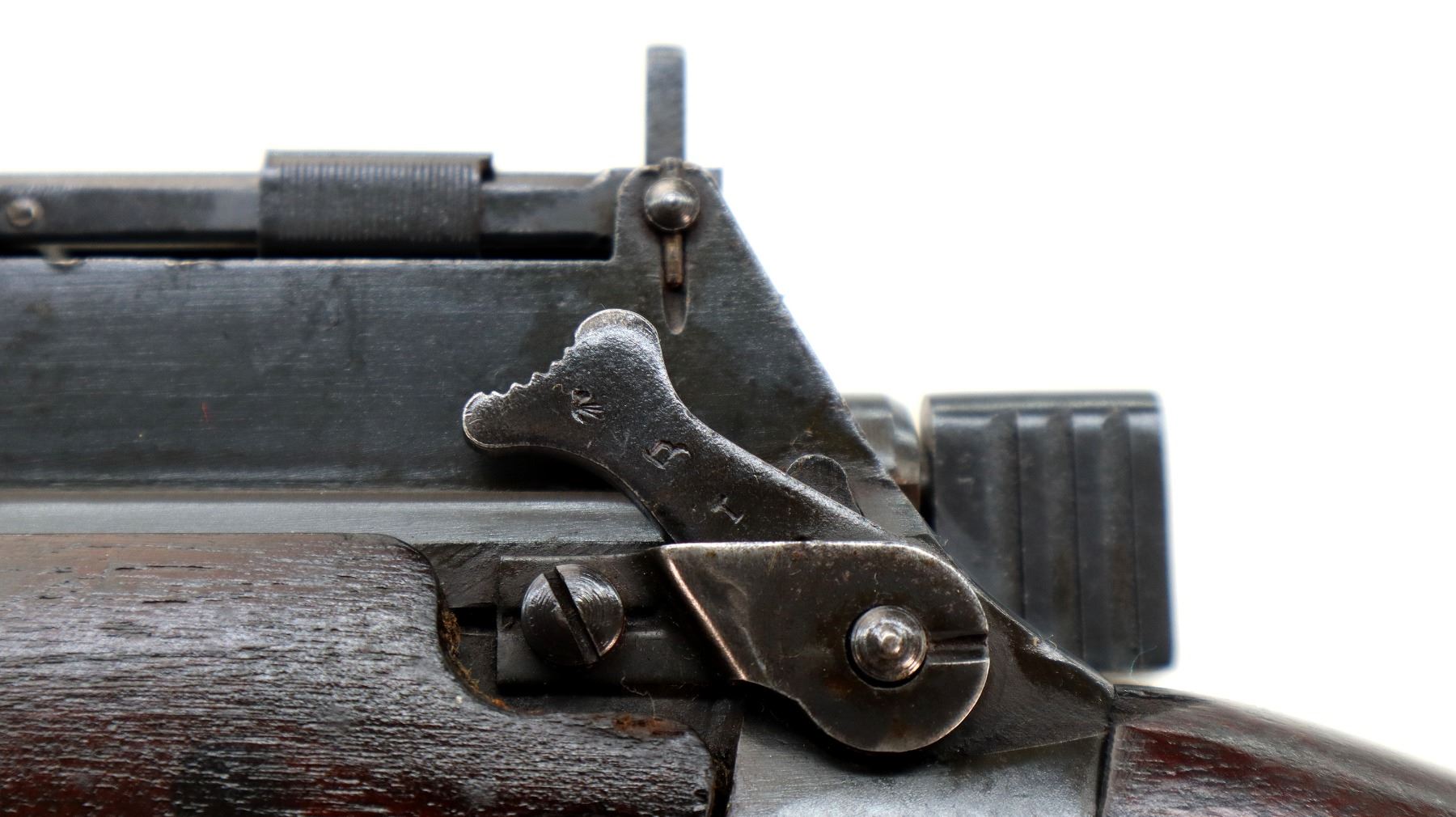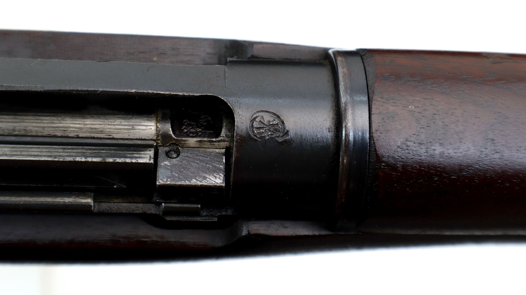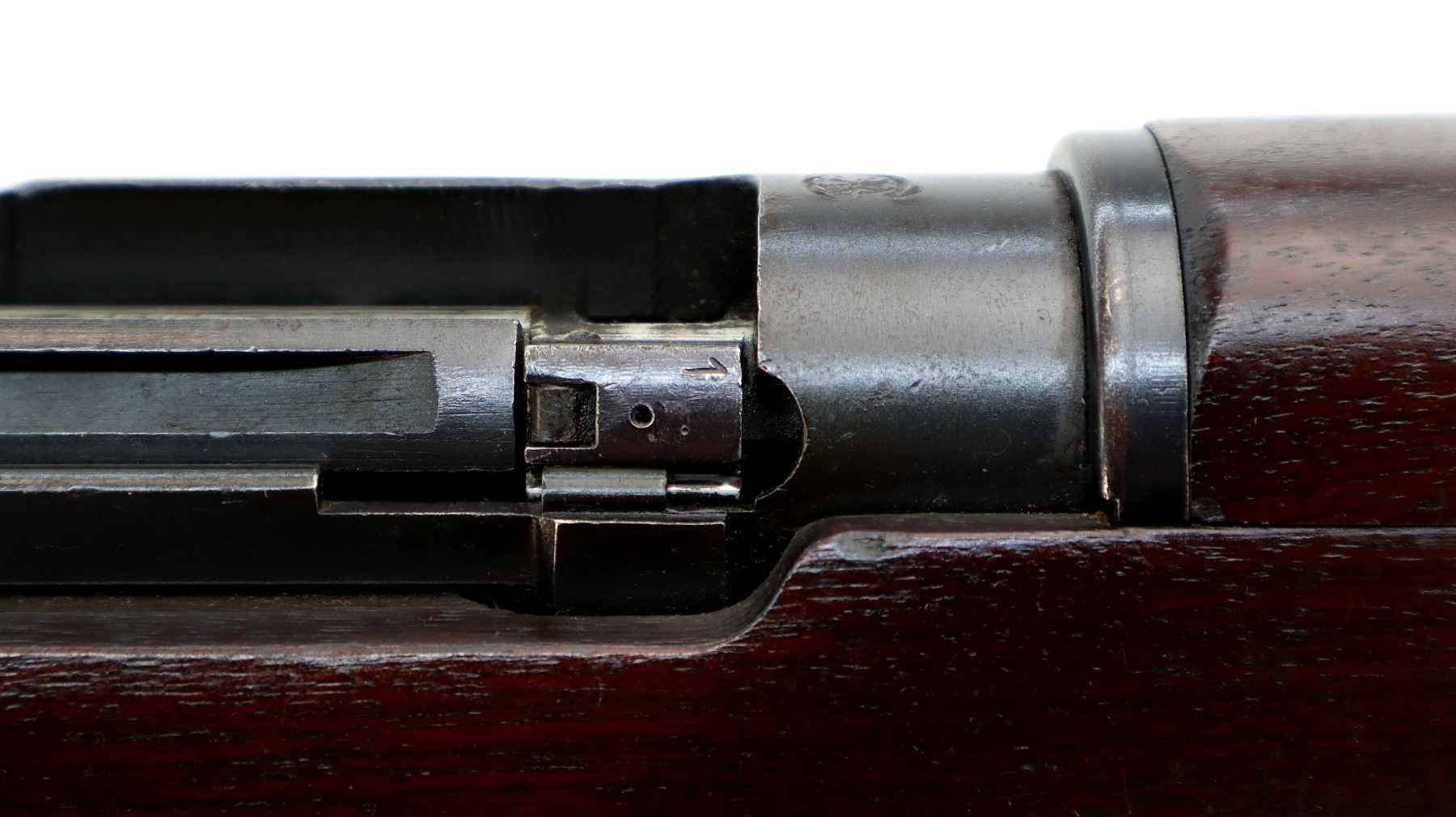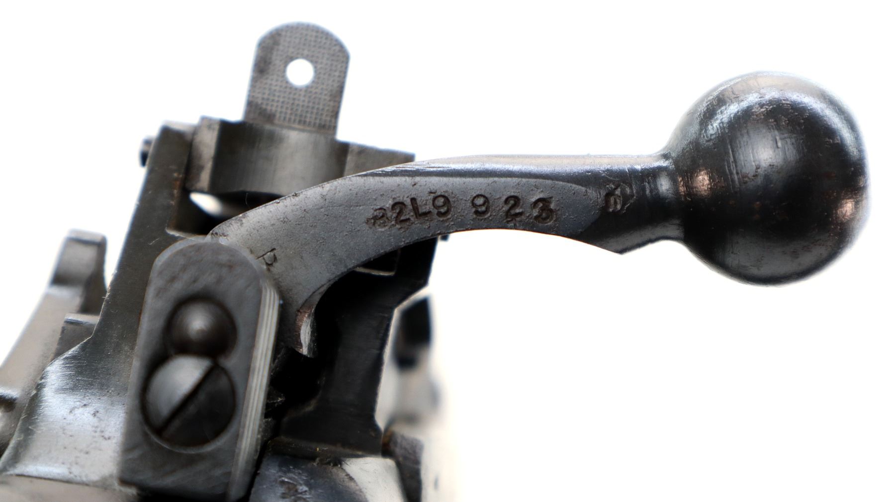 Main Description: Manufactured by Long Branch 1944, bolt matches. Blade front sight with ears and ramp, adjustable stamped MKIII rear peep sight, blued metal finish, receiver ring has double broad arrows in a C indicating sold from stores. Four piece full military wood stocks, pistol grip, smooth steel butt plate with trap, sling swivels, bayonet lugs.