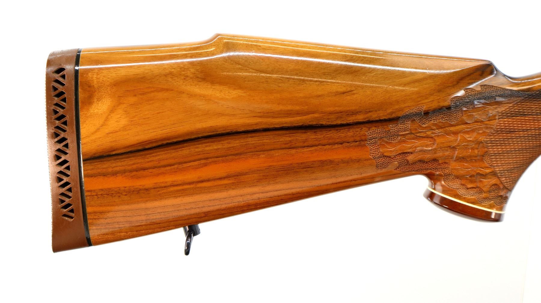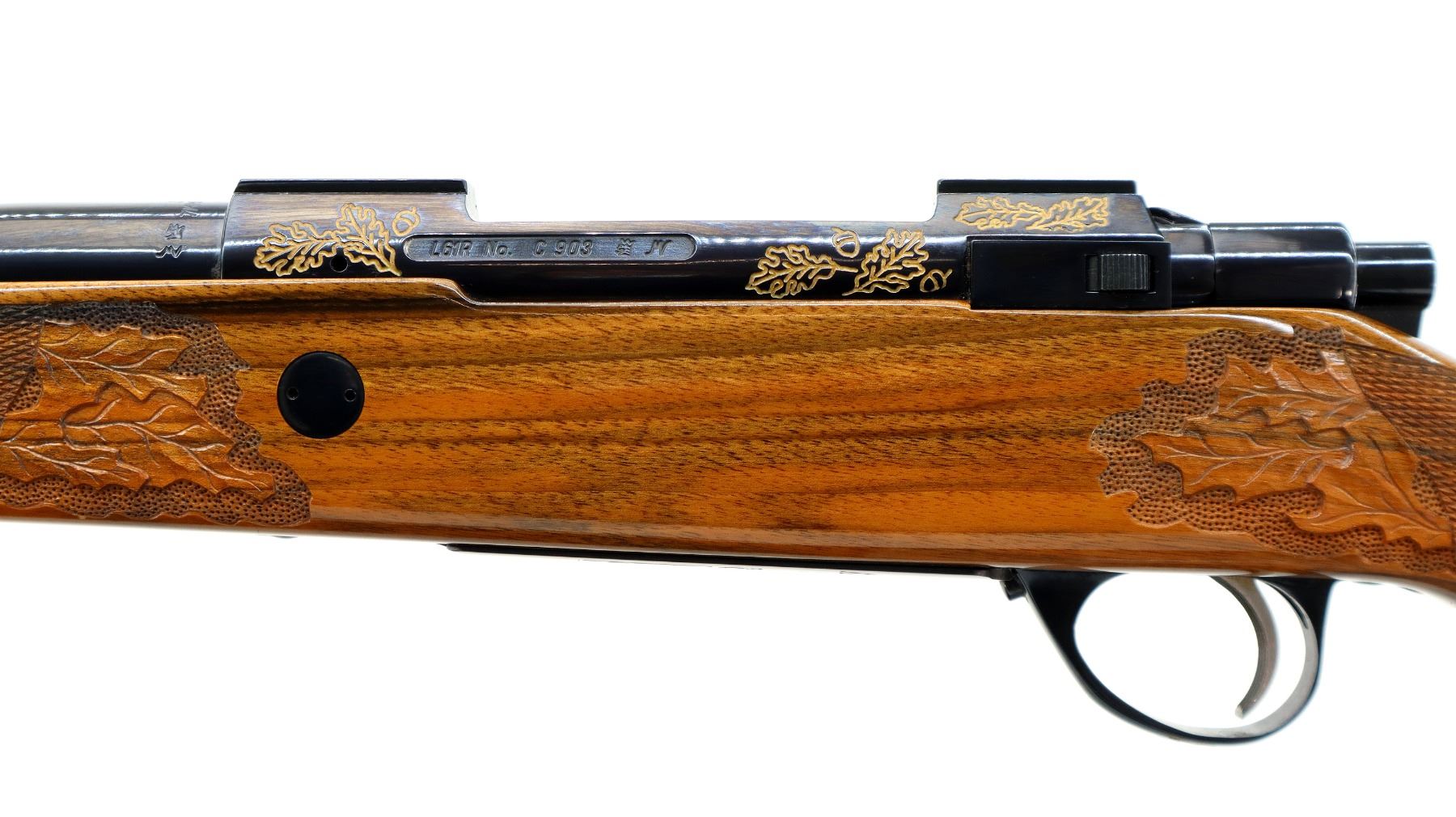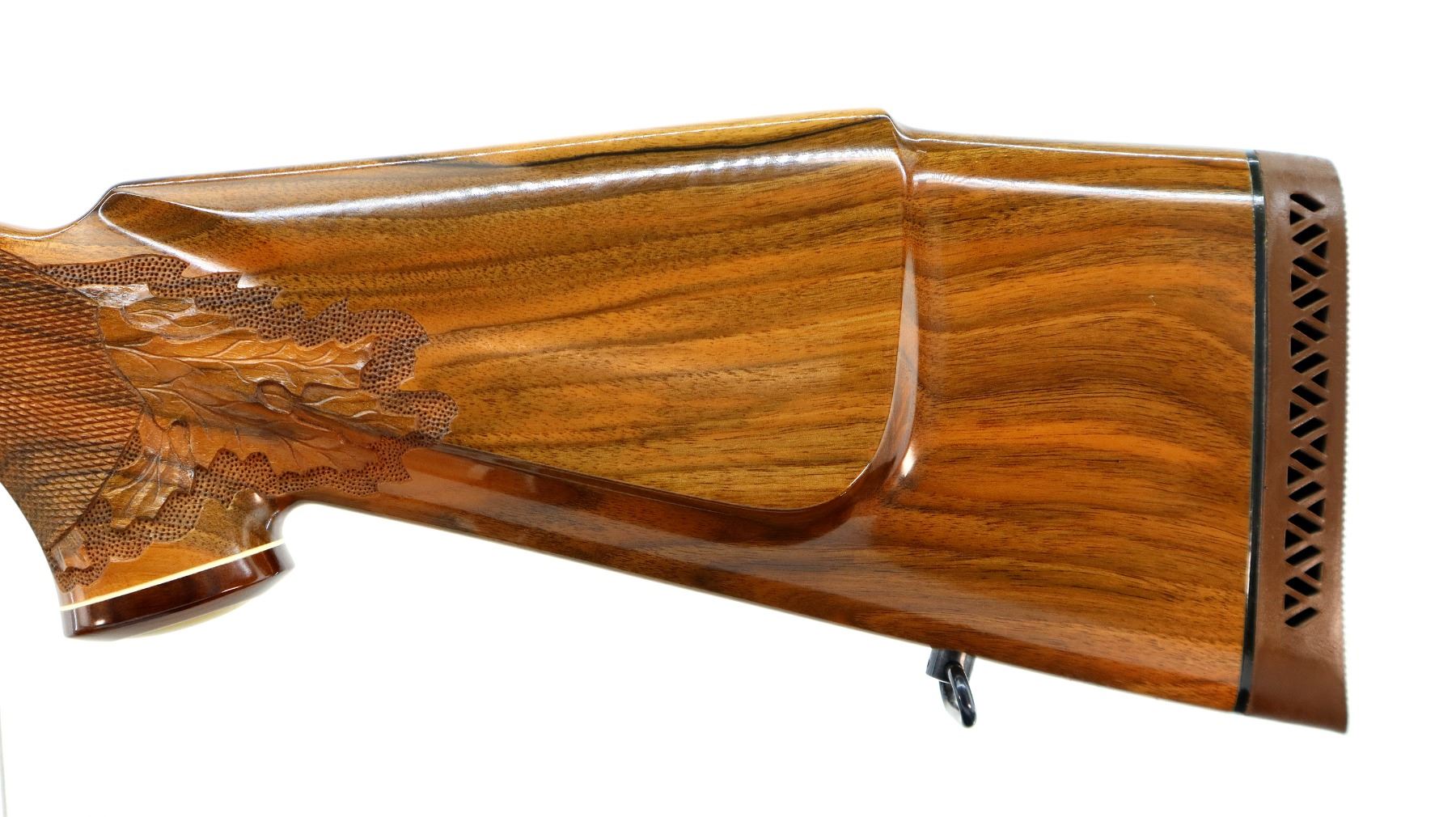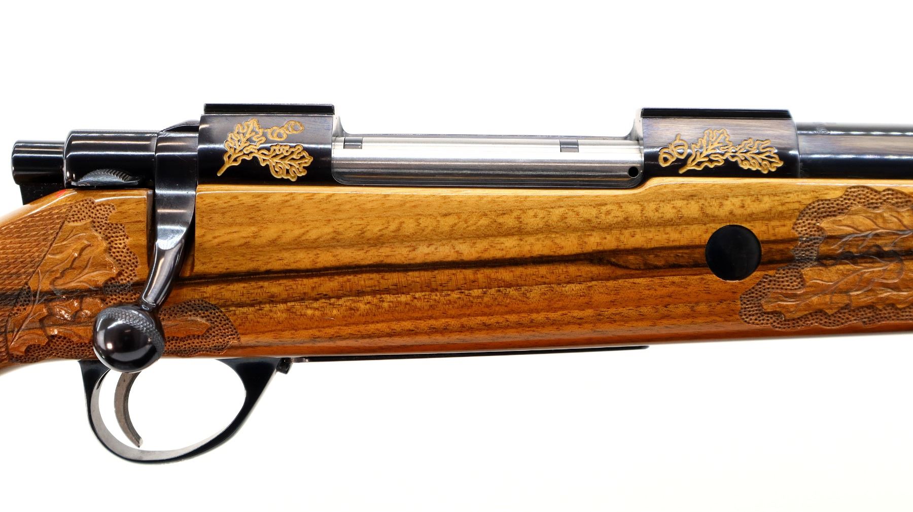 Main Description: No sights, polish blued finish, tapered round barrel, integral scope bases, receiver and floor plate have engraved Oak Leaves and Acorns, checkered bolt knob. One piece gloss finish wood stock, Rosewood forend and pistol grip cap with brass medallion, checkered forearm and pistol grip with carved Oak Leaves, cheek rest, brown vented rubber recoil pad, hinged floor plate, sling swivels.