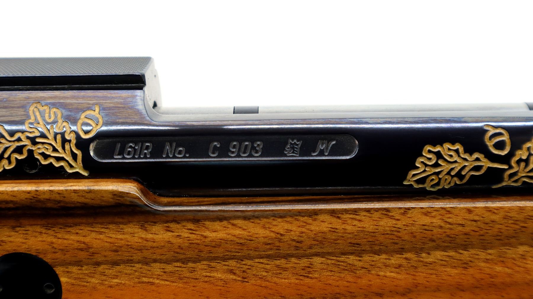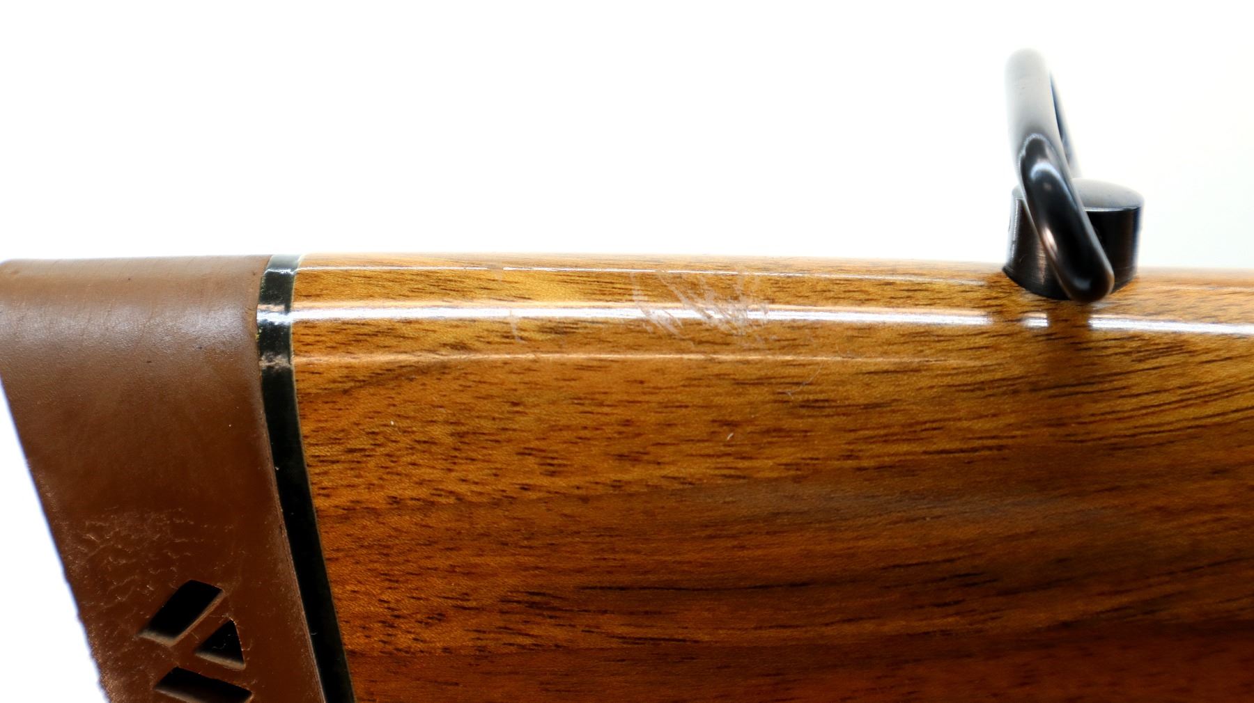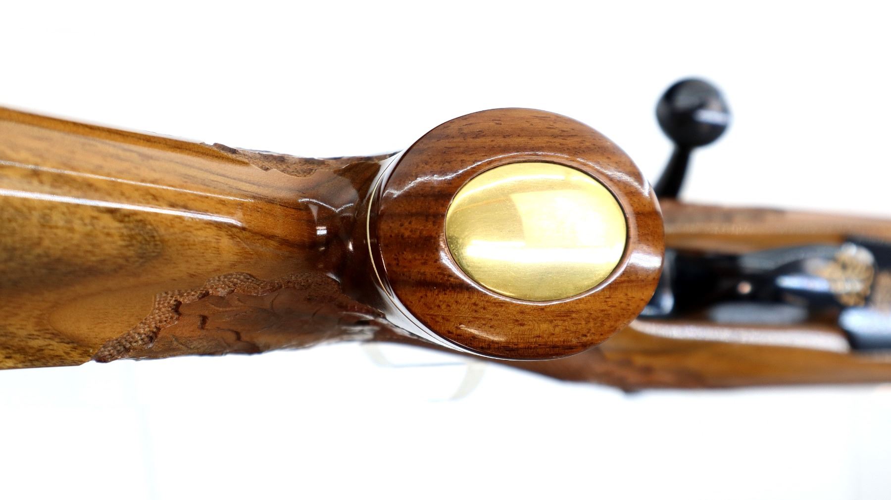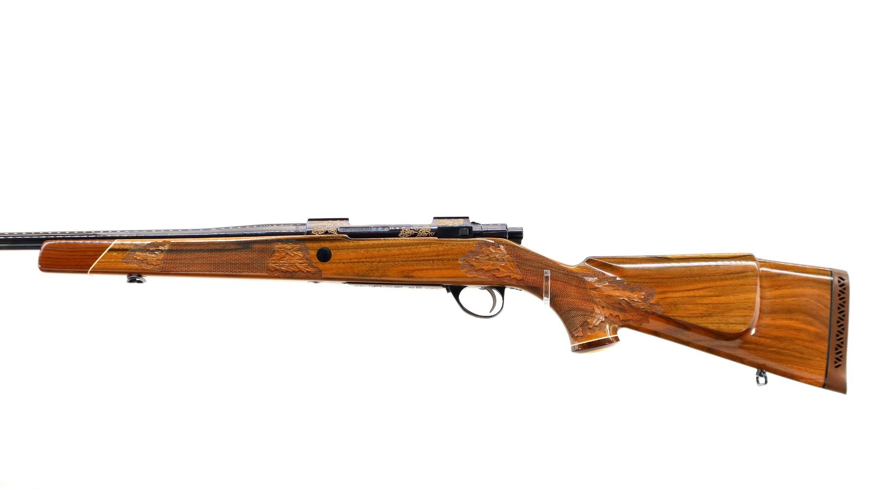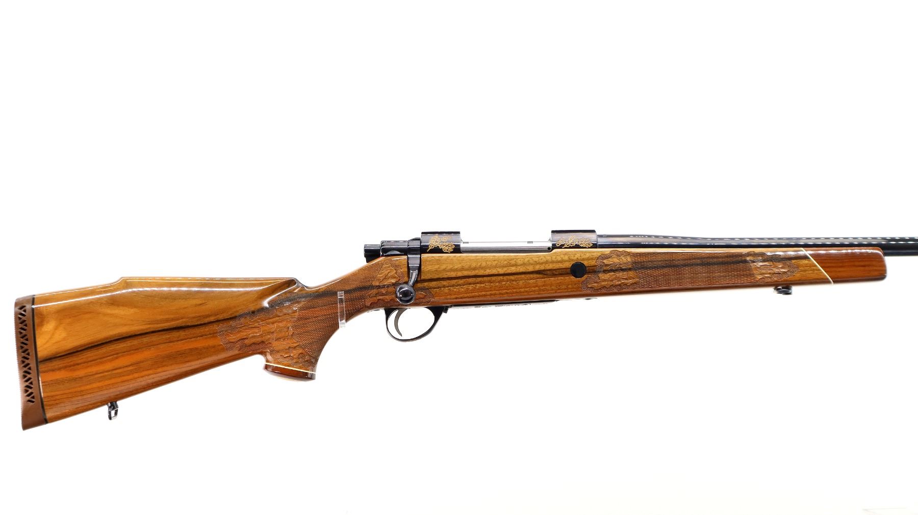 Main Description: No sights, polish blued finish, tapered round barrel, integral scope bases, receiver and floor plate have engraved Oak Leaves and Acorns, checkered bolt knob. One piece gloss finish wood stock, Rosewood forend and pistol grip cap with brass medallion, checkered forearm and pistol grip with carved Oak Leaves, cheek rest, brown vented rubber recoil pad, hinged floor plate, sling swivels.
