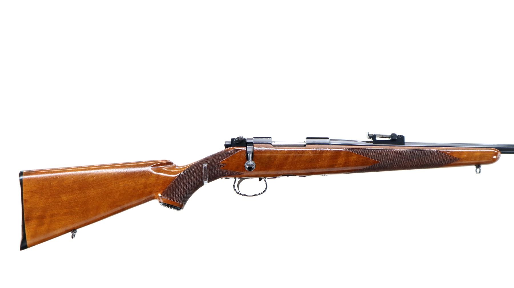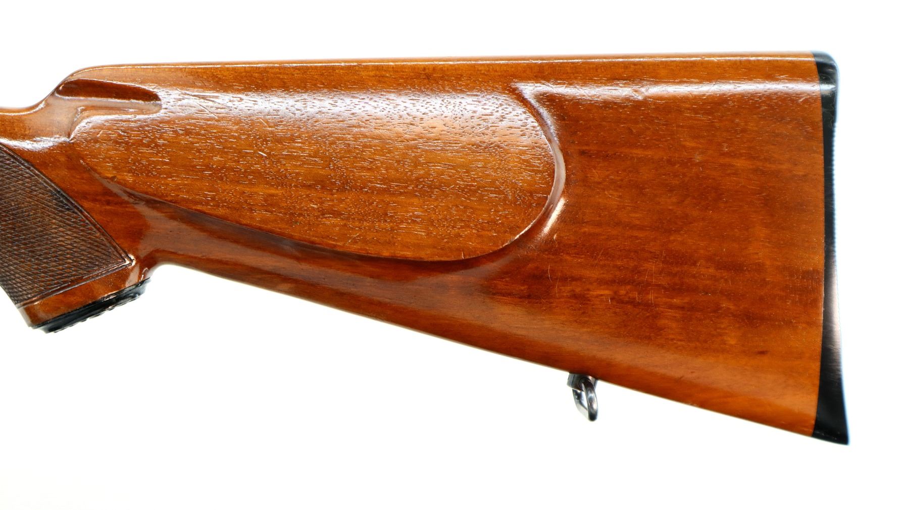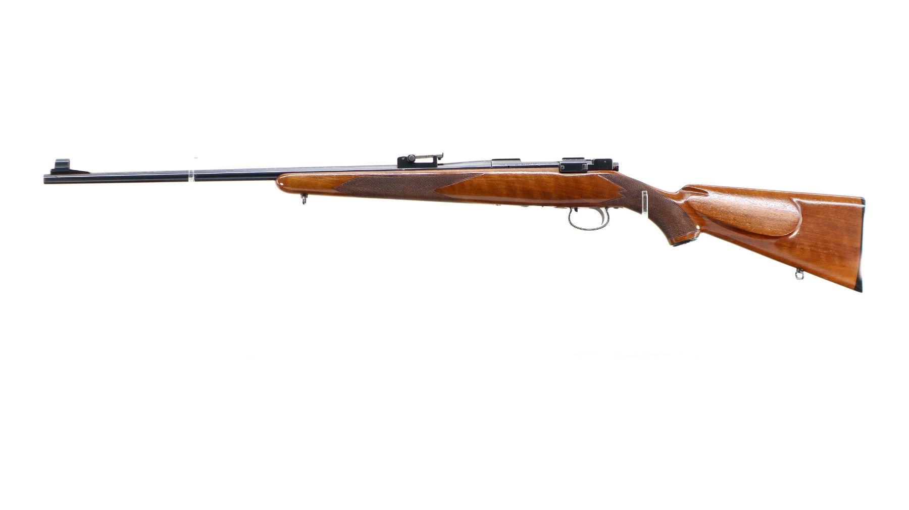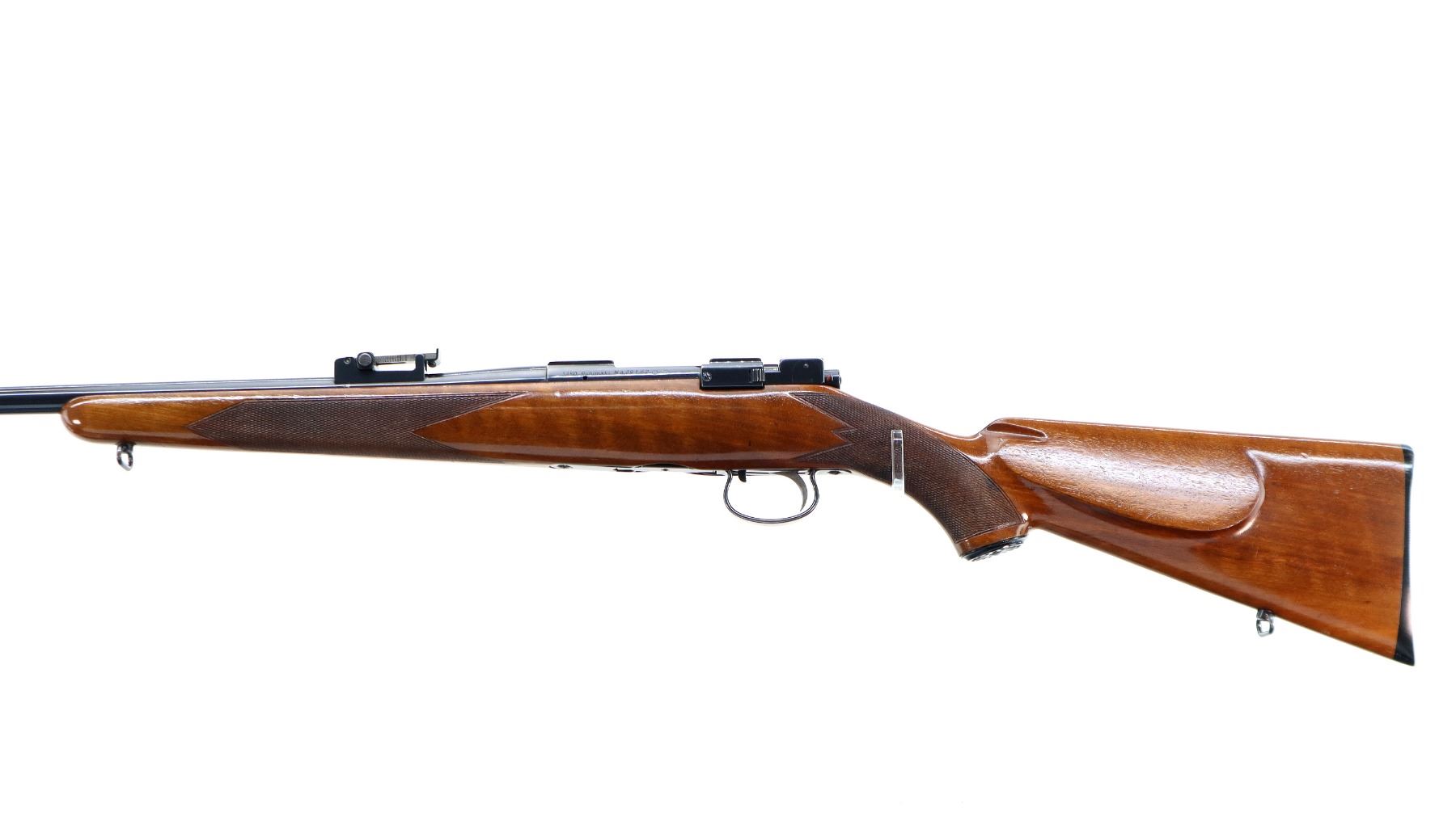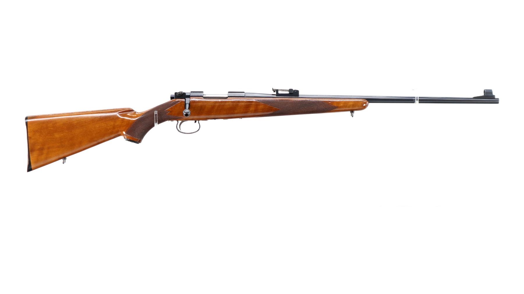 Main Description: Manufactured 1955. Blade front sight with hood and ramp, adjustable u notched rear sight, polish blued finish, receiver has integral scope bases, checkered bolt knob. One piece gloss finish wood stock, checkered forearm and pistol grip, European cheek rest, grooved black polymer butt plate, grip cap, sling swivels.