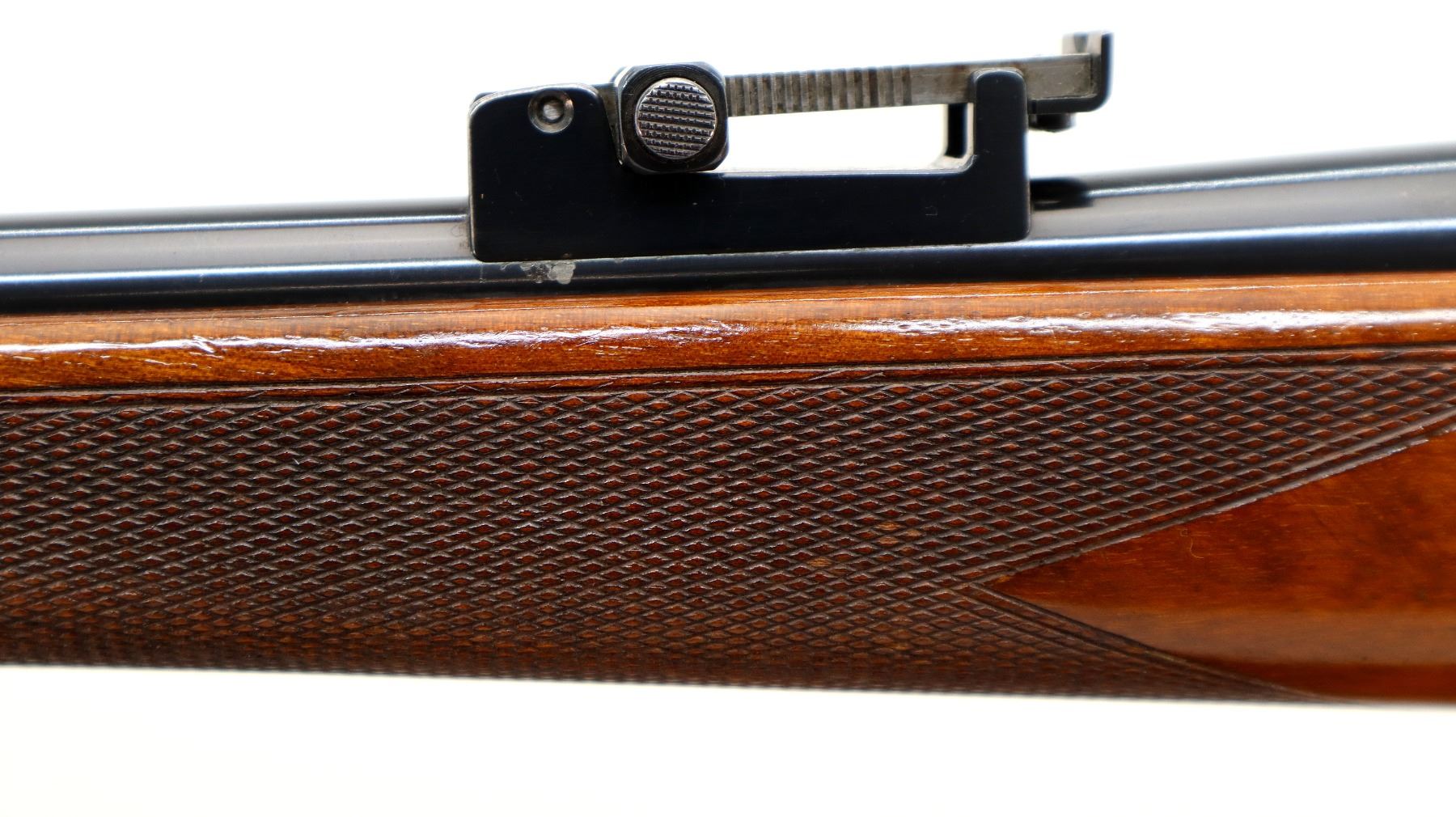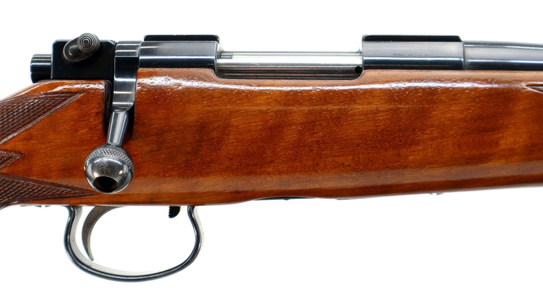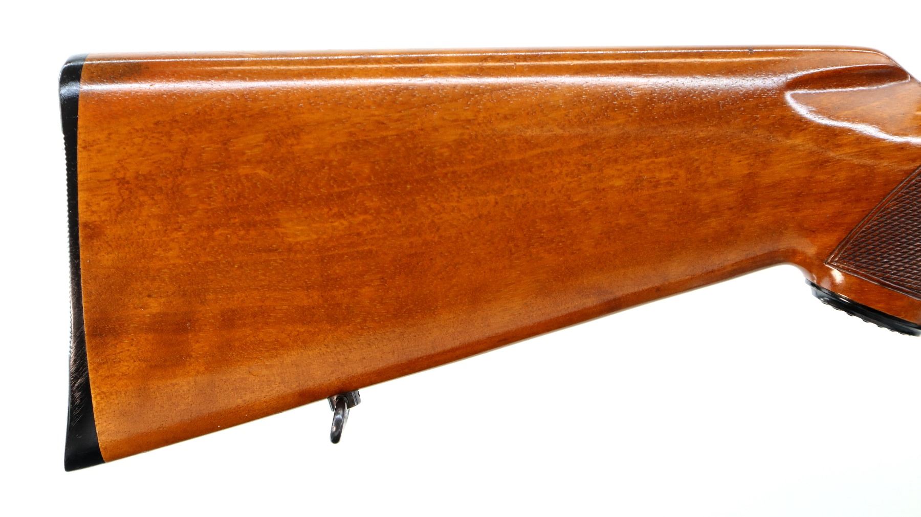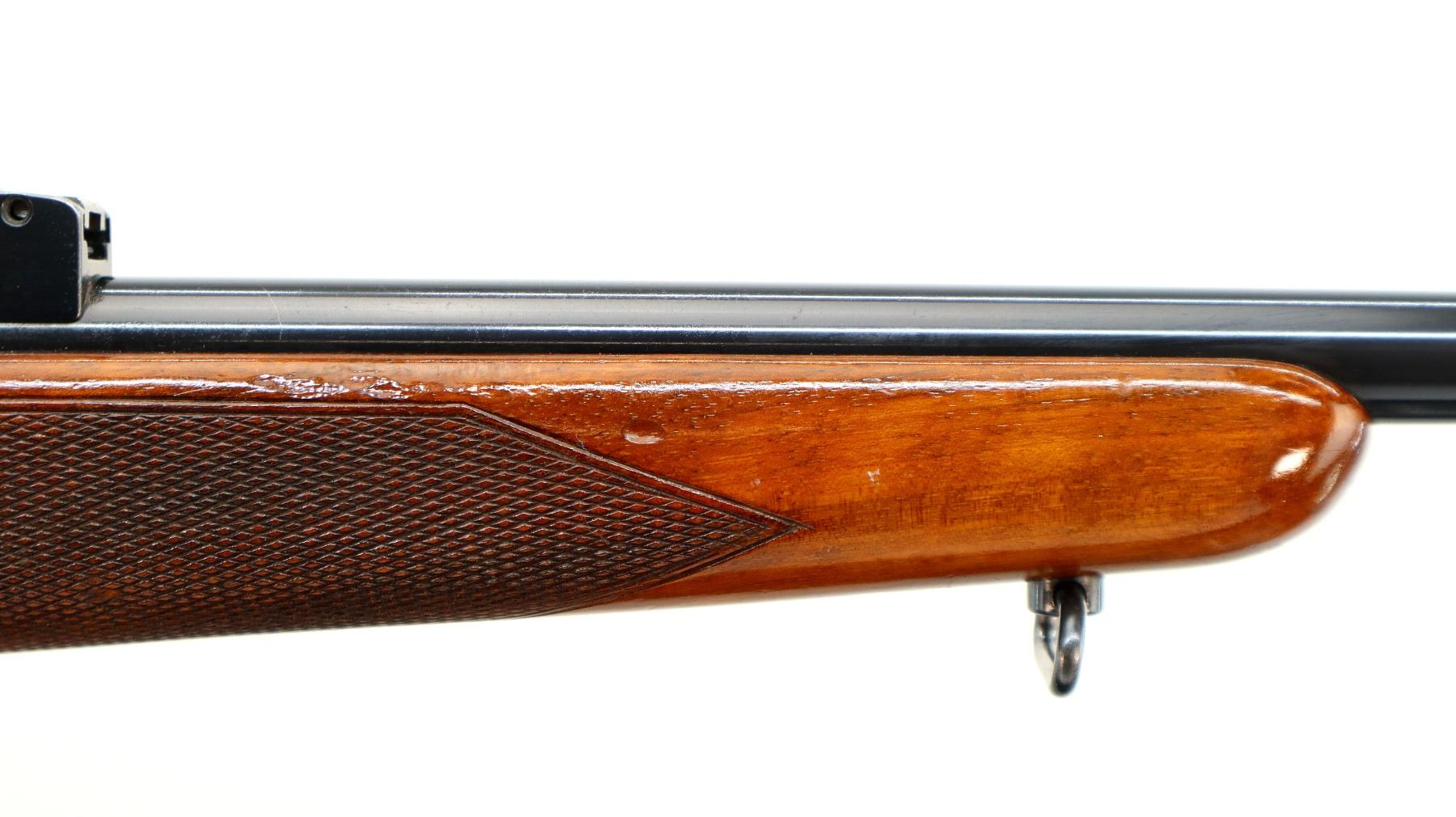 Main Description: Manufactured 1955. Blade front sight with hood and ramp, adjustable u notched rear sight, polish blued finish, receiver has integral scope bases, checkered bolt knob. One piece gloss finish wood stock, checkered forearm and pistol grip, European cheek rest, grooved black polymer butt plate, grip cap, sling swivels.