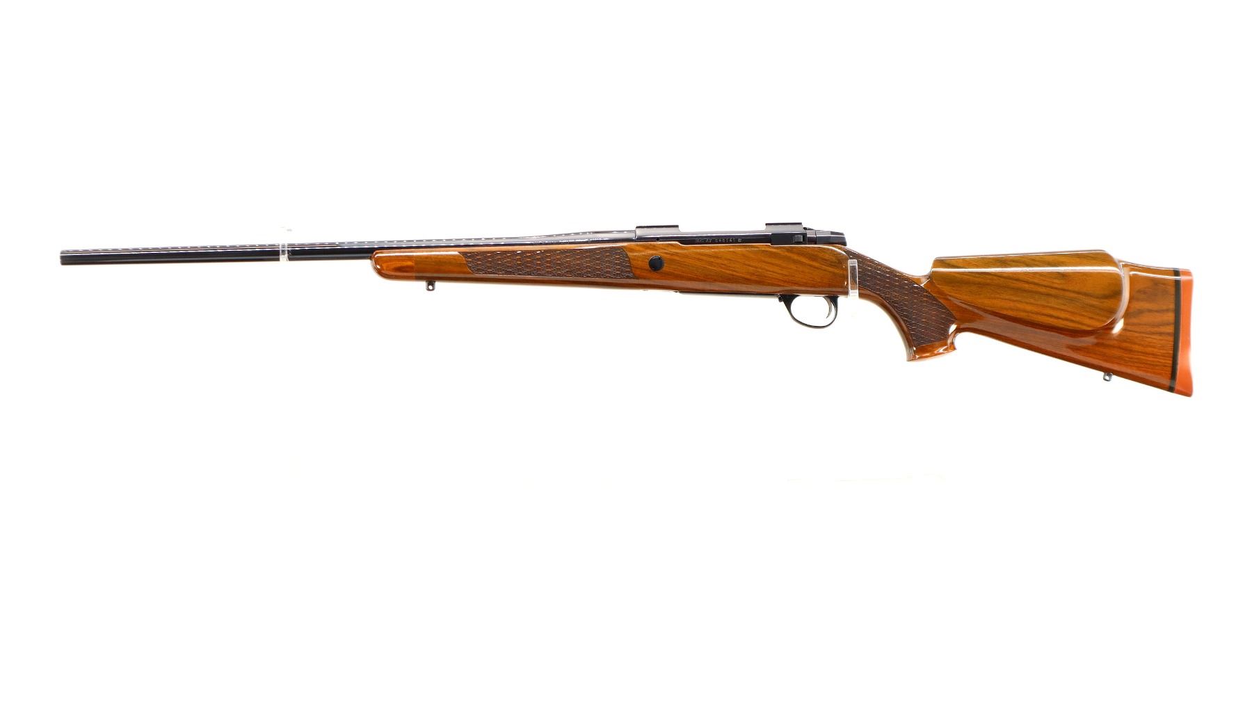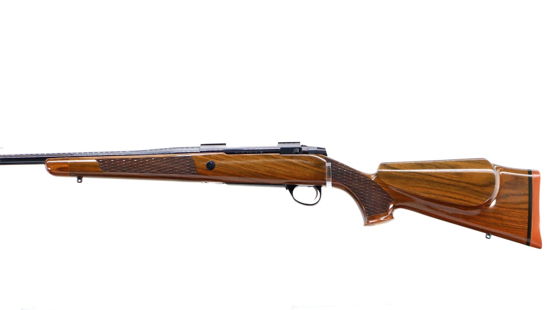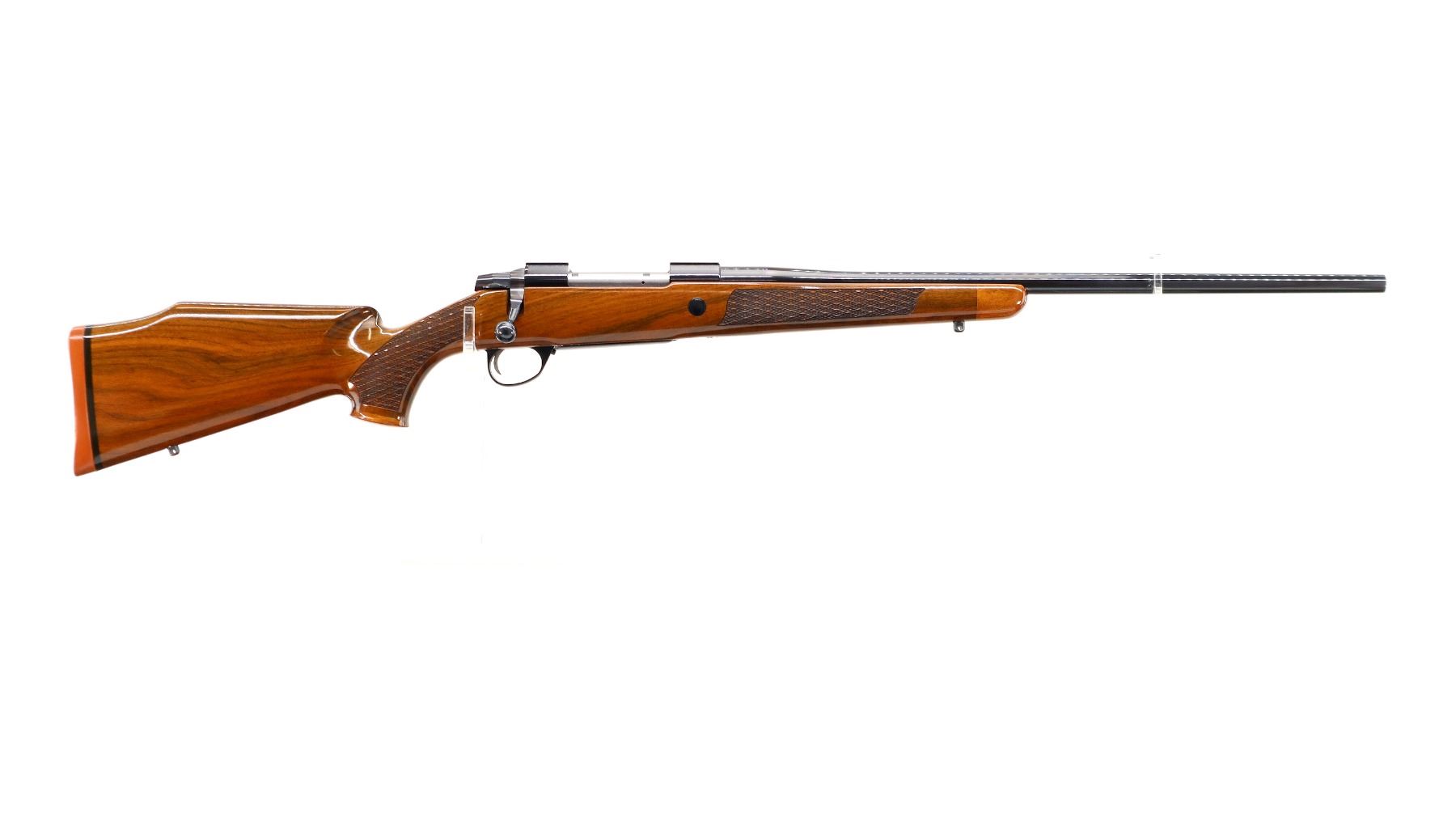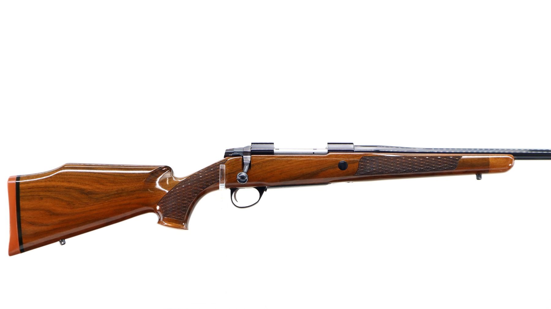 Main Description: No sights, polish blued finish, tapered round barrel, receiver has integral scope bases, smooth bolt knob. One piece gloss finish wood stock, Rosewood forend and pistol grip caps, checkered forearm and pistol grip with right hand palm swell, cheek rest, red rubber recoil pad, engraved, steel hinged floor plate and trigger guard, swivel studs.