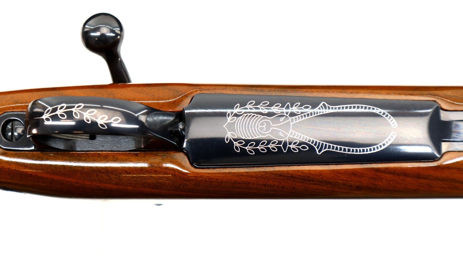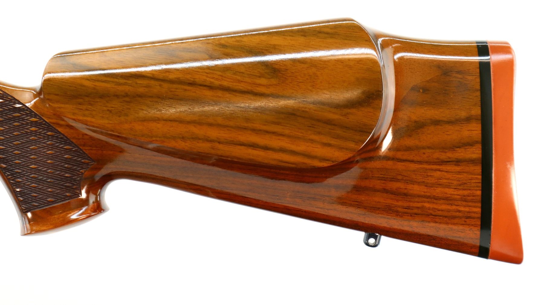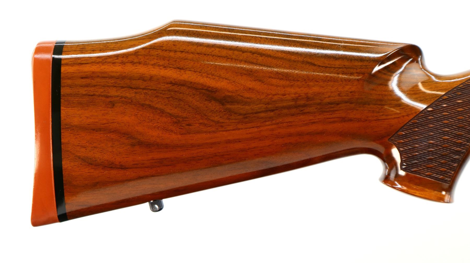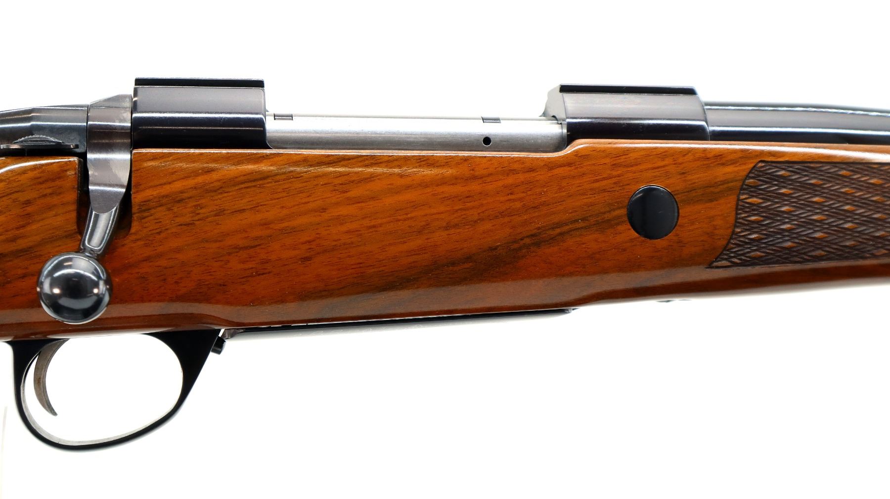 Main Description: No sights, polish blued finish, tapered round barrel, receiver has integral scope bases, smooth bolt knob. One piece gloss finish wood stock, Rosewood forend and pistol grip caps, checkered forearm and pistol grip with right hand palm swell, cheek rest, red rubber recoil pad, engraved, steel hinged floor plate and trigger guard, swivel studs.