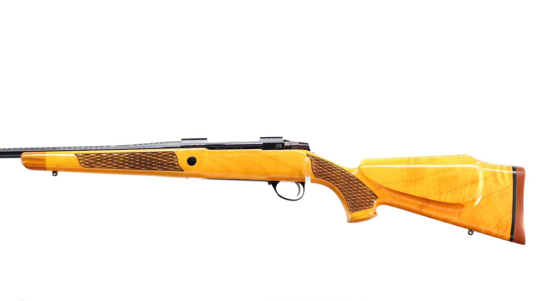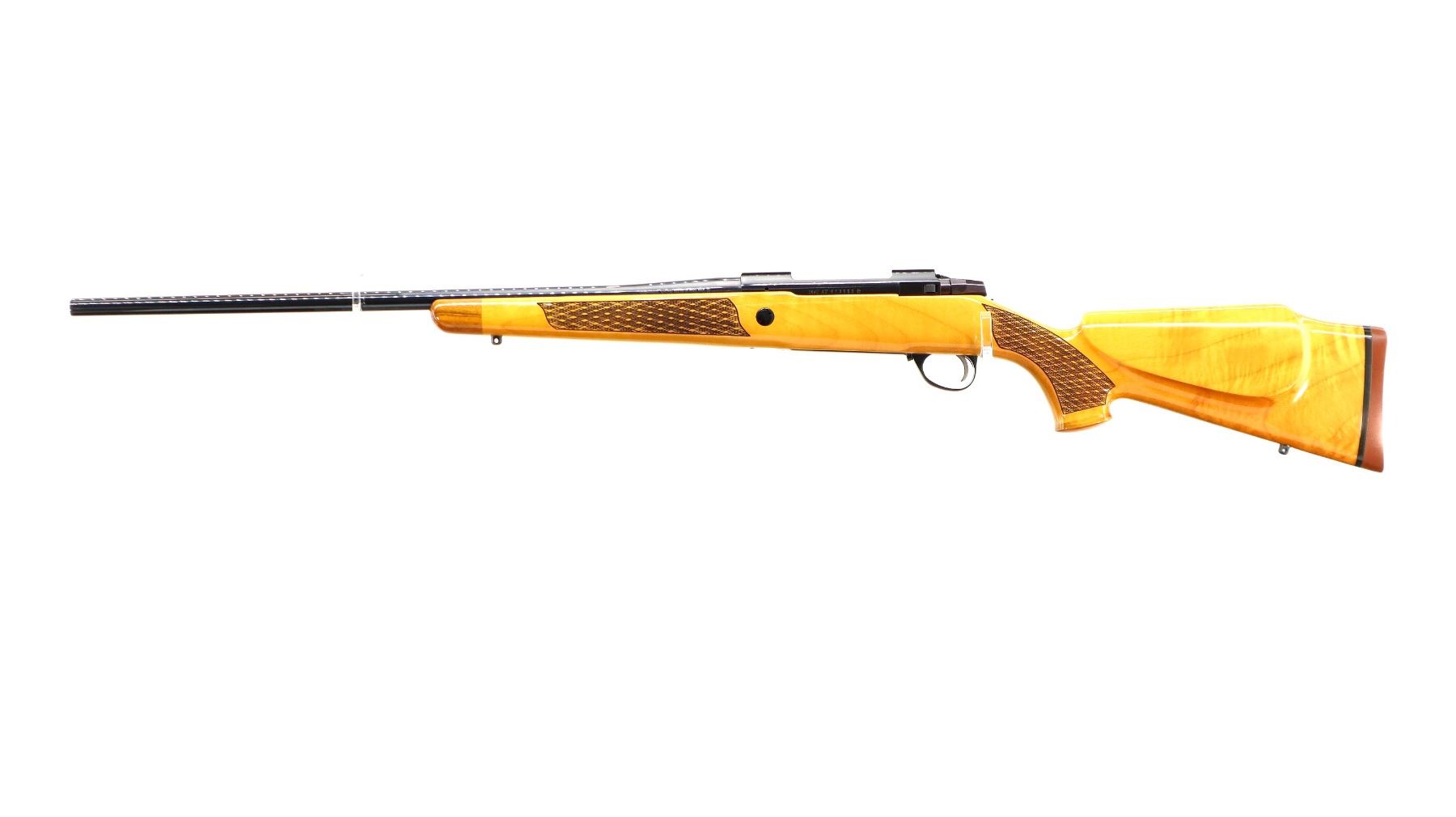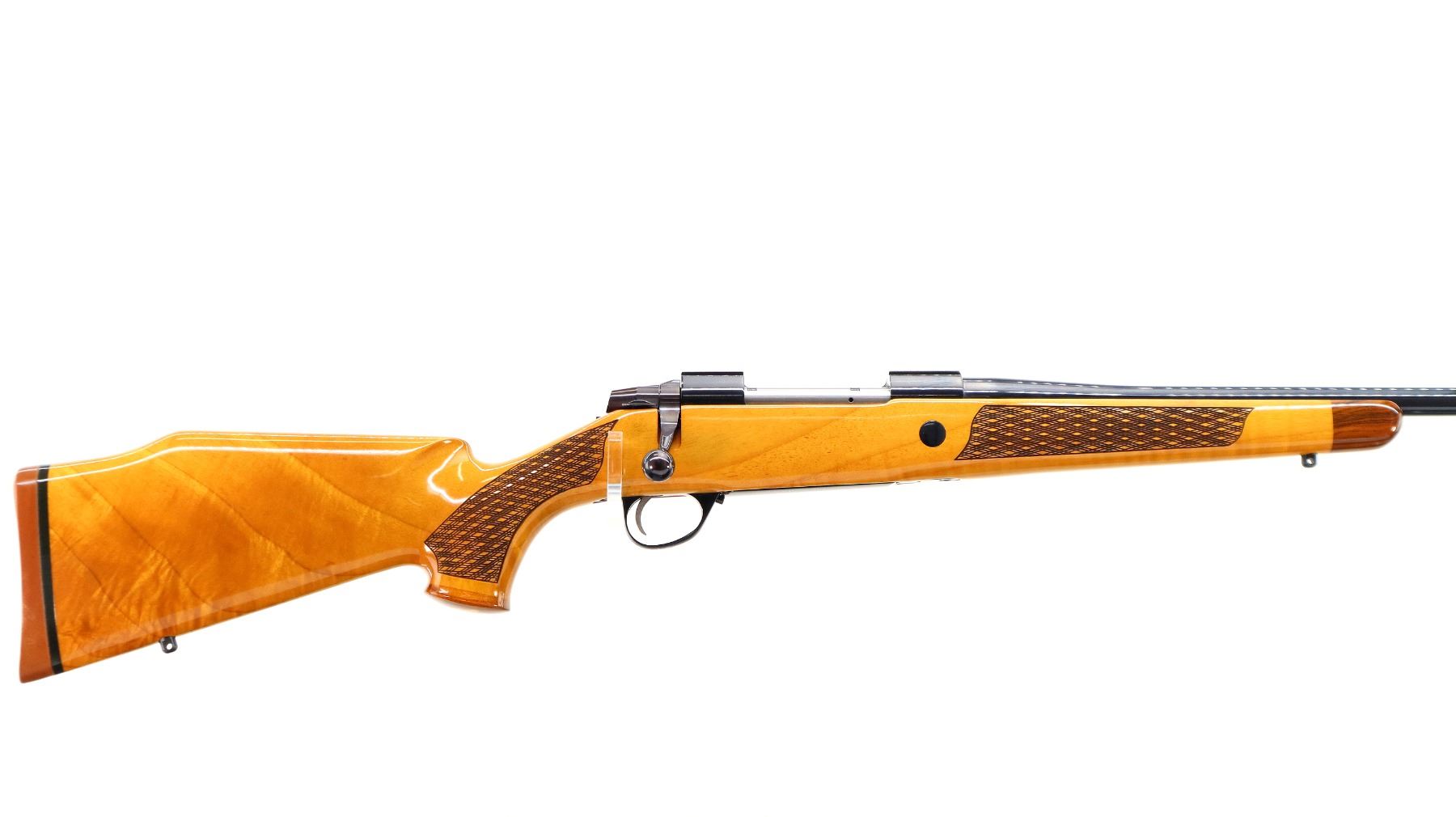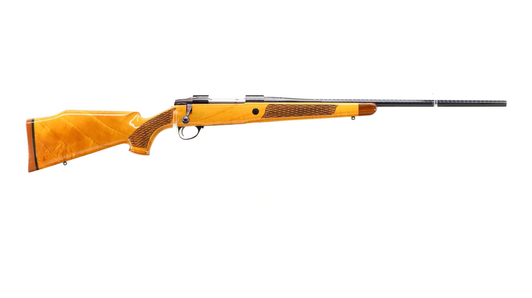 Main Description: Manufactured 1984. No sights, polish blued finish, tapered round barrel, receiver has integral scope bases, smooth bolt knob. One piece Gloss finish wood stock, note: gloss finish has some cracks on forend tip and pistol grip cap. Wood forend and pistol grip caps, checkered forearm and pistol grip with right hand palm swell, cheek rest, brown rubber recoil pad, engraved steel hinged floor plate and trigger guard, swivel studs.
