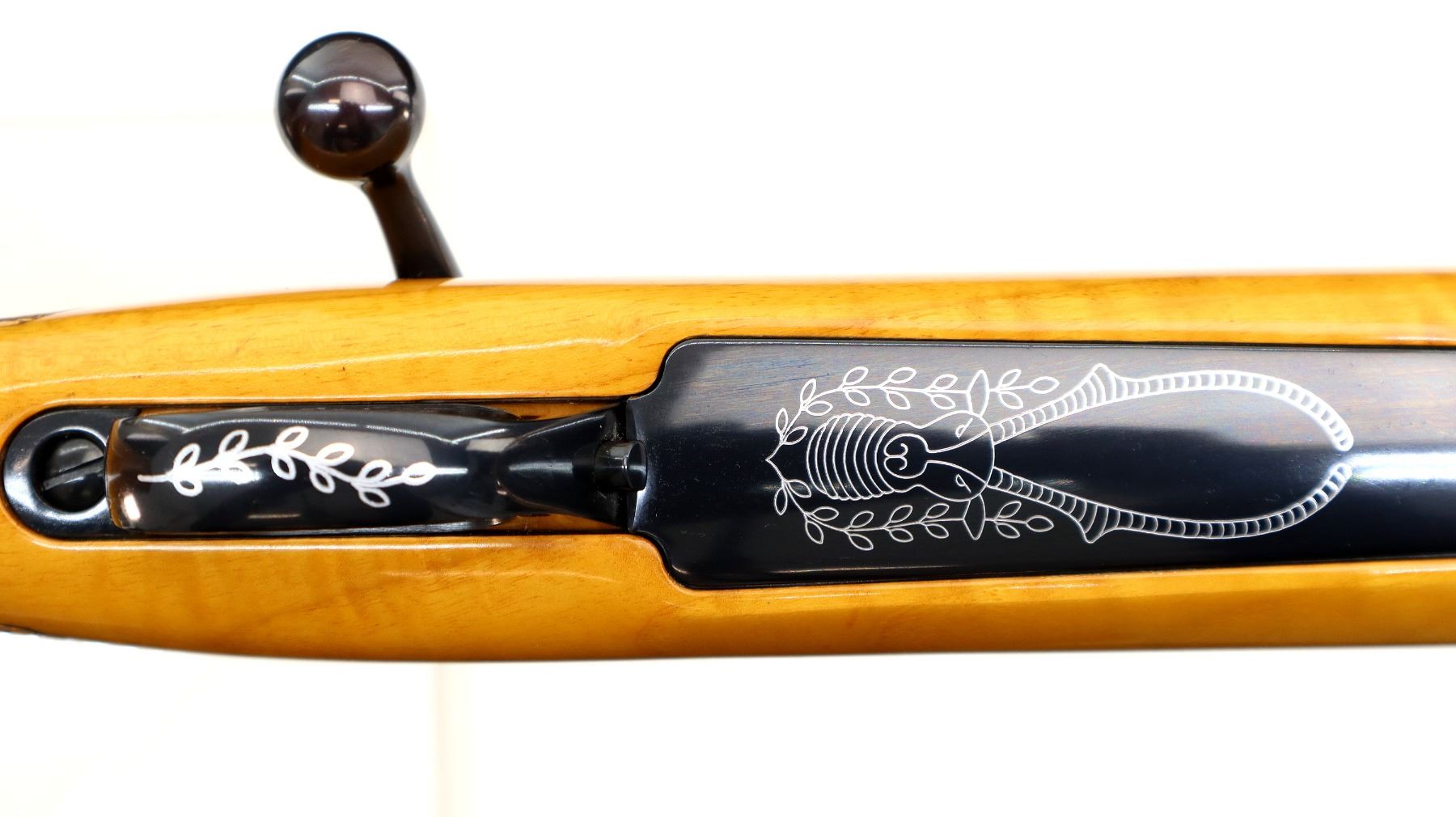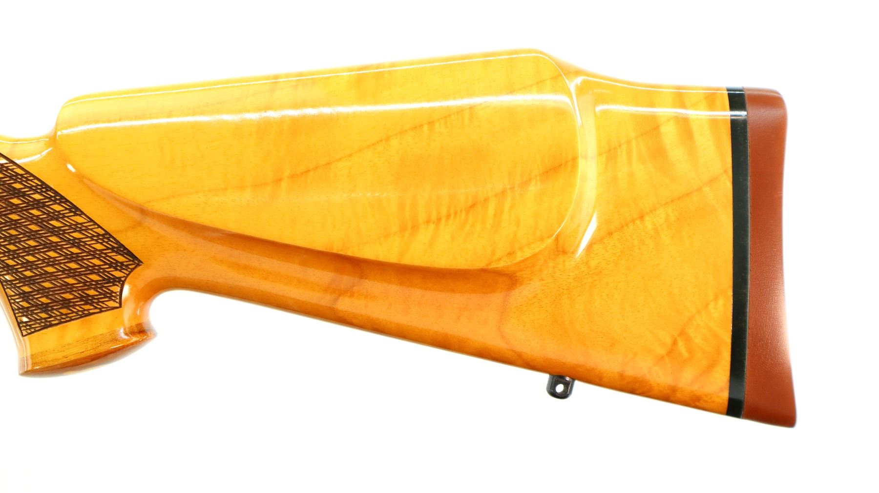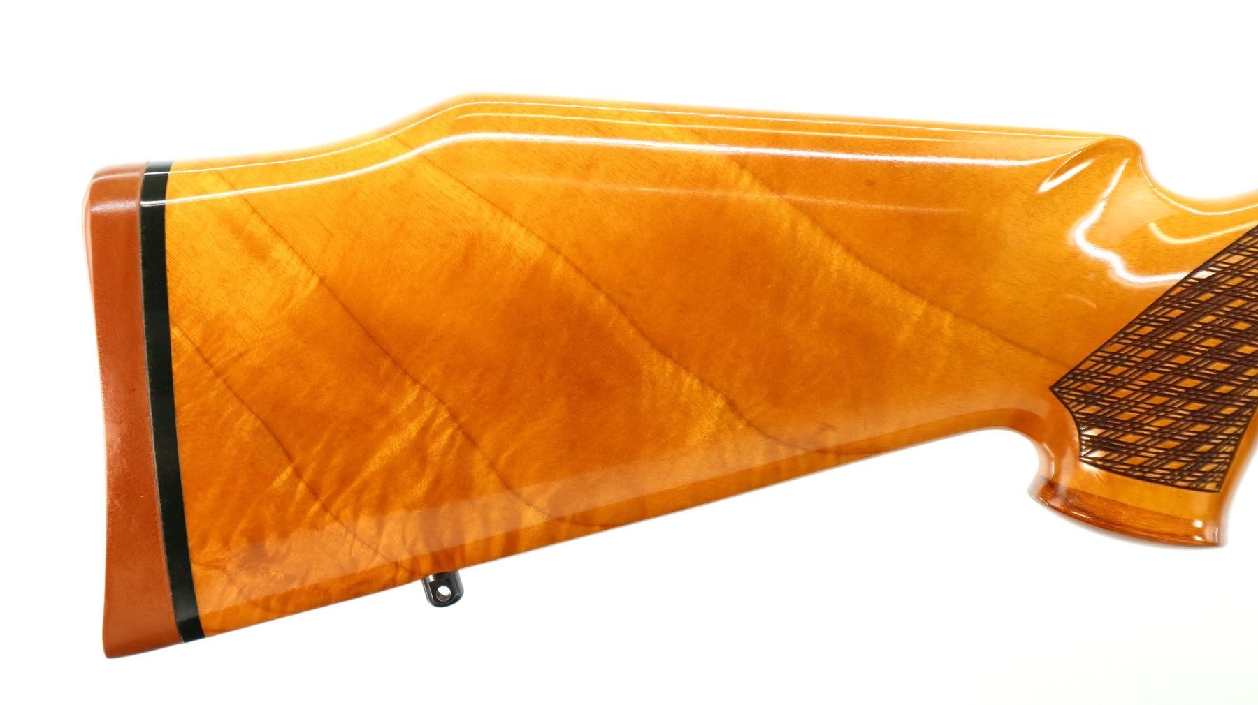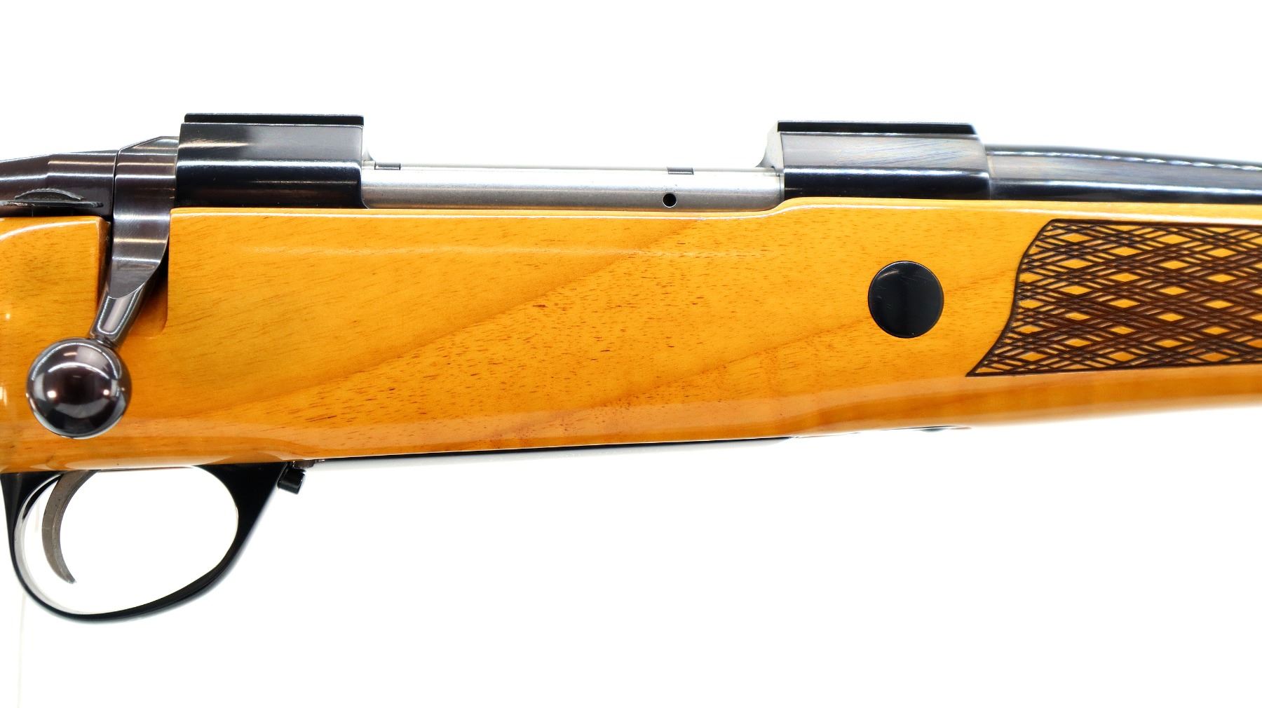 Main Description: Manufactured 1984. No sights, polish blued finish, tapered round barrel, receiver has integral scope bases, smooth bolt knob. One piece Gloss finish wood stock, note: gloss finish has some cracks on forend tip and pistol grip cap. Wood forend and pistol grip caps, checkered forearm and pistol grip with right hand palm swell, cheek rest, brown rubber recoil pad, engraved steel hinged floor plate and trigger guard, swivel studs.