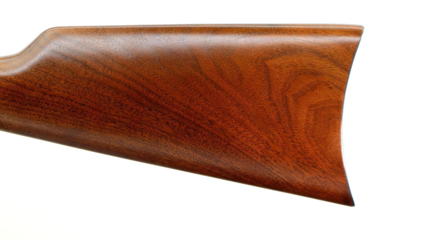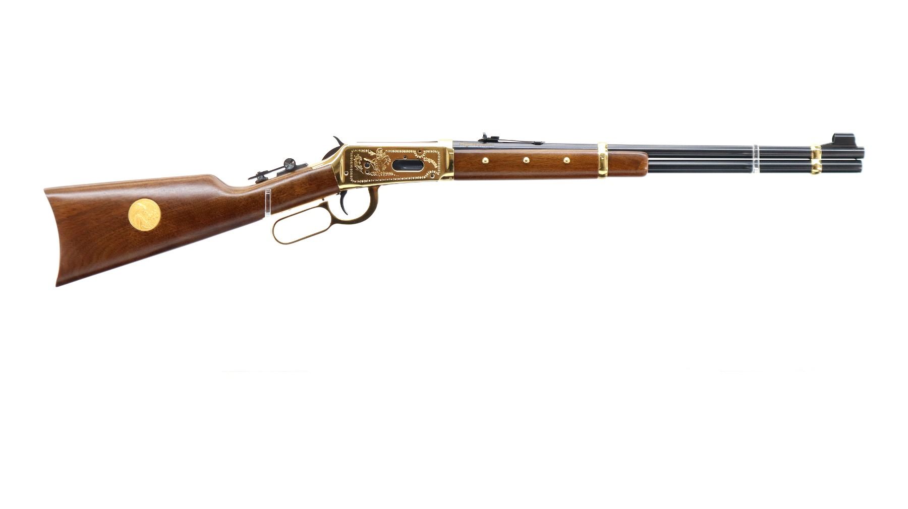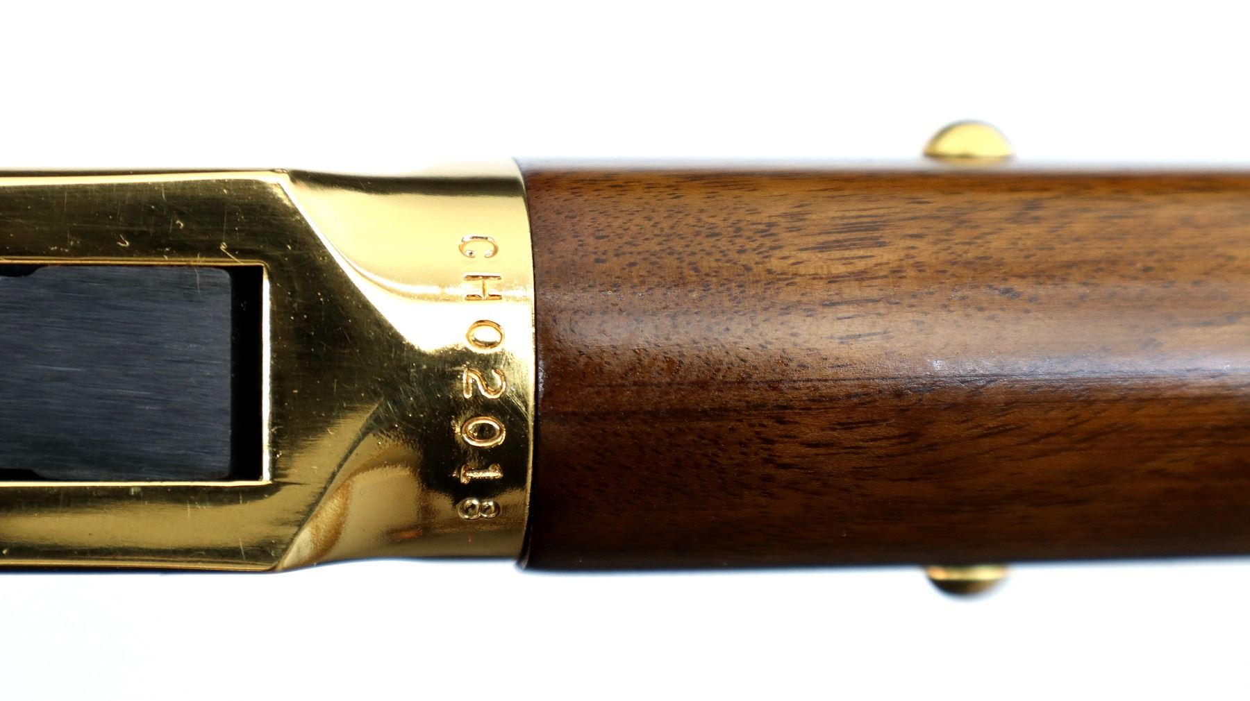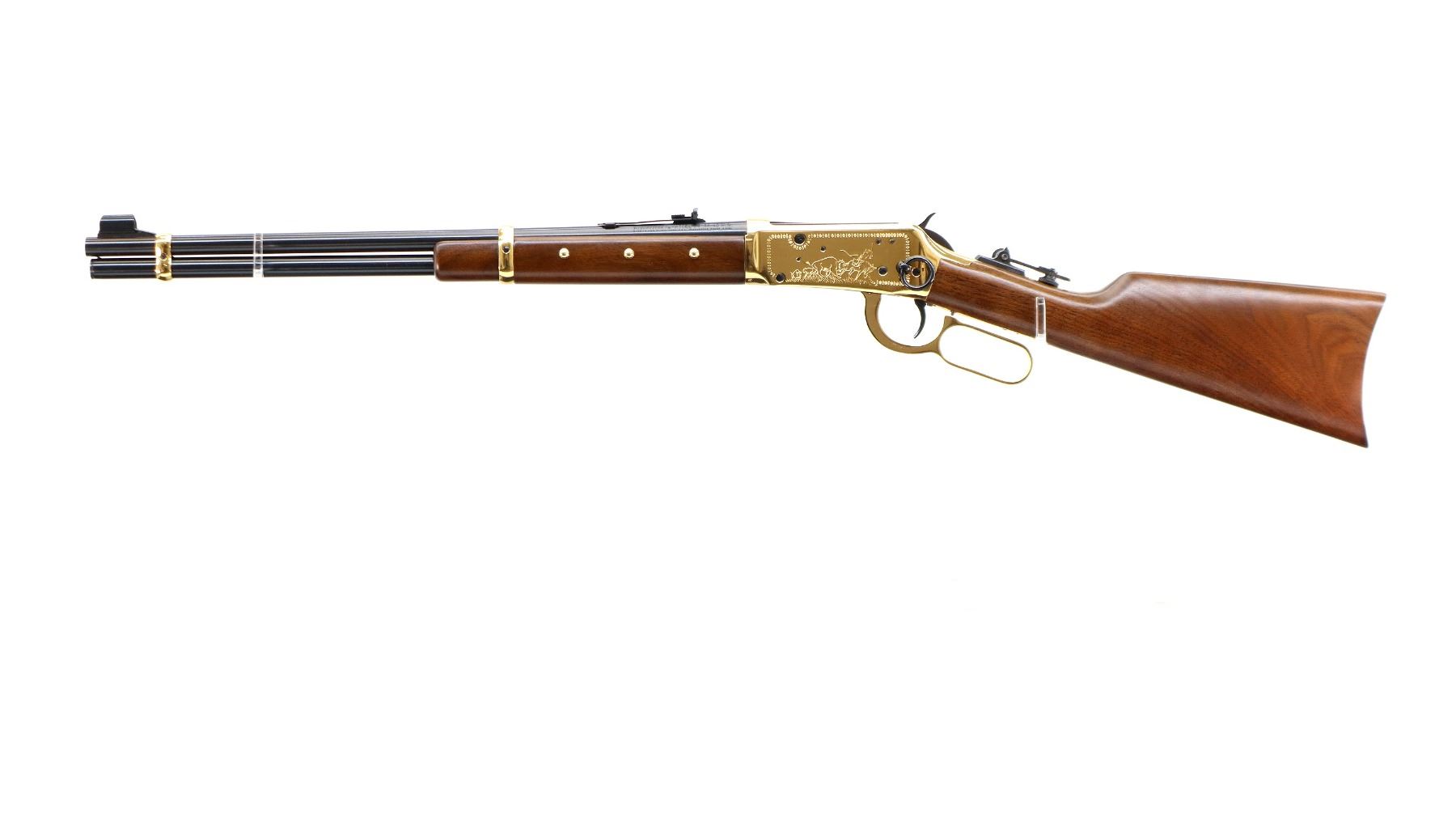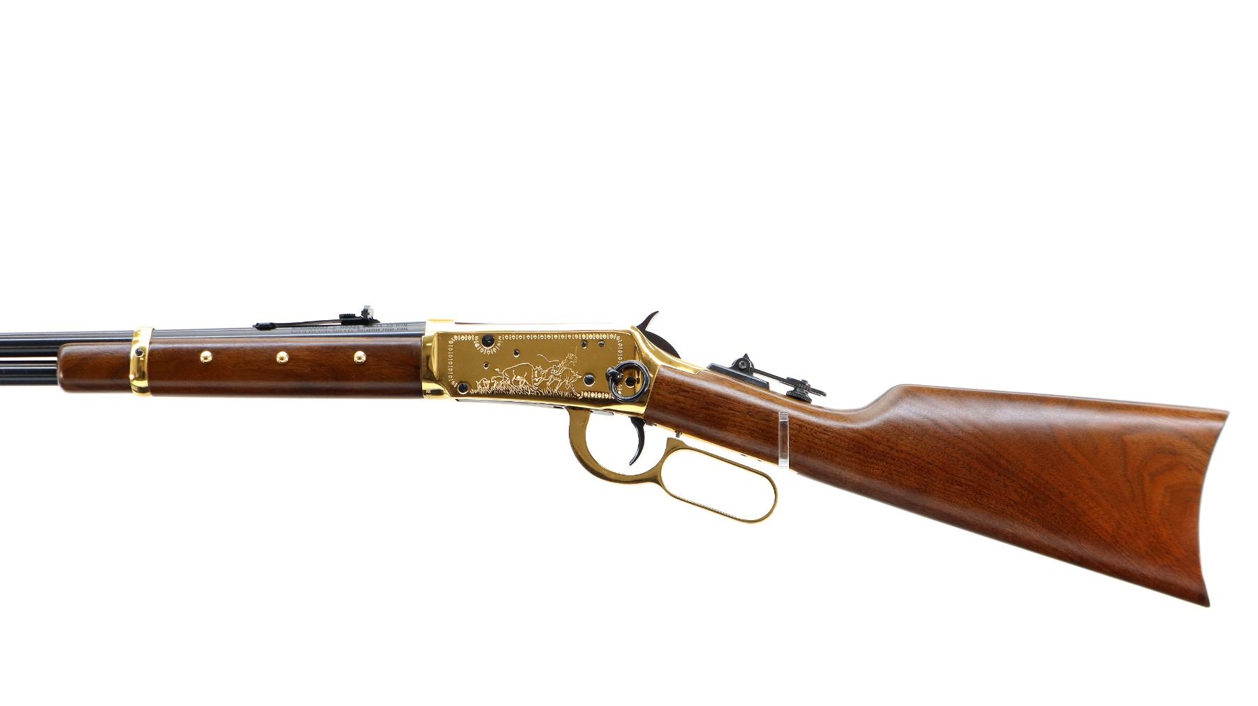 Main Description: Blade front sight with hood and ramp, adjustable u notched rear sight, blued barrel and full length magtube, engraved Western Scene gold receiver, grooved spur hammer, Saddle ring and stud, tang drilled and tapped with folding peep sight installed. Two piece wood stocks, forearm has six gold tacks, straight grip, smooth curved steel butt plate, medallion in right side of stock, two gold barrel bands.