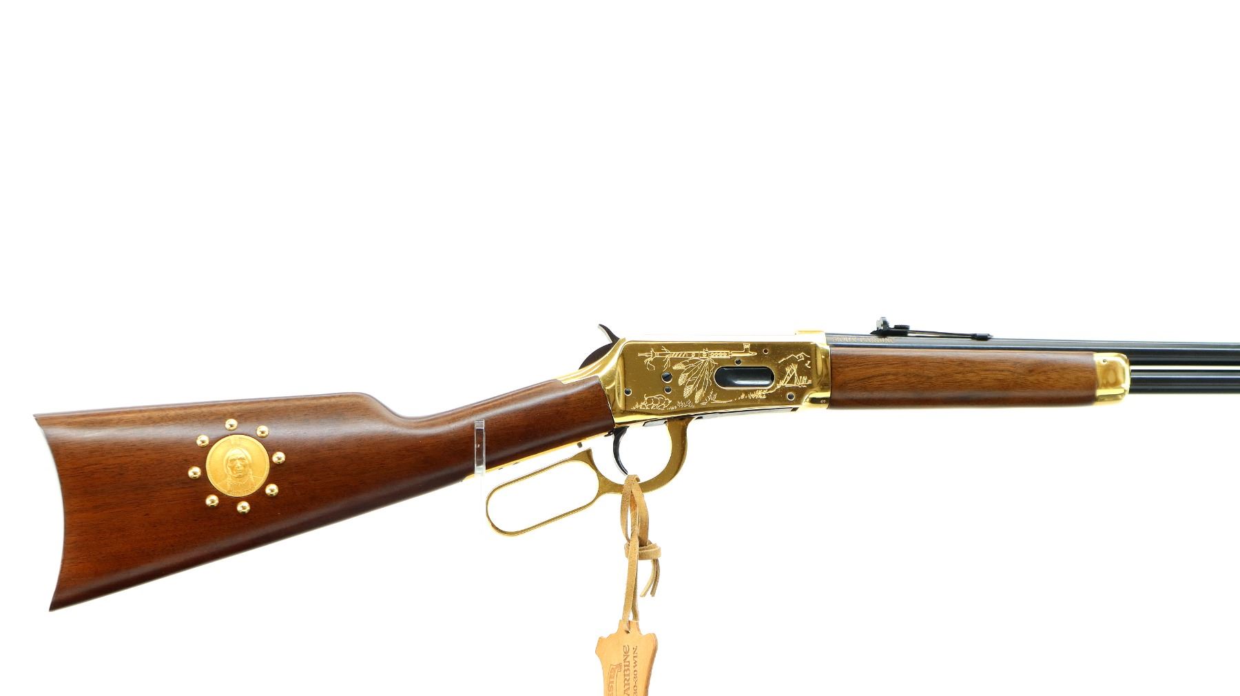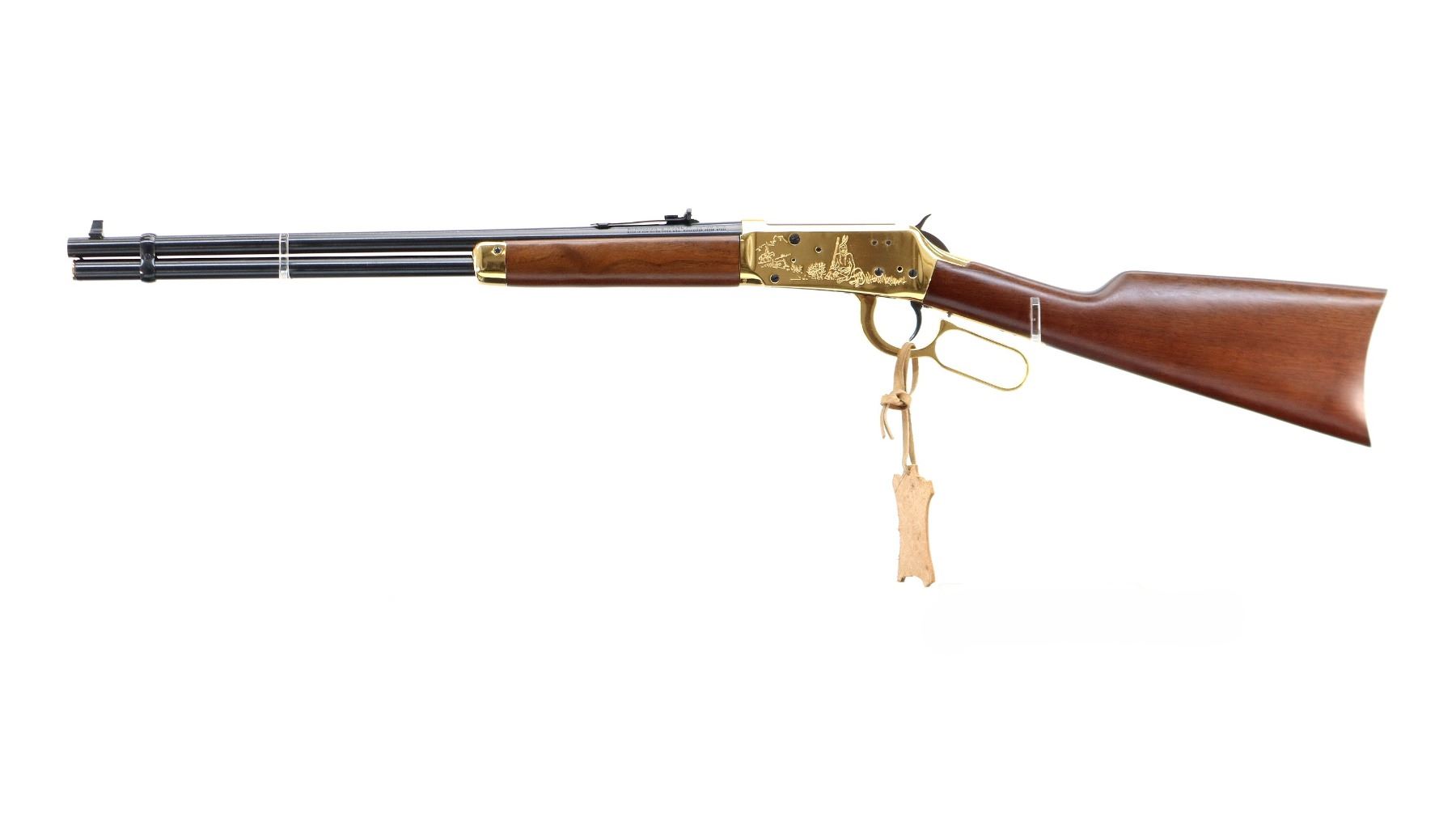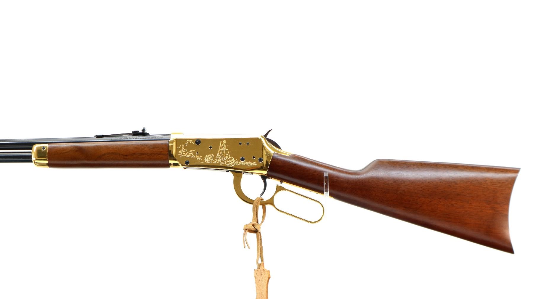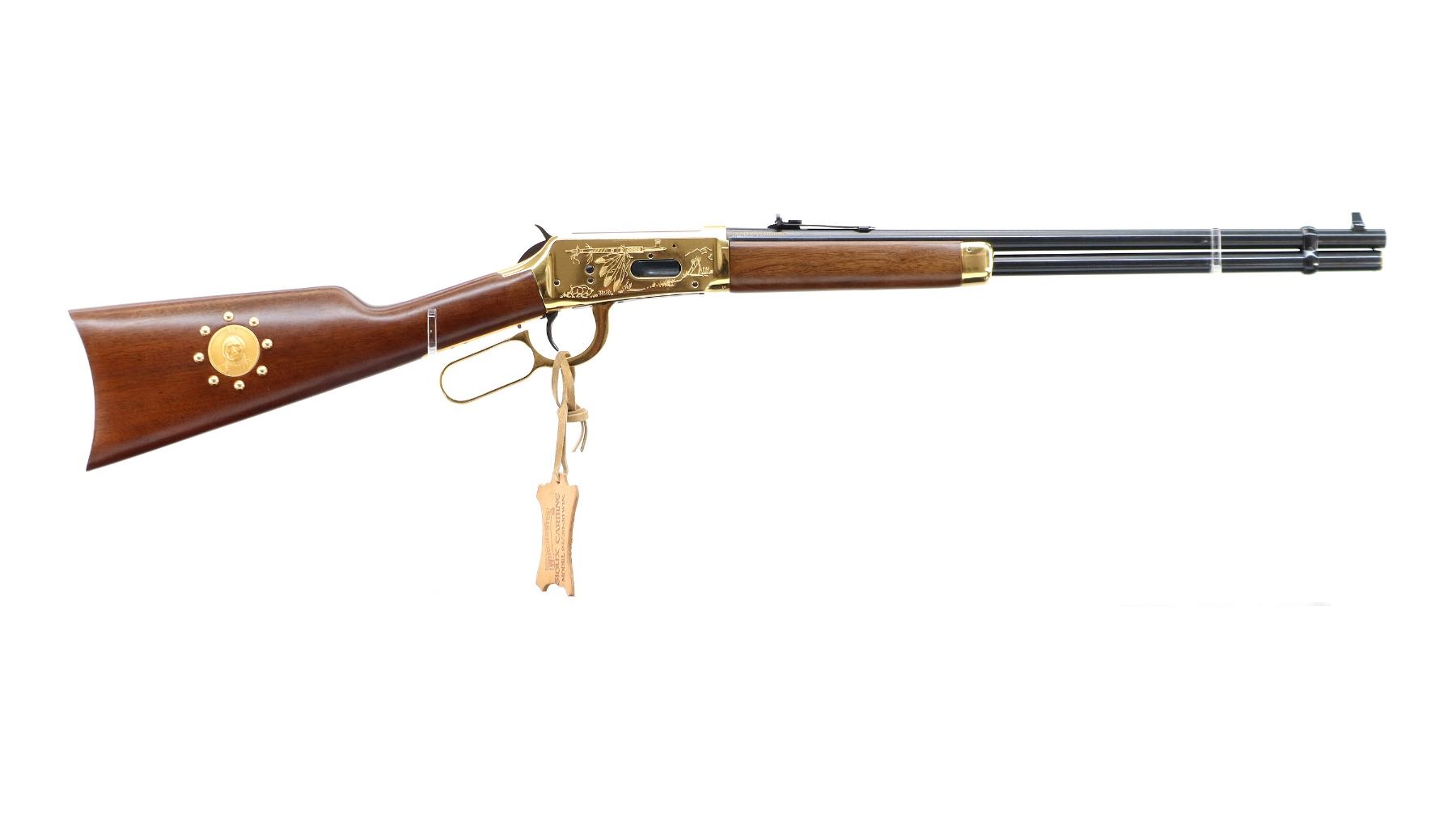 Main Description: Blade front sight, adjustable u notched rear sight, blued barrel, bolt and full length magtube, engraved gold Western Scene receiver, grooved spur hammer. Two piece wood stocks, straight grip, cracked behind receiver left side, smooth curved steel butt plate, medallion in right side of stock, gold nose cap, blued barrel band. Retains Factory Leather tag.