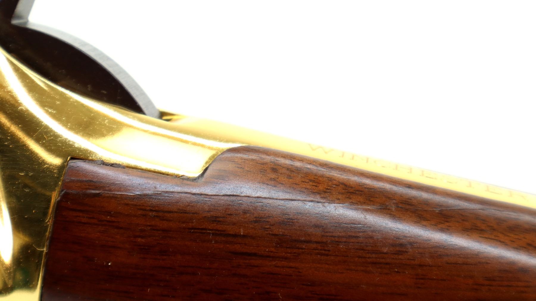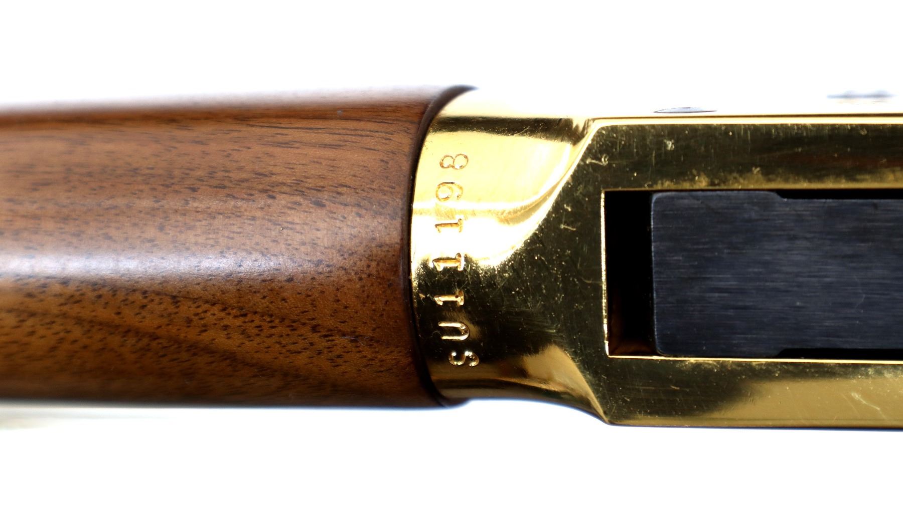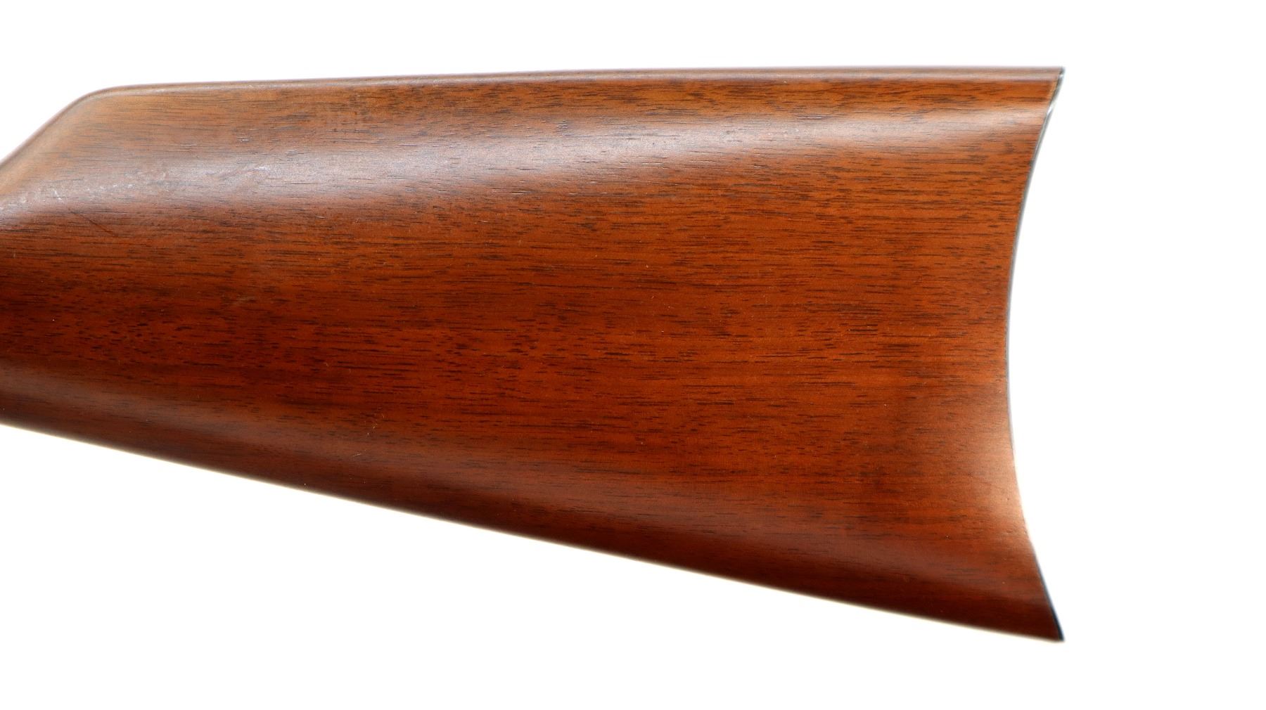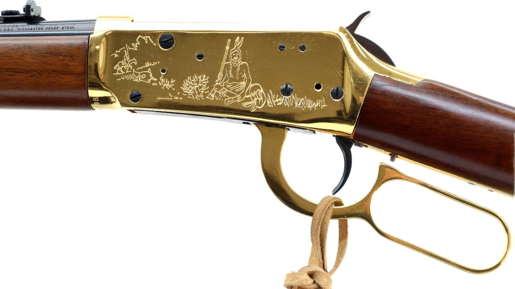 Main Description: Blade front sight, adjustable u notched rear sight, blued barrel, bolt and full length magtube, engraved gold Western Scene receiver, grooved spur hammer. Two piece wood stocks, straight grip, cracked behind receiver left side, smooth curved steel butt plate, medallion in right side of stock, gold nose cap, blued barrel band. Retains Factory Leather tag.