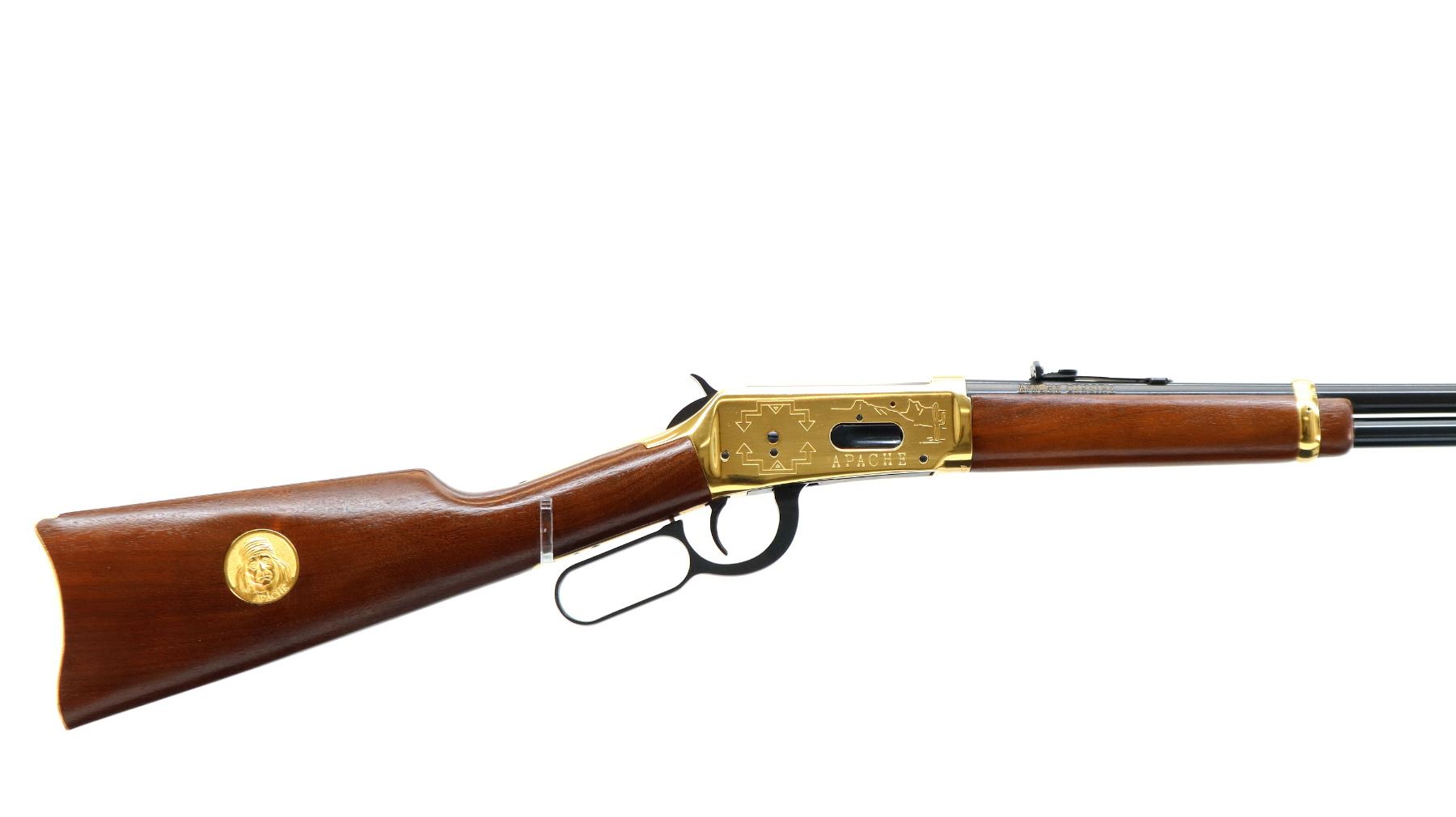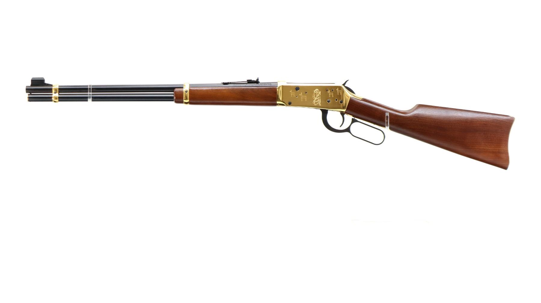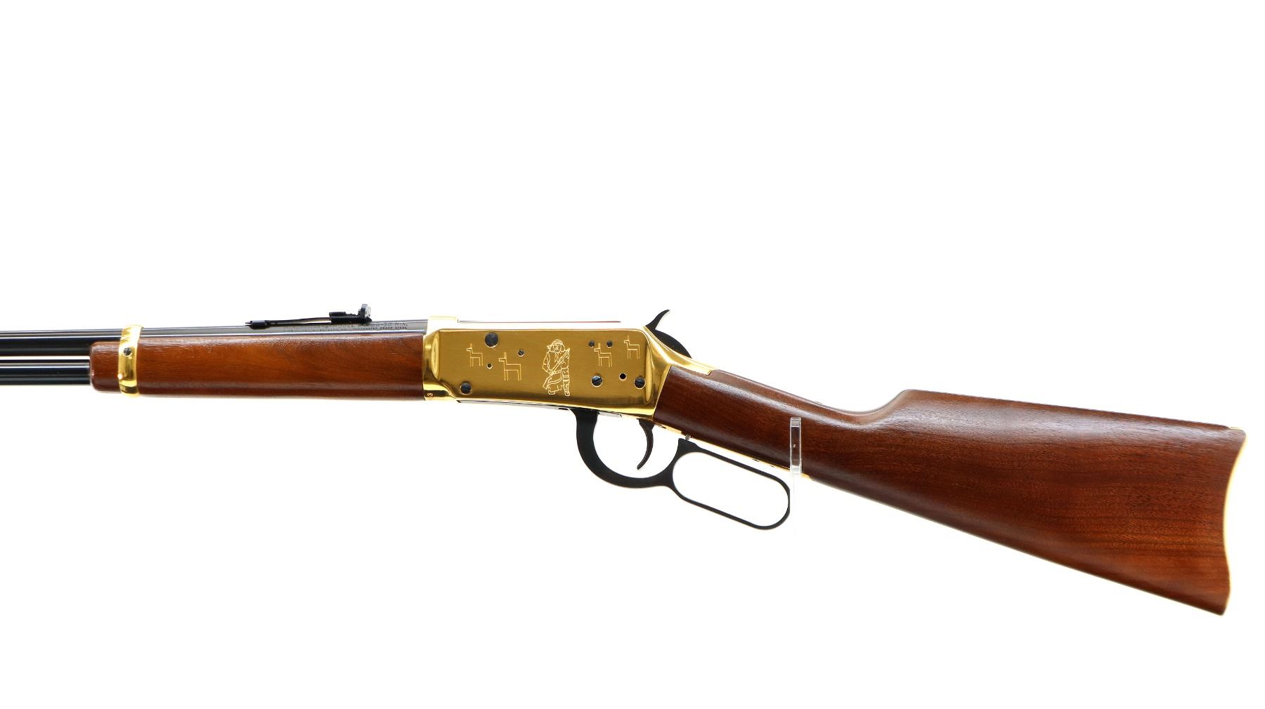 Main Description: Blade front sight with hood and ramp, adjustable u notched rear sight, blued barrel, bolt, lever and full length magtube, engraved gold Western scene receiver, grooved spur hammer. Two piece wood stocks, straight grip, smooth curved gold butt plate and two barrel bands, medallion in right side of stock.