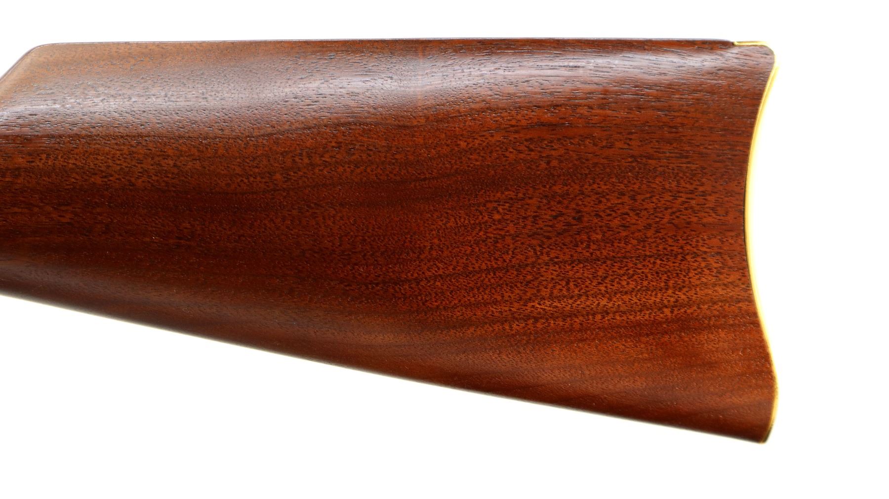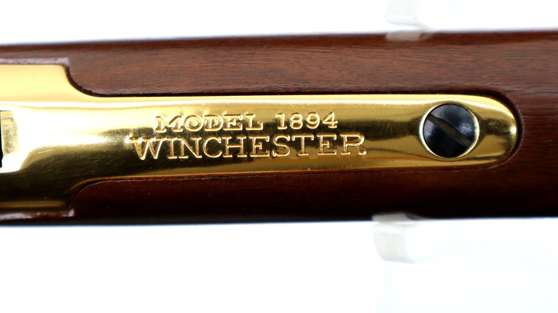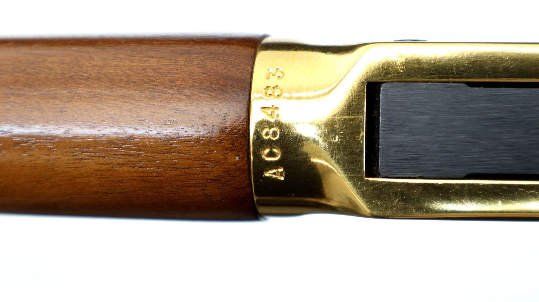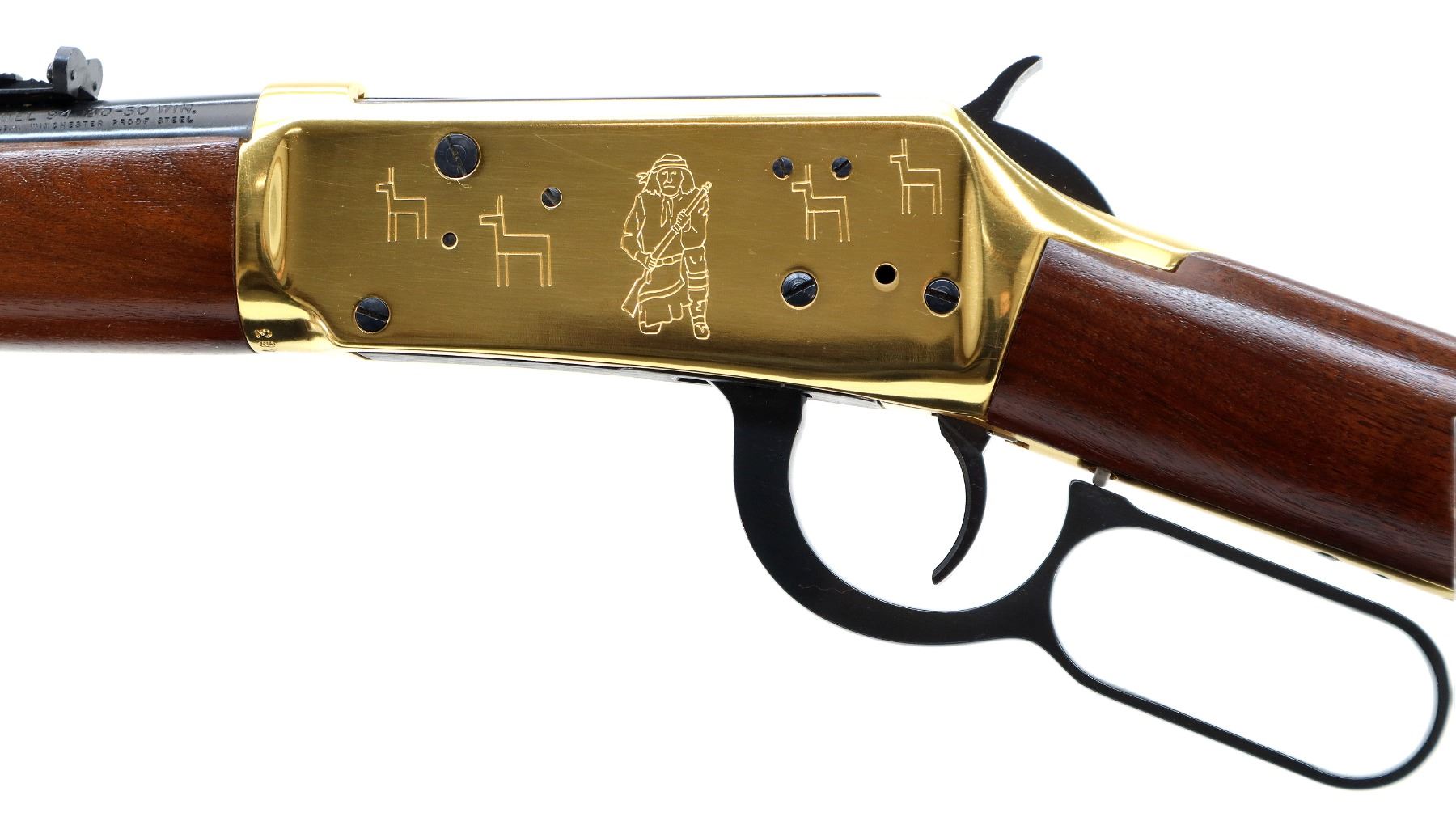 Main Description: Blade front sight with hood and ramp, adjustable u notched rear sight, blued barrel, bolt, lever and full length magtube, engraved gold Western scene receiver, grooved spur hammer. Two piece wood stocks, straight grip, smooth curved gold butt plate and two barrel bands, medallion in right side of stock.