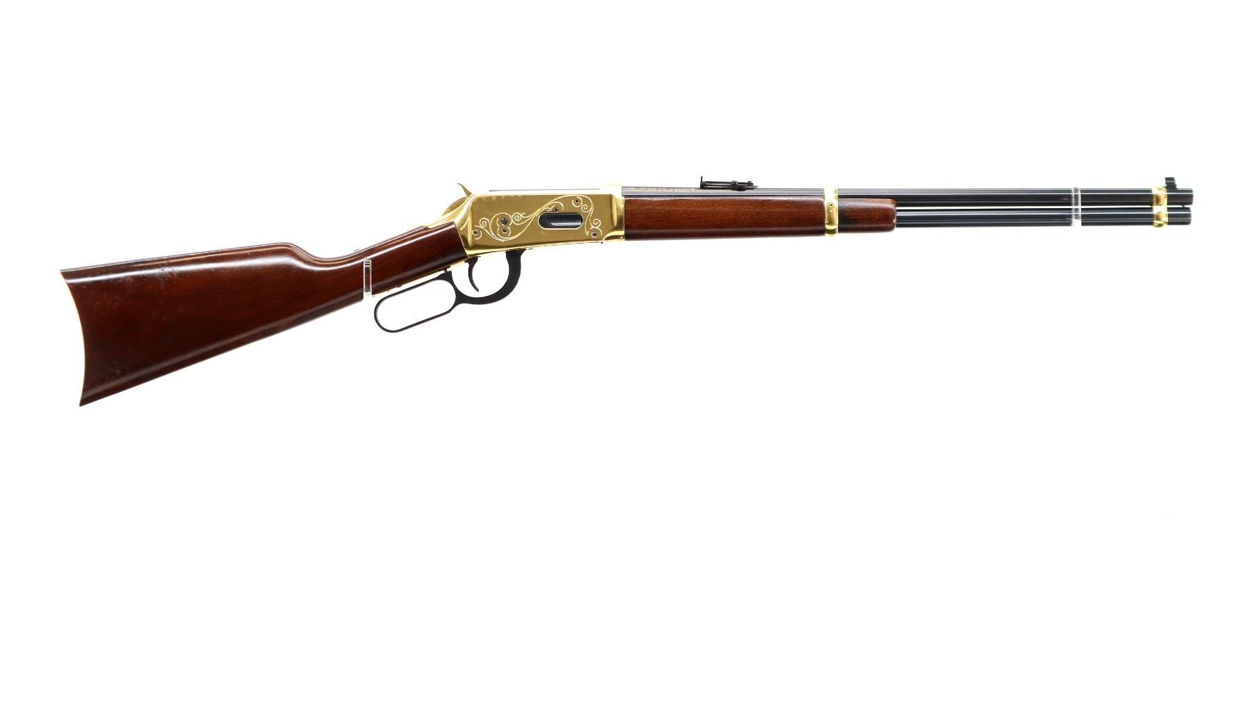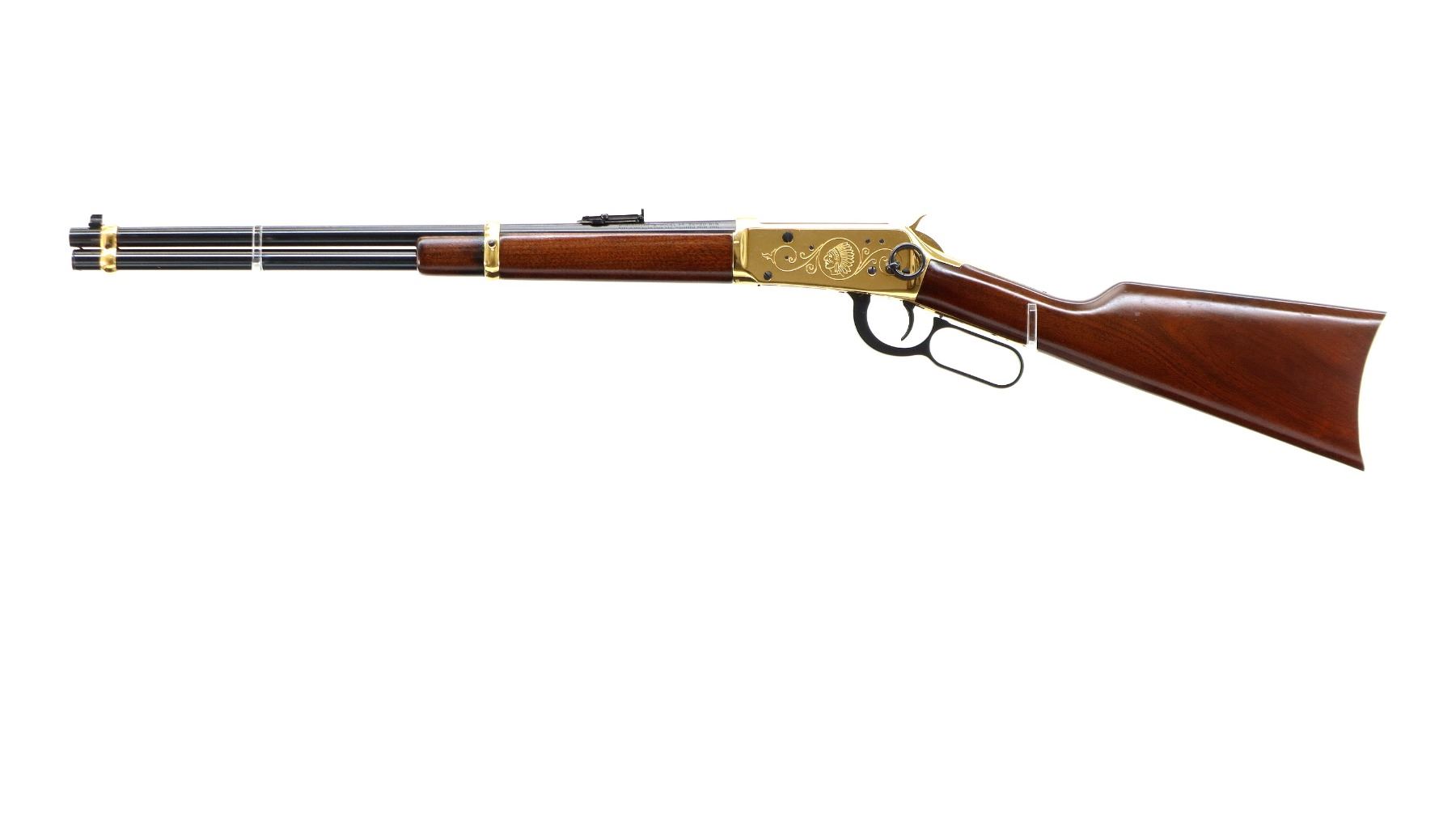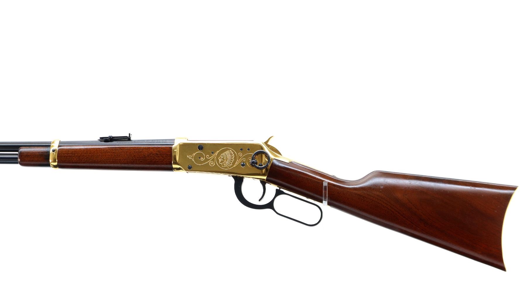 Main Description: Blade front sight, adjustable u notched ladder rear sight, blued barrel, bolt, lever and full length magtube, engraved gold receiver, grooved spur hammer, saddle ring and stud. Two piece wood stocks, straight grip, smooth curved gold butt plate and two barrel bands.