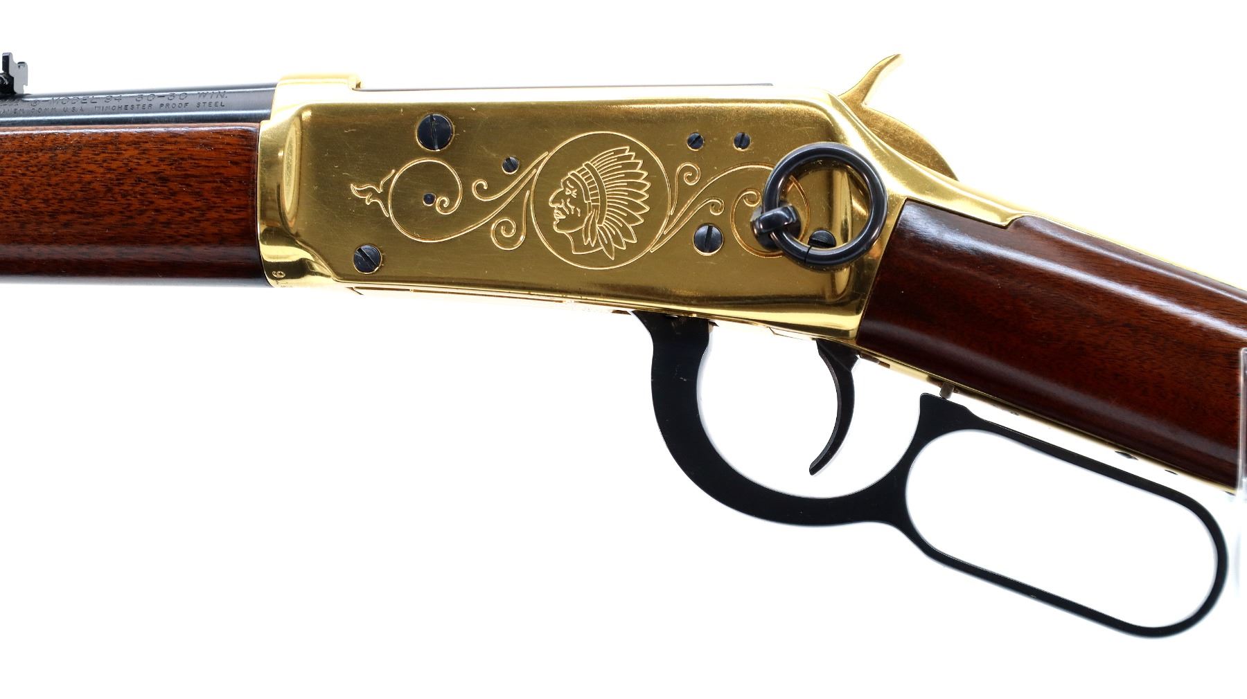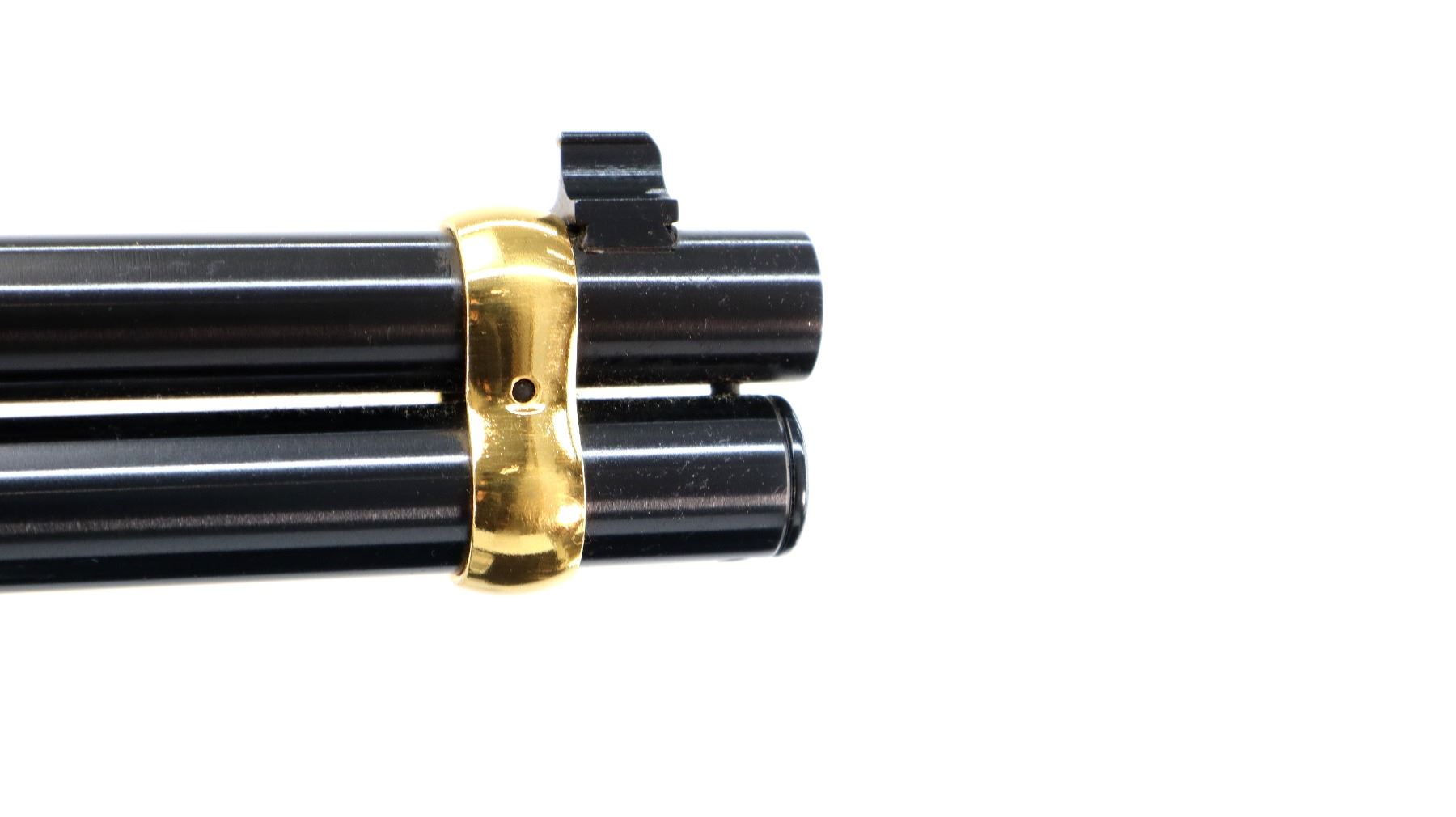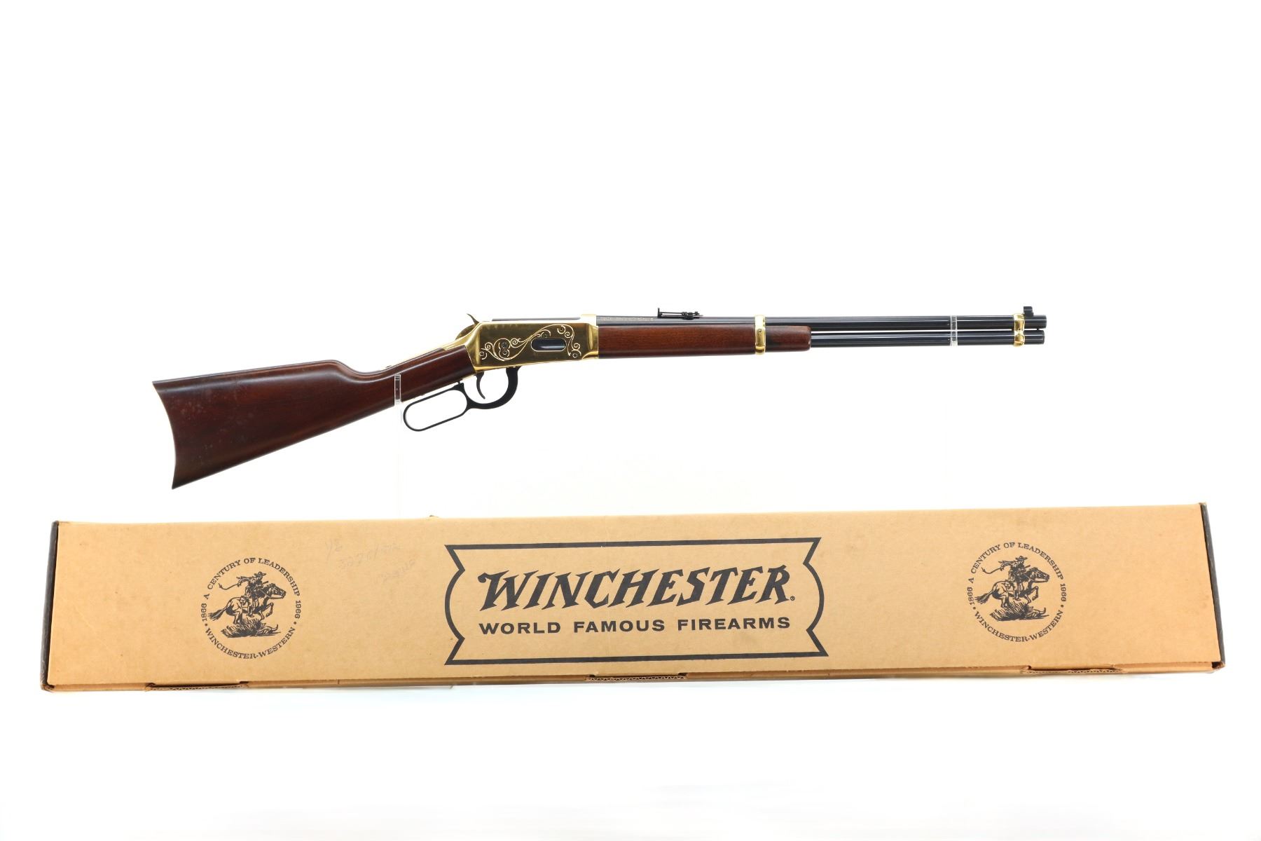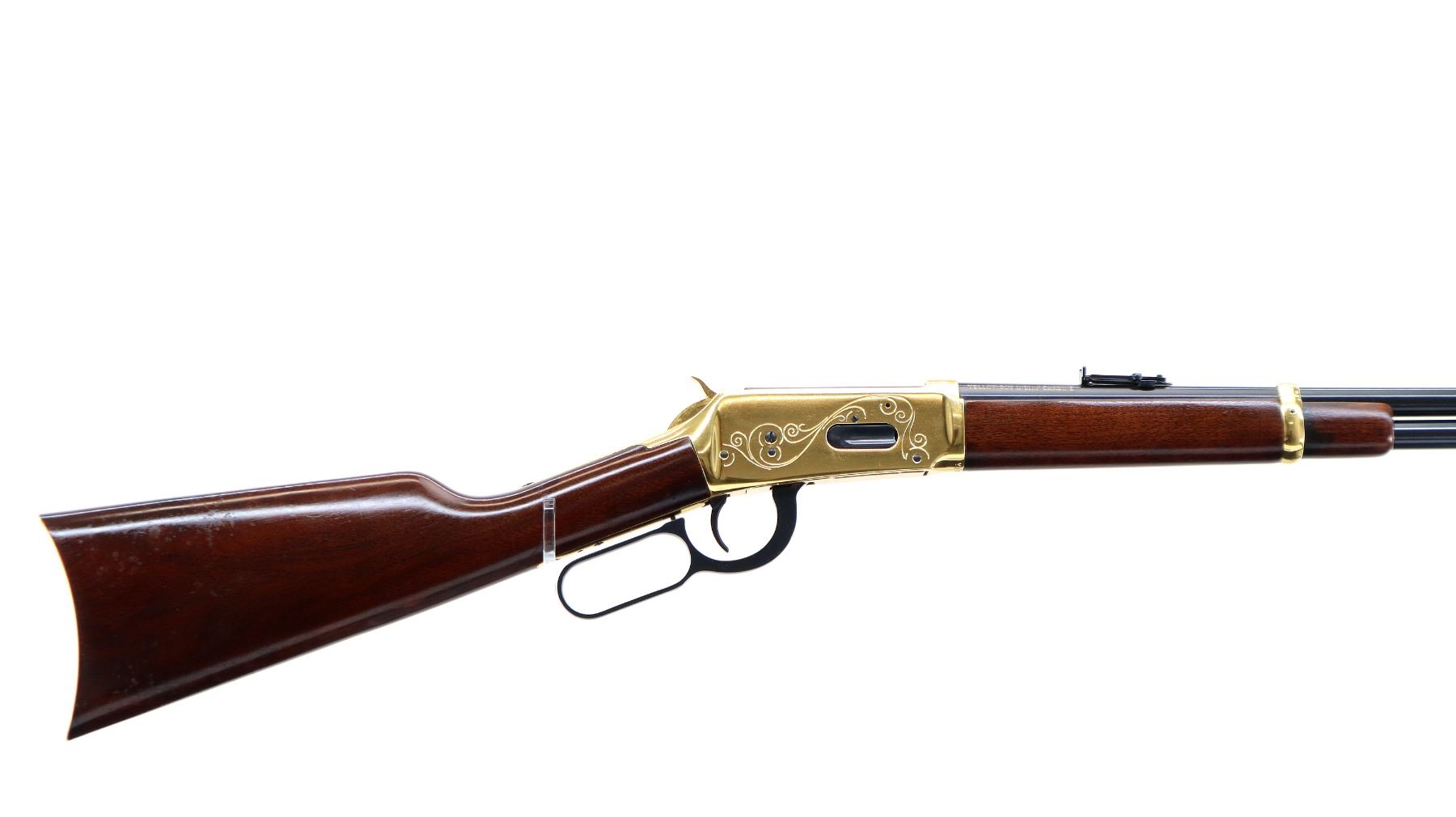 Main Description: Blade front sight, adjustable u notched ladder rear sight, blued barrel, bolt, lever and full length magtube, engraved gold receiver, grooved spur hammer, saddle ring and stud. Two piece wood stocks, straight grip, smooth curved gold butt plate and two barrel bands.